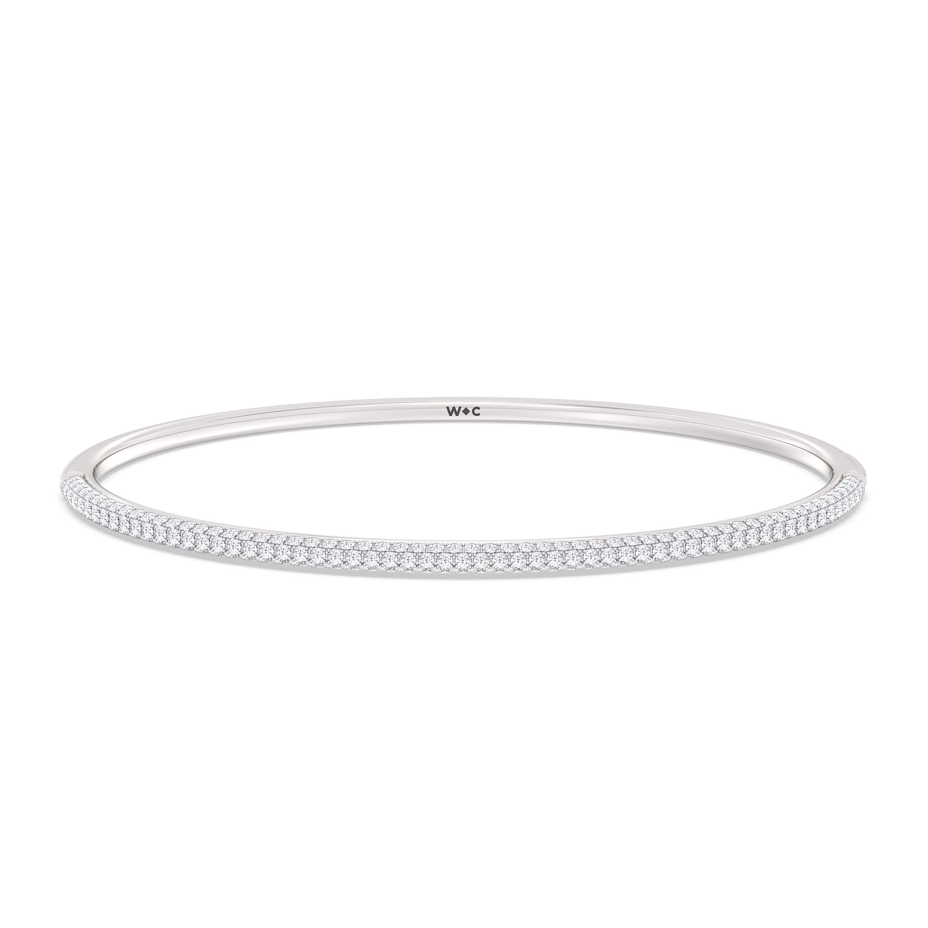 Make this diamond bangle a part of your daily style. It features three rows of pavé-set round diamonds tracing half of the oval bangle's circumference. The bangle is secured by a spring lock.