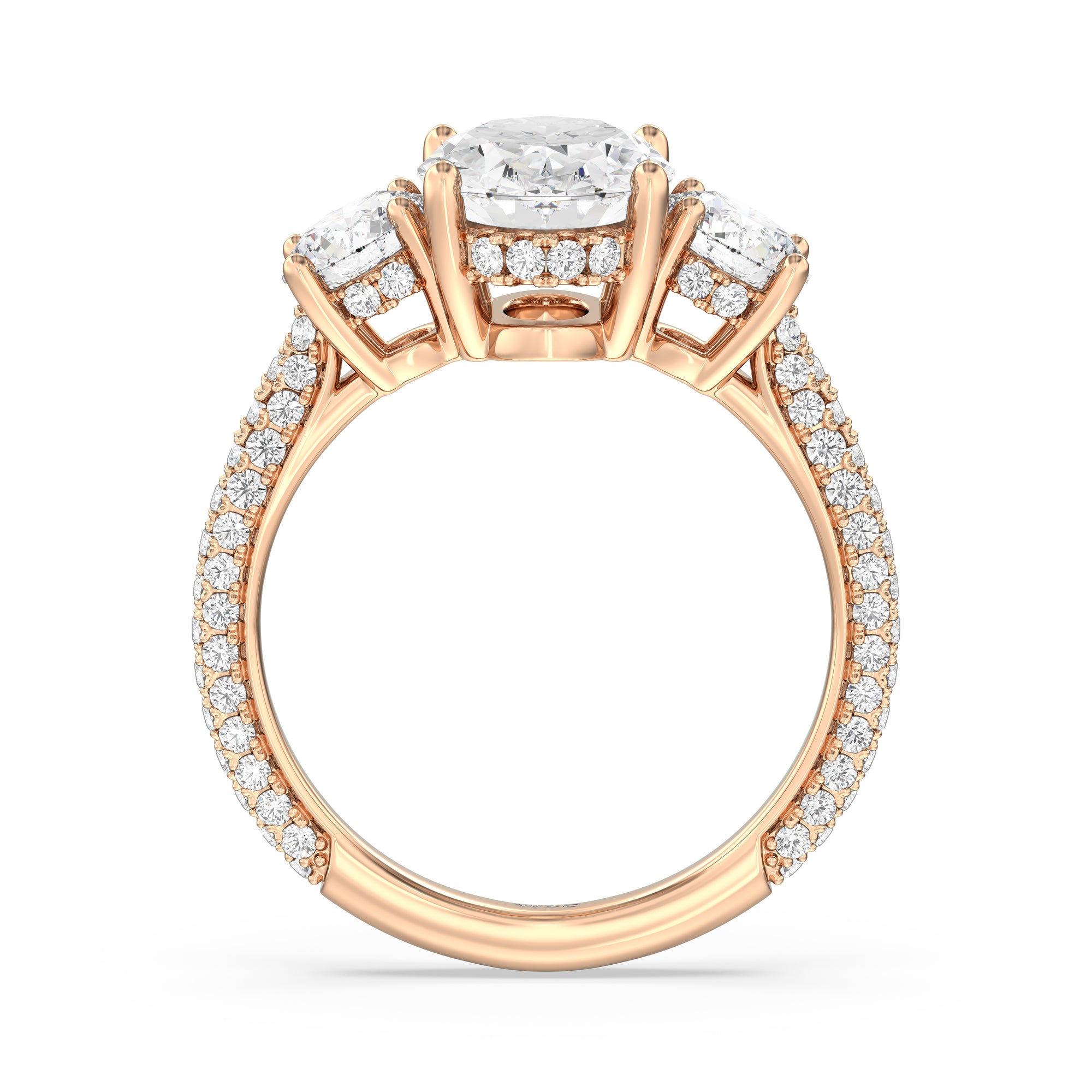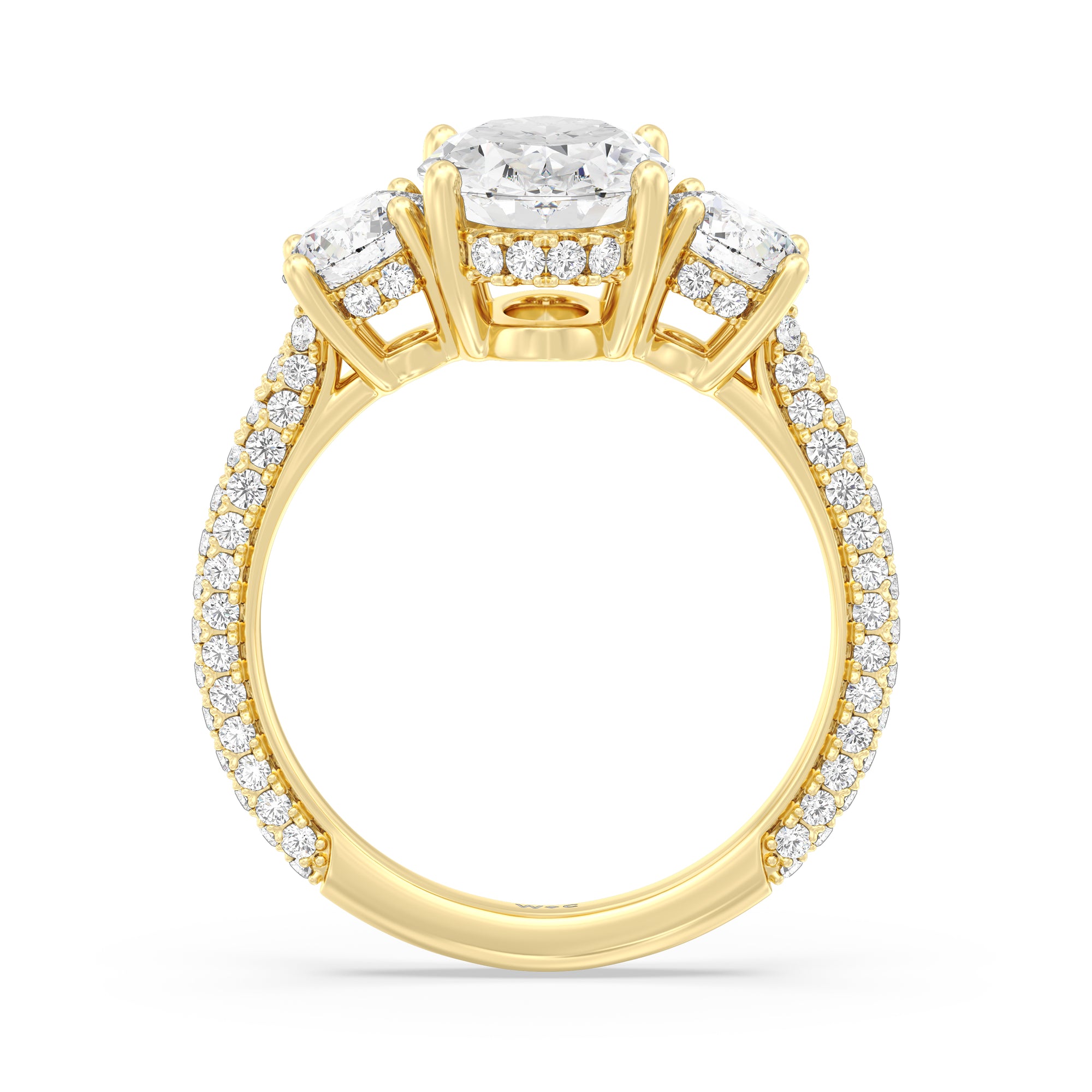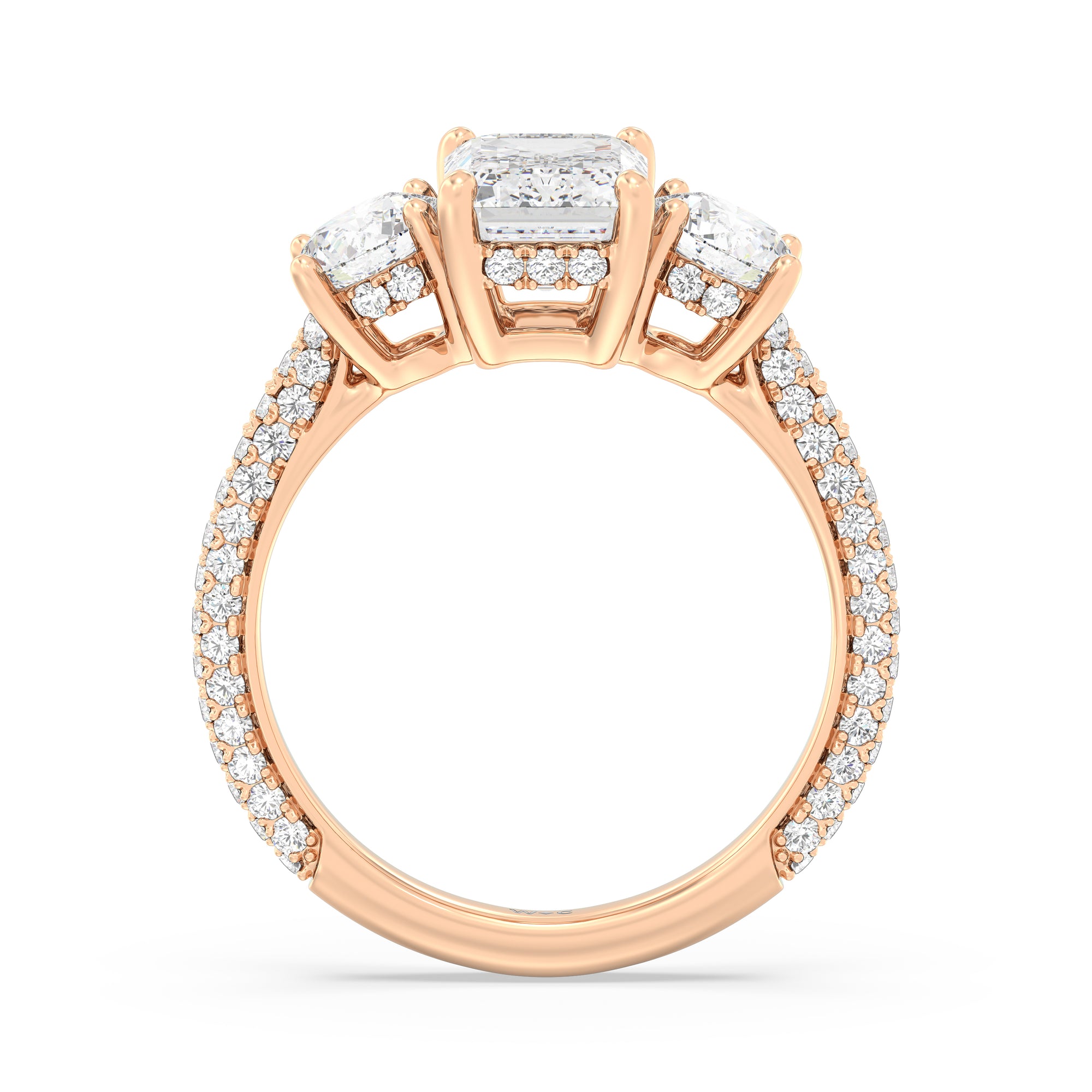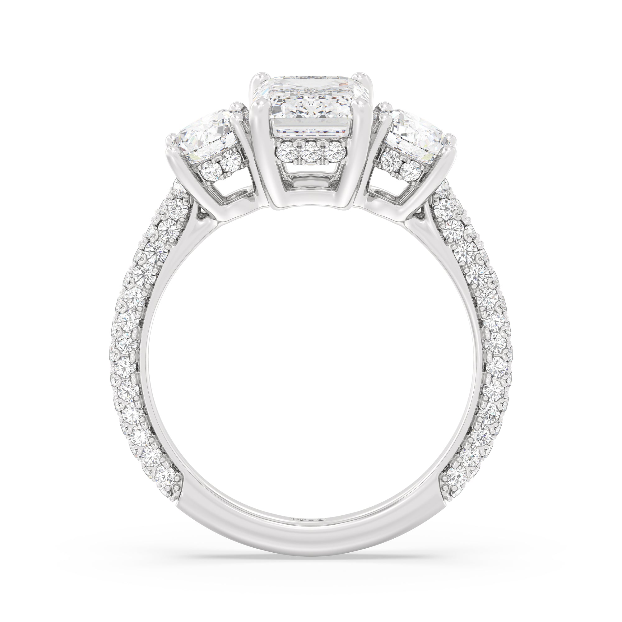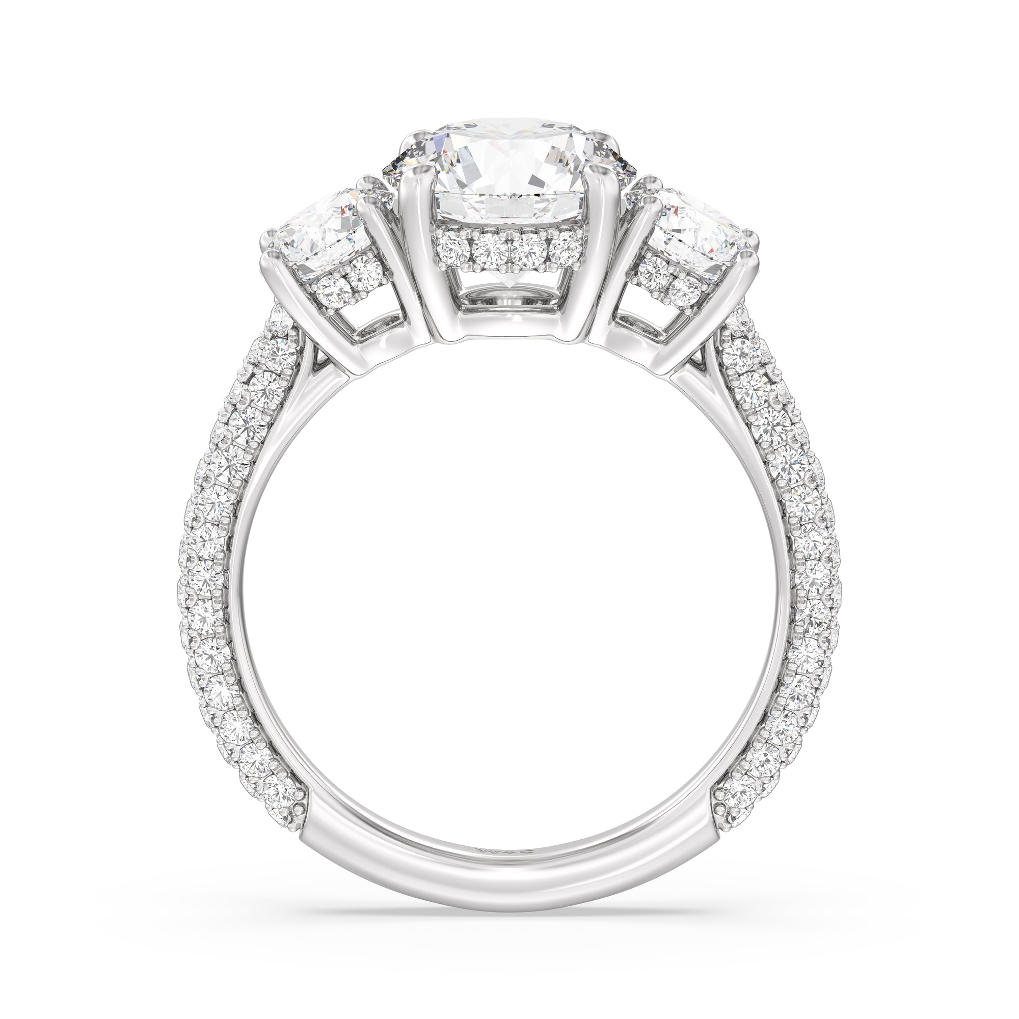 Dazzle her with the enchanting refinement of this three stone engagement ring. This stunner features a gorgeous Round-cut diamond center and side stone mounted on a four-prong basket with a glittering hidden halo. The cathedral shank's arching shoulders are traced with a triple row of diamonds, gracefully running more than halfway around the band.