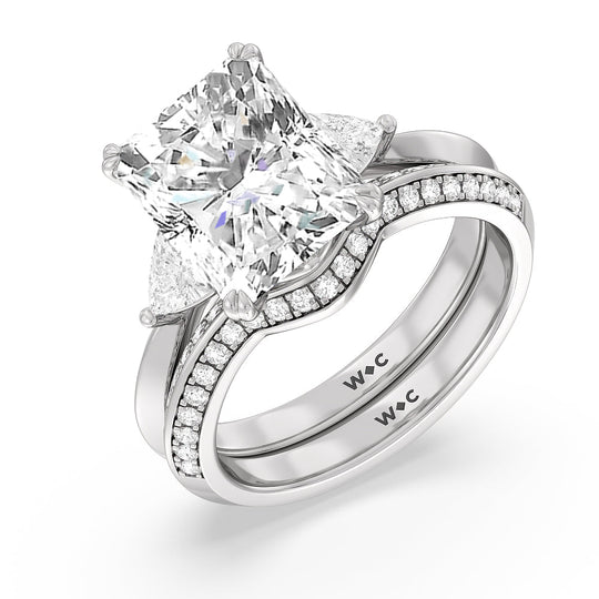Looking quietly elegant, this three-stone knife-edge engagement ring looks sleek and chic in its graceful profile. The polished knife-edge band is topped with a three-stone setting composed of an emerald-cut central diamond flanked by two triangular-shaped diamonds.
