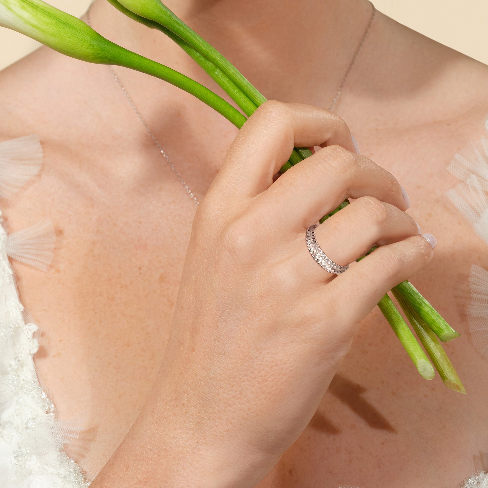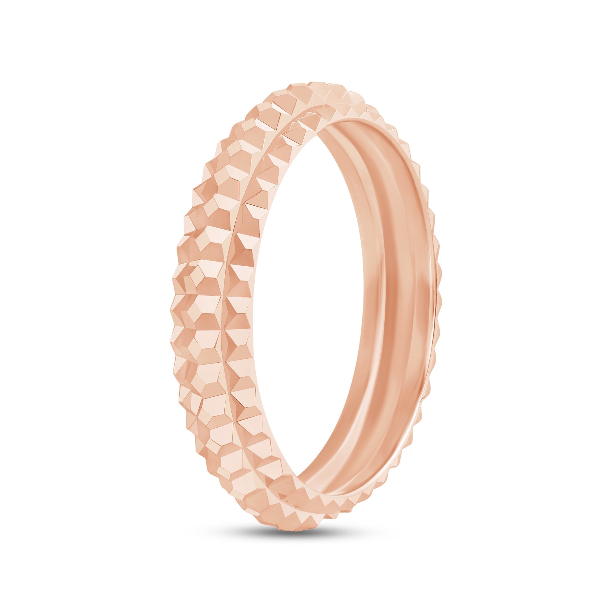 Pyramidal notches to take your daily outfits up a notch. Multiple angular grooves fill the wide band, creating a three-band illusion. The visually dynamic texture makes it a classic ring perfect for daily wear.