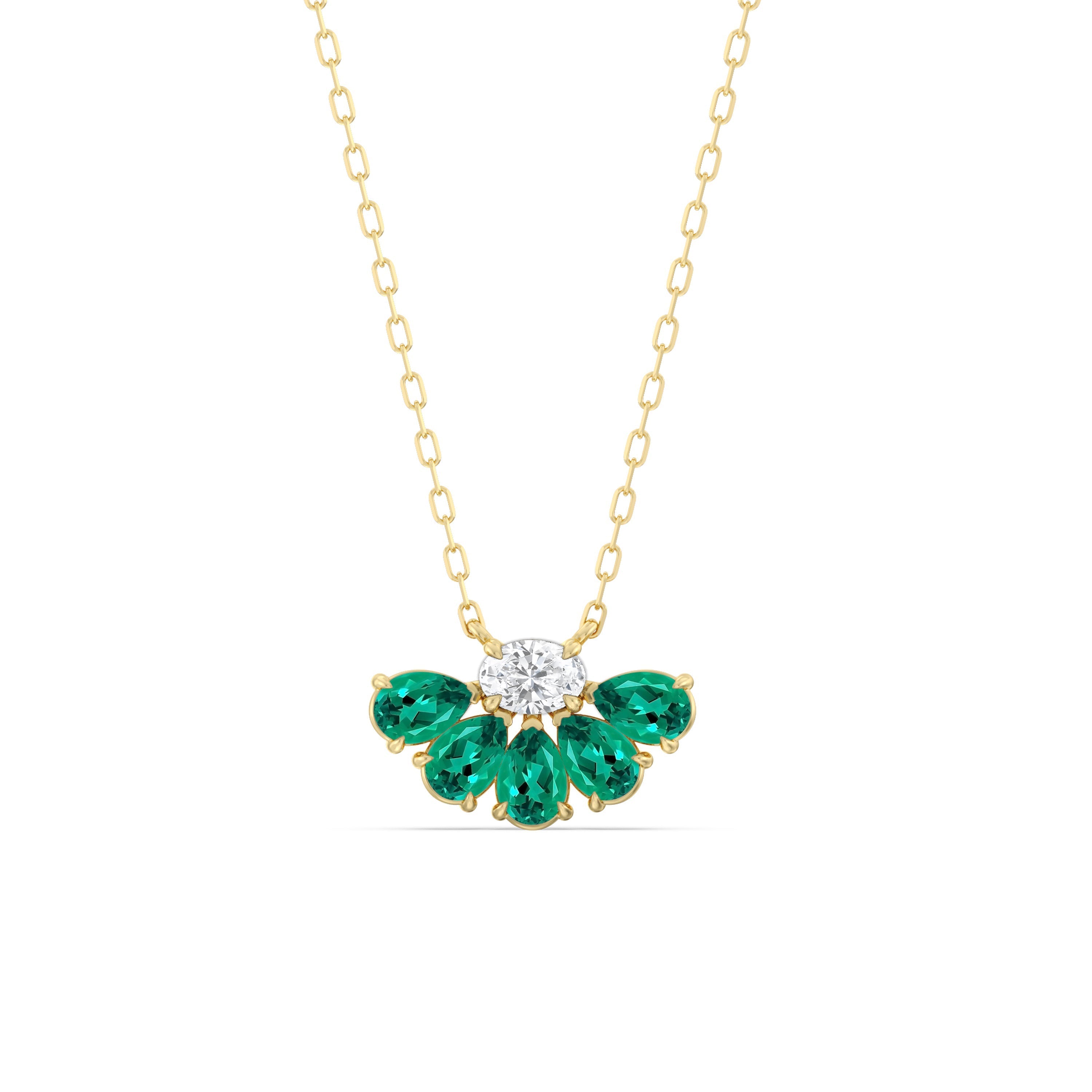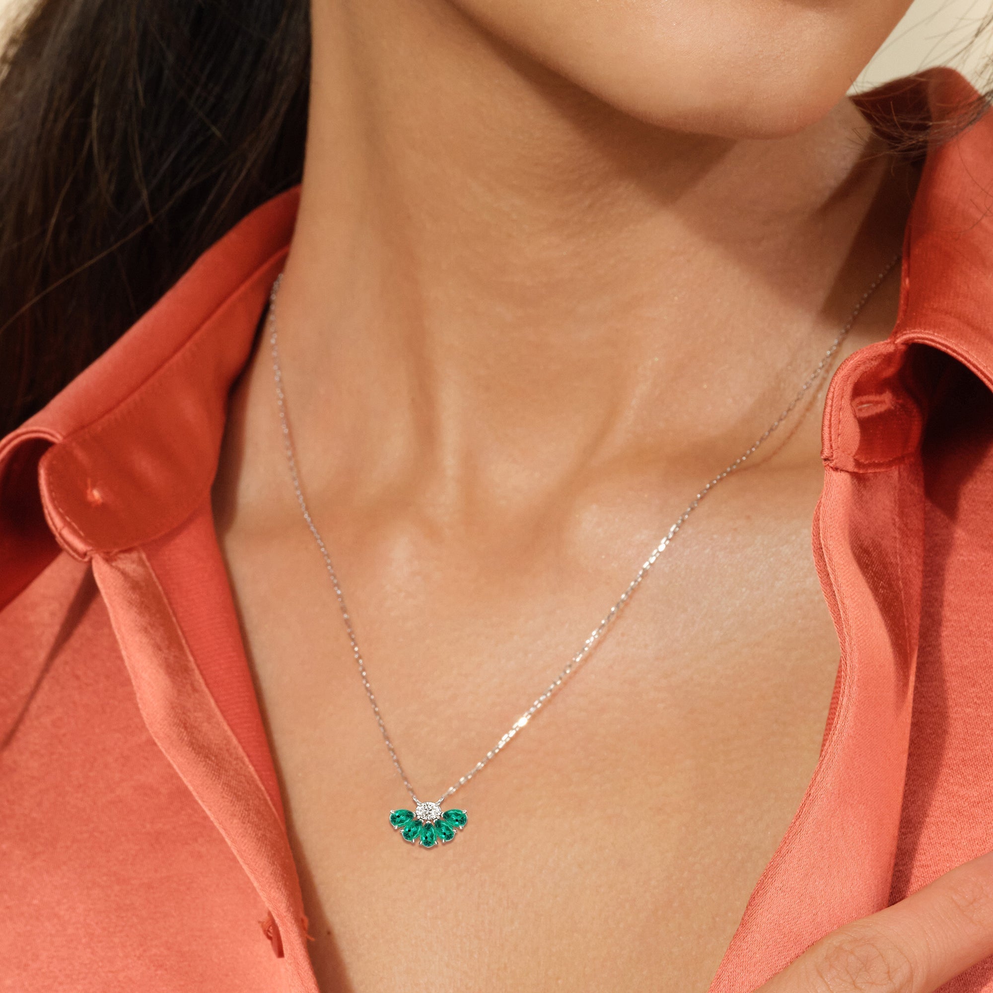 The Daisy Petals Necklace is inspired by the phrase "counting daisies," crafted to bring a touch of charm to your look. The lush necklace holds a radiant pendant composed of a cluster of diamonds. A single oval diamond, set east-west, is decorated below with five pear-cut emeralds that form a fan-shaped silhouette mimicking petals, while the top half represents petals that have already been picked. Its soft beauty and subtle sparkle make this necklace effortlessly elegant.