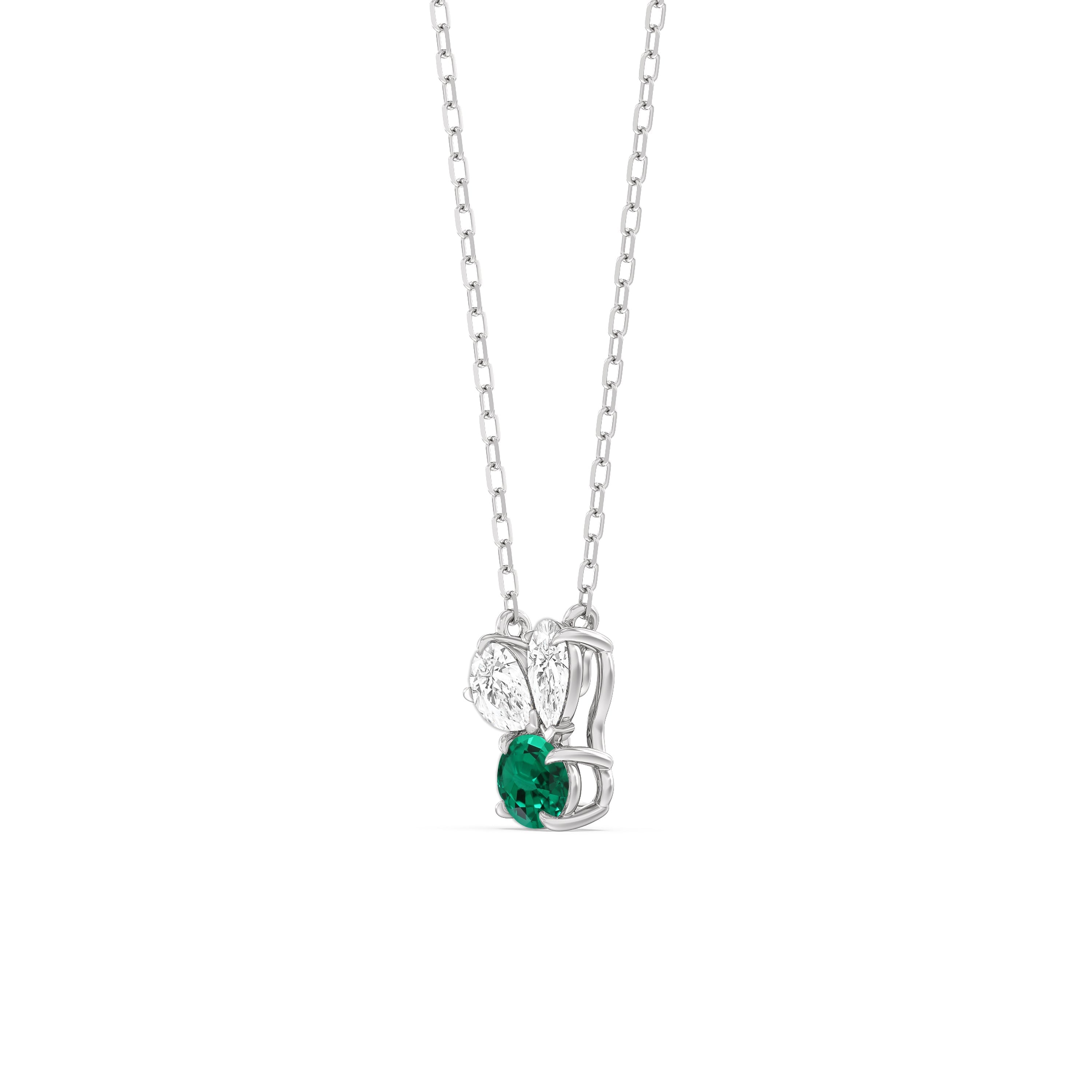This emerald and diamond necklace is a gorgeous option for day or night wear. It carries two pear-cut diamonds of different sizes and emerald. All three diamonds are positioned in a slanted manner, clustered to form a single pendant that radiates a beautiful and brilliant shine.