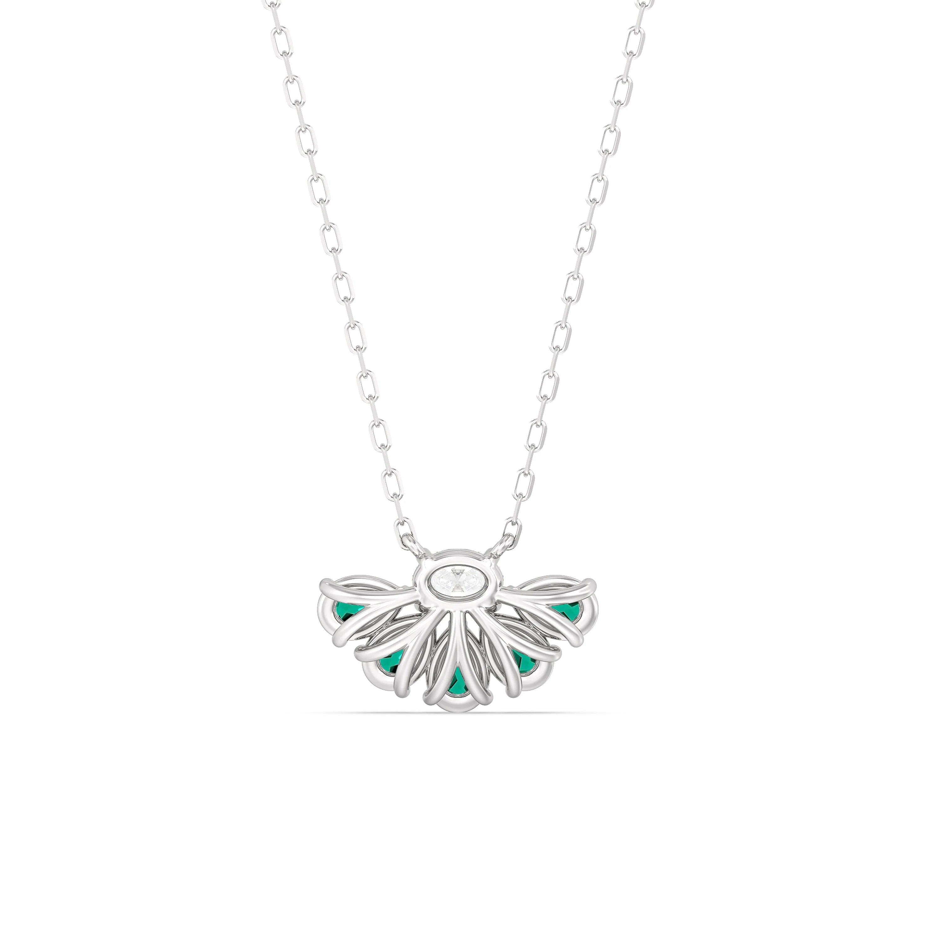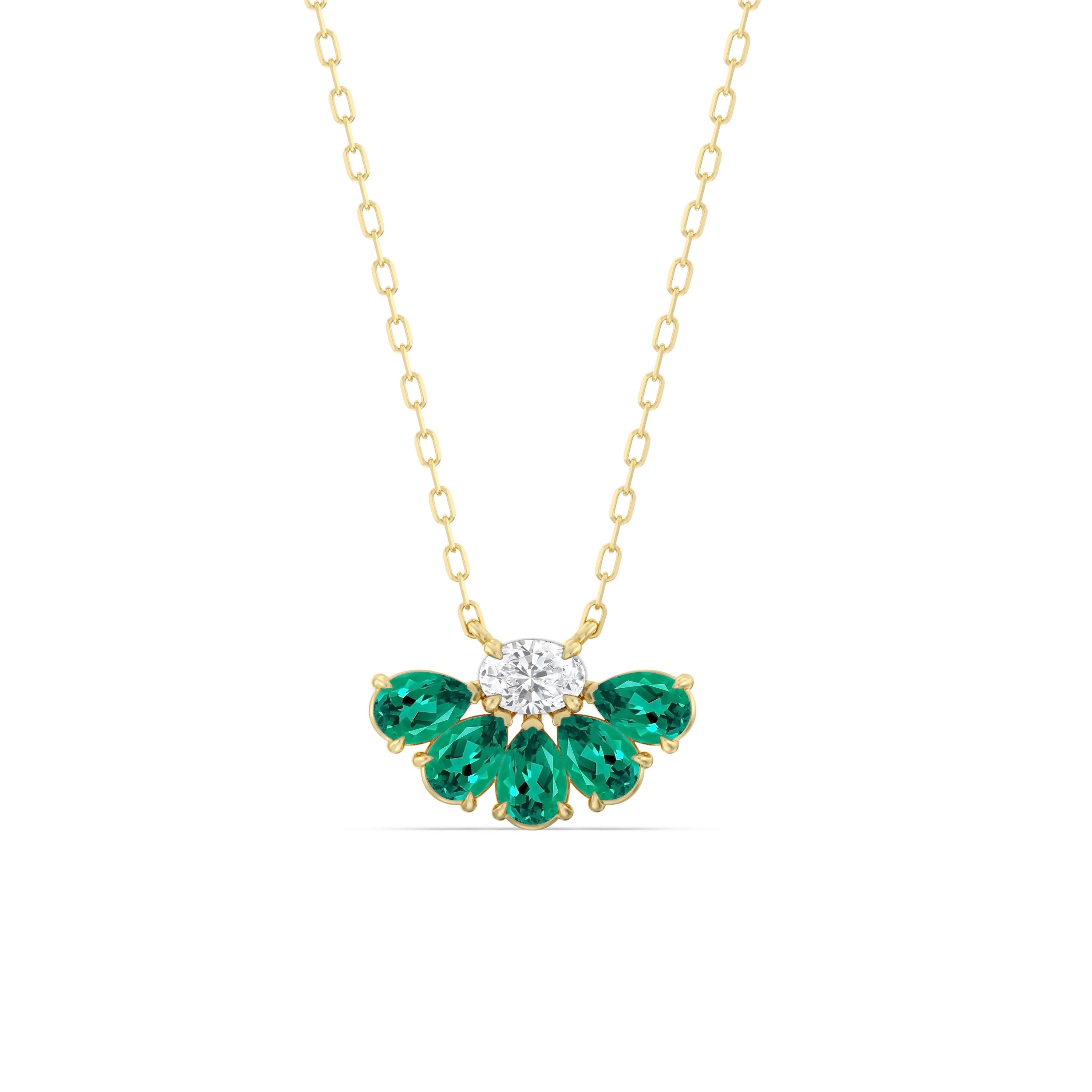 This necklace is crafted to bring a touch of understated glamour to your looks. The necklace holds a radiant pendant composed of a cluster of diamond and emerald. A single oval diamond sits in an east-west position, with its bottom side decorated with five pear-cut emerald that form a fan-shaped silhouette. The soft beauty and subtle sparkle of this necklace will draw just enough attention to your neck and face.