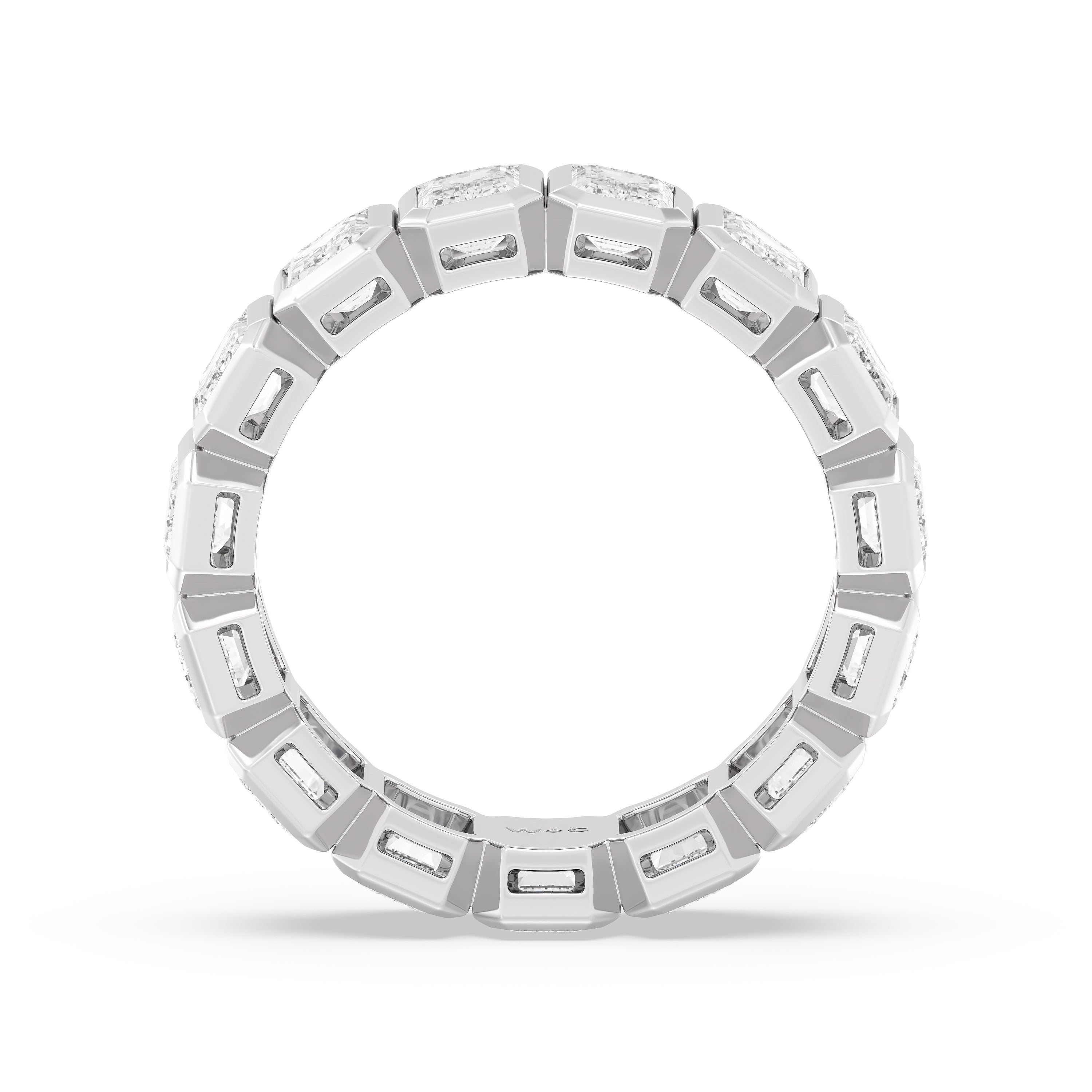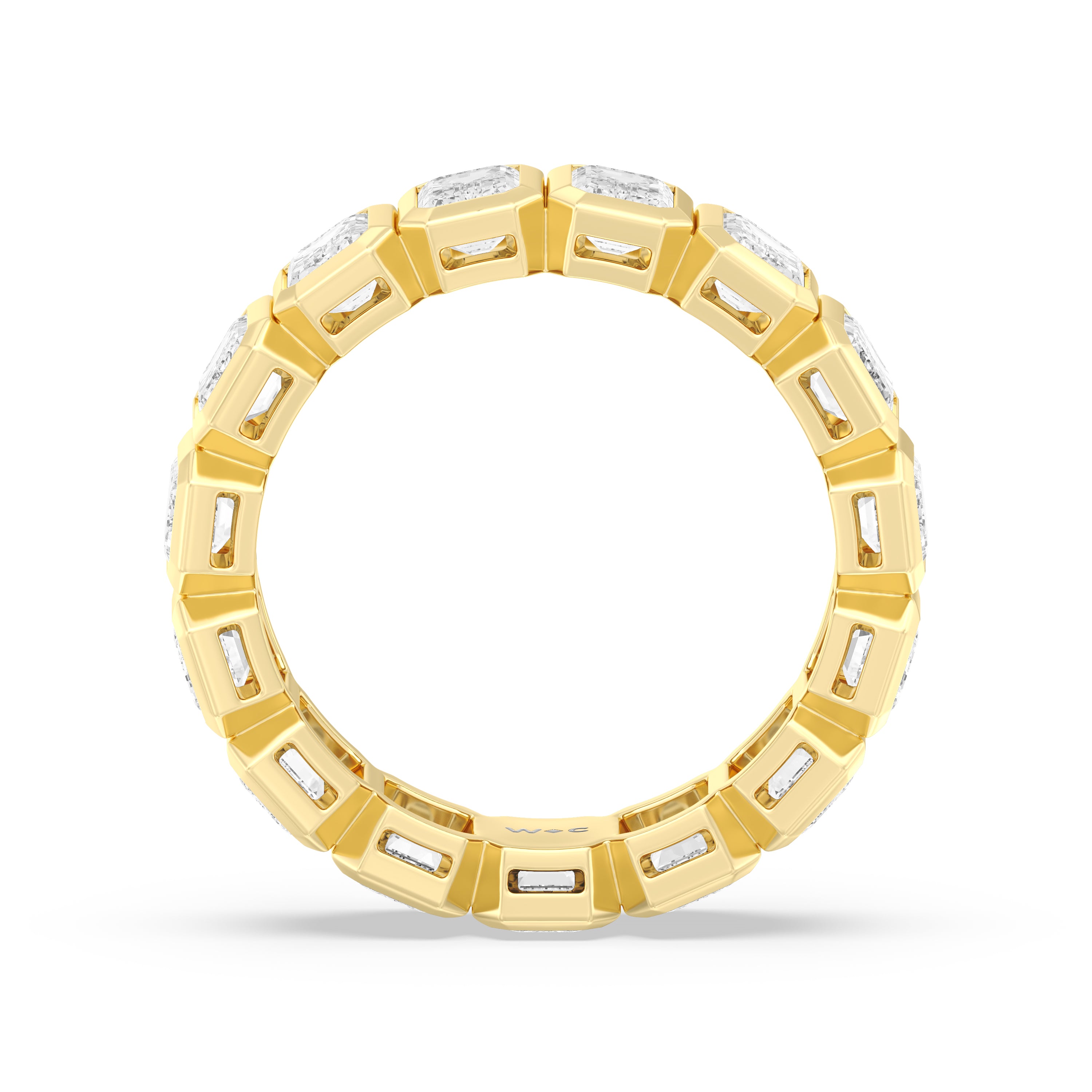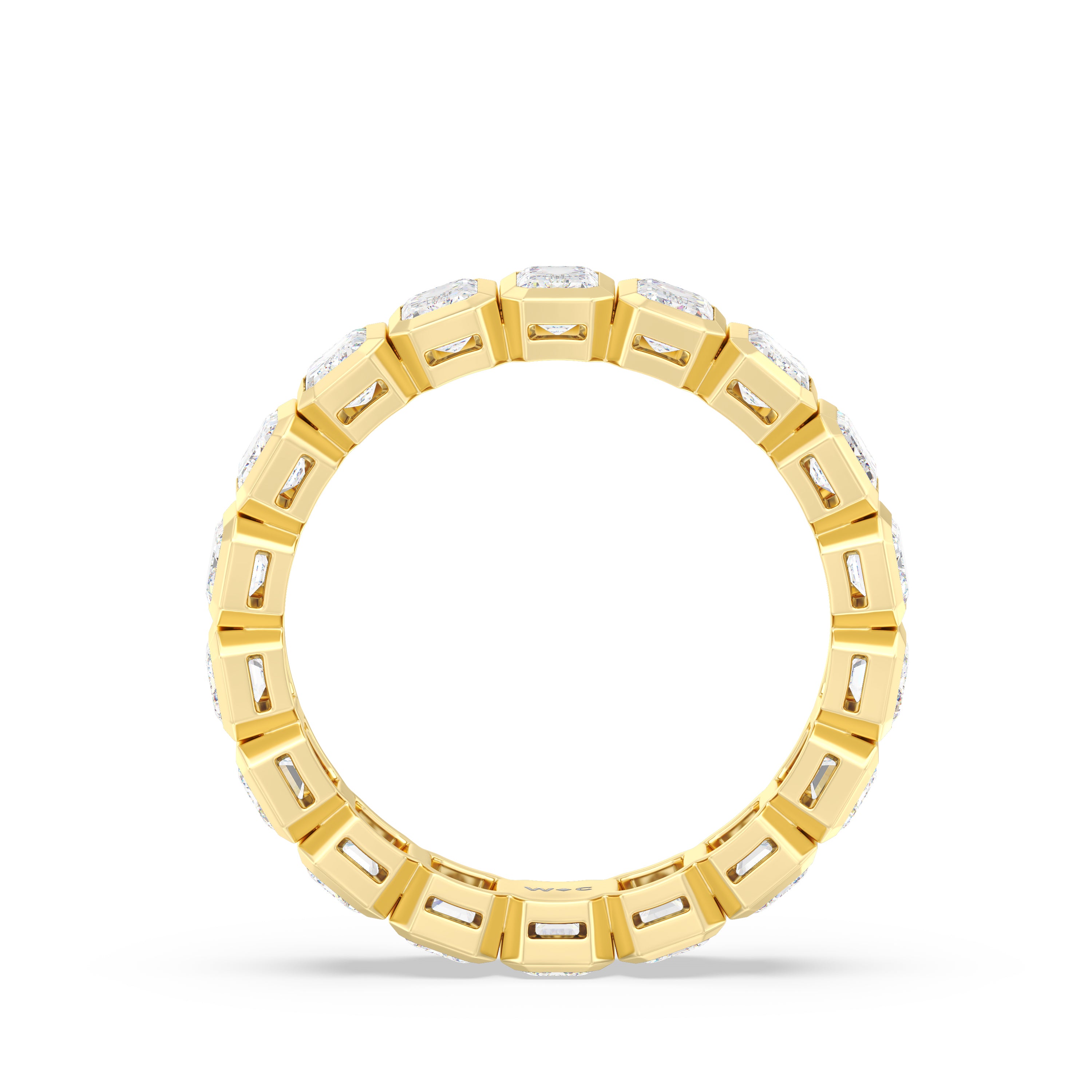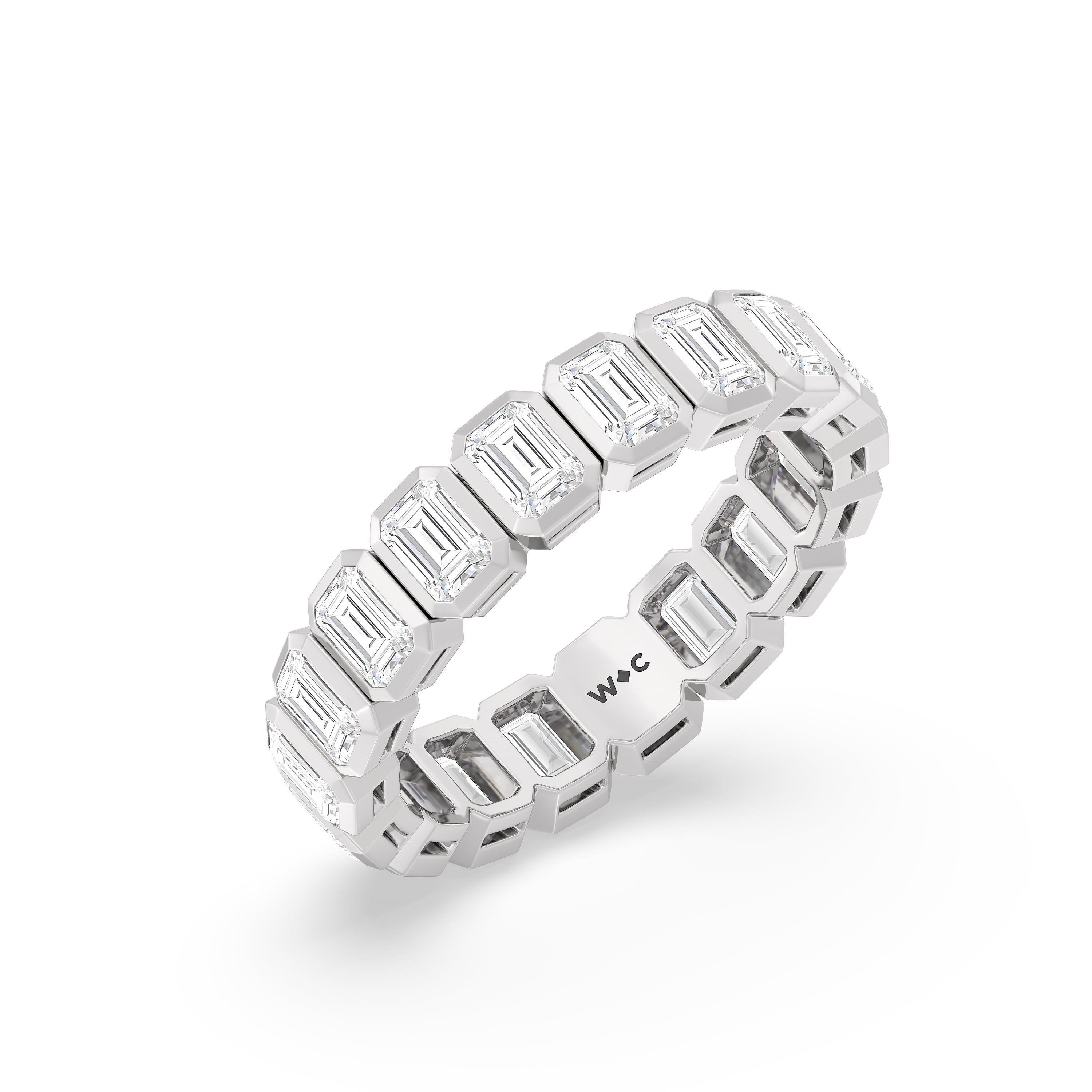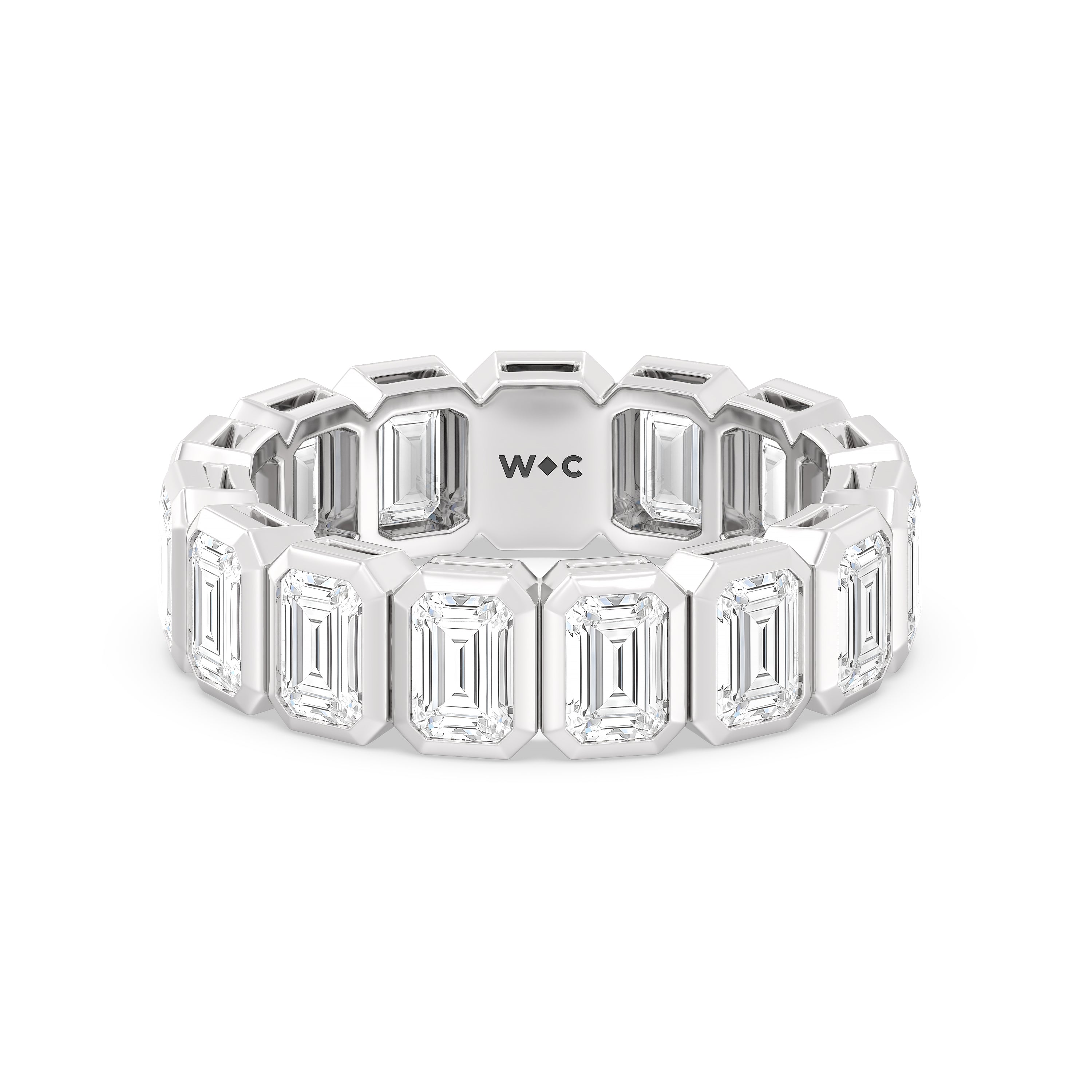 Modern and sleek, this eternity ring adds an unforgettable touch. The emerald shape accentuates the size of each diamond, creating an impactful look. The bezel setting allows for smooth, comfortable all day wear.