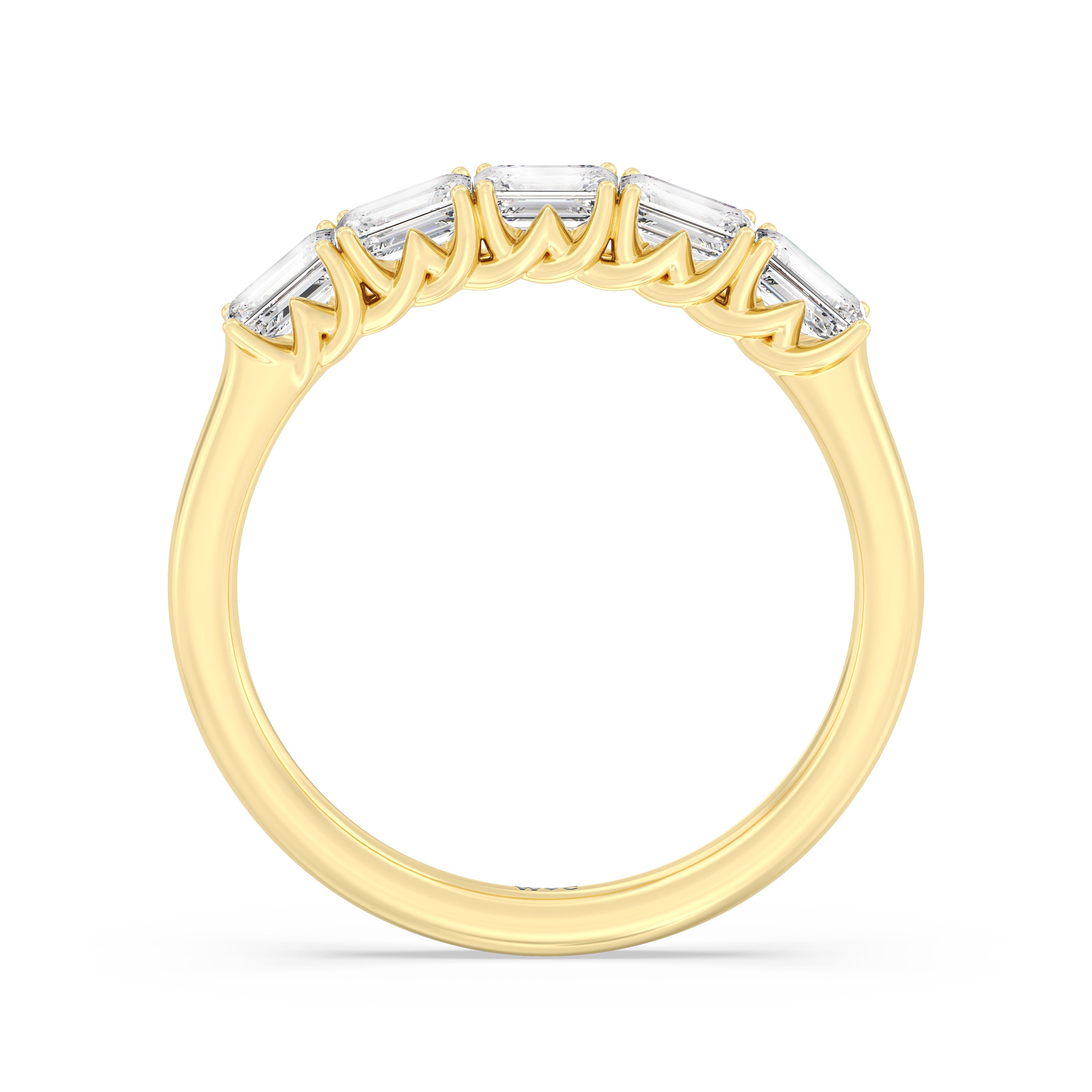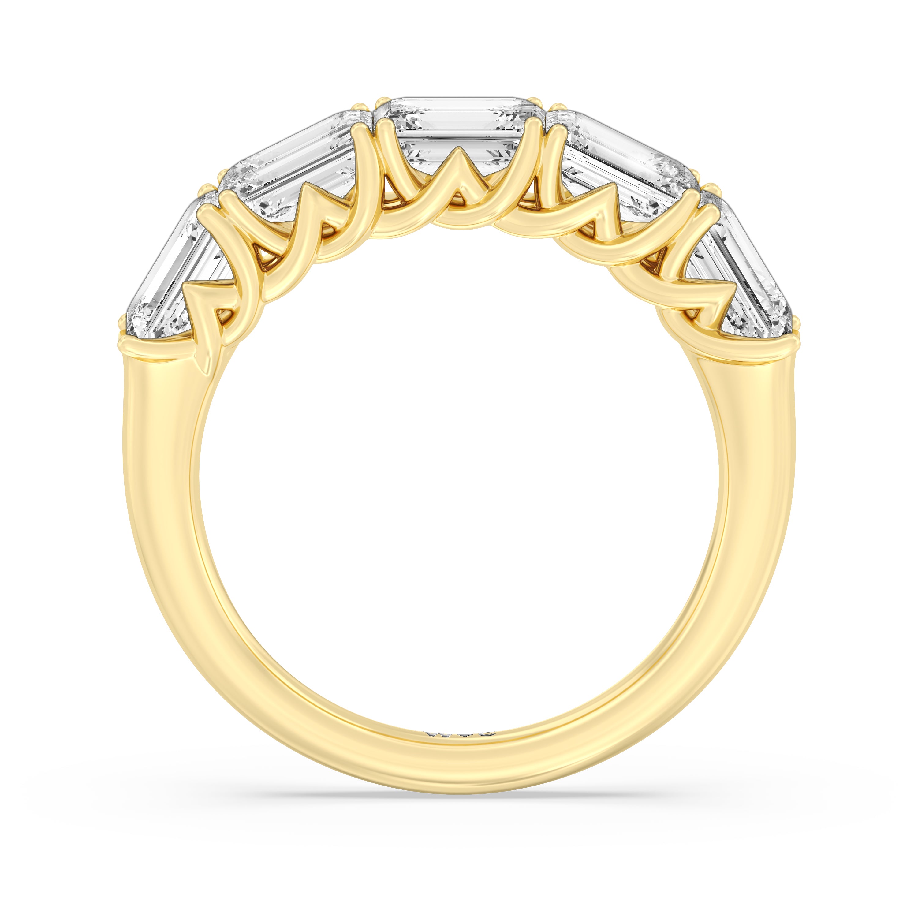 This ring looks modest and refined yet has a charming, unexpected twist. The slim band has its upper half traced with nine emerald-cut diamonds. Each diamond is secured by a four-prong U-shaped basket that intertwines with a wavy bridge.