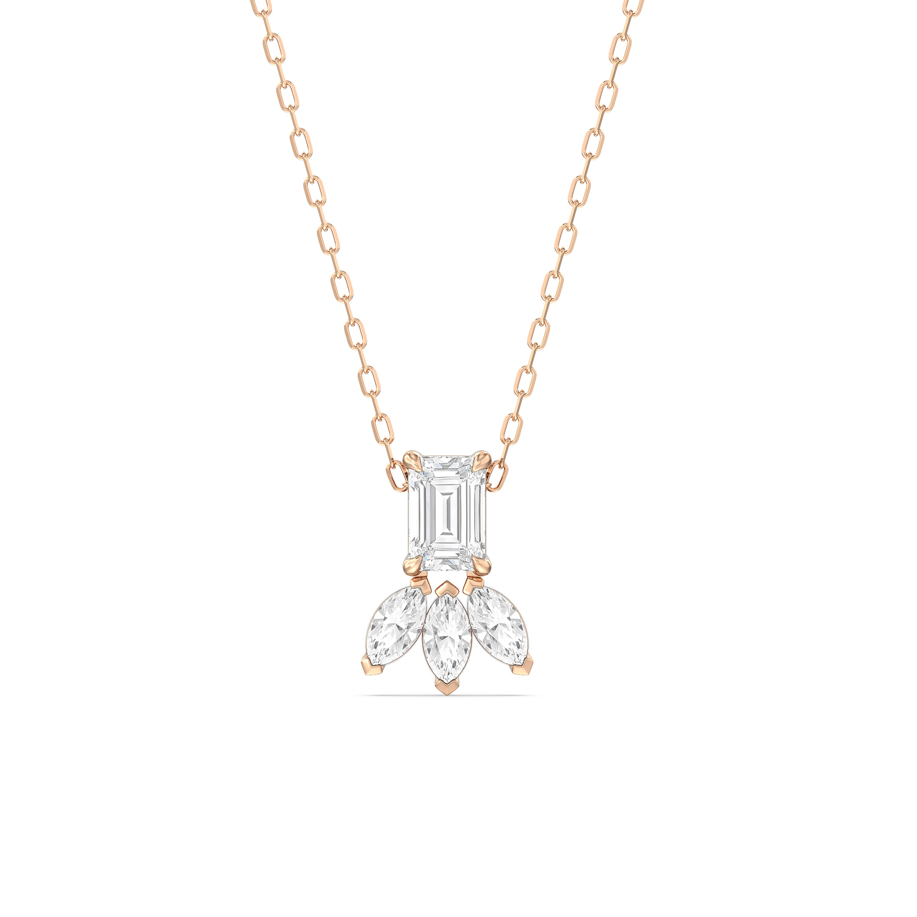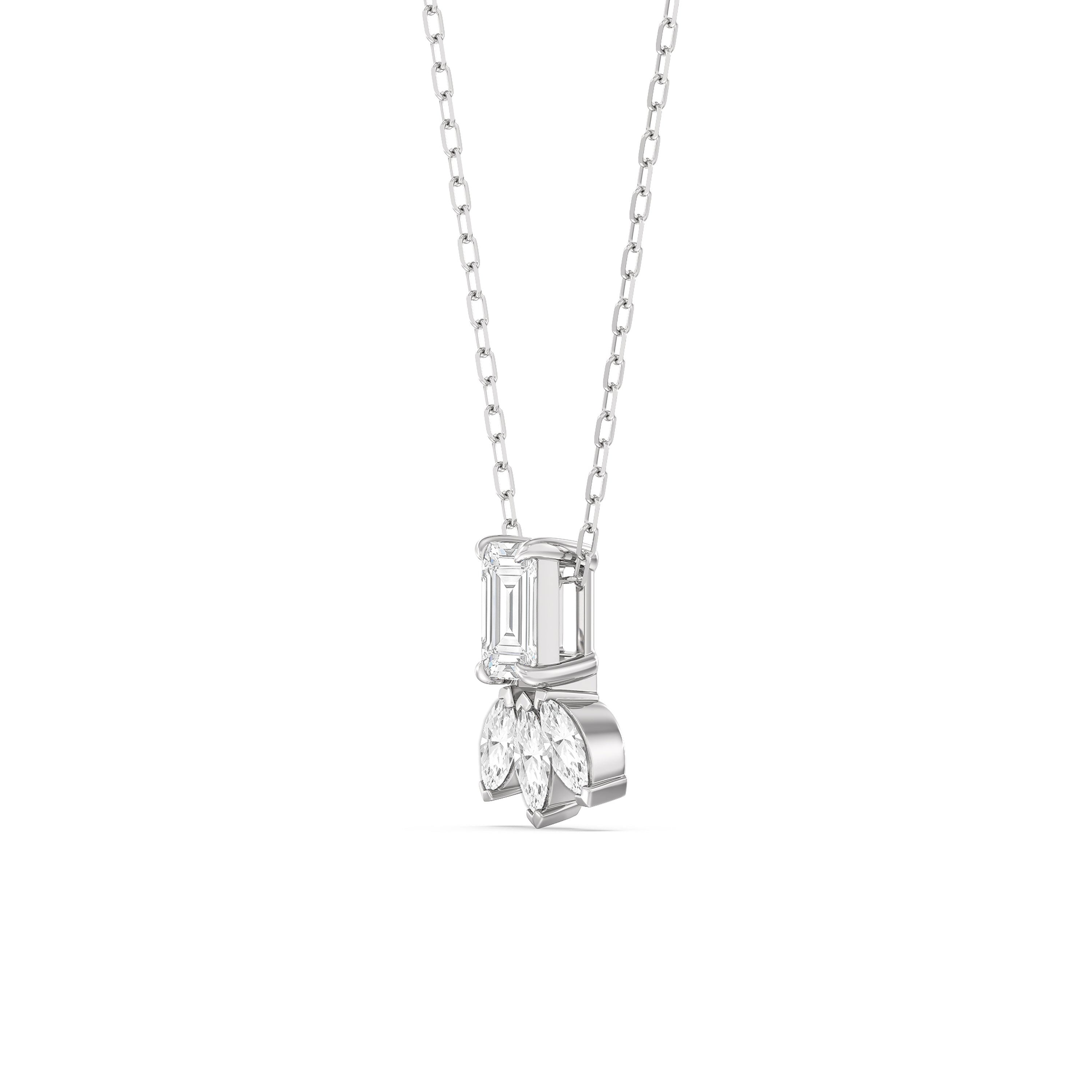 Spice up work or date-night outfits with the gleaming glow of this diamond necklace. It features a 0.50 ct emerald-cut diamond in a north-south setting, adorned at the bottom with a trio of marquise diamonds. This necklace is undoubtedly an unfussy classic that you can mix, match, and layer effortlessly.