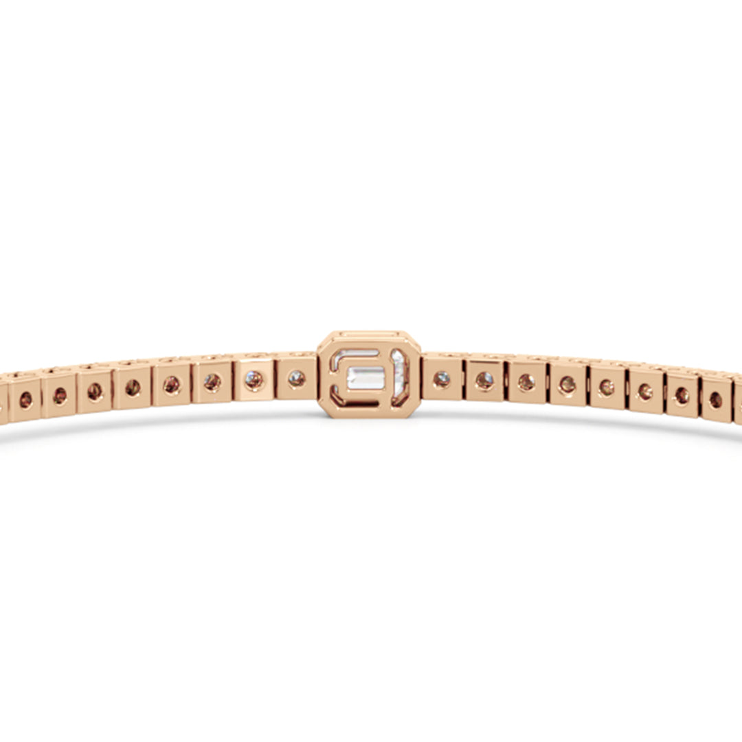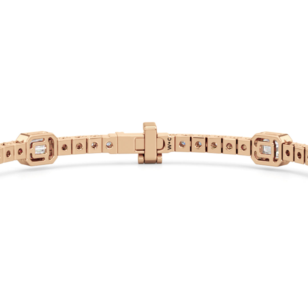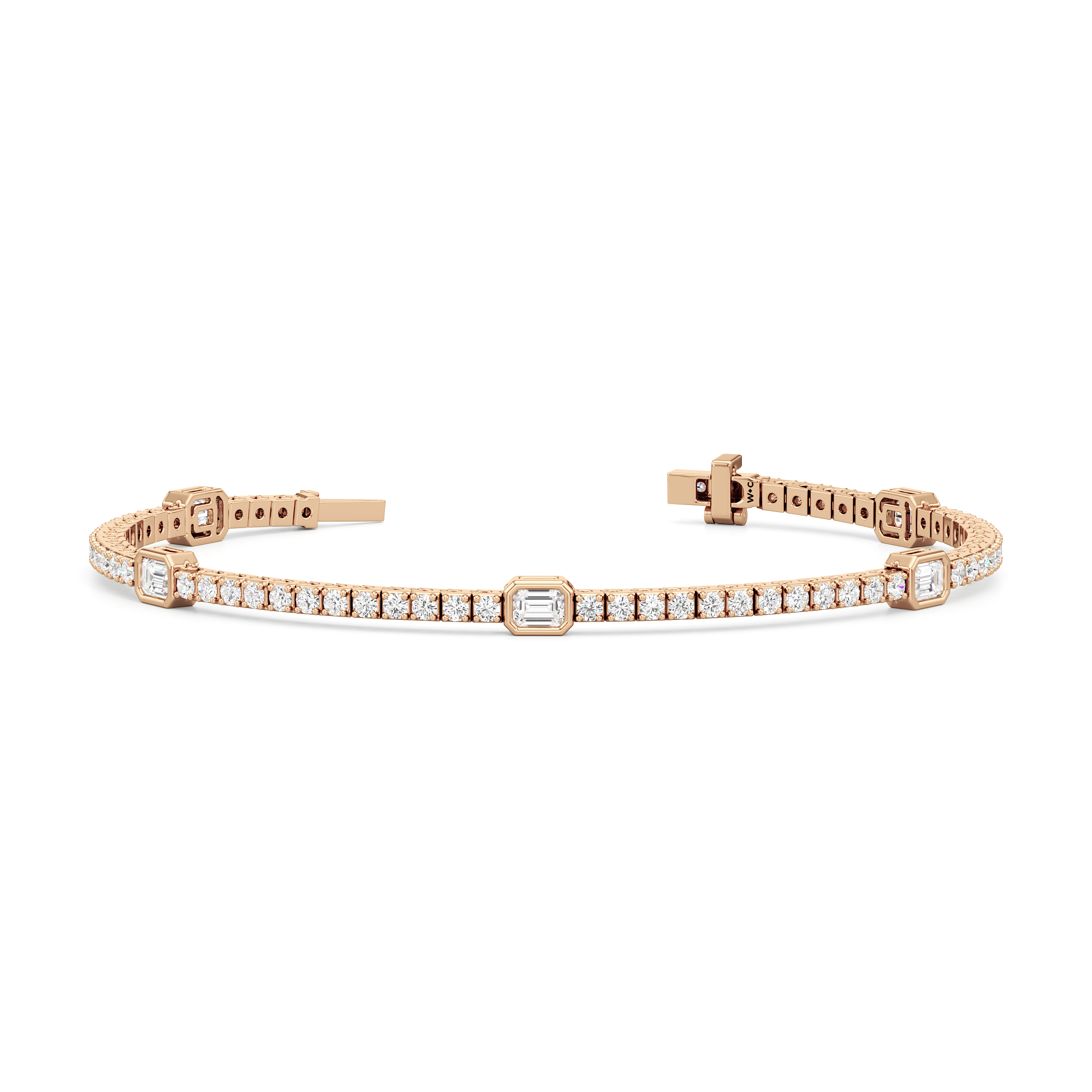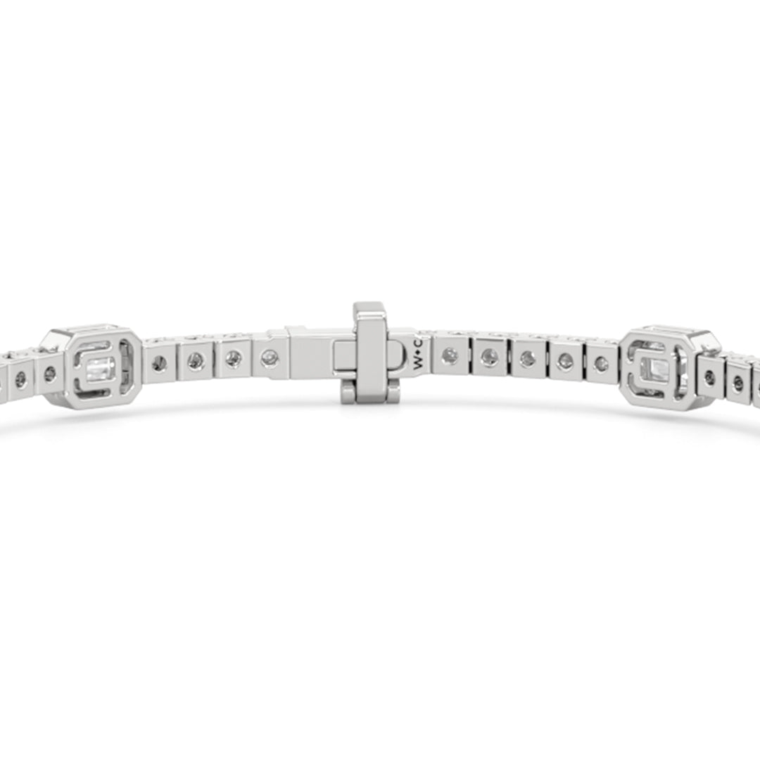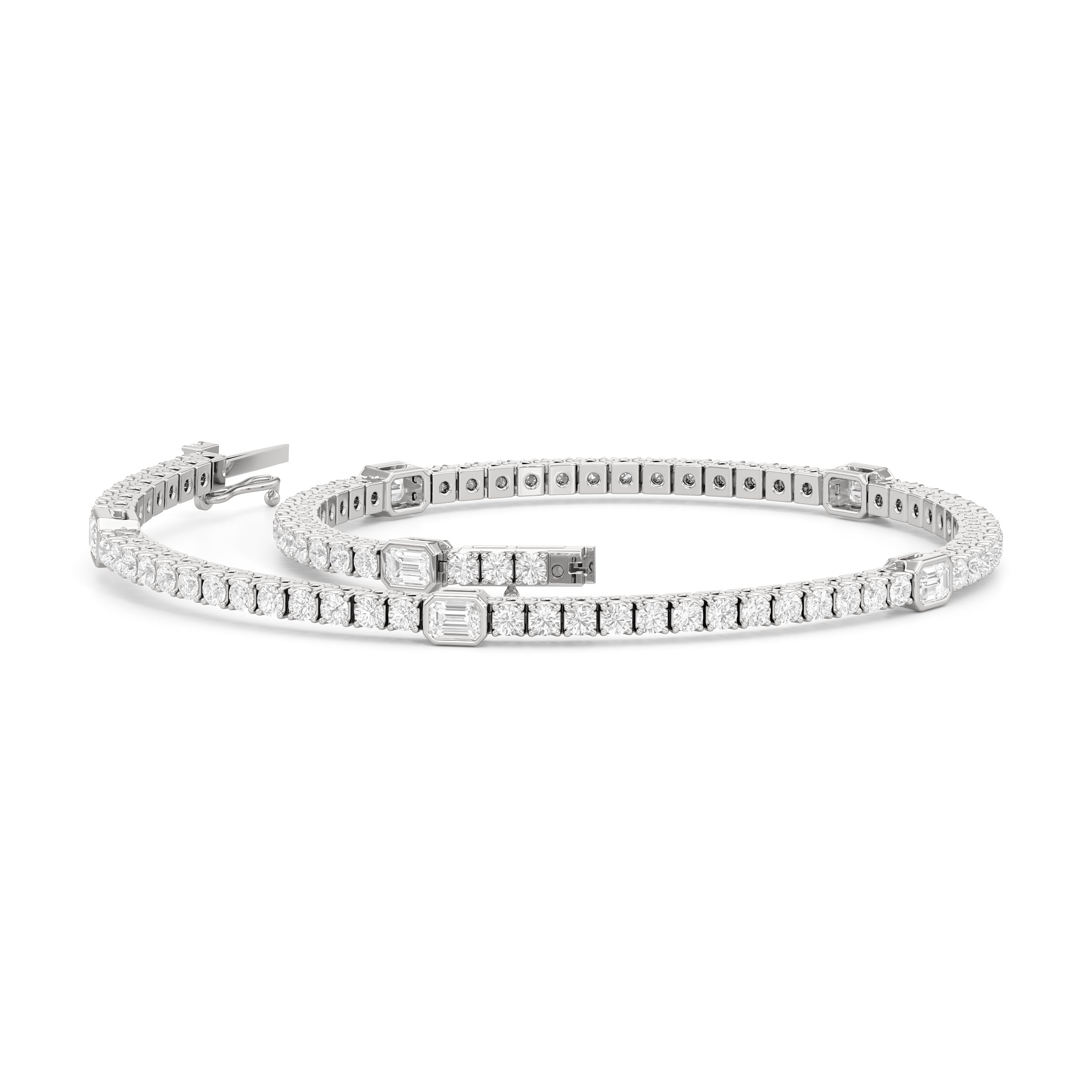 Embodying luxury and refinement, this diamond tennis bracelet is adorned with five emerald-cut diamonds on emerald bezels precisely placed at stations along a continuous line of round diamonds. Each round diamond is expertly set on a four-prong box collet, creating a sleek look. This elegant fine jewelry perfectly complements an emerald diamond engagement ring.