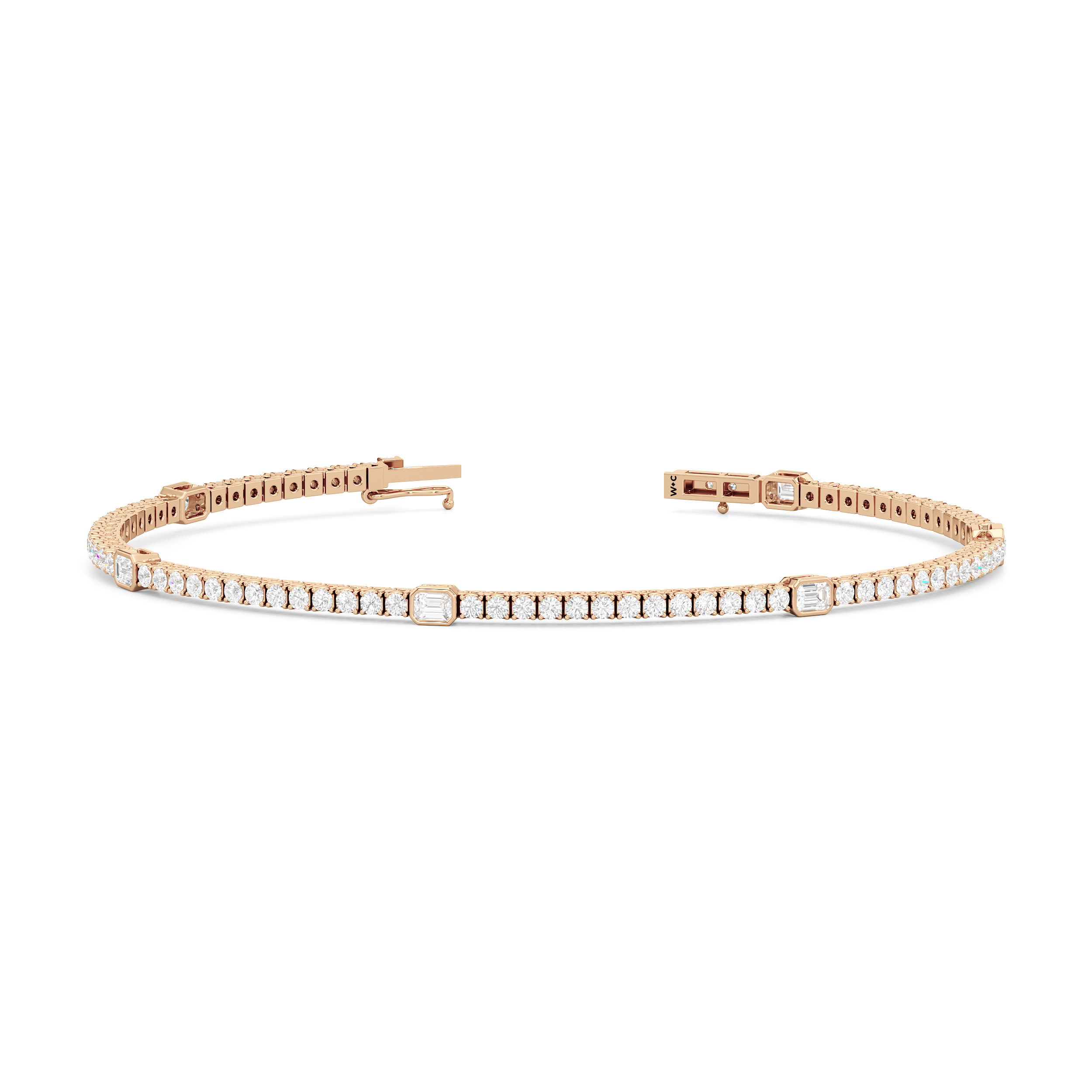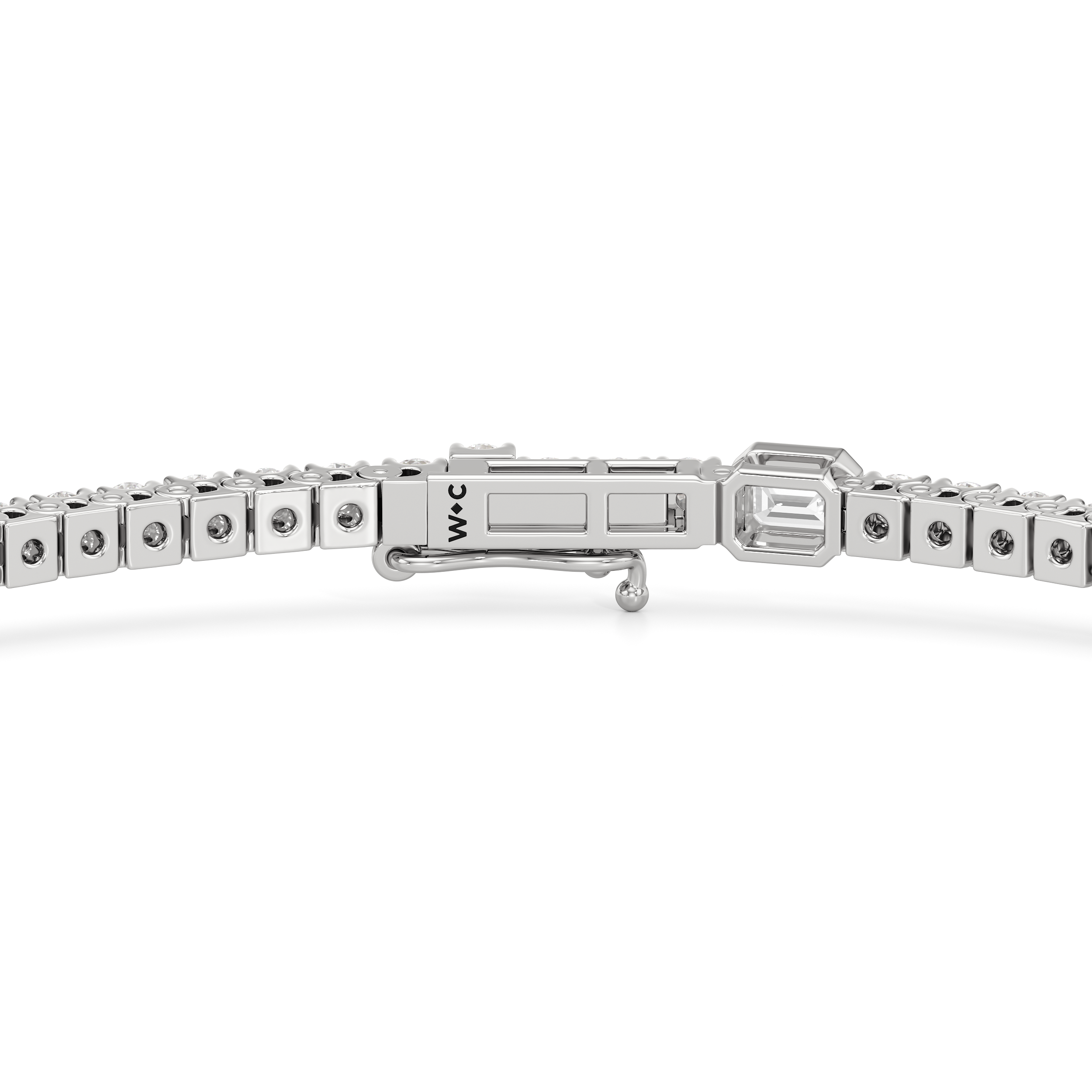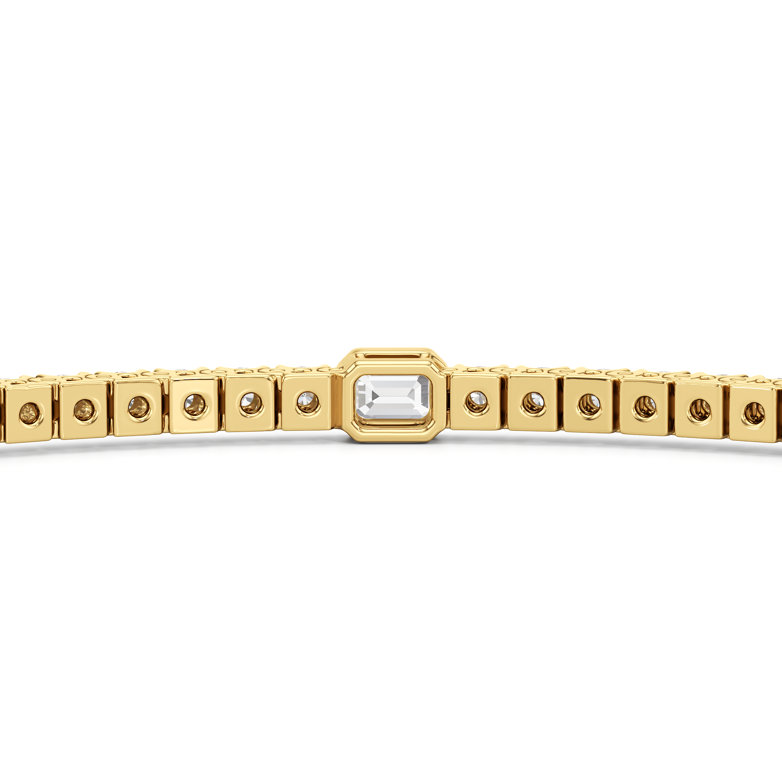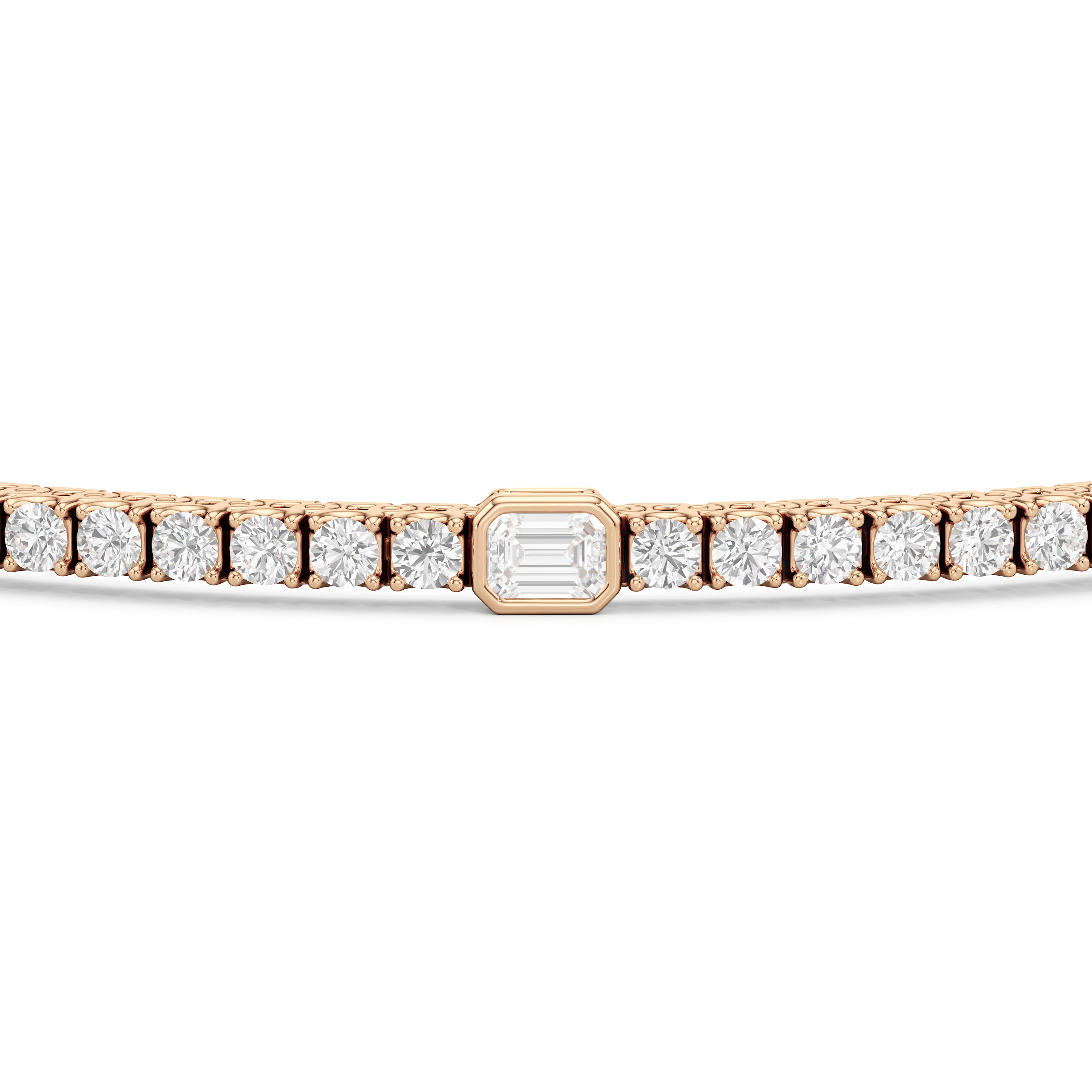 Embodying luxury and refinement, this diamond tennis bracelet is adorned with five emerald-cut diamonds on emerald bezels precisely placed at stations along a continuous line of round diamonds. Each round diamond is expertly set on a four-prong box collet, creating a sleek look. This elegant fine jewelry perfectly complements an emerald diamond engagement ring.