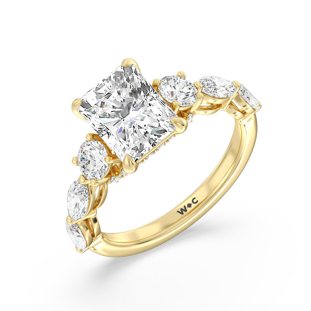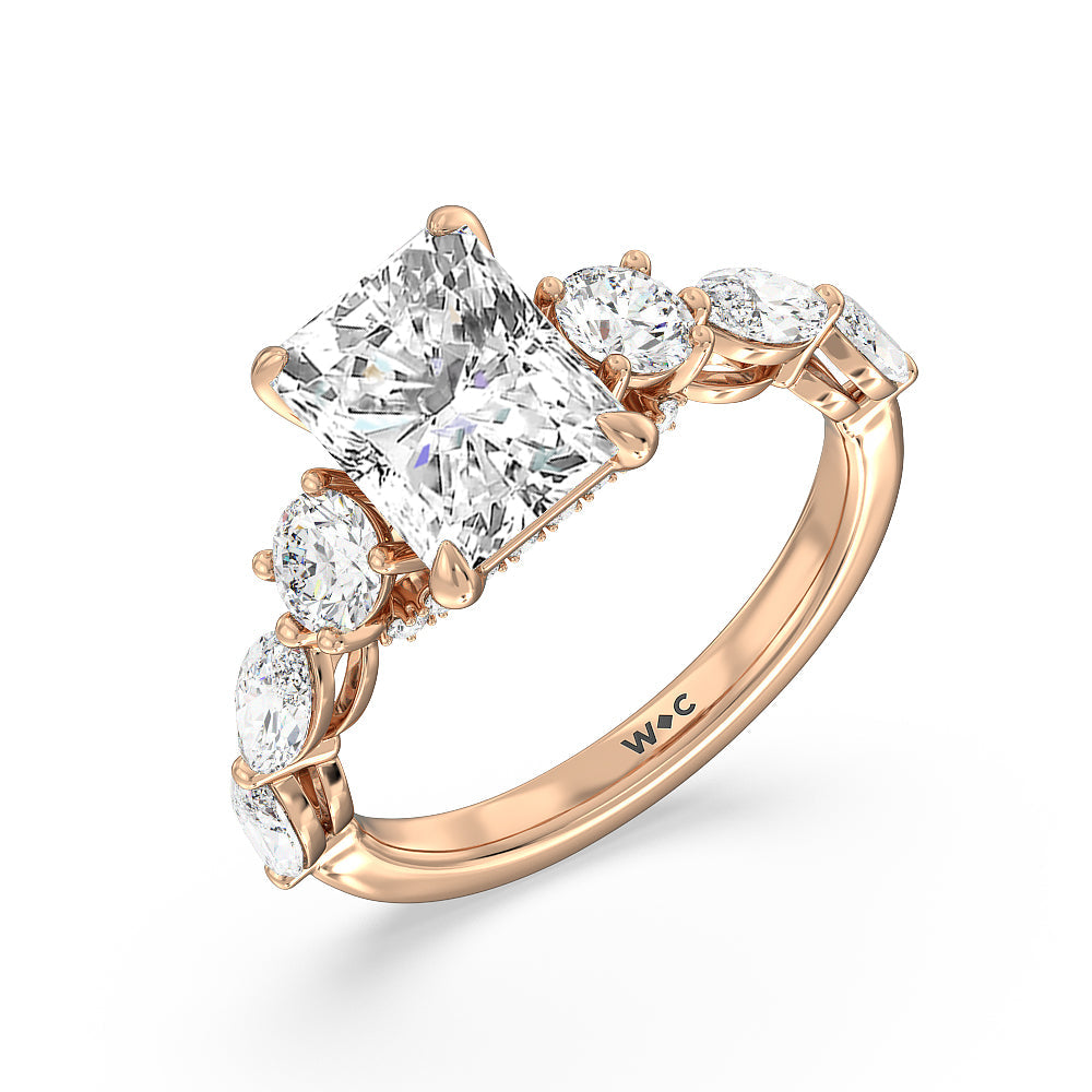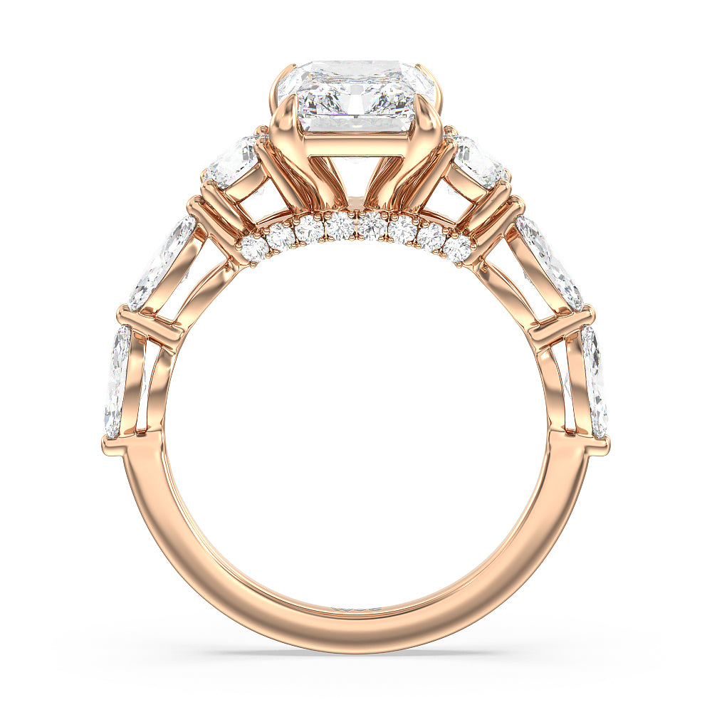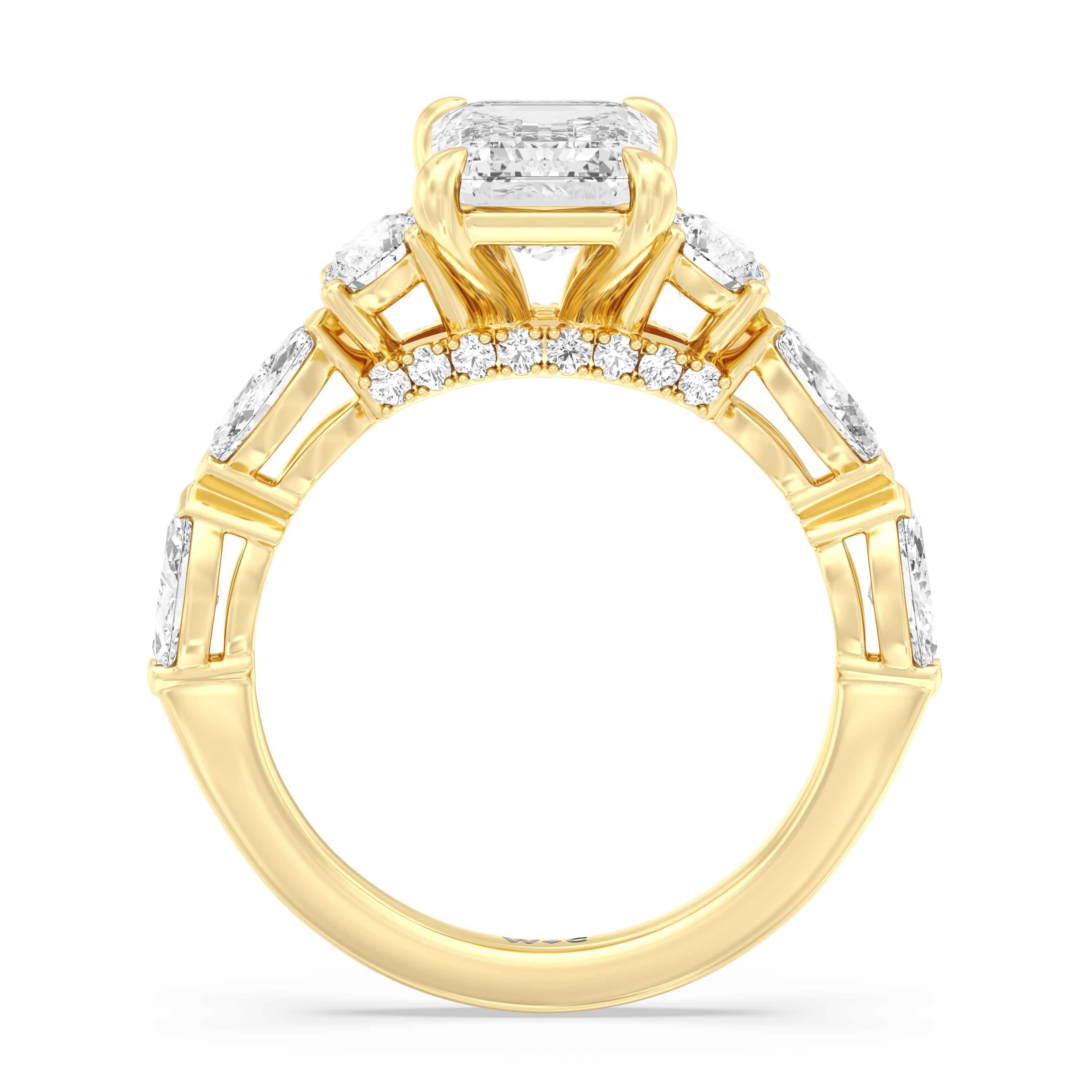 Designed for the fashion forward bride to be, this engagement ring impresses with its studded band adorned with fancy cut diamonds. The ring's diamond lined shoulders are sculpted to follow the shape of the side stones that lead to a shimmering lab grown central diamond. The bridge is marked by smaller round diamonds for added sparkle.