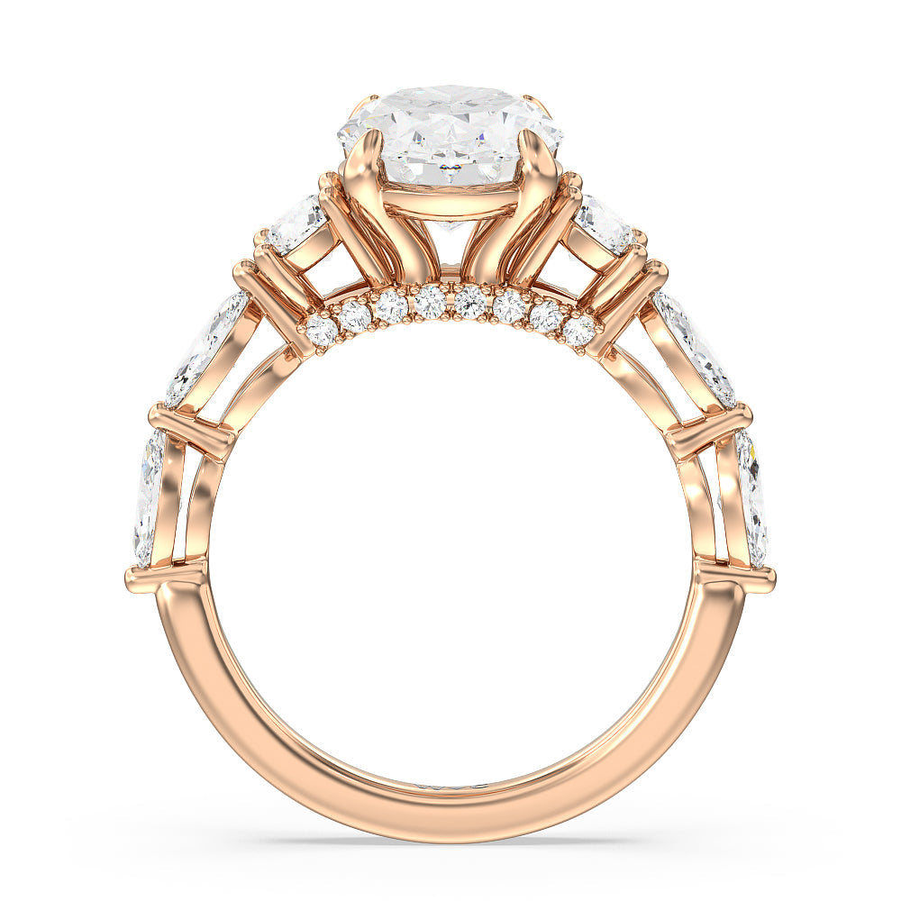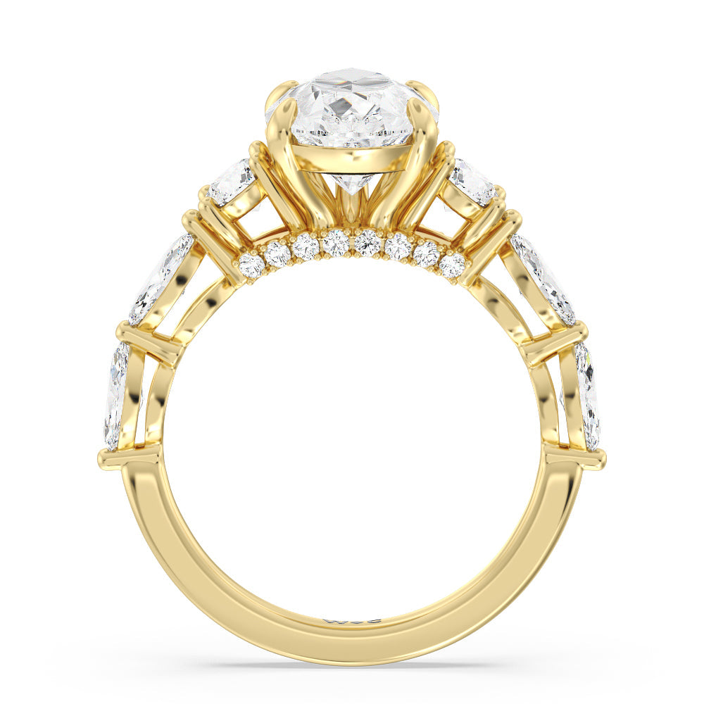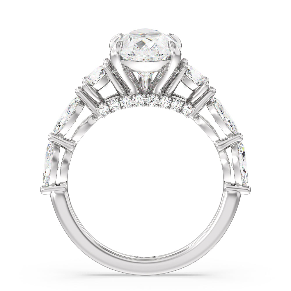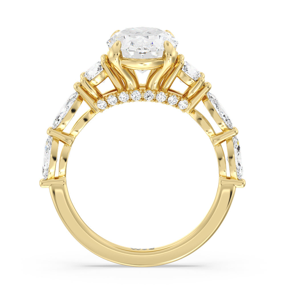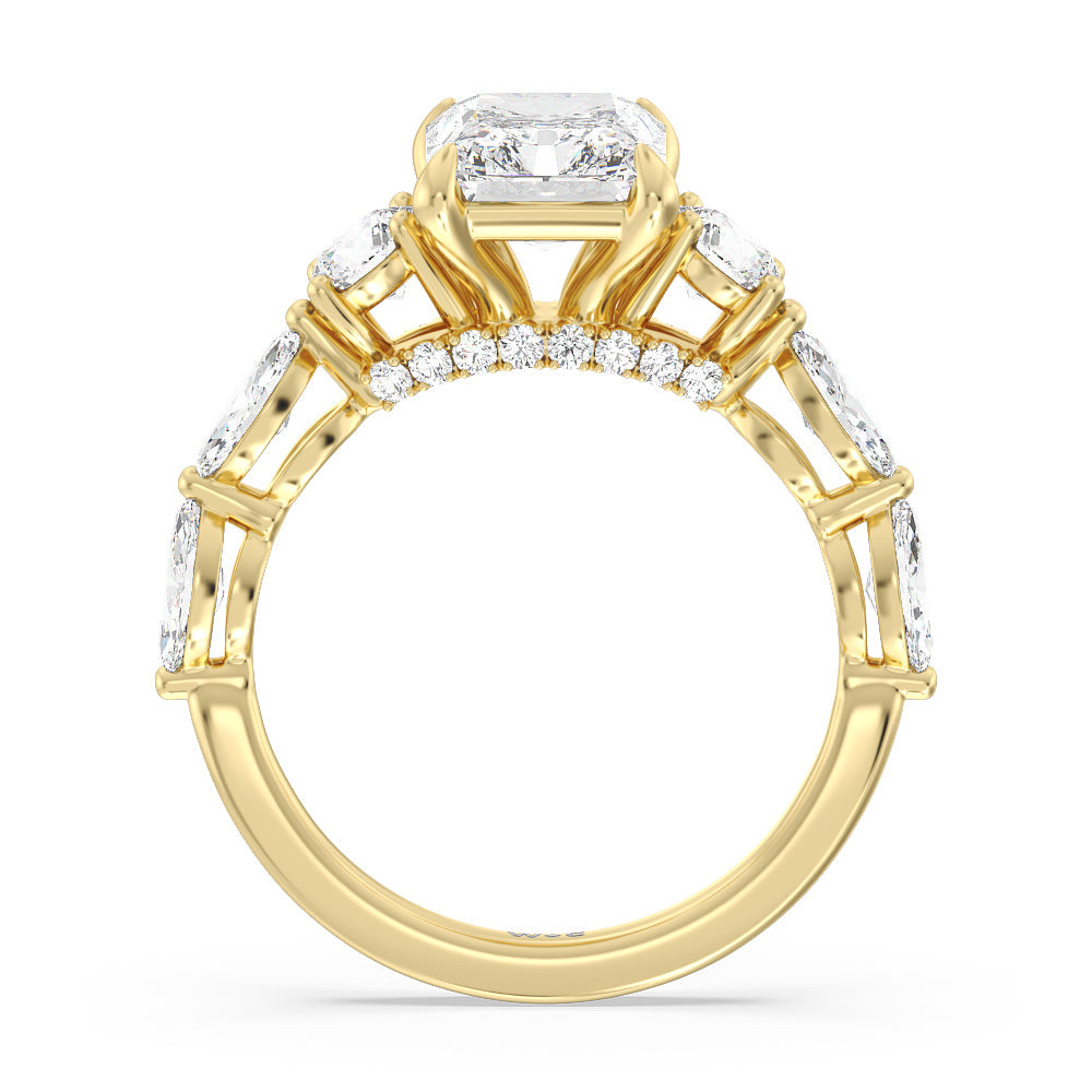 Designed for the fashion forward bride to be, this engagement ring impresses with its studded band adorned with fancy cut diamonds. The ring's diamond lined shoulders are sculpted to follow the shape of the side stones that lead to a shimmering lab grown central diamond. The bridge is marked by smaller round diamonds for added sparkle.