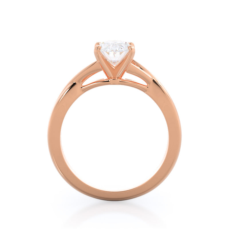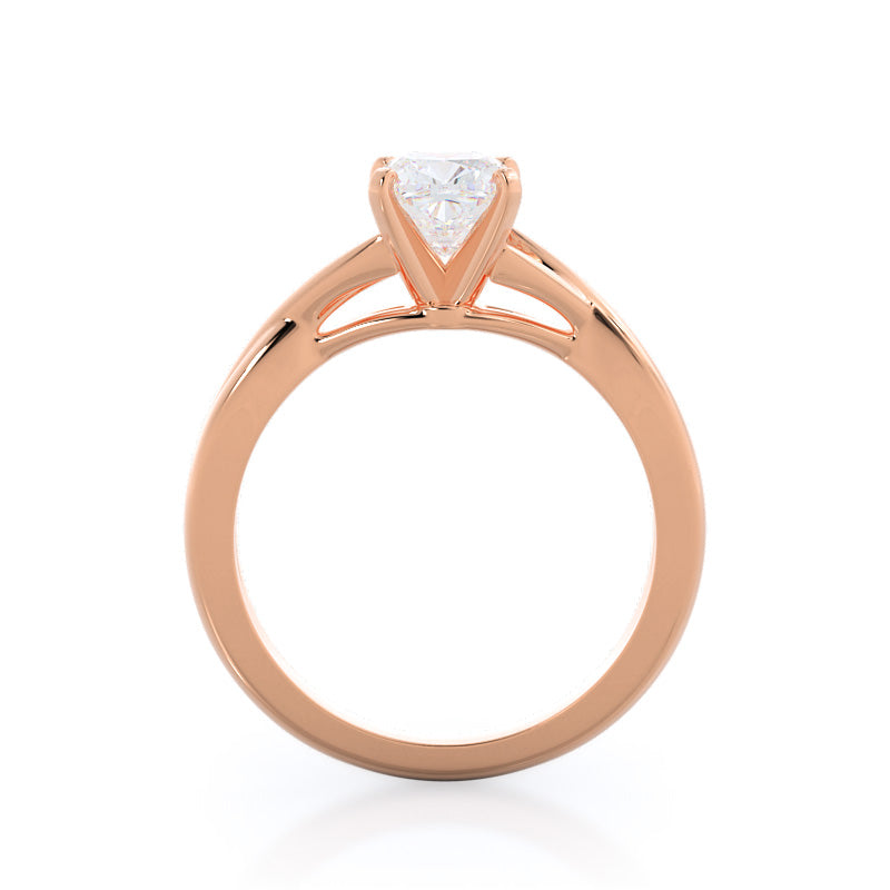 A traditional cathedral head cradles the diamond of the ring to let more light hit and accentuate the diamond. The twisting band adds another element of style.