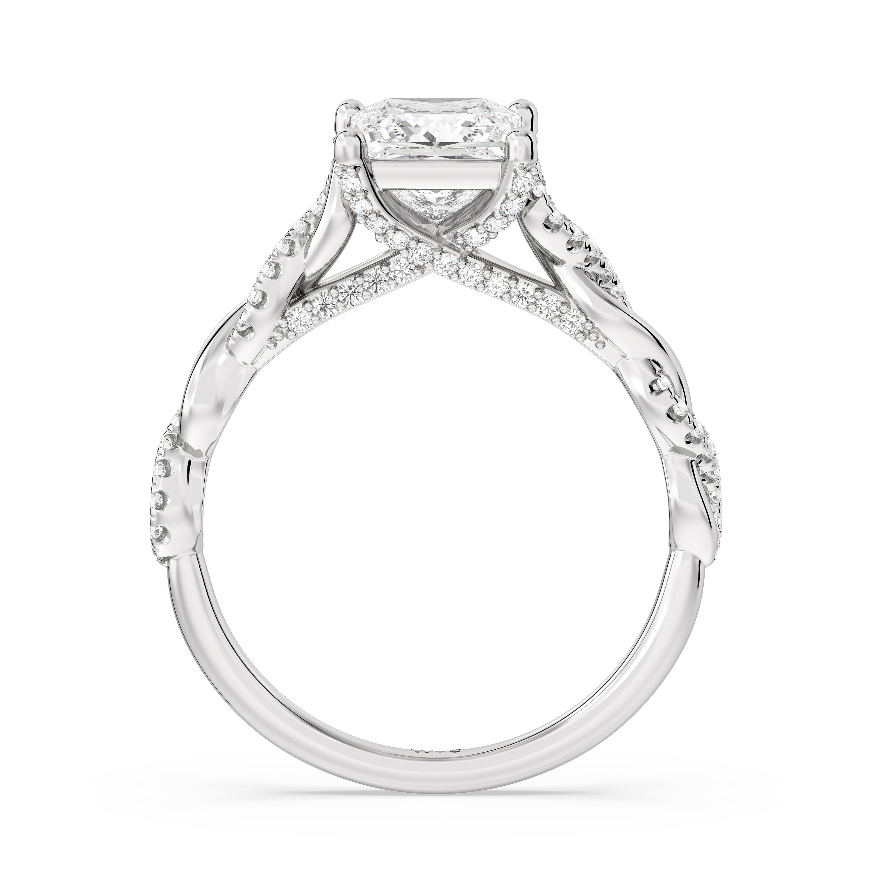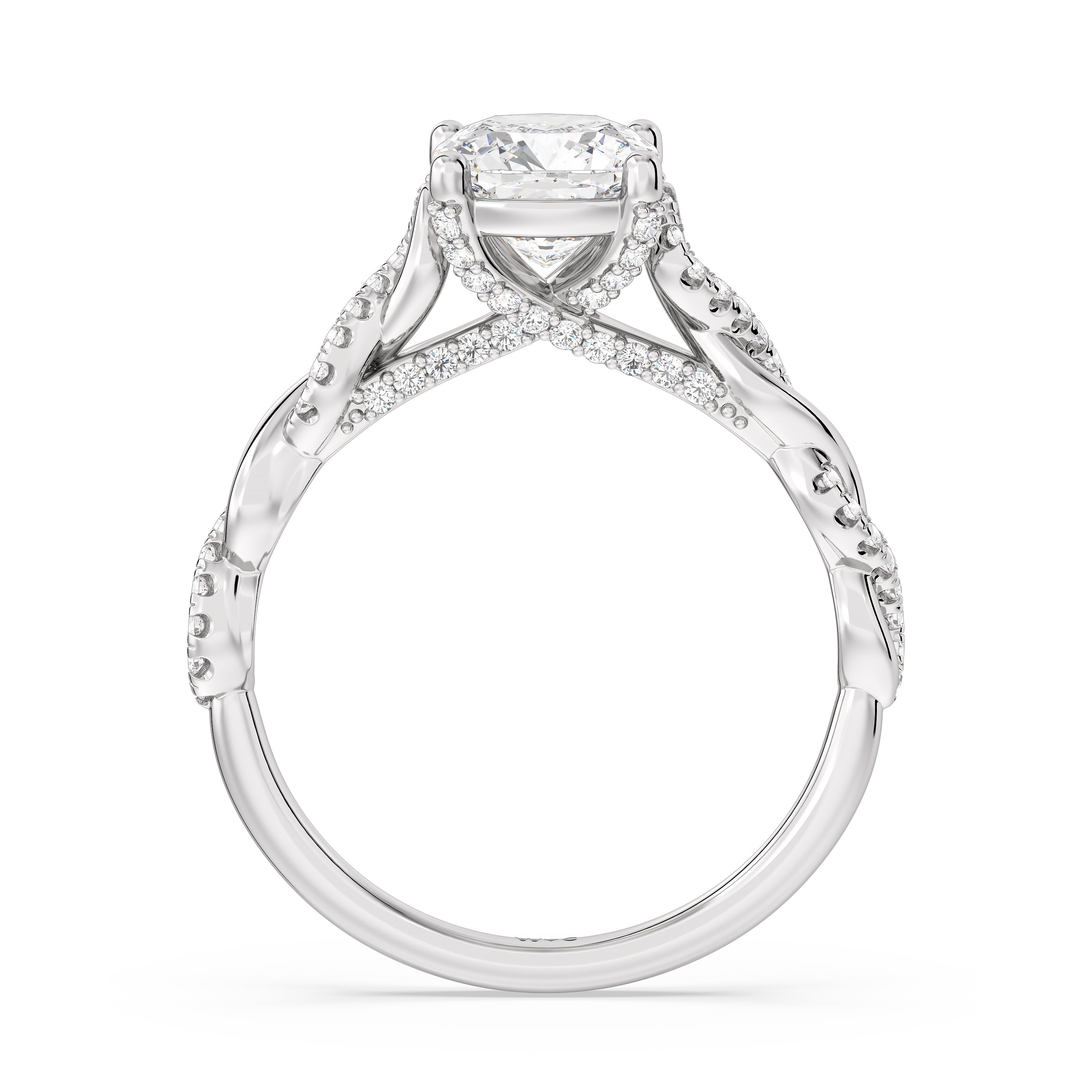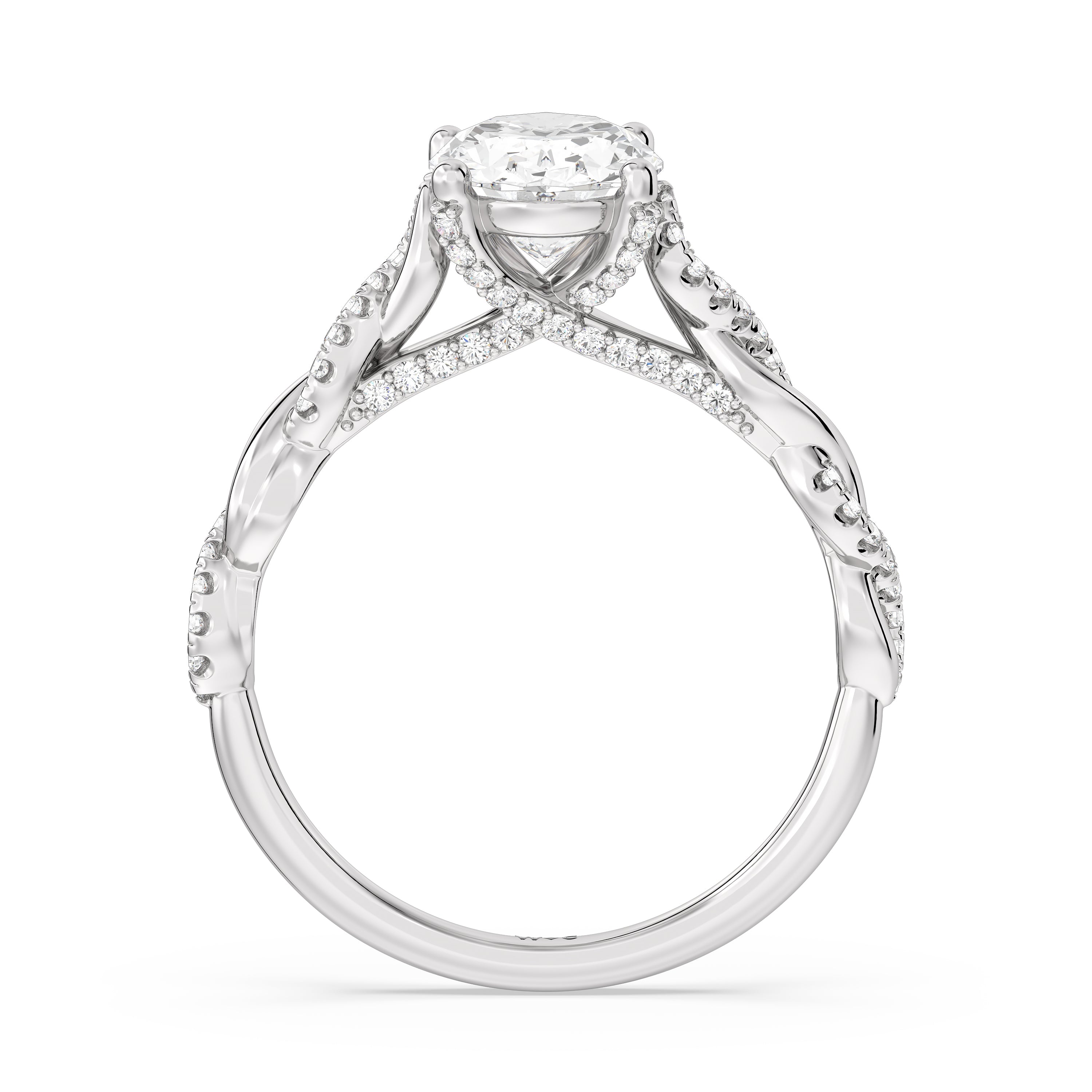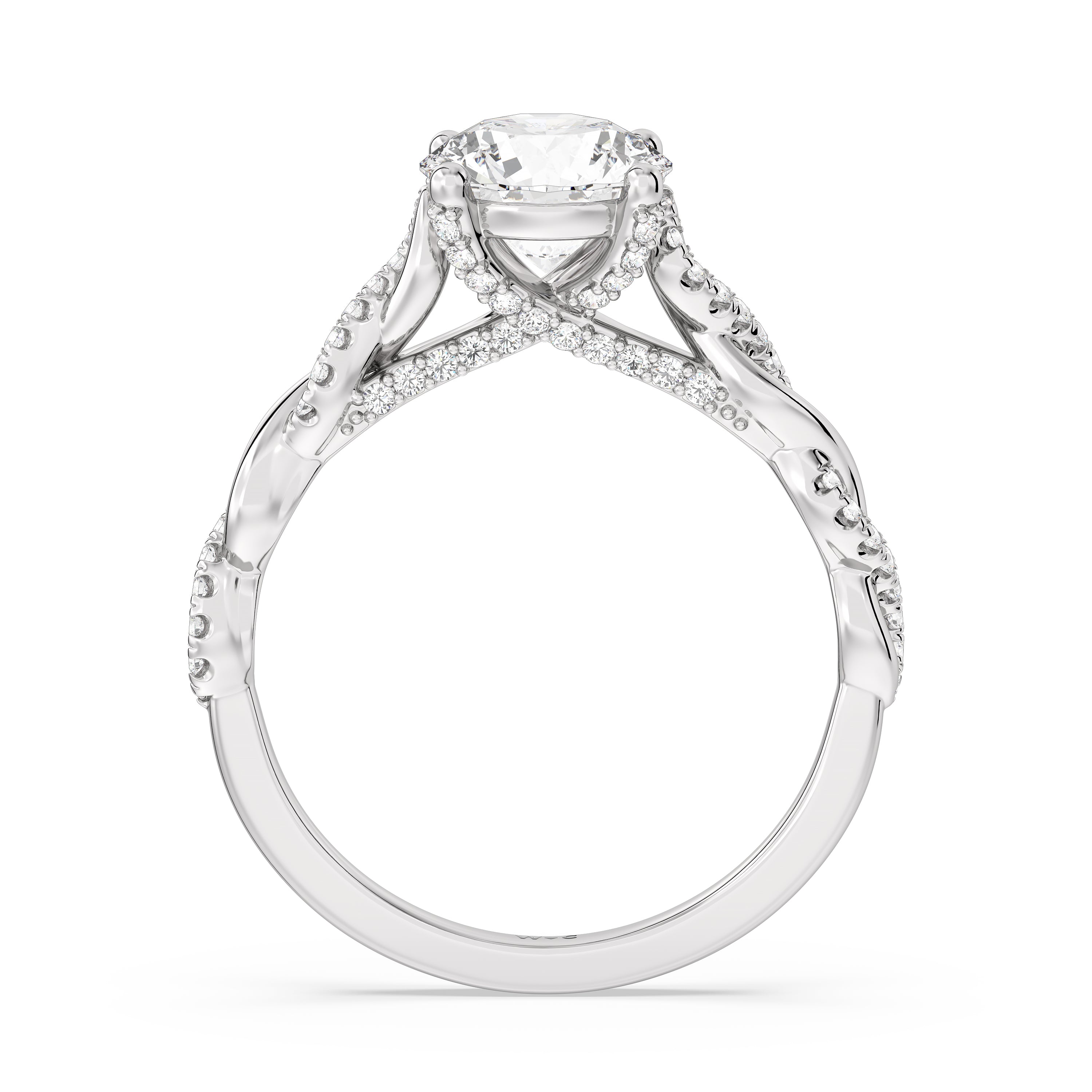 To showcase the dazzling centerpiece of this engagement ring, the embellished band splits to twist over and under itself up to flank the center stone, with the four prongs elegantly formed of sparkling crossover detail in the front view.