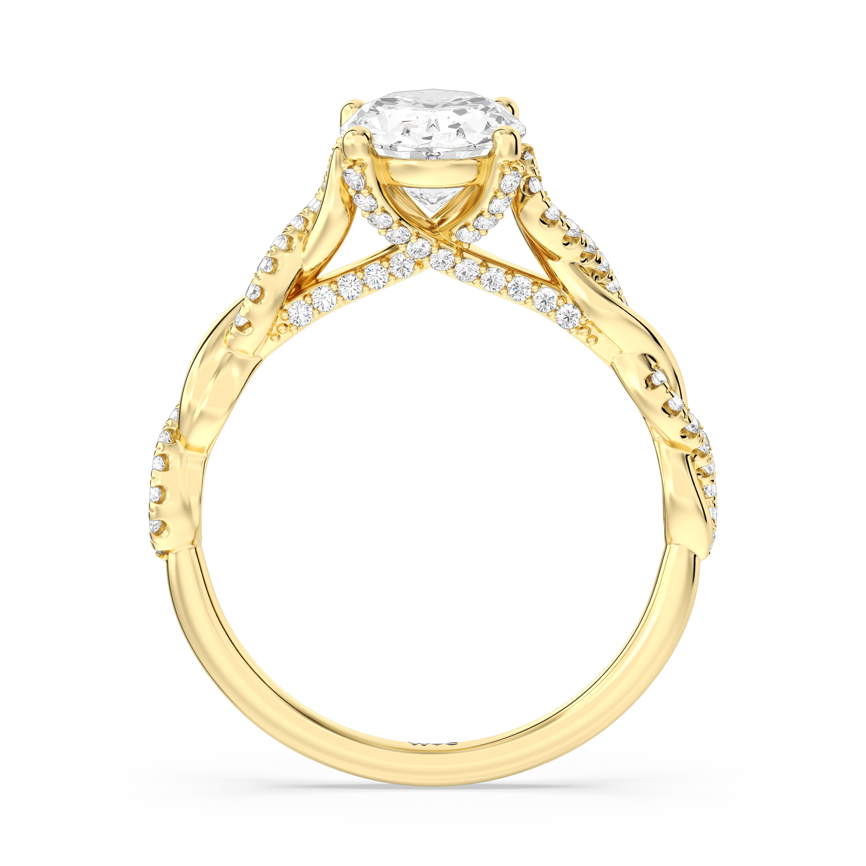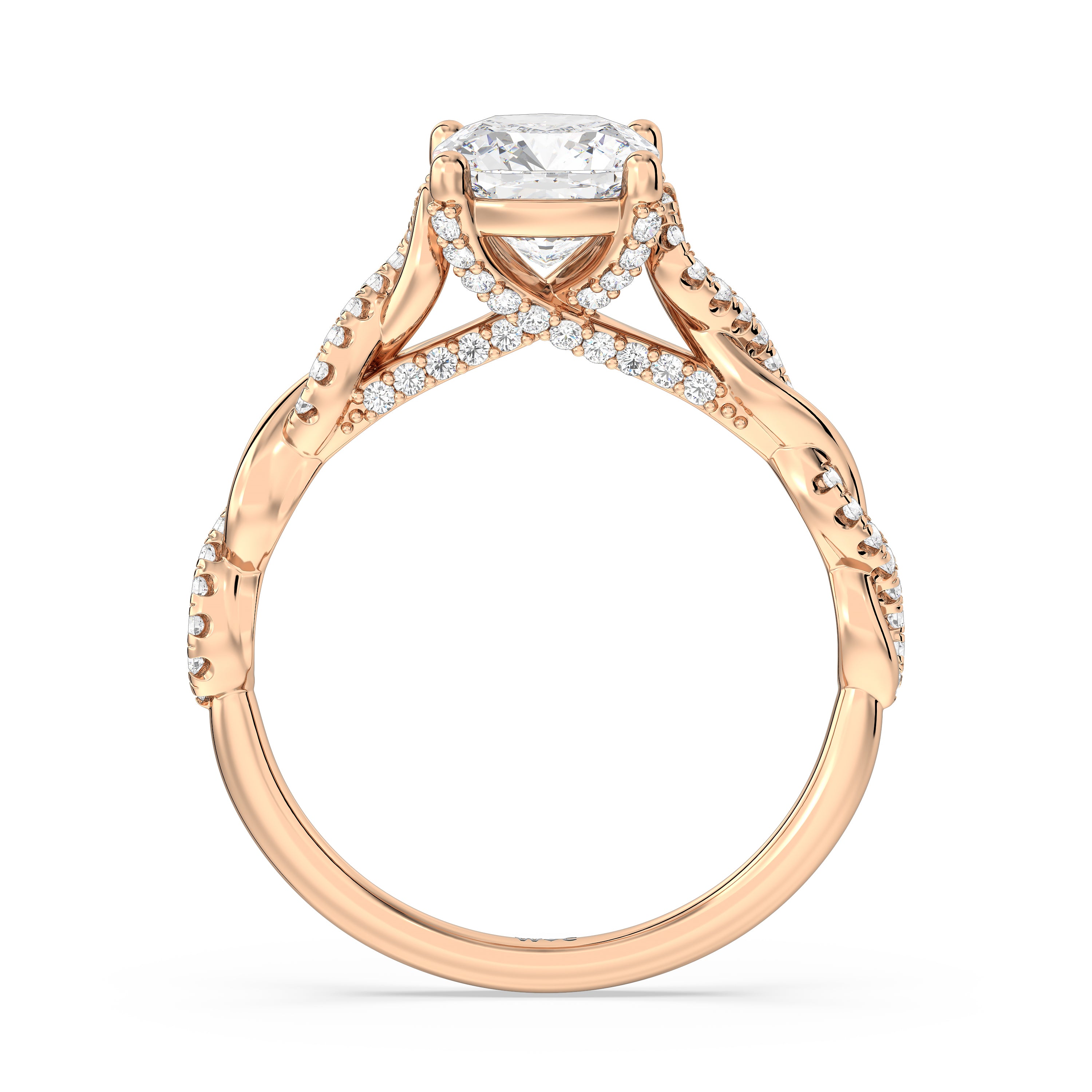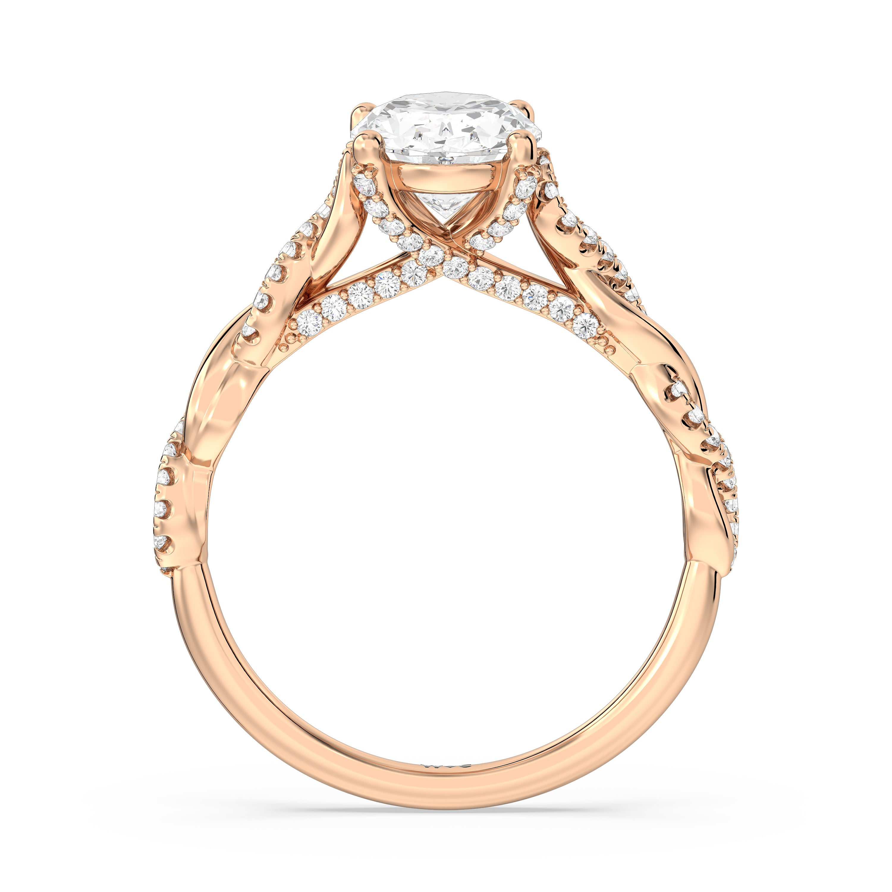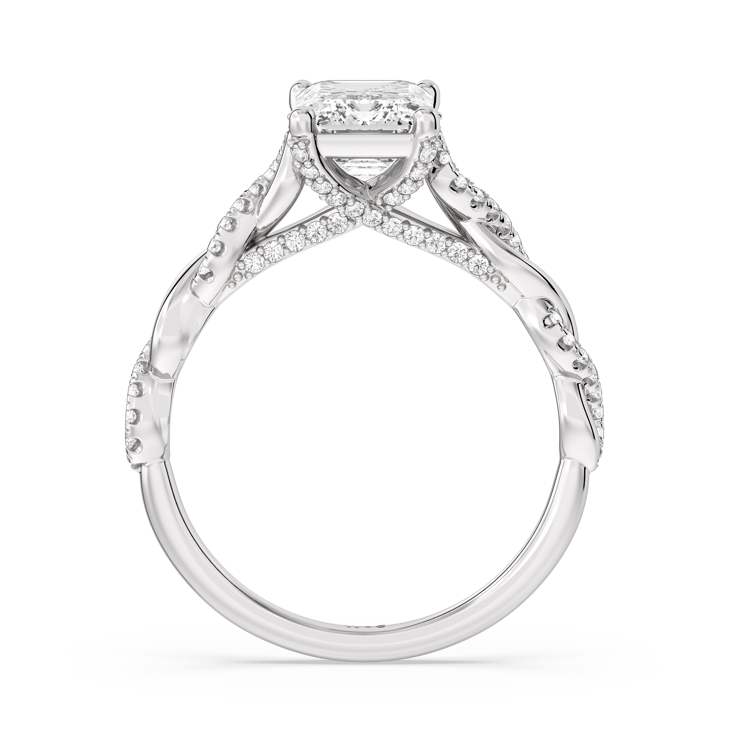 To showcase the dazzling centerpiece of this engagement ring, the embellished band splits to twist over and under itself up to flank the center stone, with the four prongs elegantly formed of sparkling crossover detail in the front view.