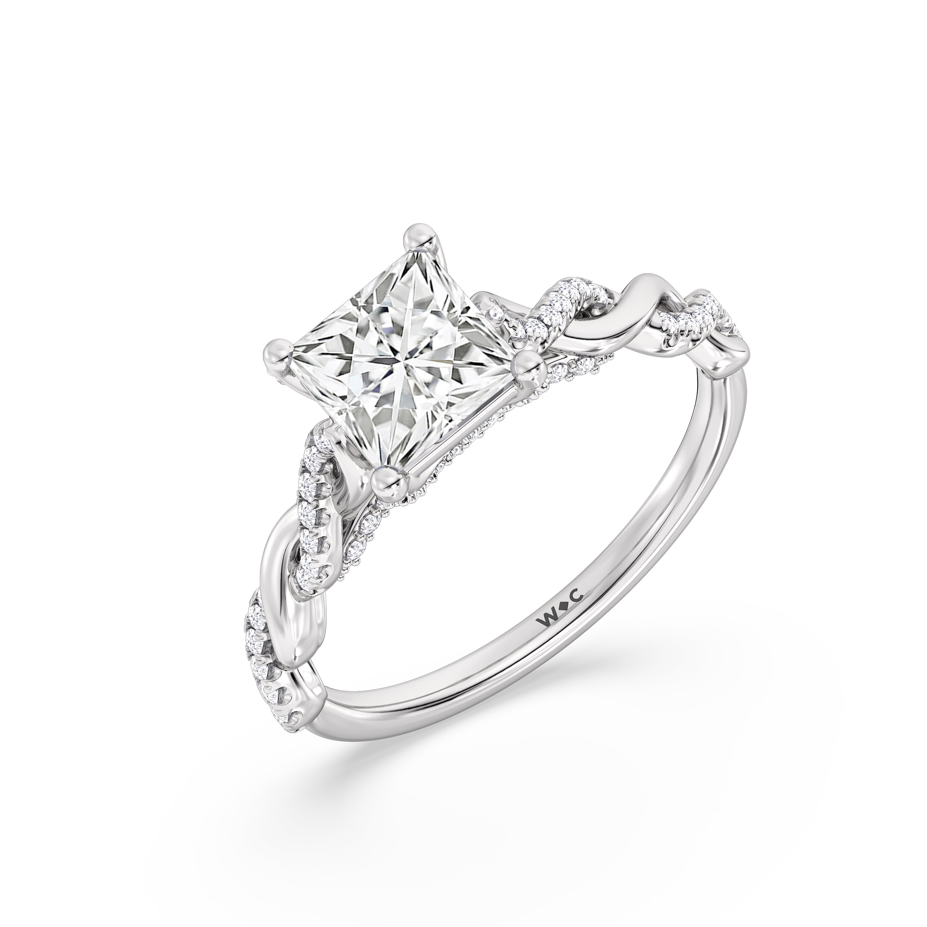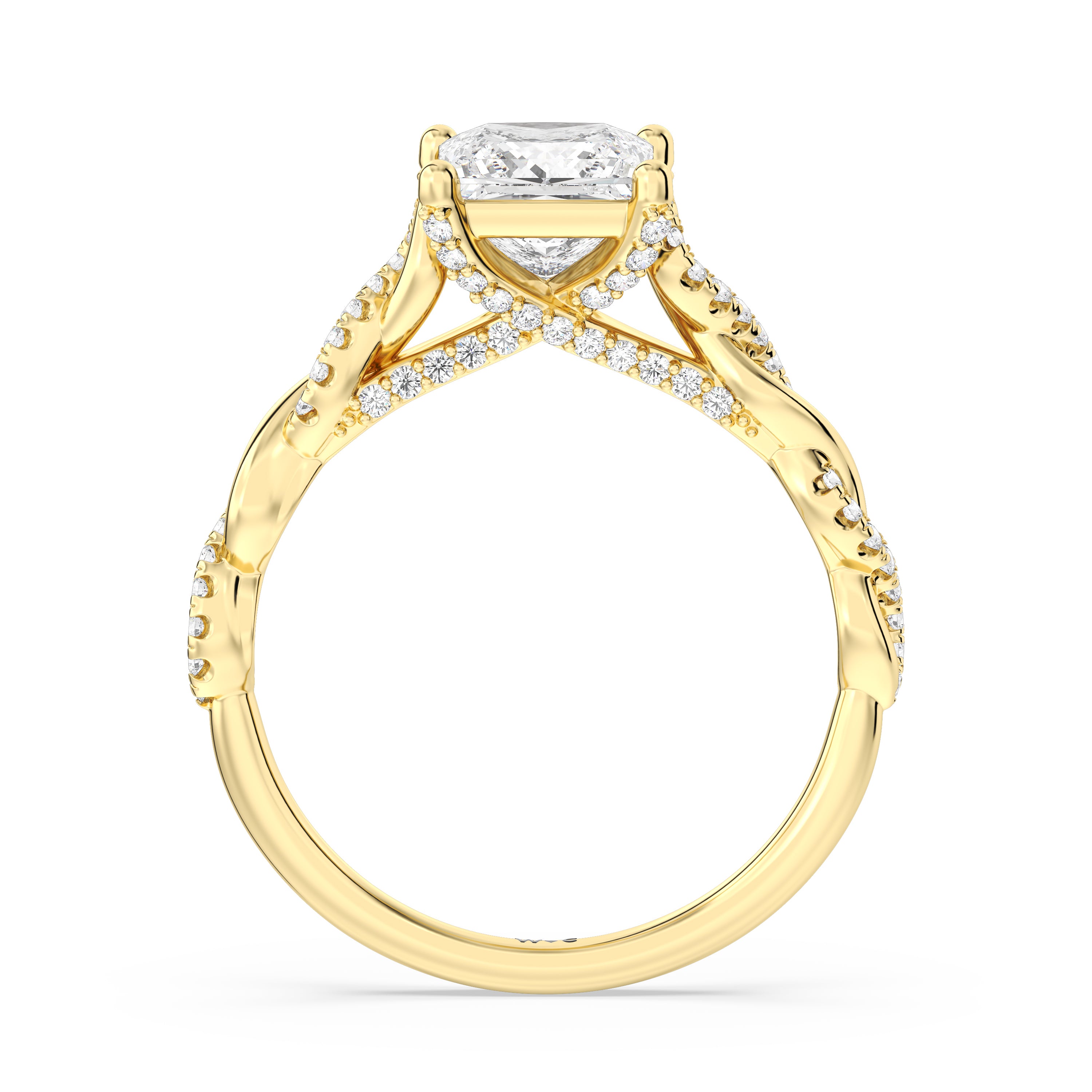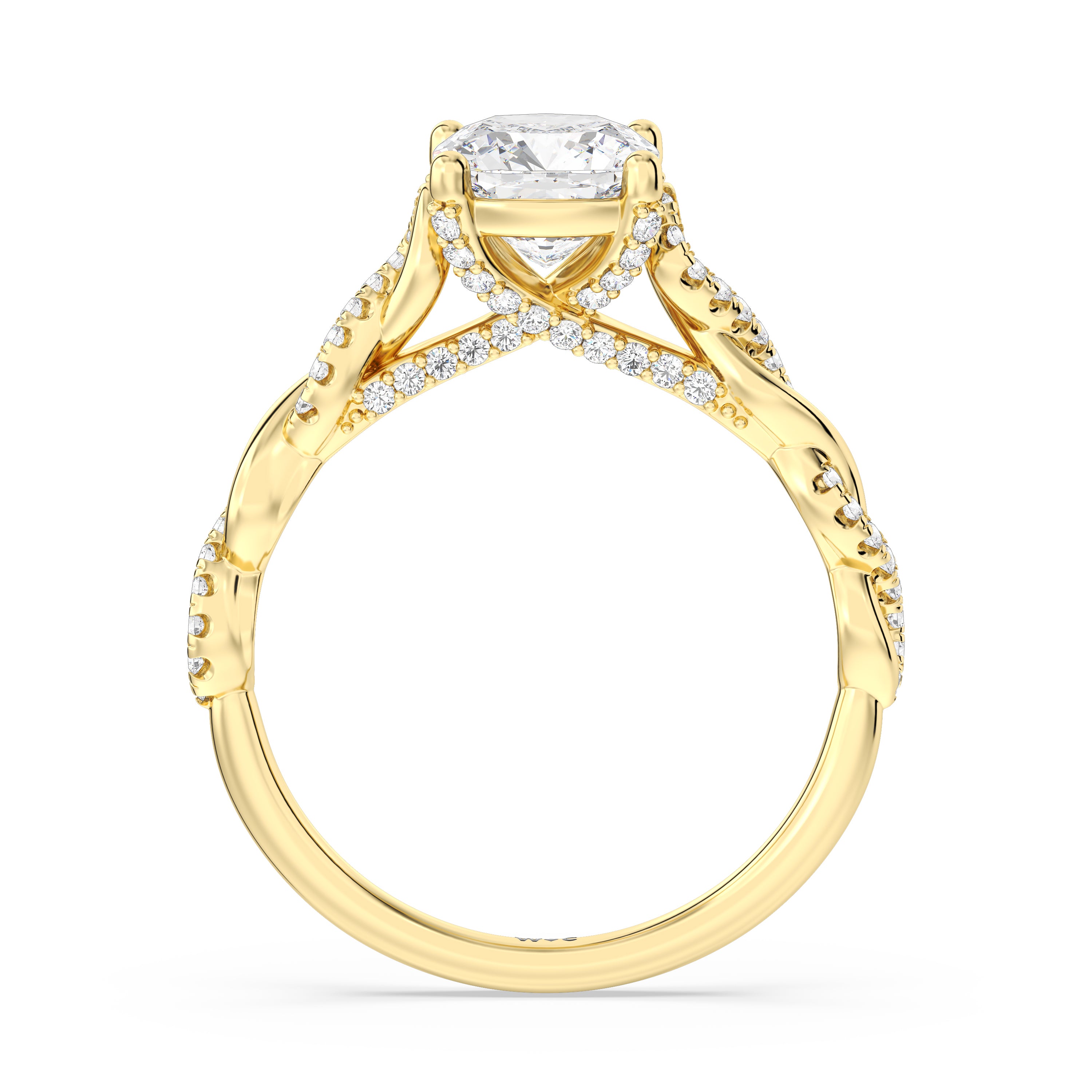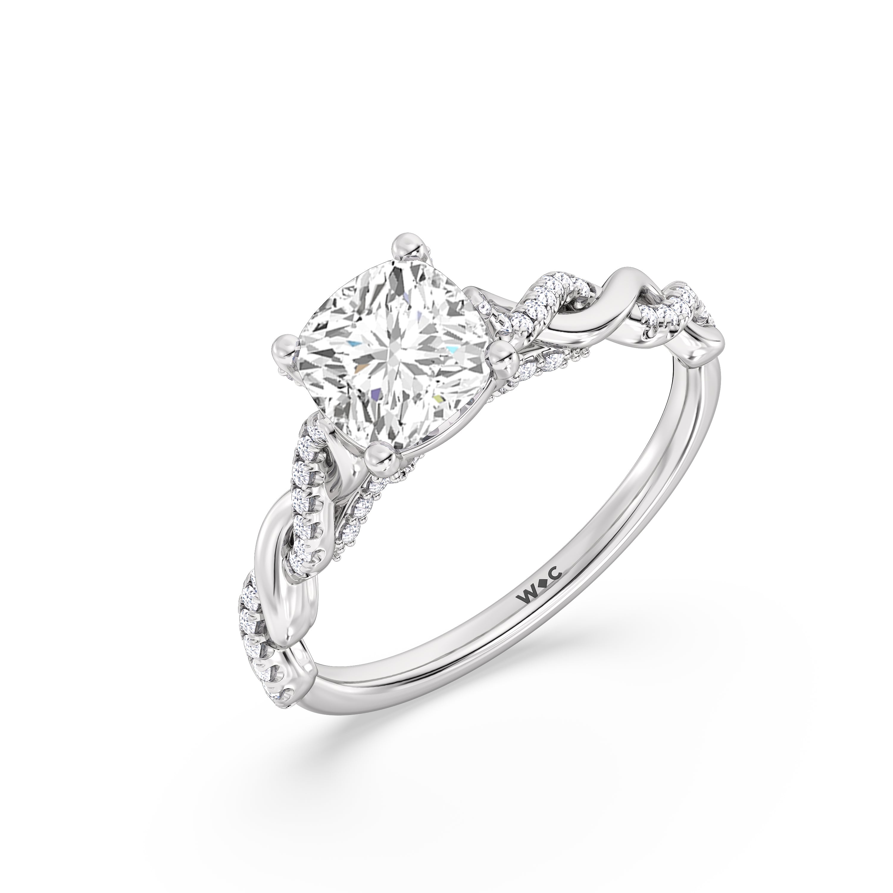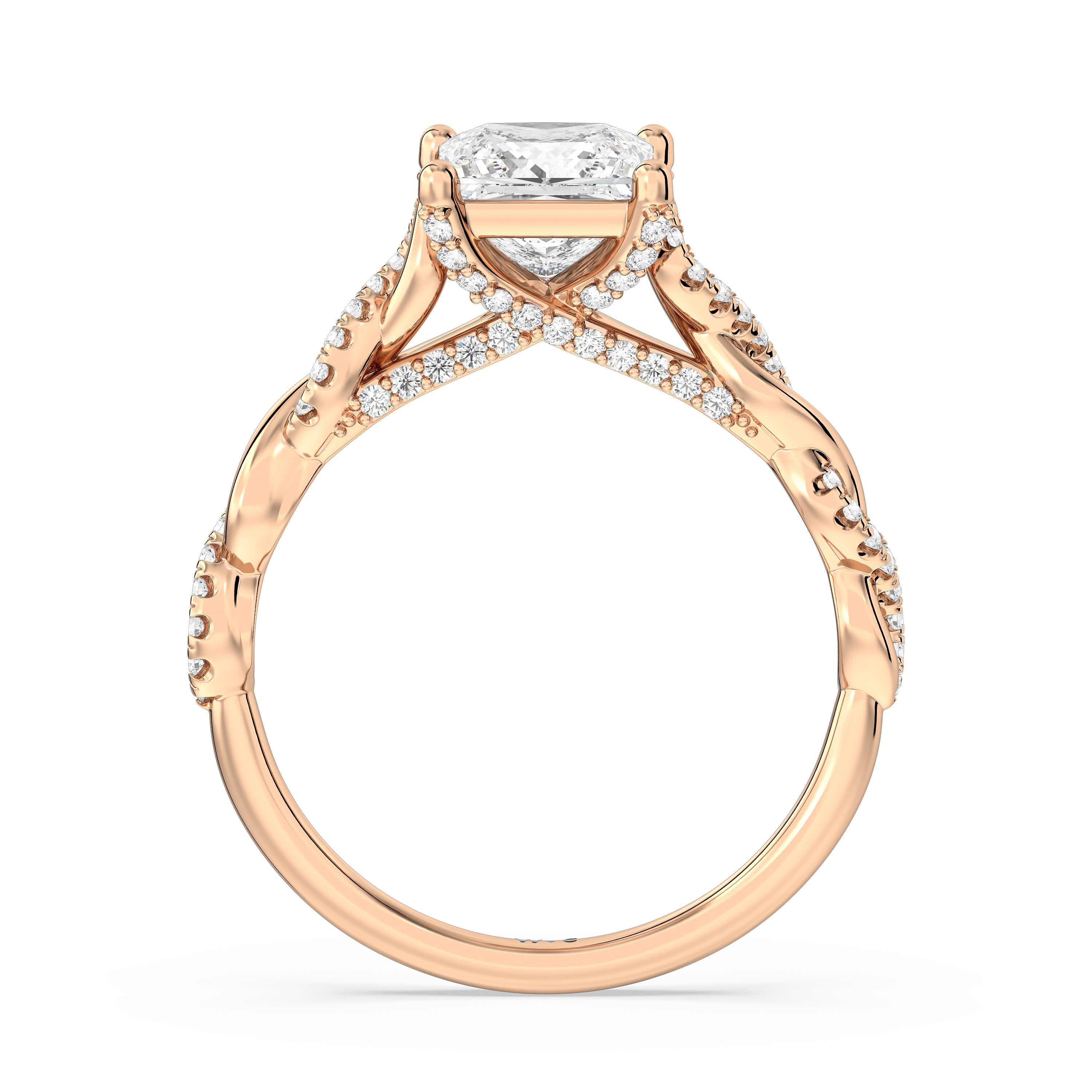 To showcase the dazzling centerpiece of this engagement ring, the embellished band splits to twist over and under itself up to flank the center stone, with the four prongs elegantly formed of sparkling crossover detail in the front view.
