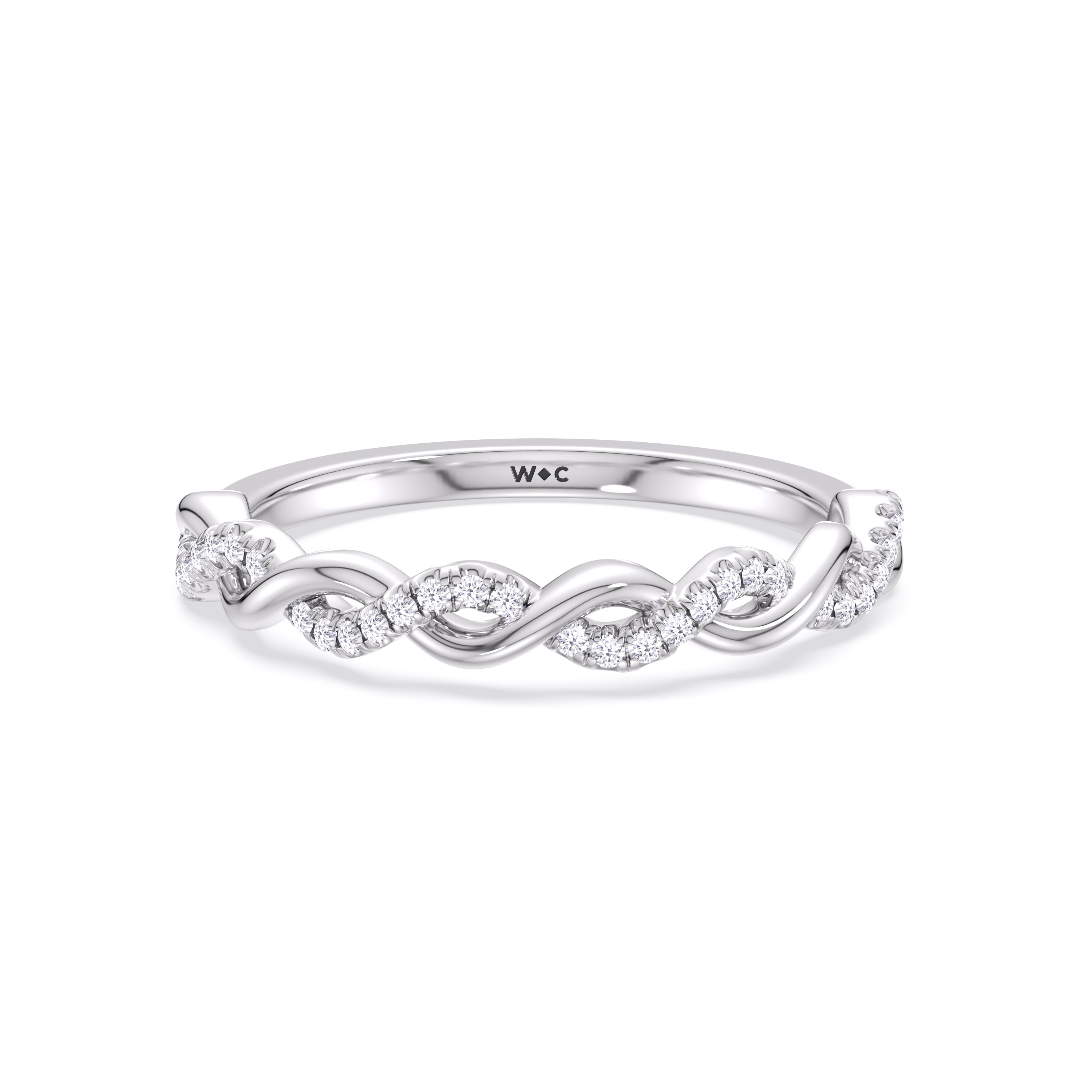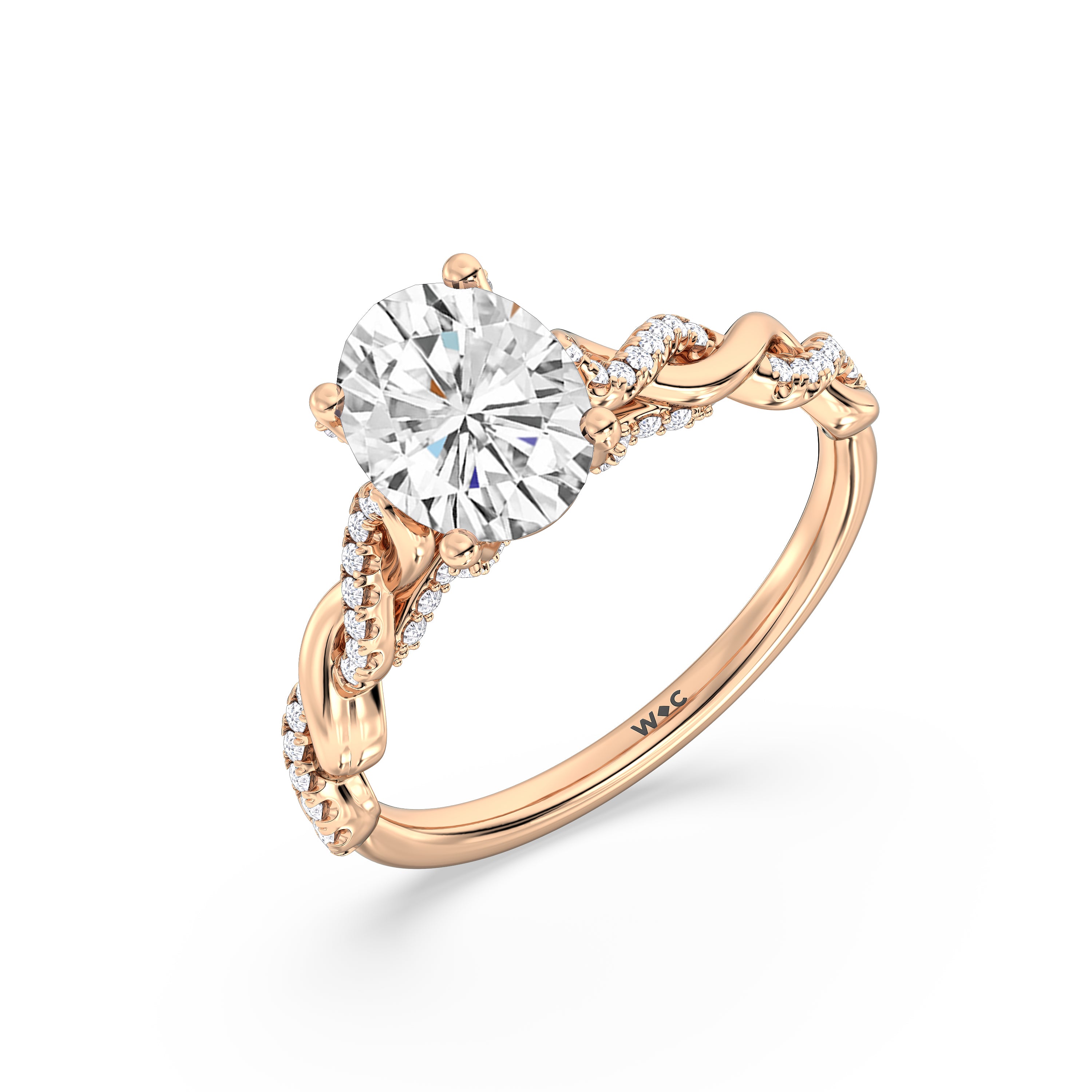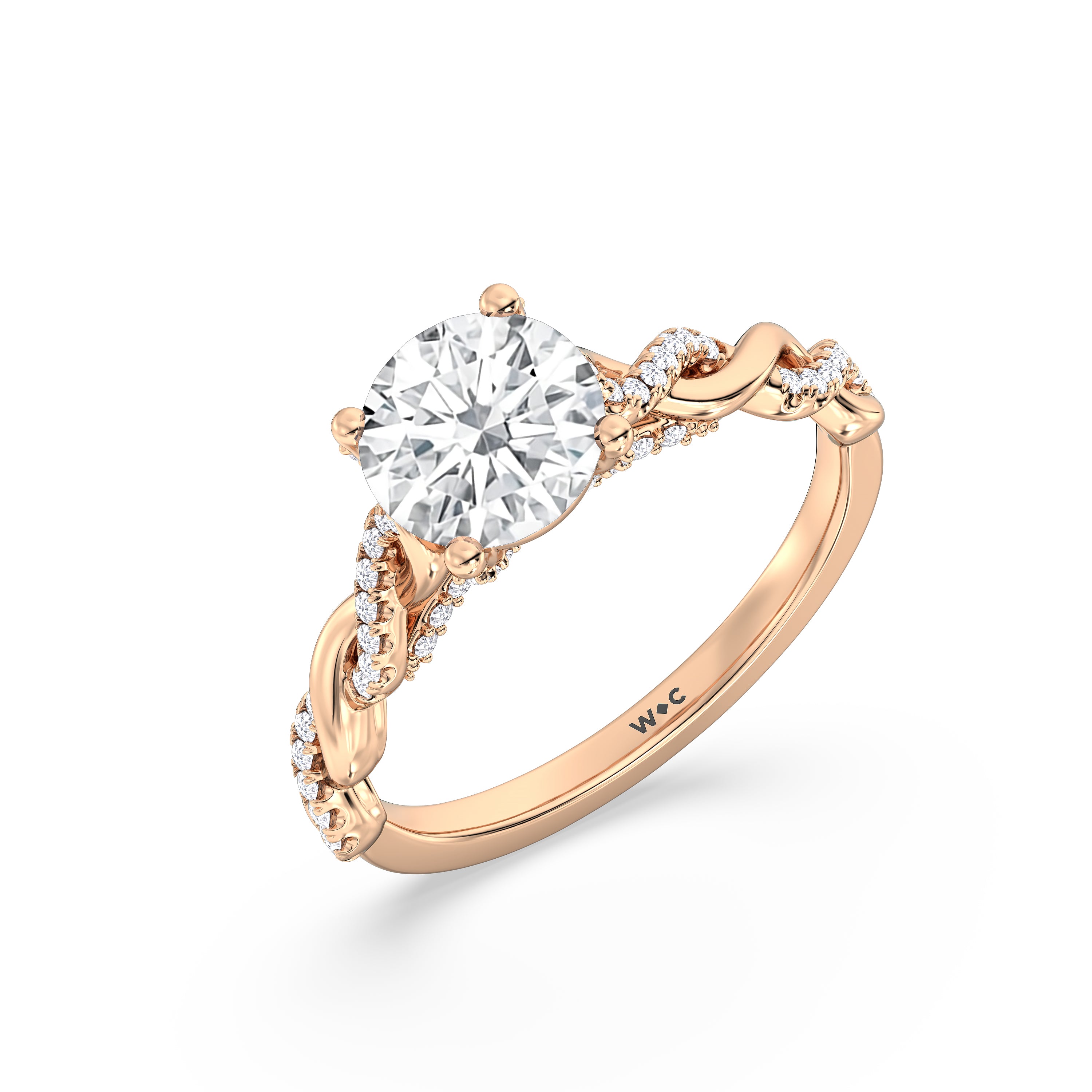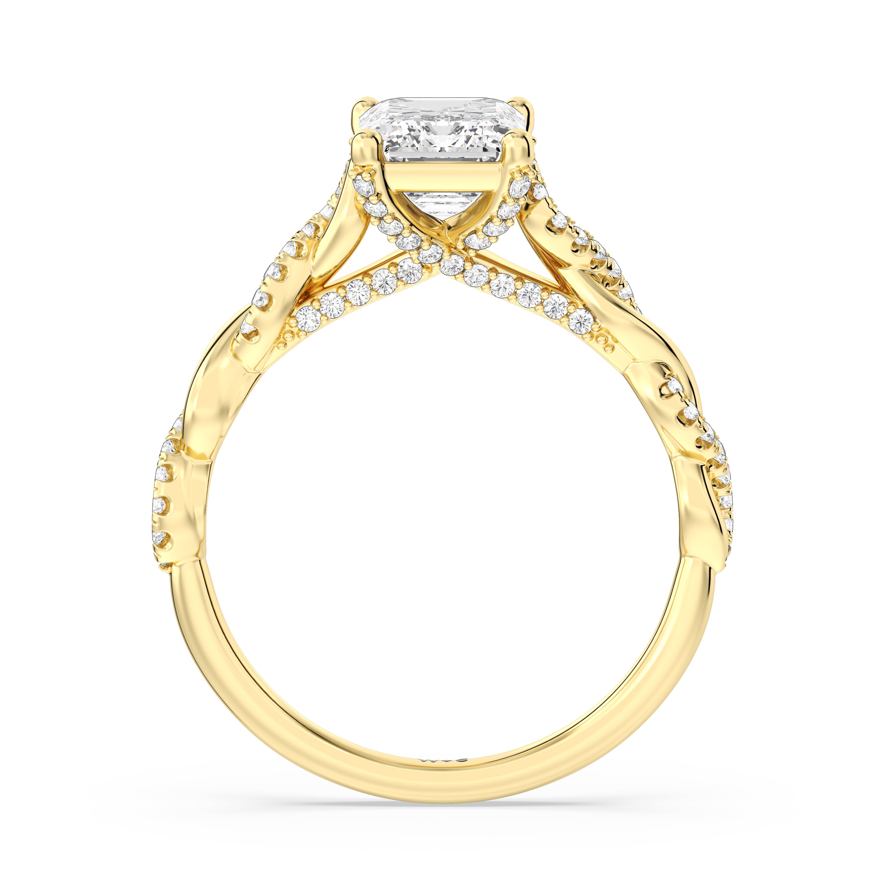 To showcase the dazzling centerpiece of this engagement ring, the embellished band splits to twist over and under itself up to flank the center stone, with the four prongs elegantly formed of sparkling crossover detail in the front view.