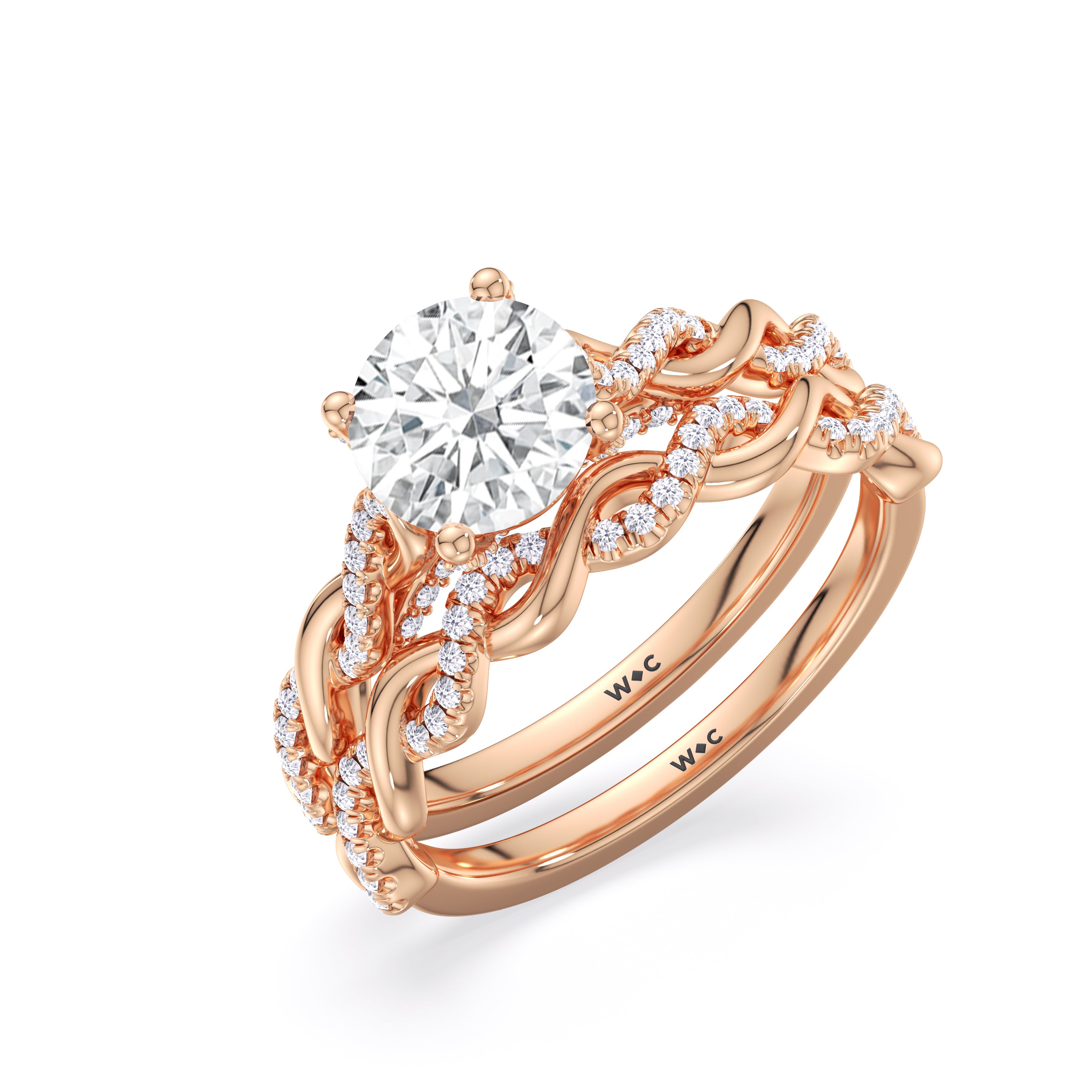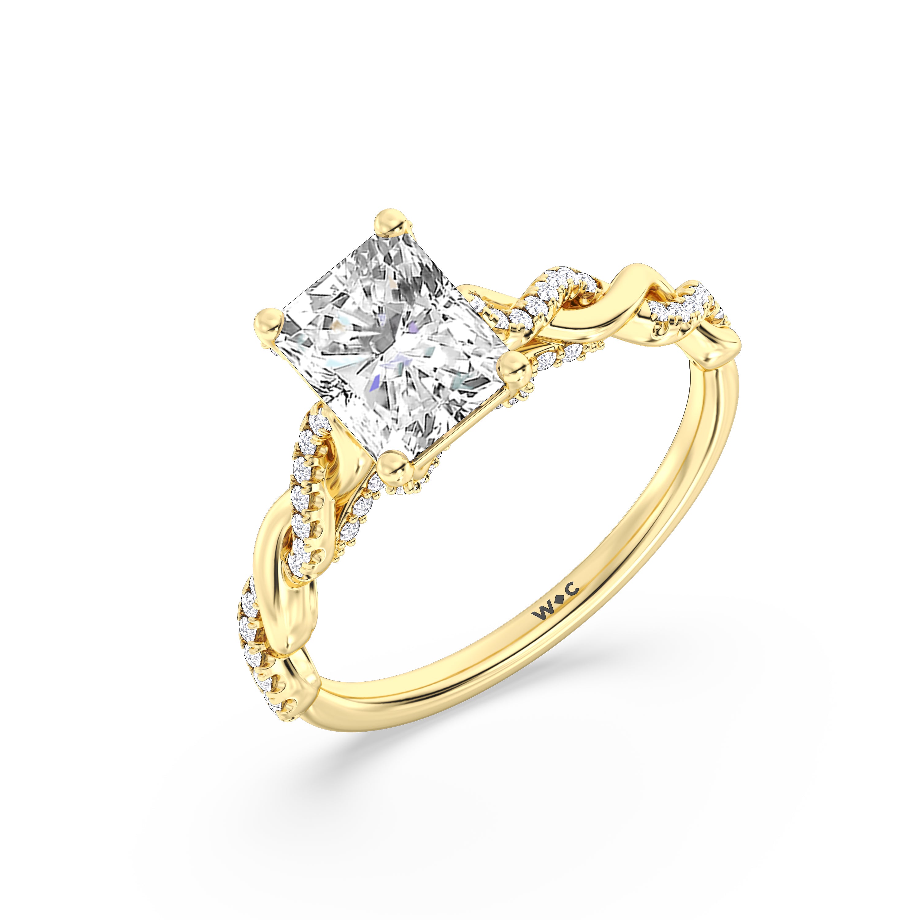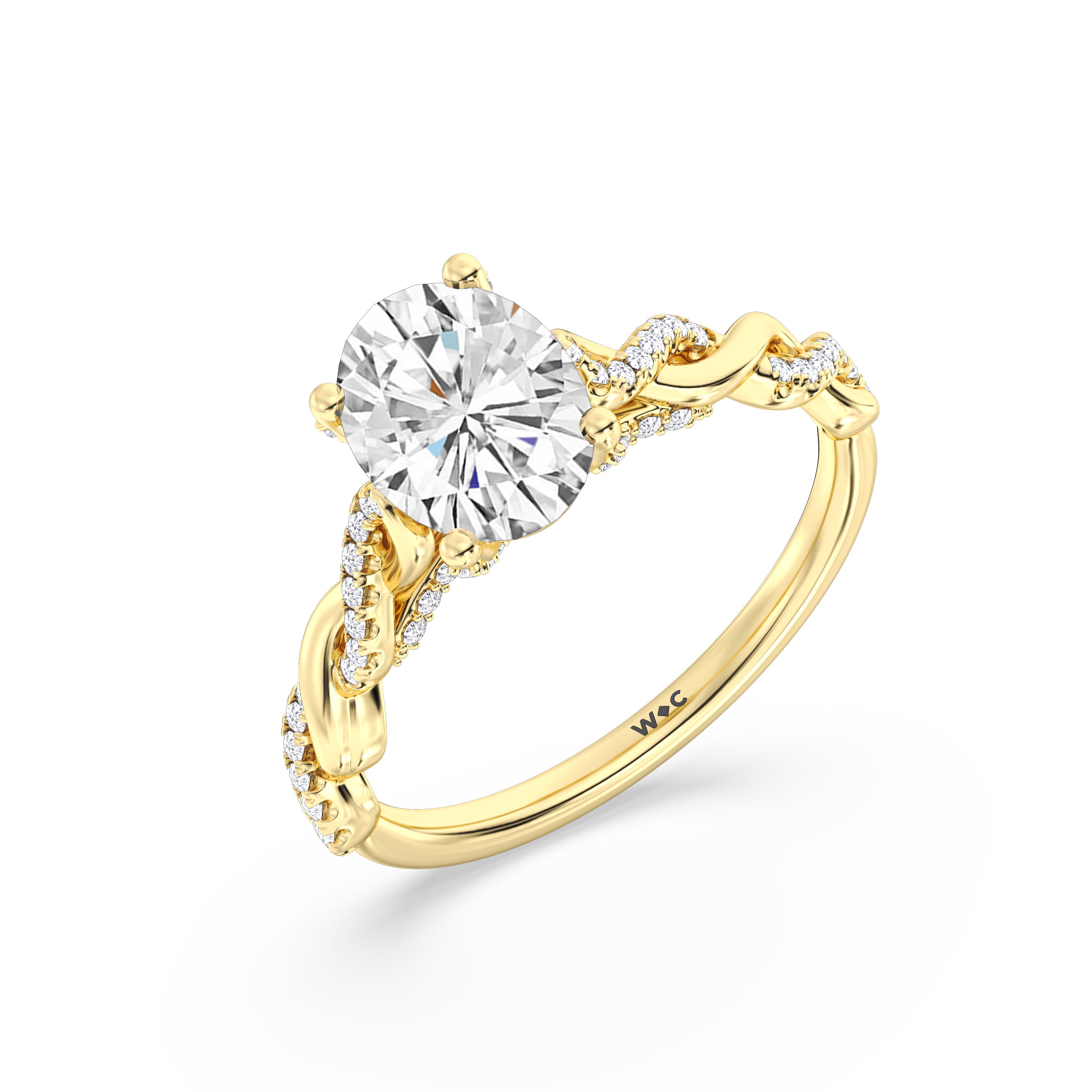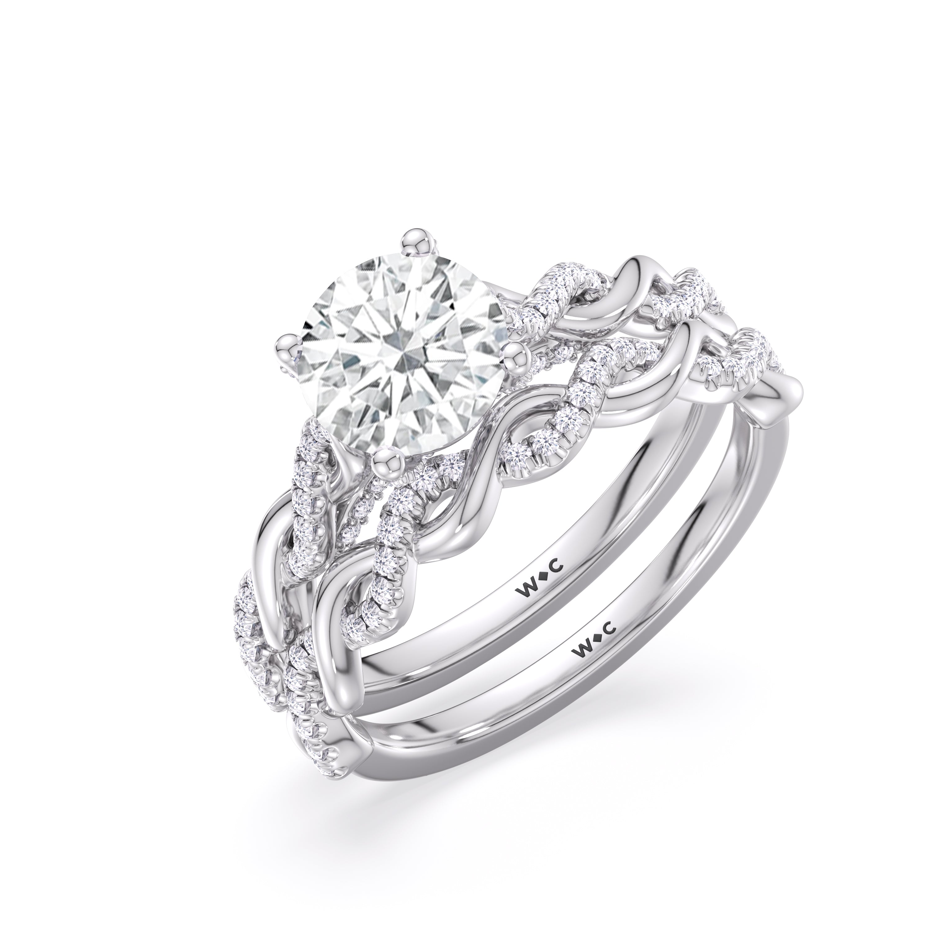 To showcase the dazzling centerpiece of this engagement ring, the embellished band splits to twist over and under itself up to flank the center stone, with the four prongs elegantly formed of sparkling crossover detail in the front view.