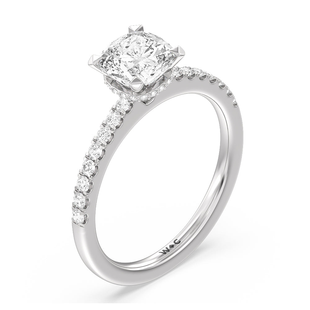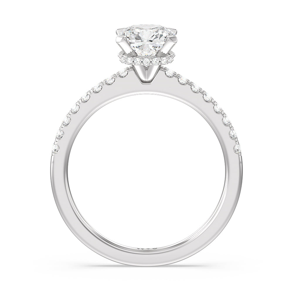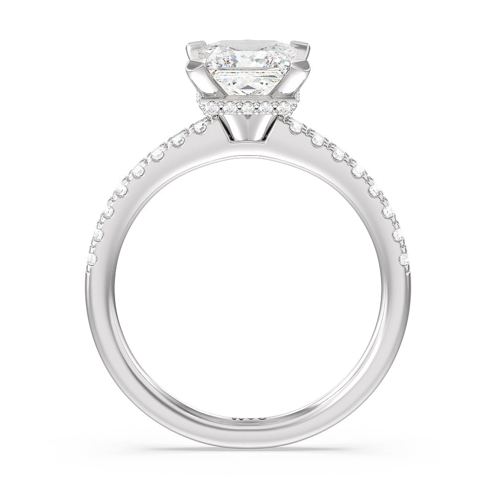 This subtle hidden halo makes the center stone take center stage. Enhanced by a simple diamond pave band and featuring a delicate row of diamonds in a modern hidden halo design.