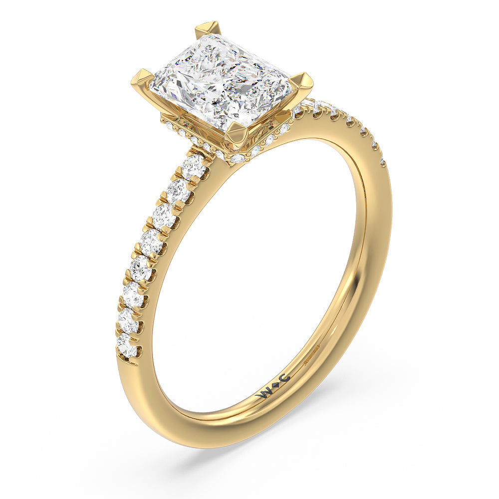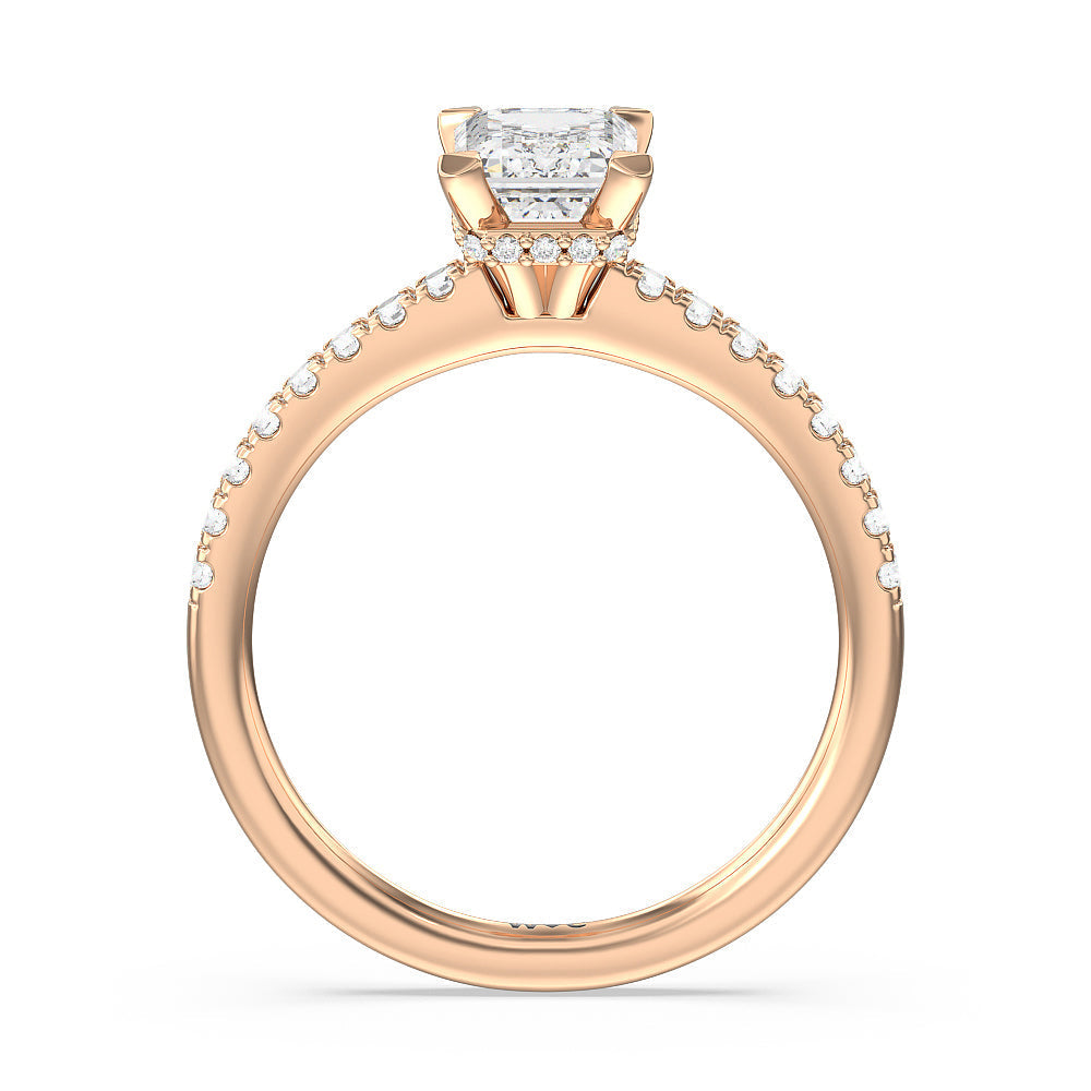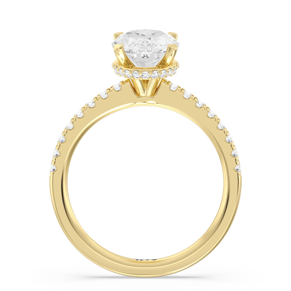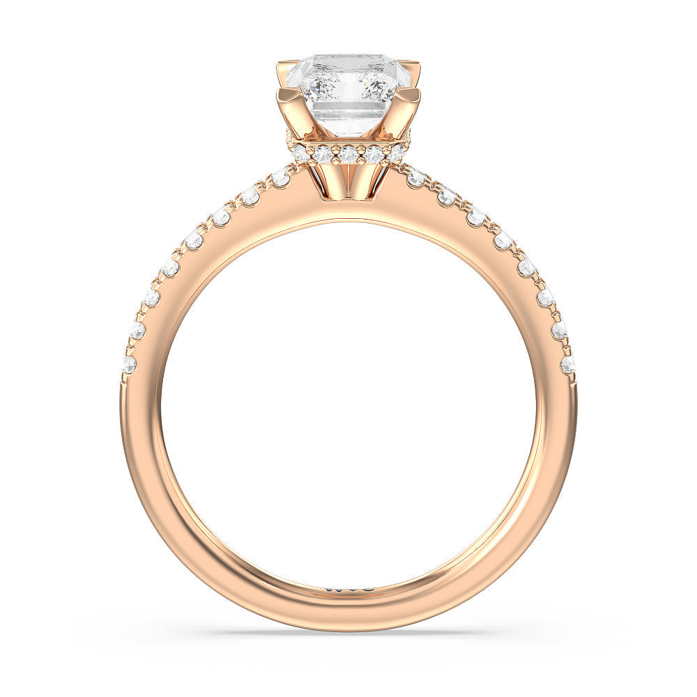 This subtle hidden halo makes the center stone take center stage. Enhanced by a simple diamond pave band and featuring a delicate row of diamonds in a modern hidden halo design.
