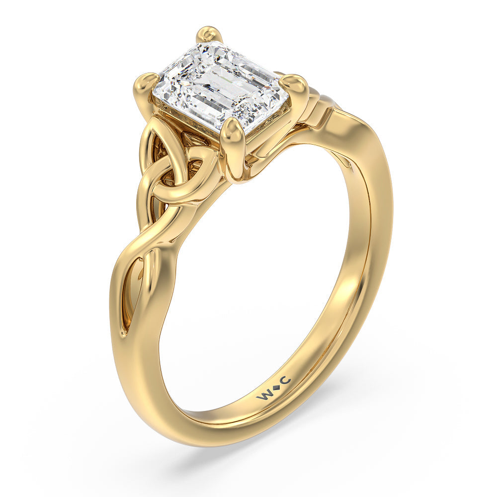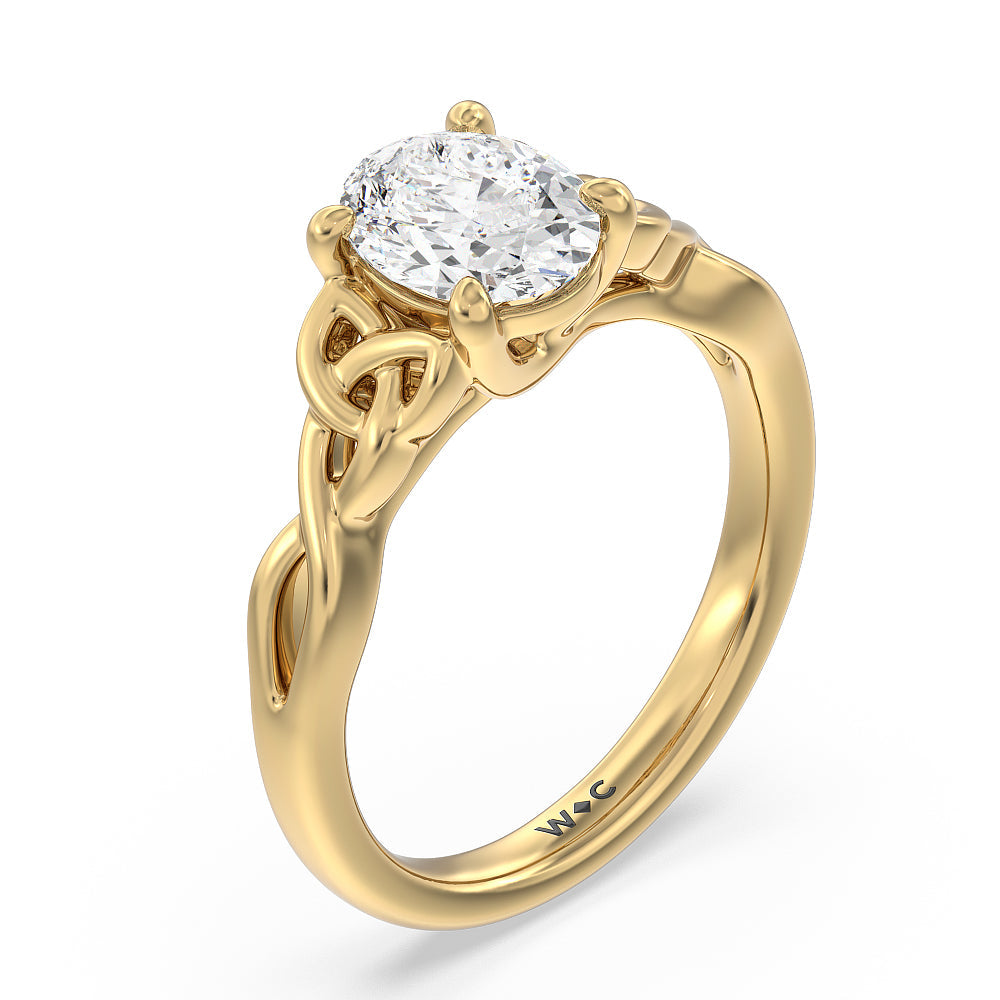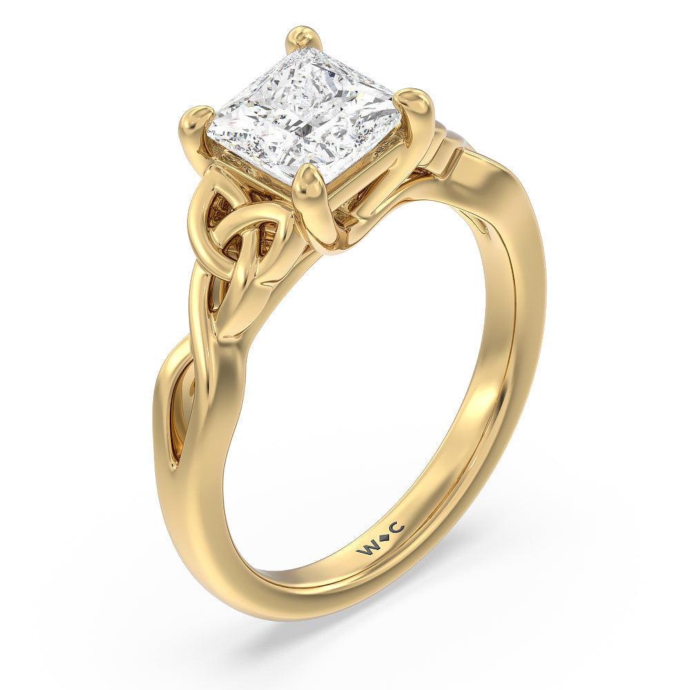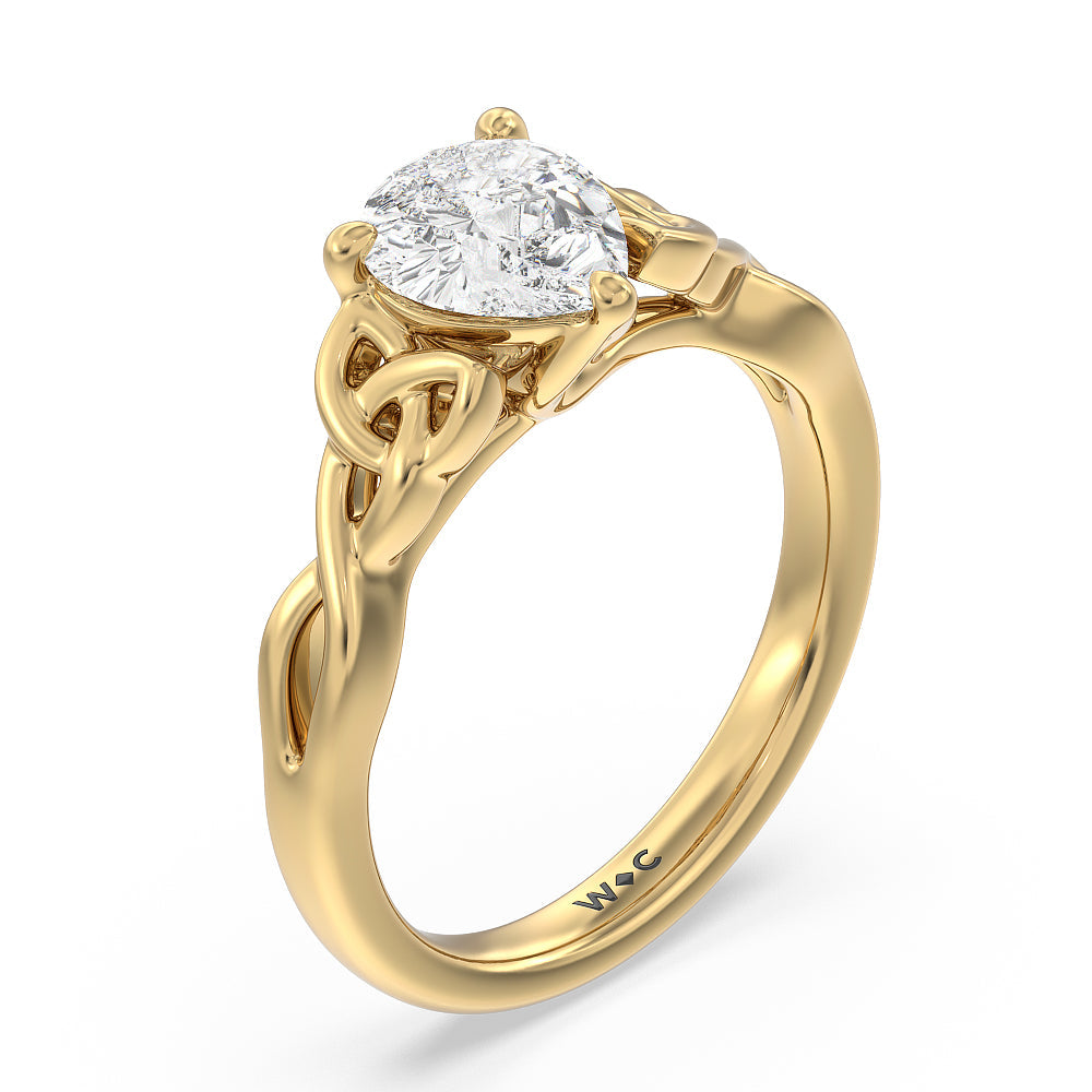 The dazzling center stone of this vintage-style ring is showcased by the classic four-prong setting and beautiful detail of the Celtic knot shank design. Set in gold.