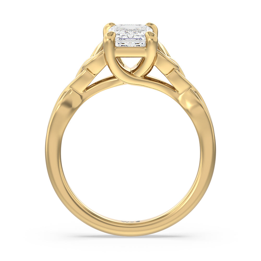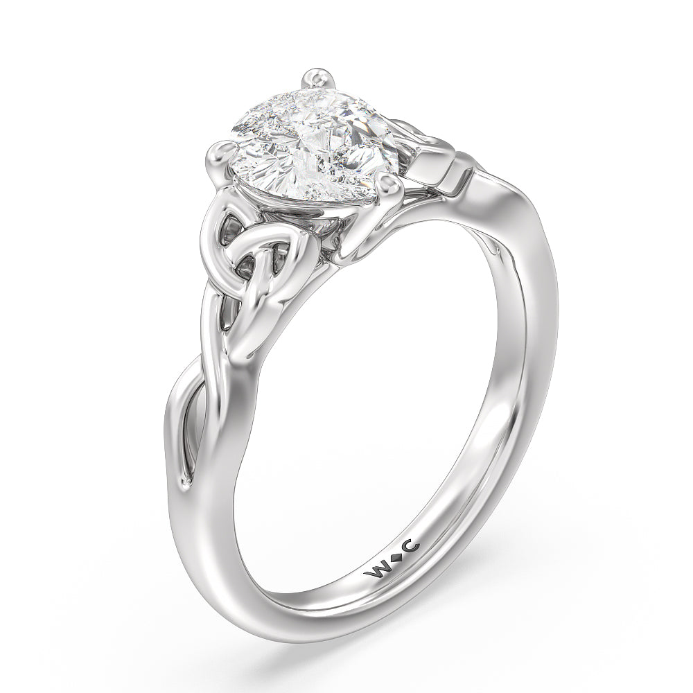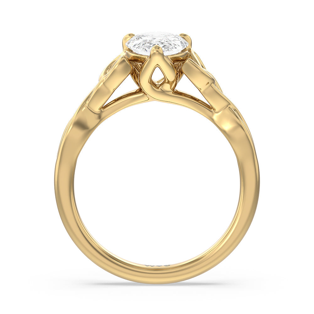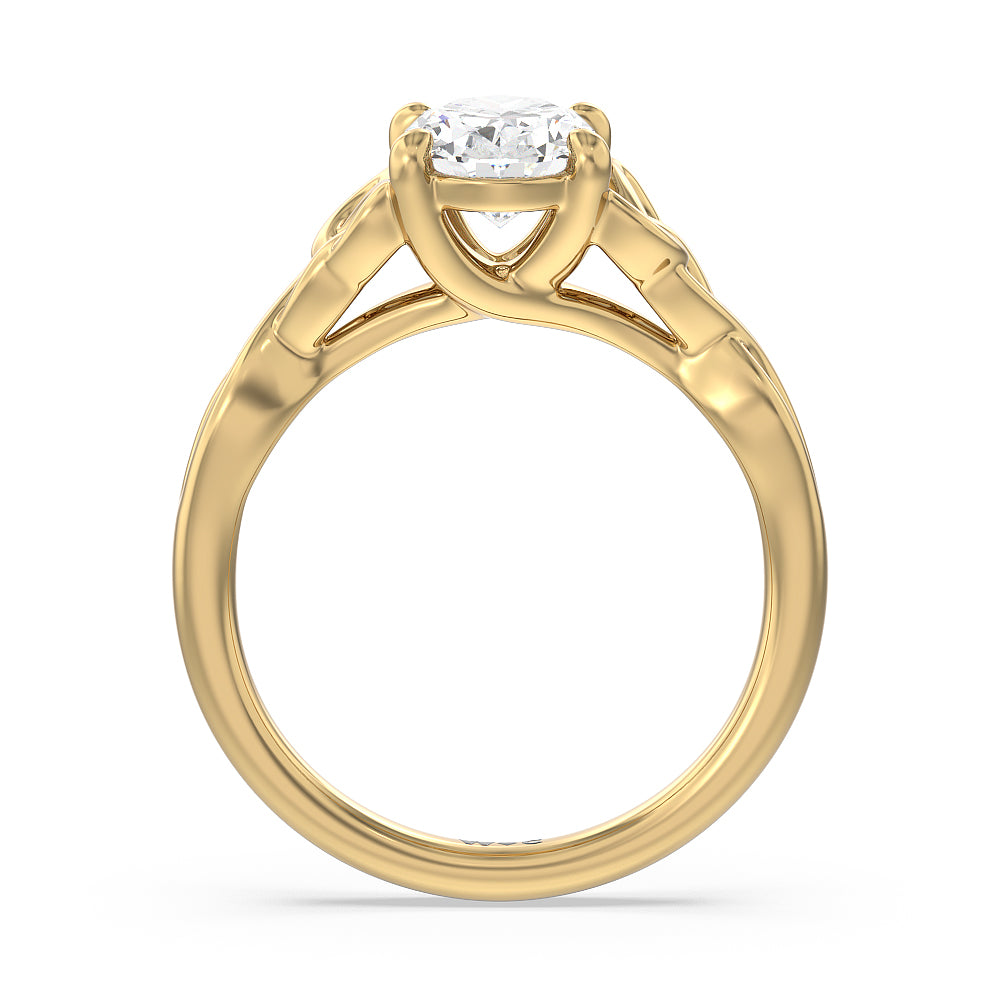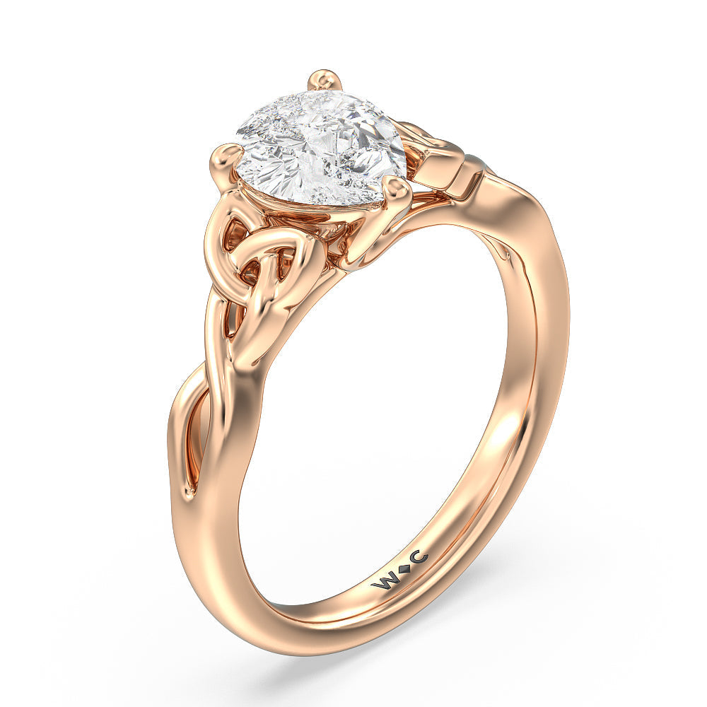 The dazzling center stone of this vintage-style ring is showcased by the classic four-prong setting and beautiful detail of the Celtic knot shank design. Set in gold.