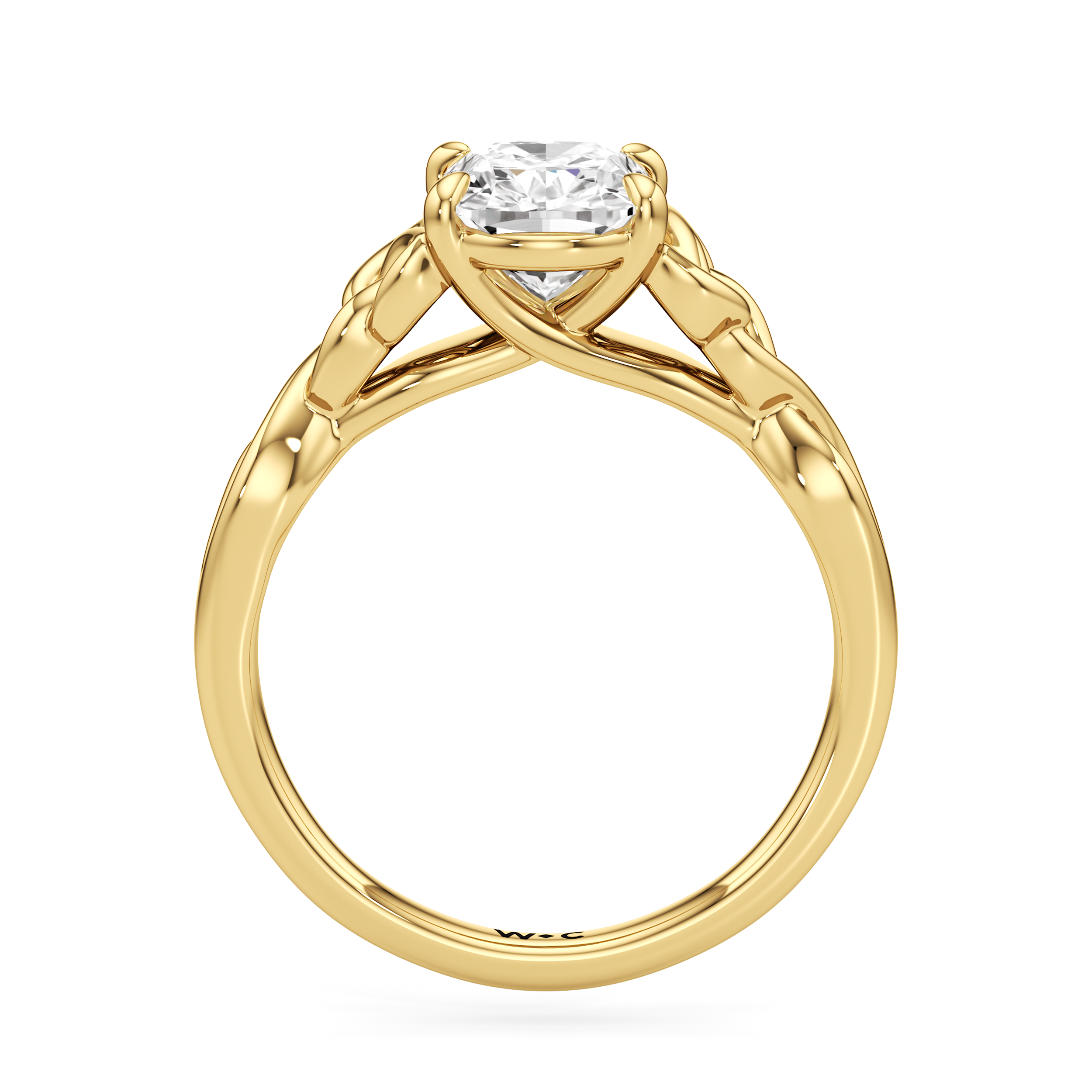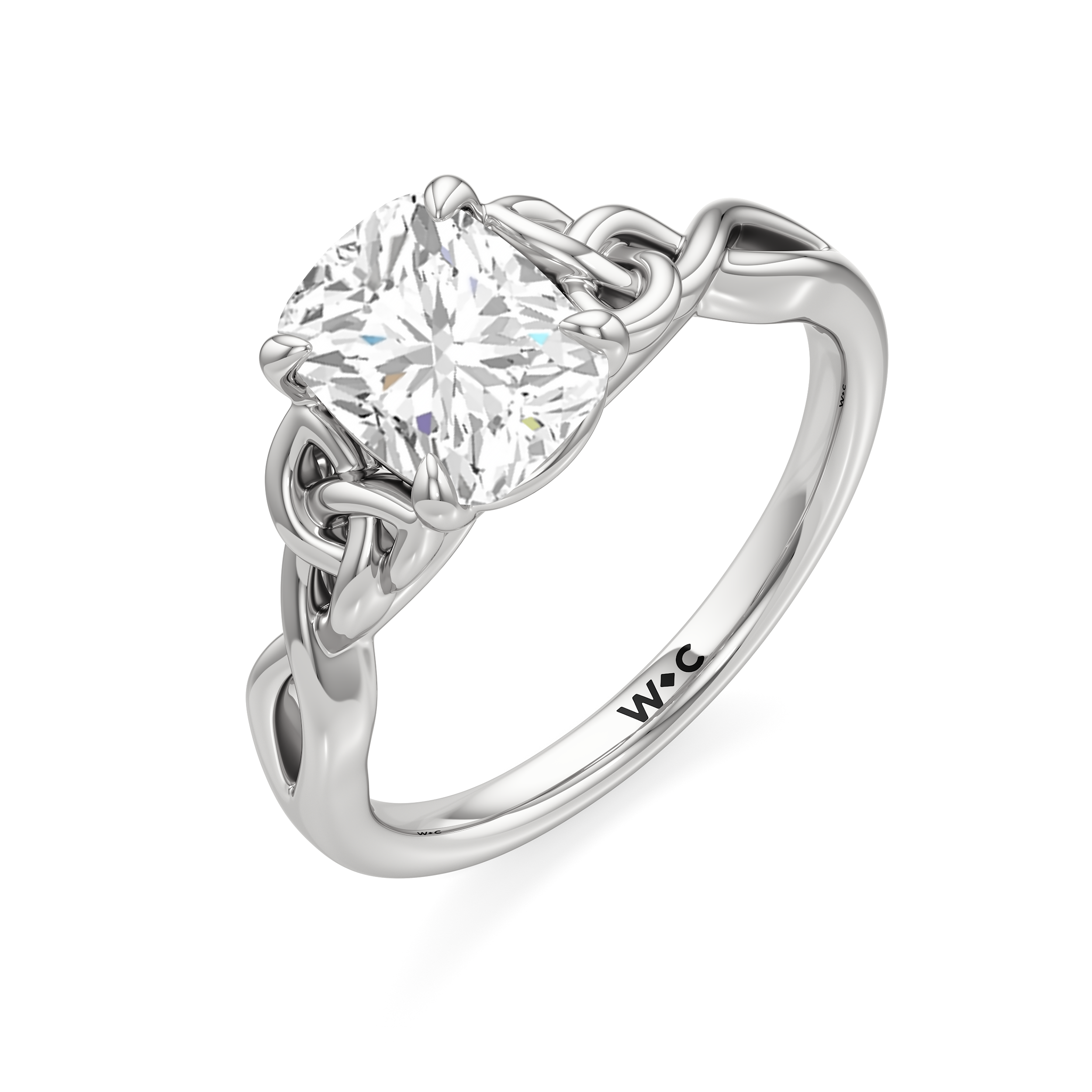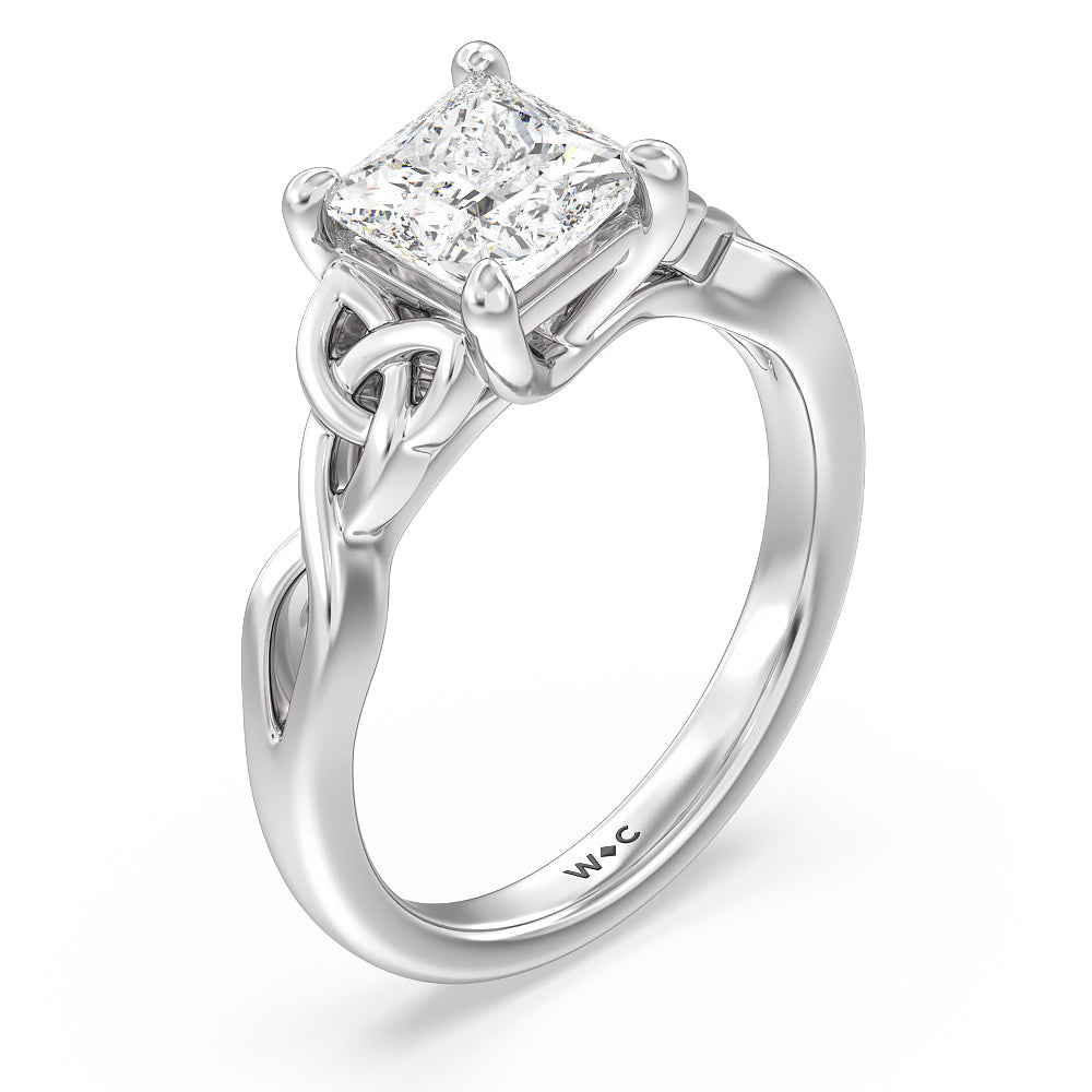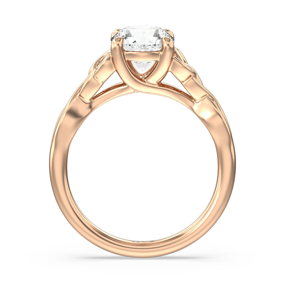 The dazzling center stone of this vintage-style ring is showcased by the classic four-prong setting and beautiful detail of the Celtic knot shank design. Set in gold.