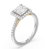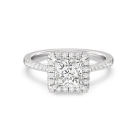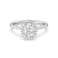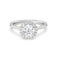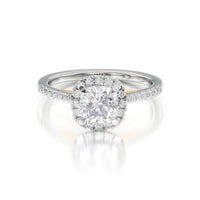 Classic cathedral shoulders join a shimmering diamond halo which wraps the center stone in an aura of light. Featuring diamonds cascading down the shoulders and a sweeping fishtail design of precious metal.