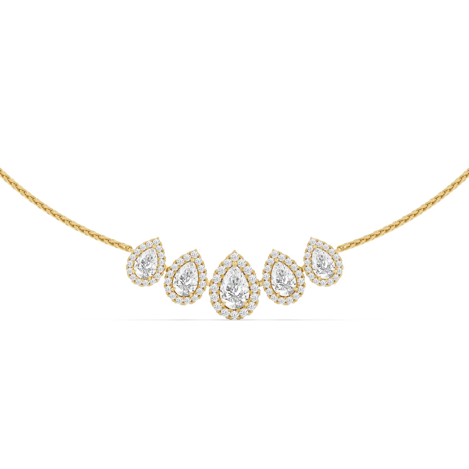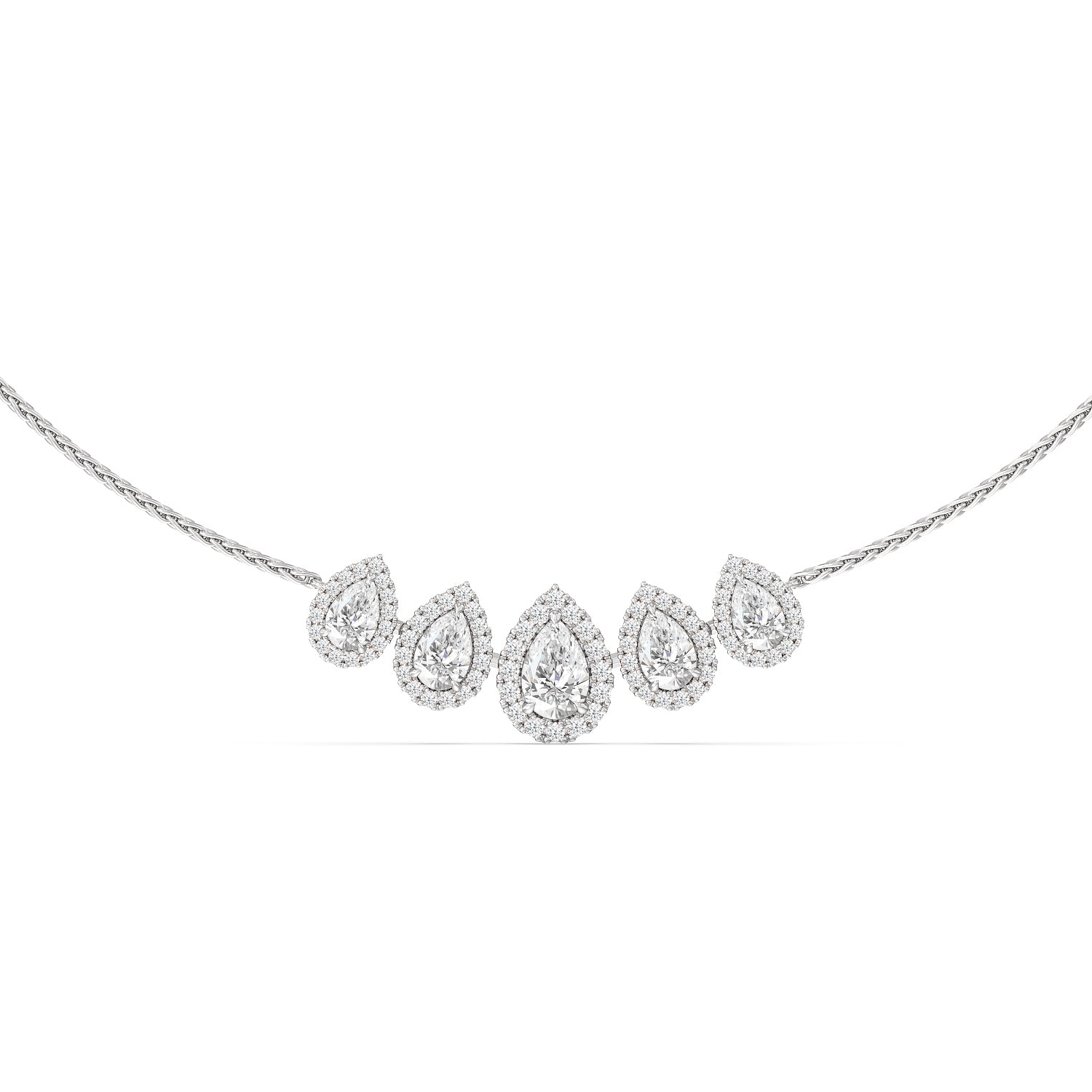 Looking for an effortless way to spice up your everyday looks? Wear this diamond necklace. This piece features a chain necklace adorned with a series of five pear-cut diamonds. At the center is a larger pear-cut diamond flanked by pairs of tapering pear diamonds. All five pear-cut stones are framed by a halo of petite round diamonds for added sparkle.