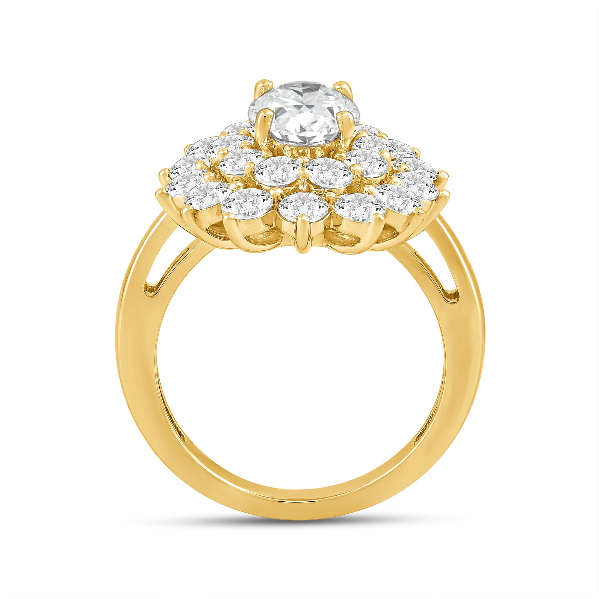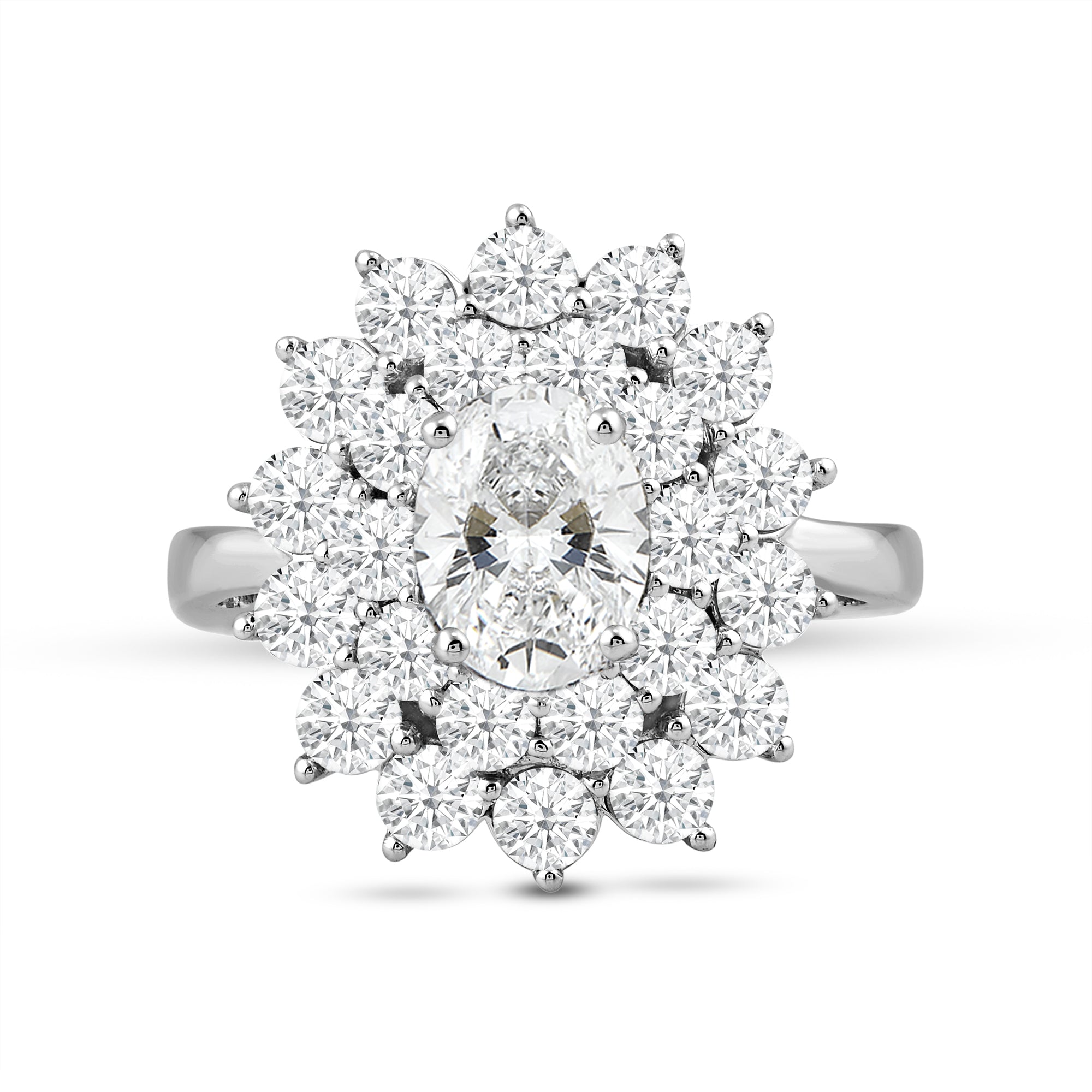 An opulent statement-maker, this diamond ring offers a quick and effortless way to elevate your outfits. It features a double halo of diamonds, in floral motif, surrounding a precious centerstone. When paired with your little black dress, this ring will be a shimmering and head-turning focal point.