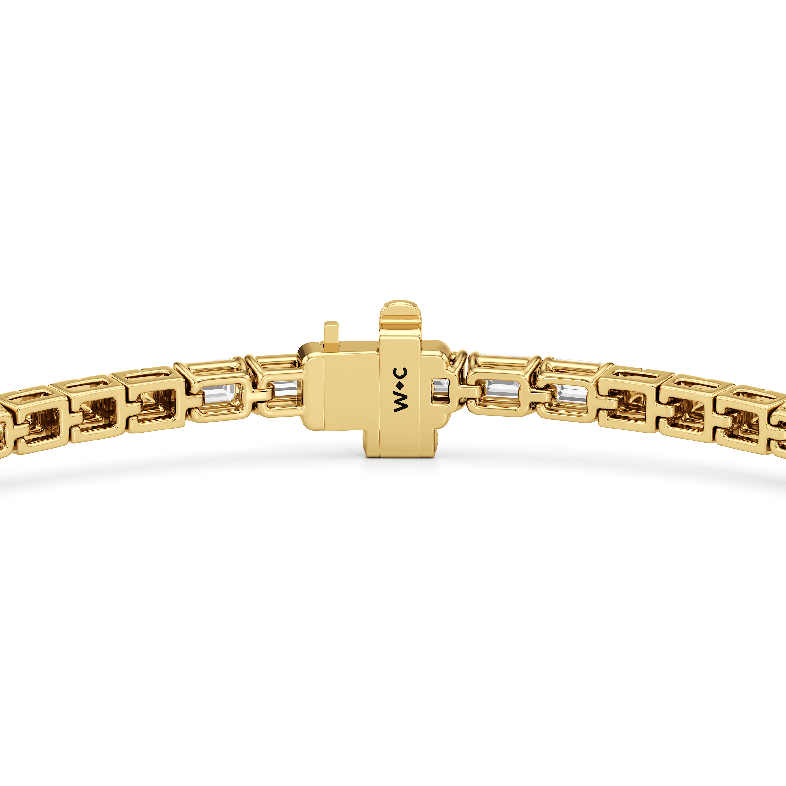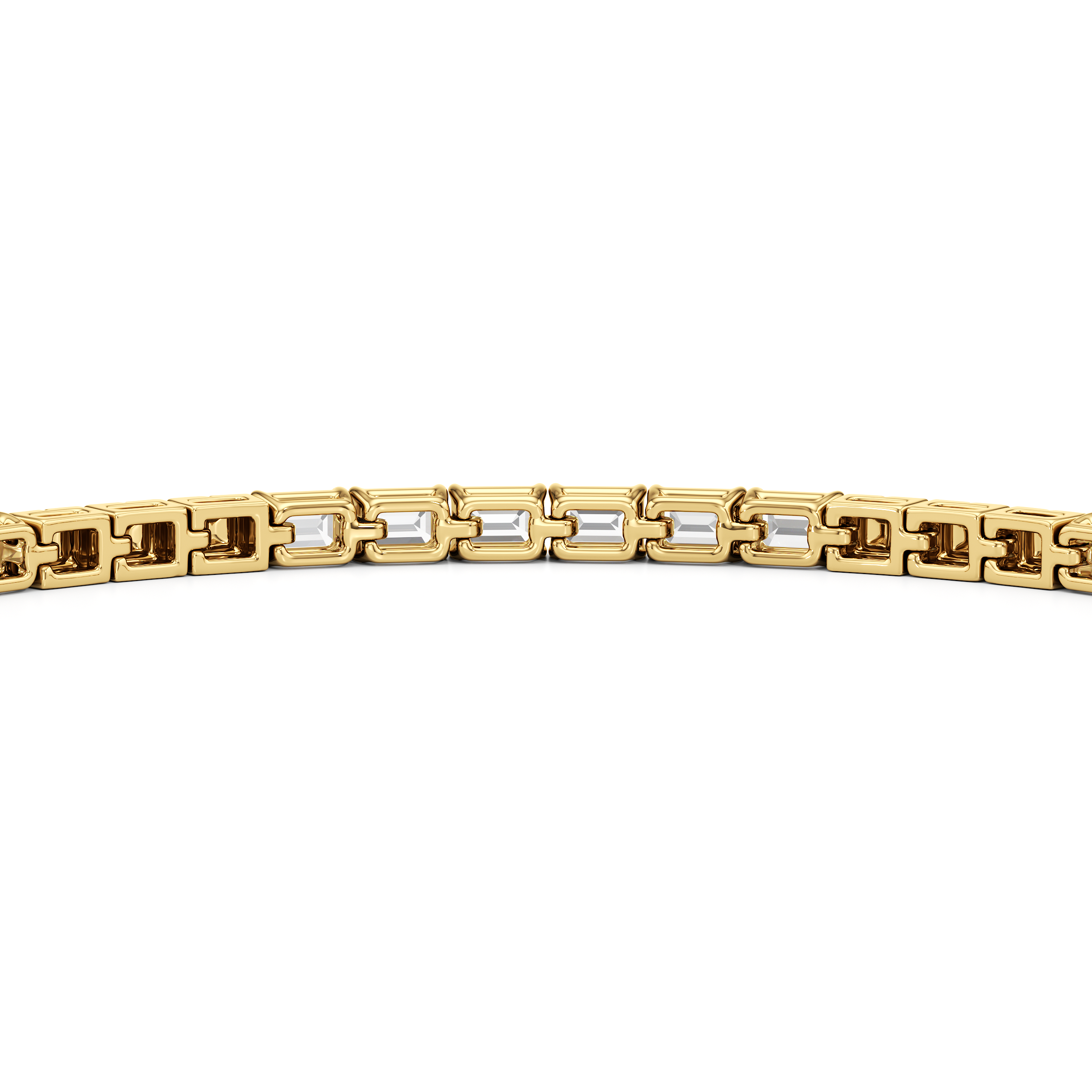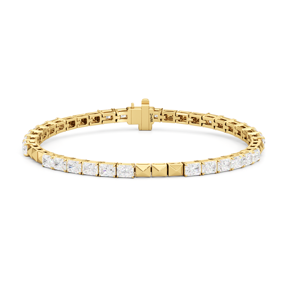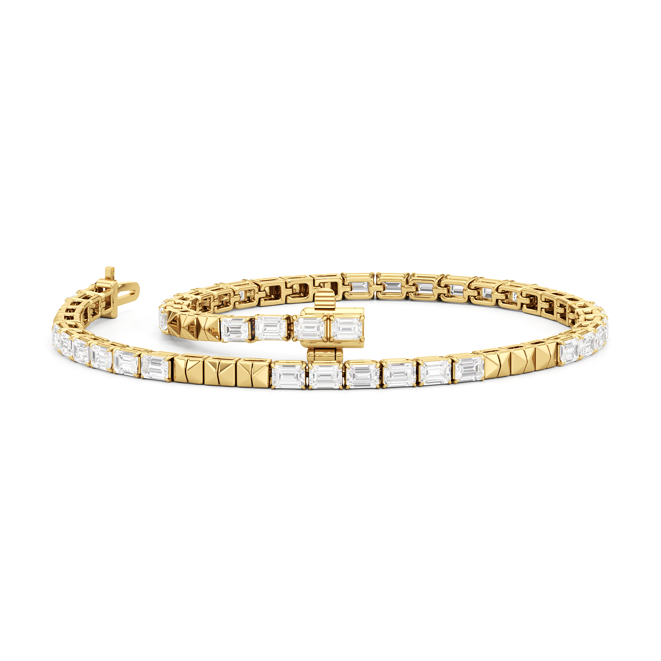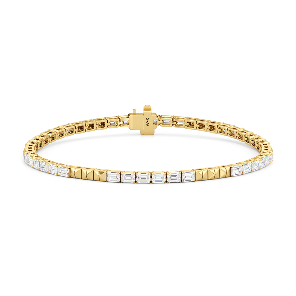 This diamond tennis confidently makes a statement, and enhances your jewelry stack. Twenty - Eight emerald-cut diamonds secured by claw prongs make up this jewel's beauty. For a hint of luxurious color, yellow gold trios mark five stations across the bracelet's length.