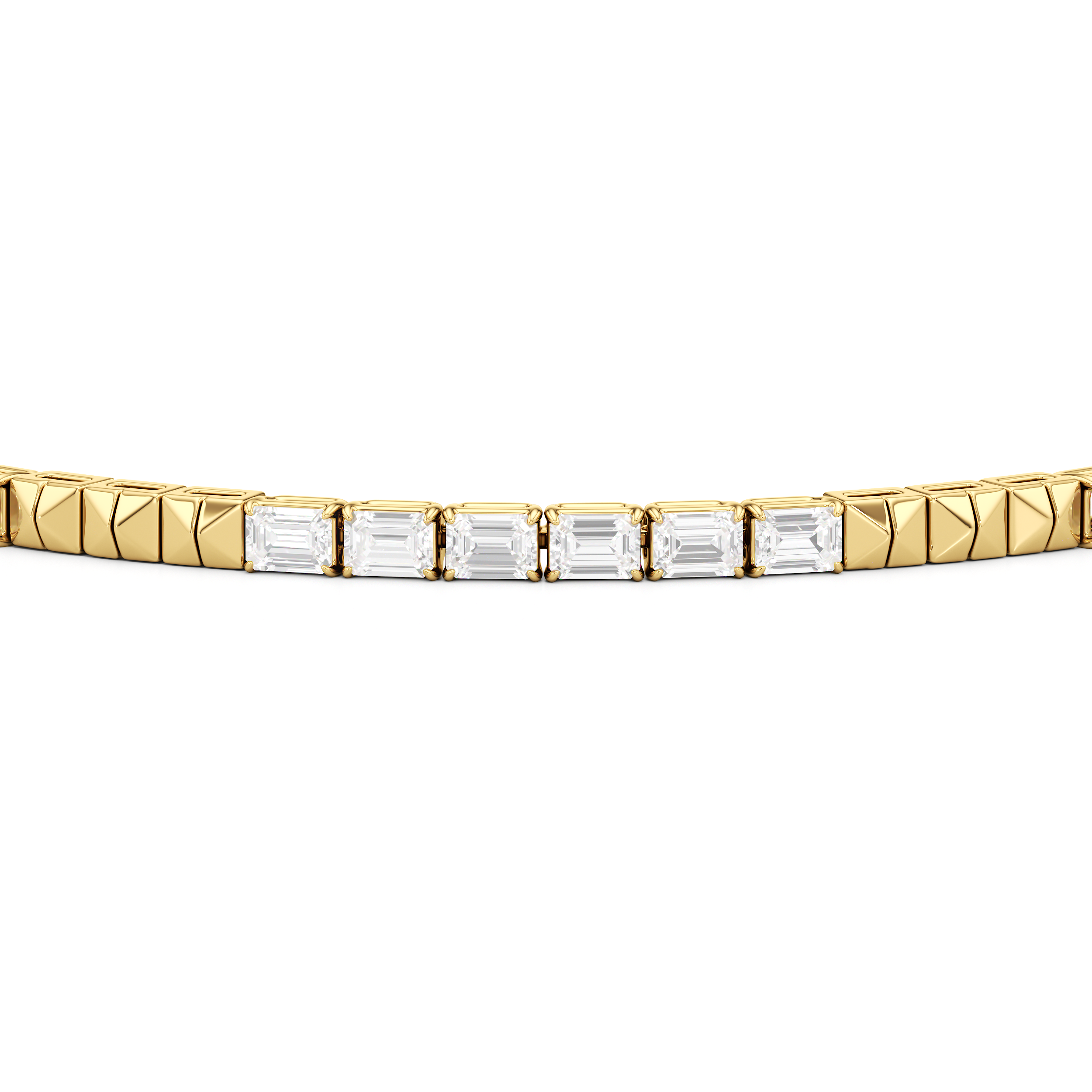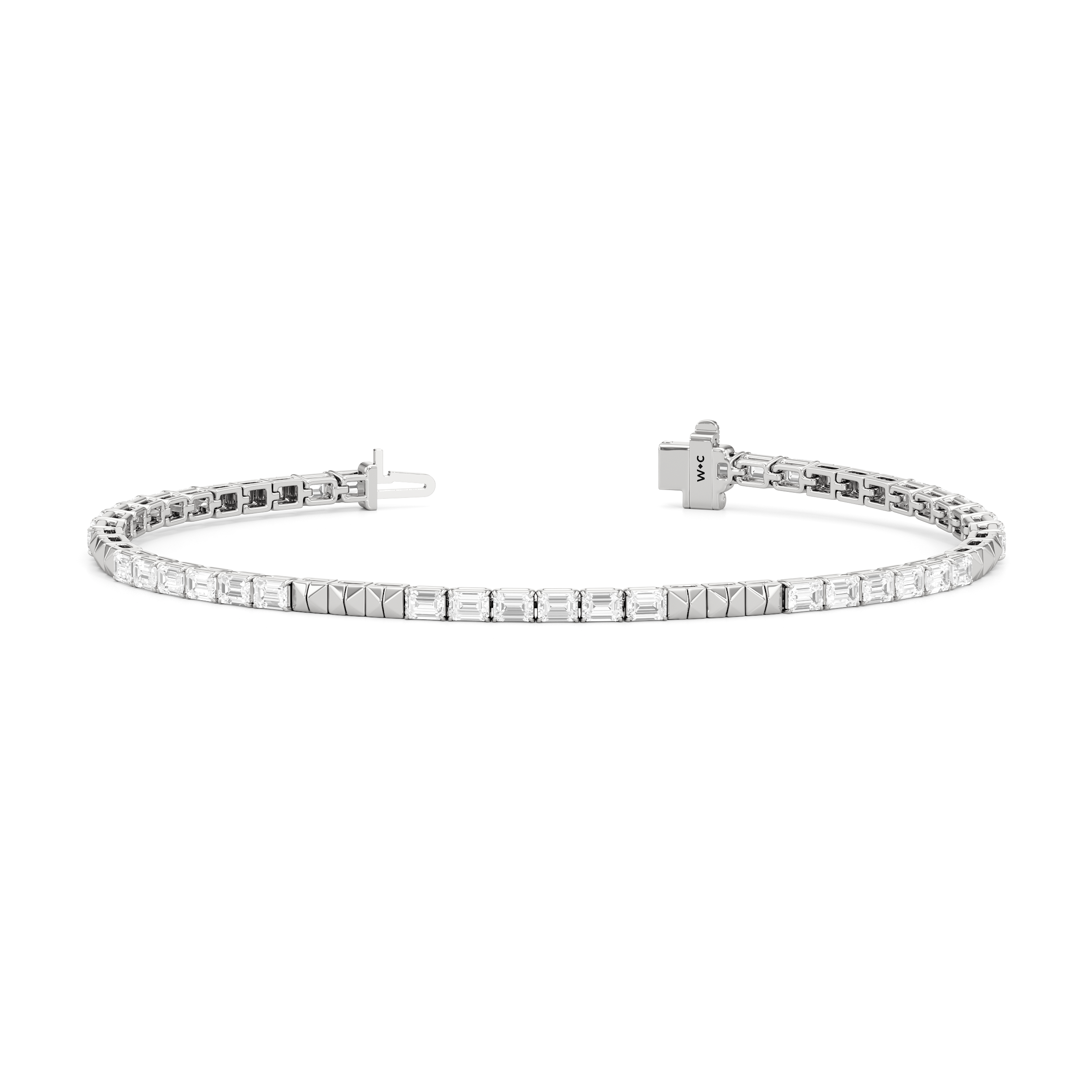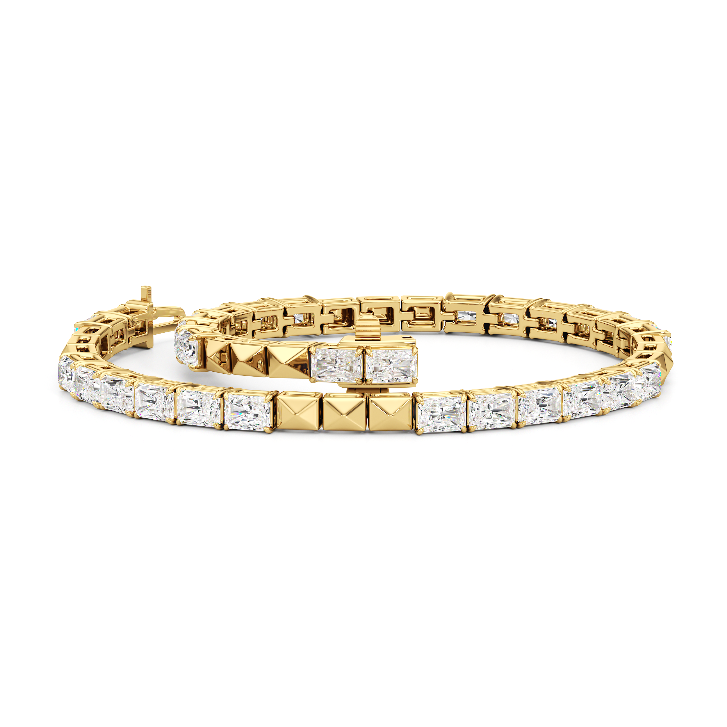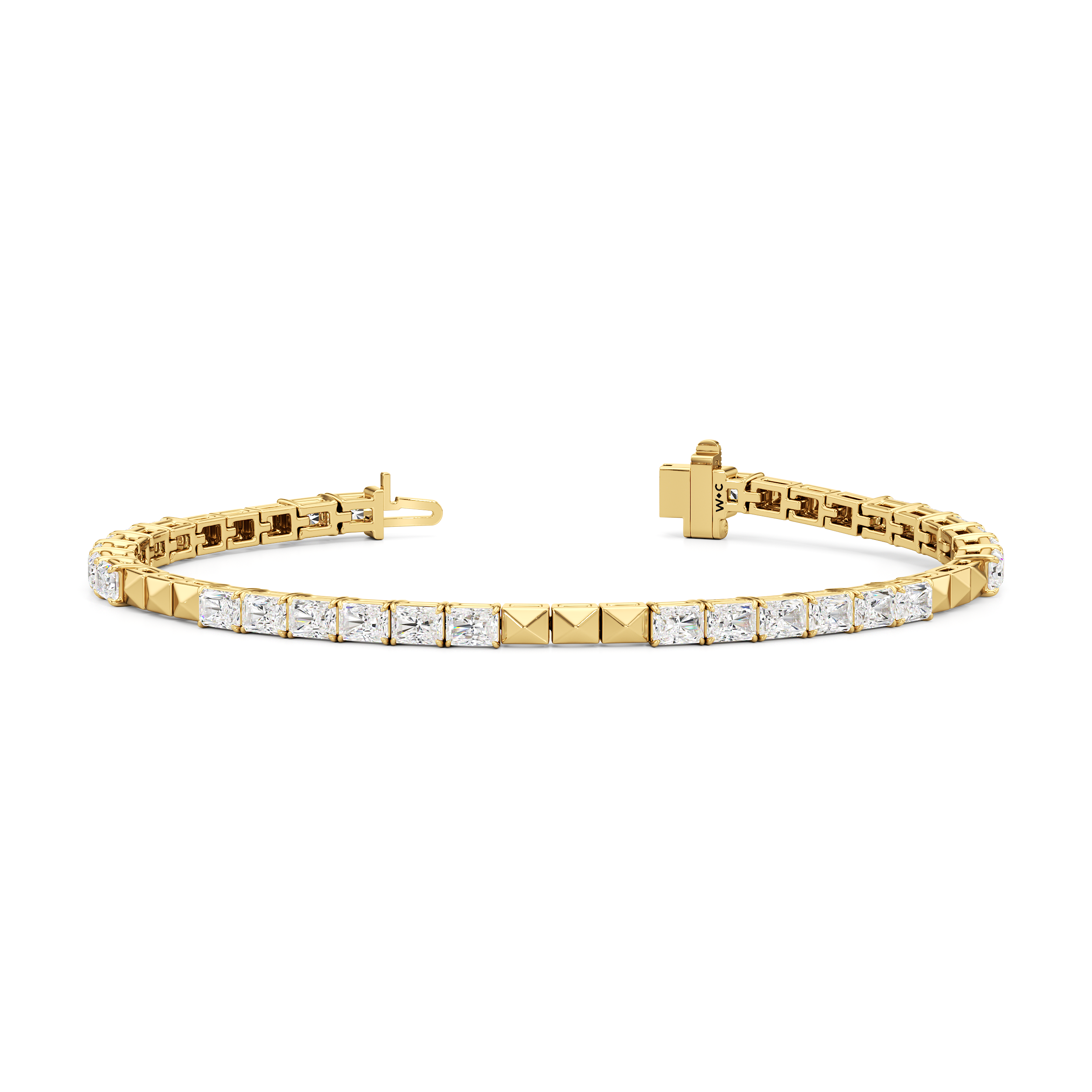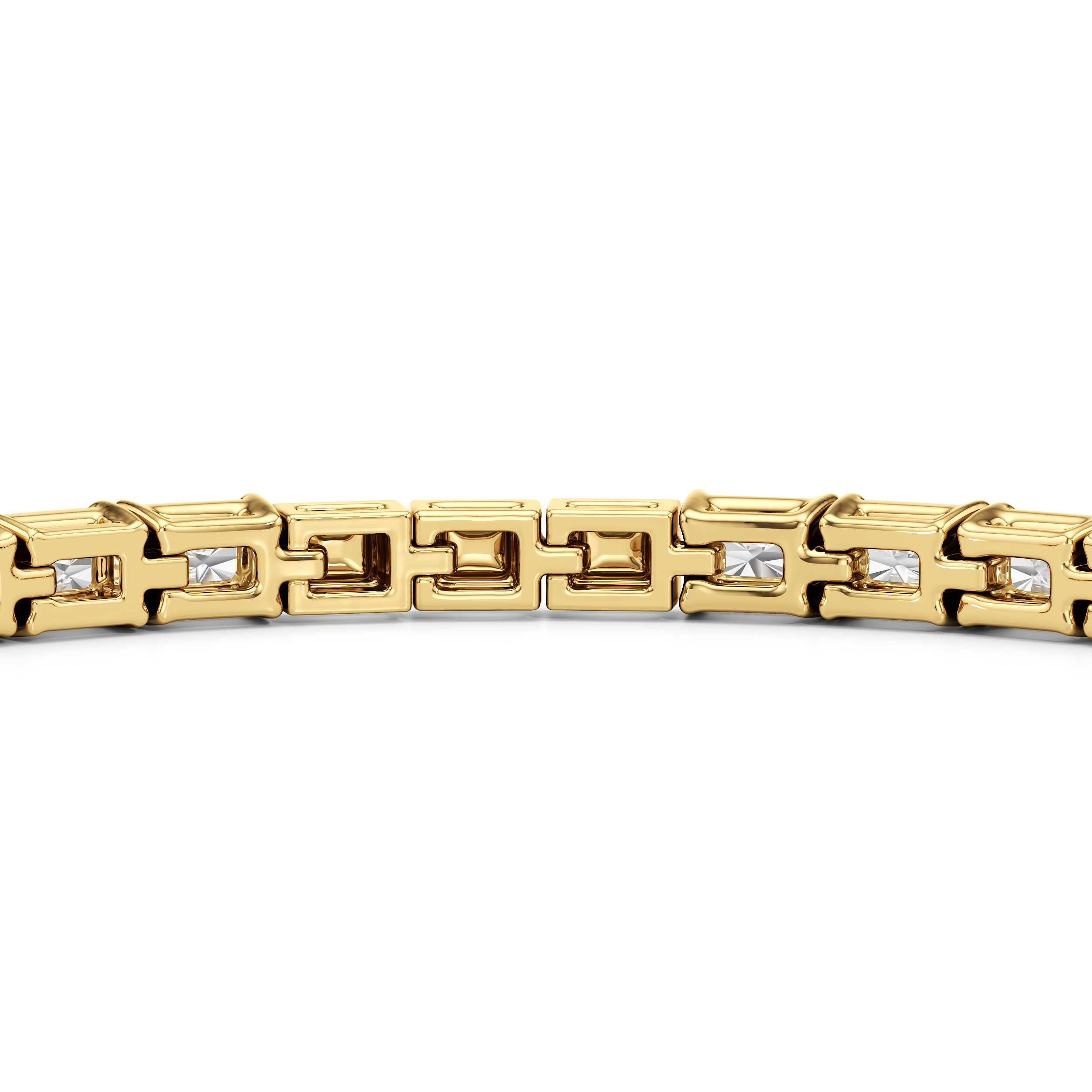 This diamond tennis confidently makes a statement, and enhances your jewelry stack. Twenty - Eight emerald-cut diamonds secured by claw prongs make up this jewel's beauty. For a hint of luxurious color, yellow gold trios mark five stations across the bracelet's length.