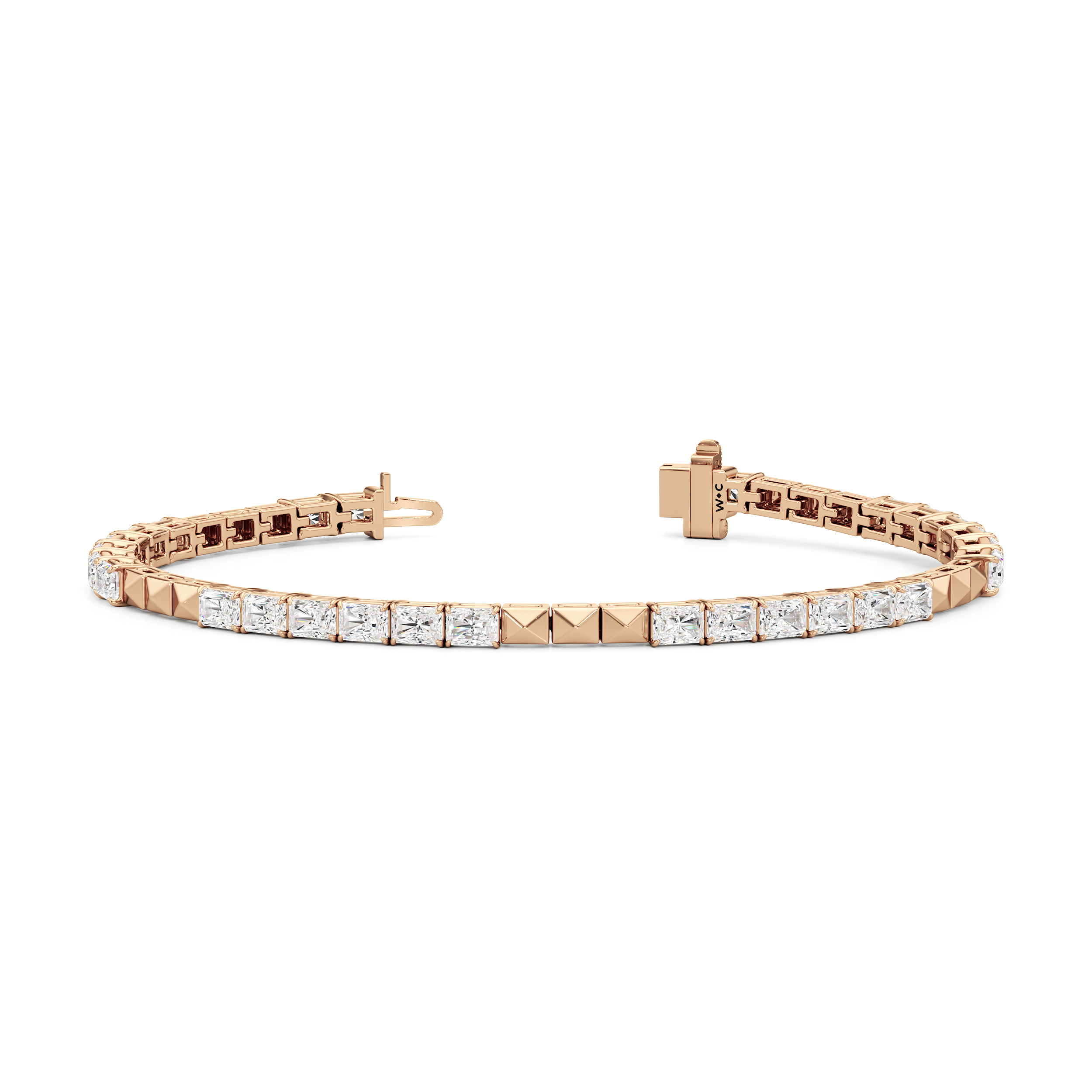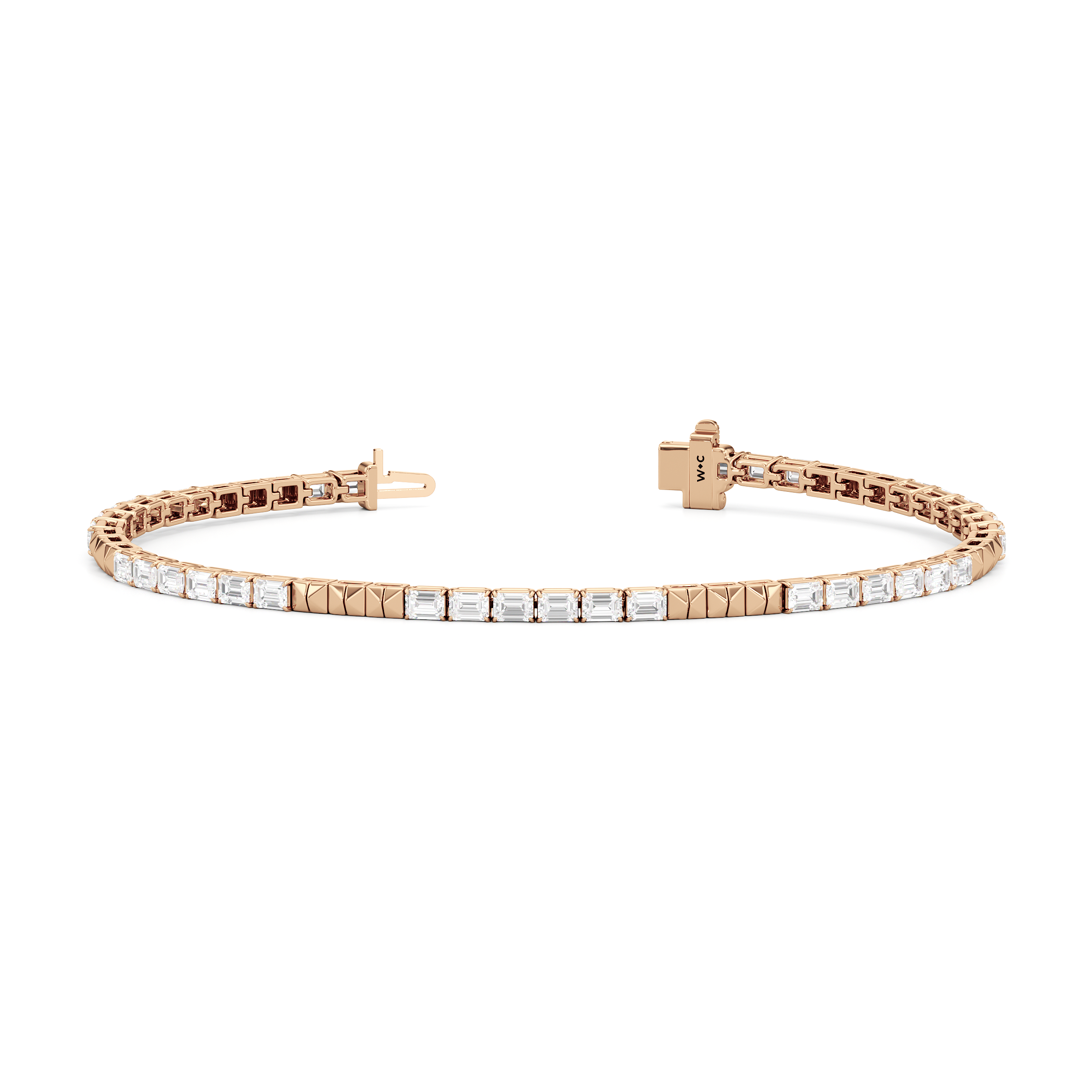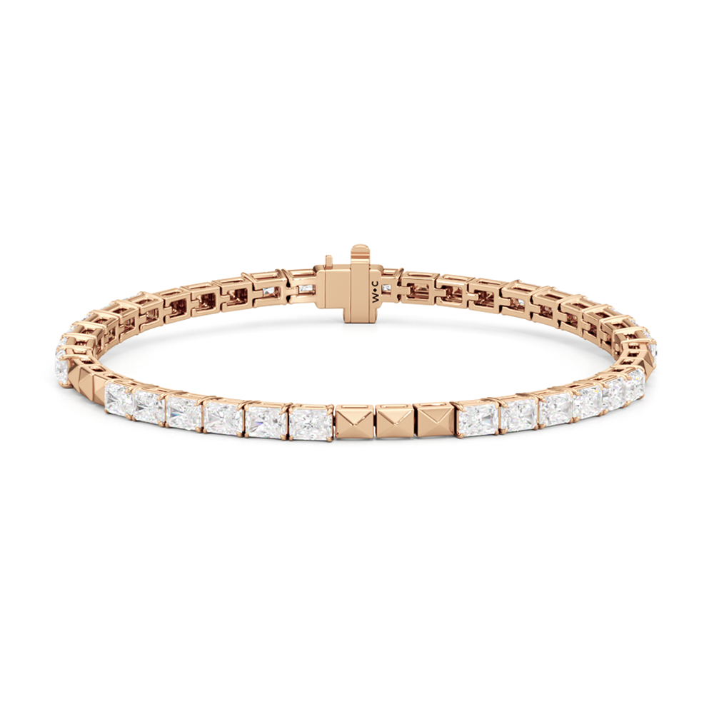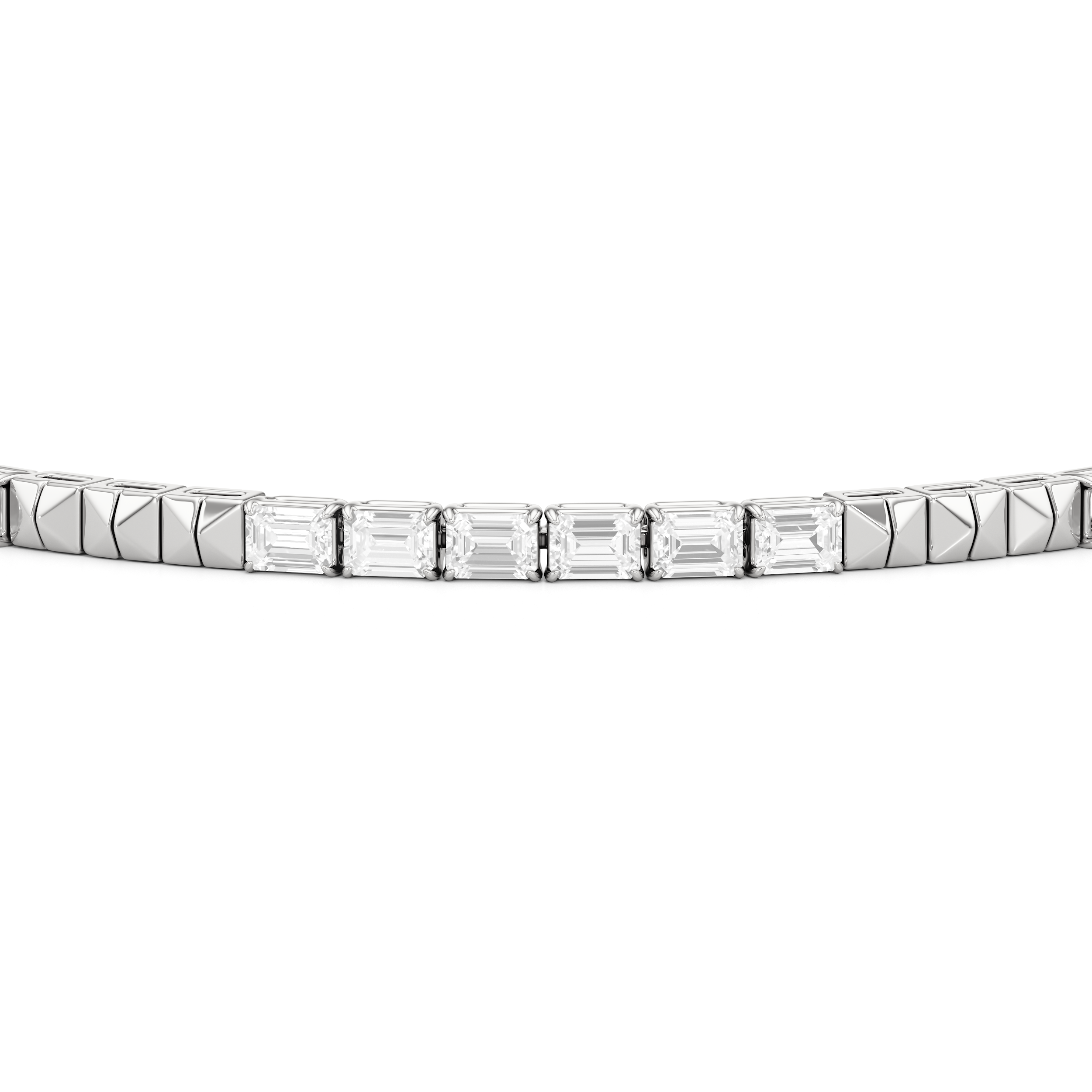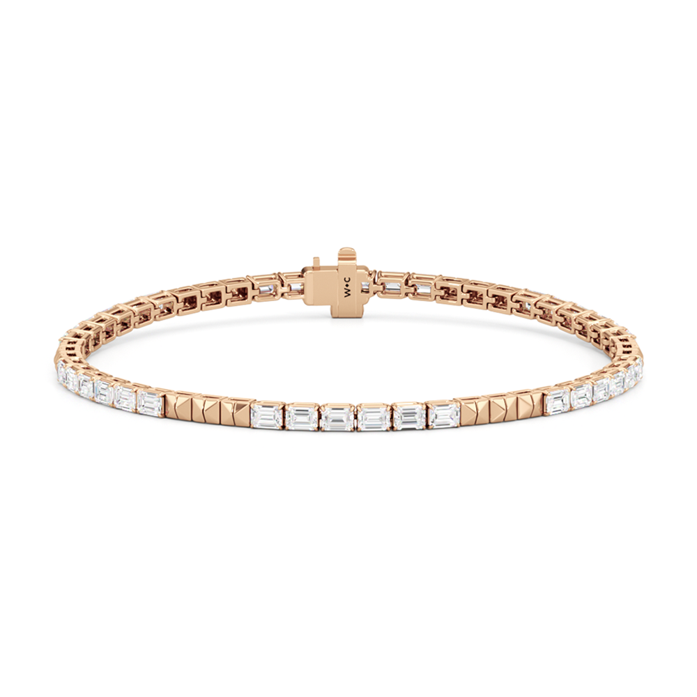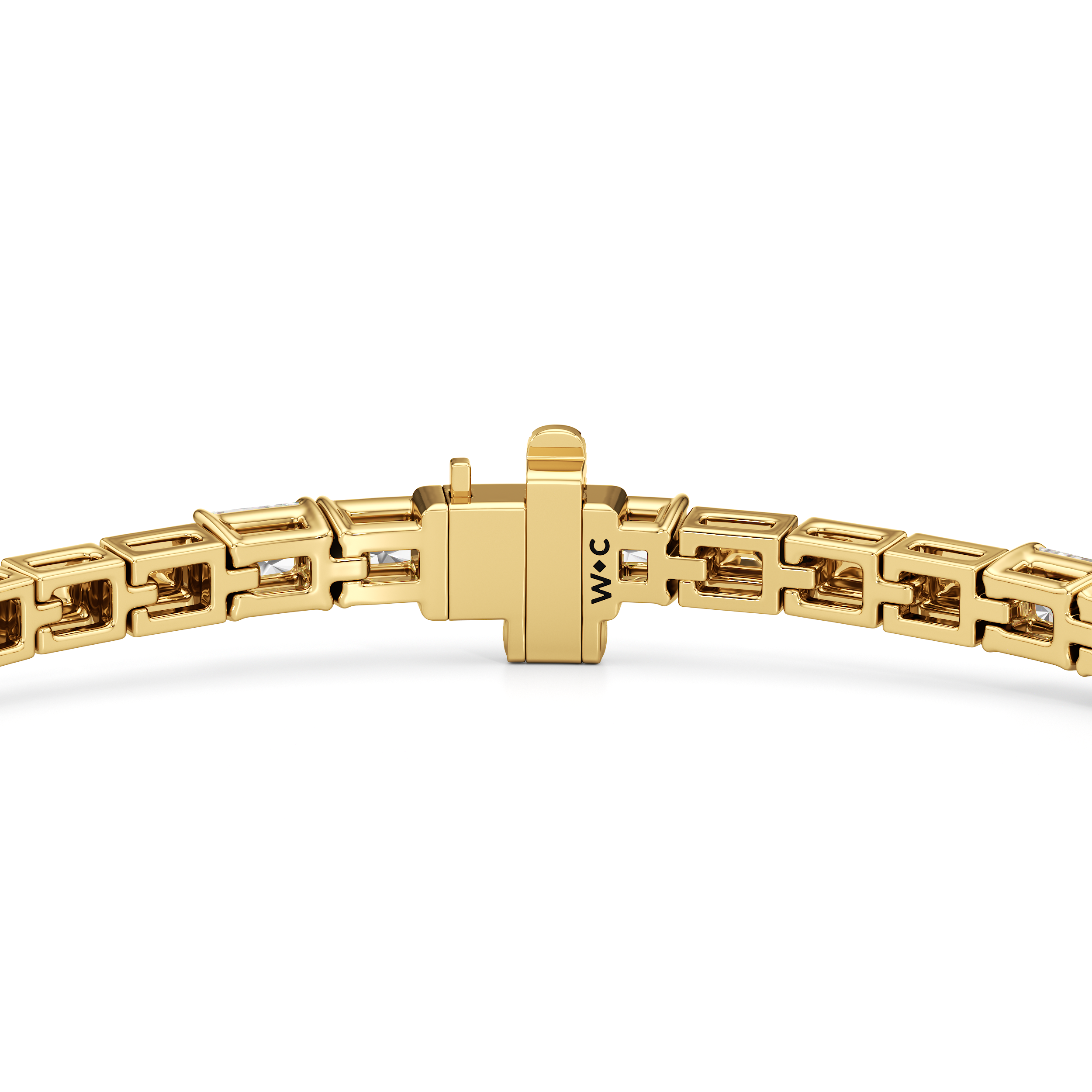 This diamond tennis confidently makes a statement, and enhances your jewelry stack. Twenty - Eight emerald-cut diamonds secured by claw prongs make up this jewel's beauty. For a hint of luxurious color, yellow gold trios mark five stations across the bracelet's length.