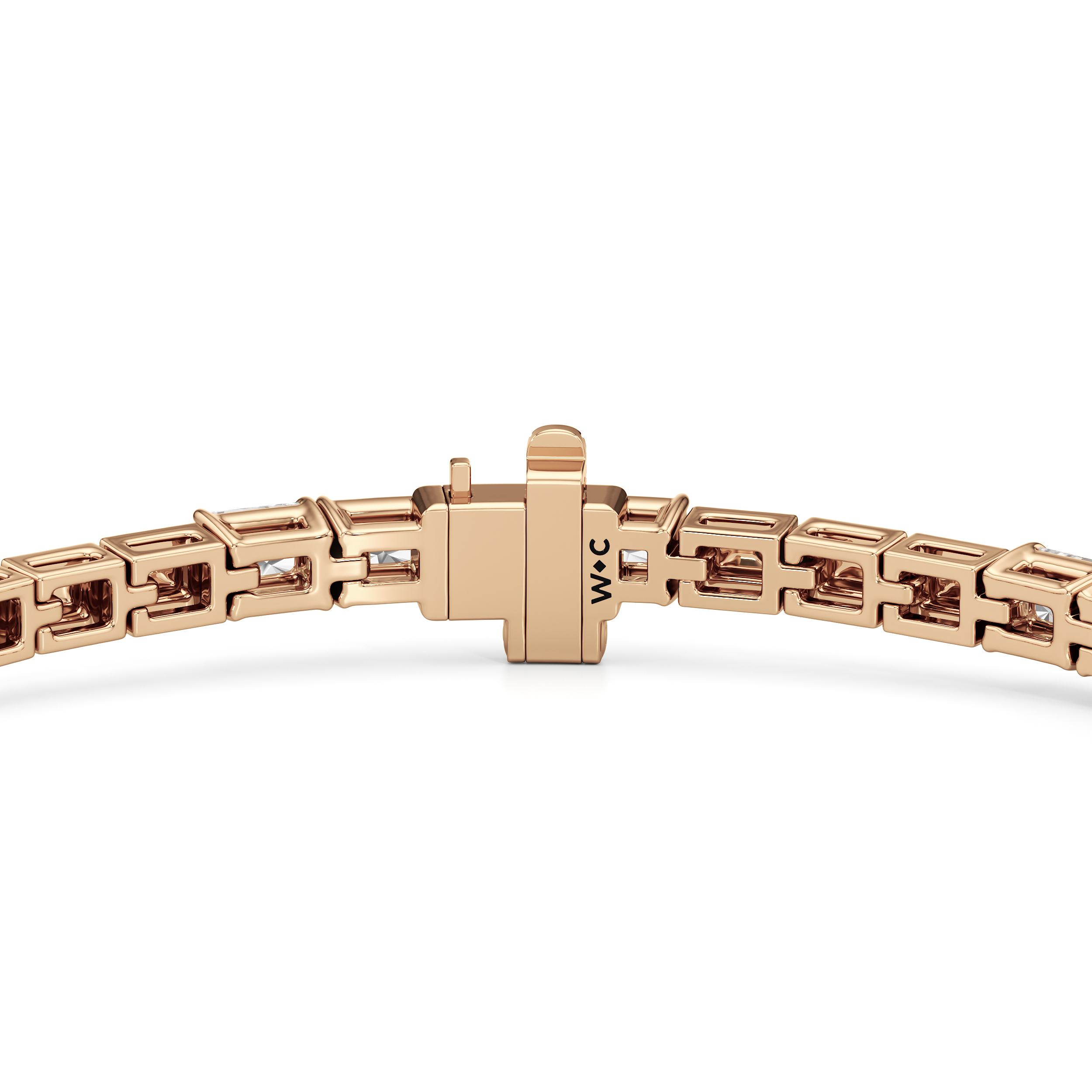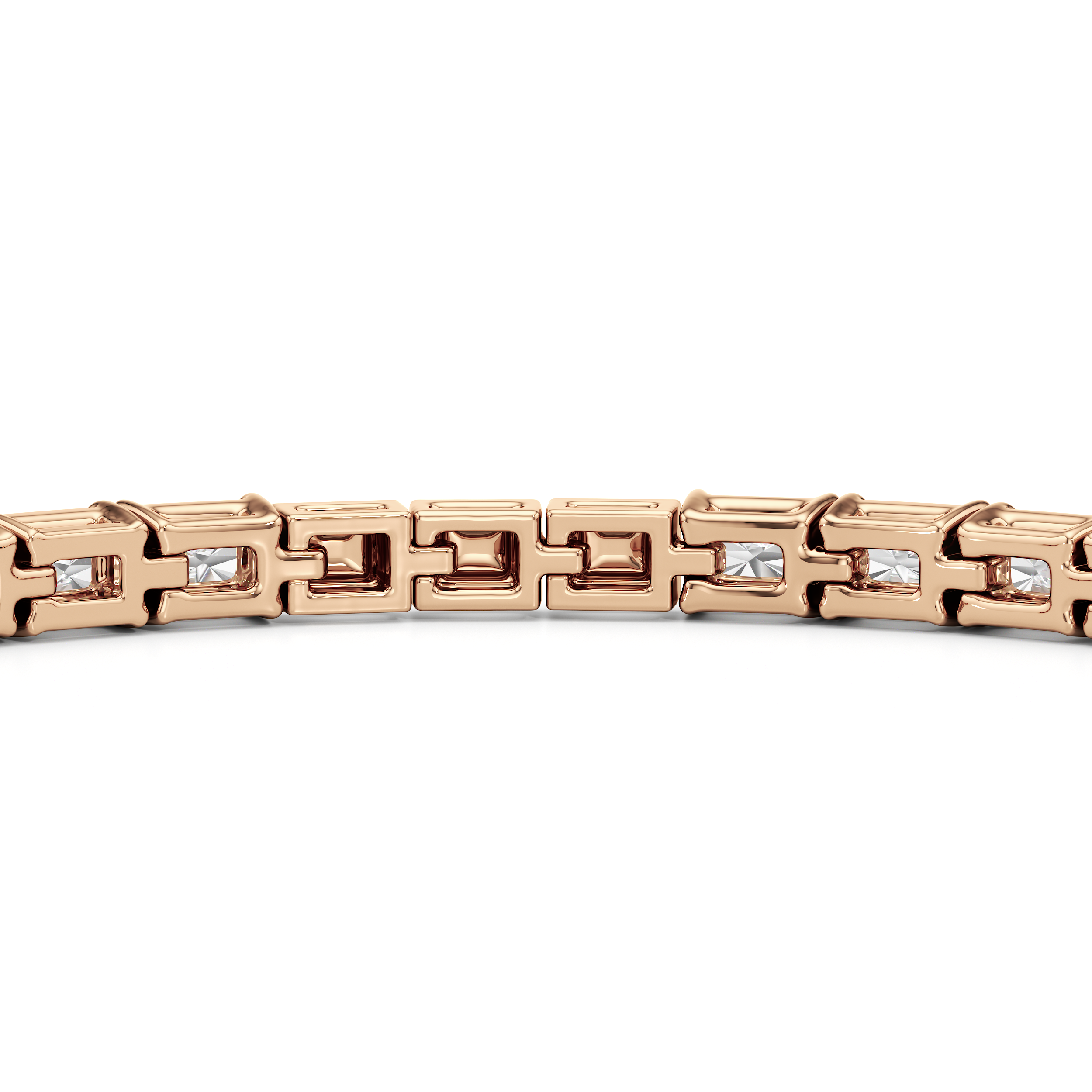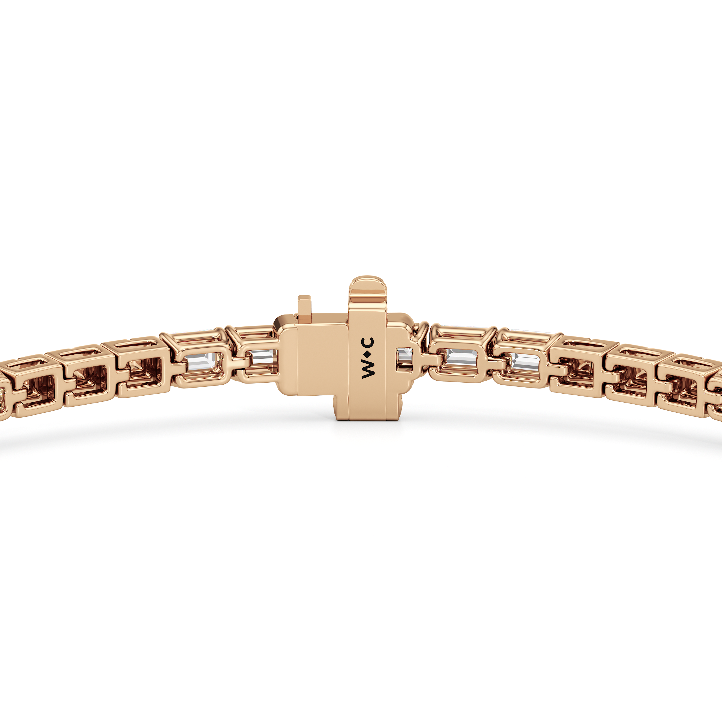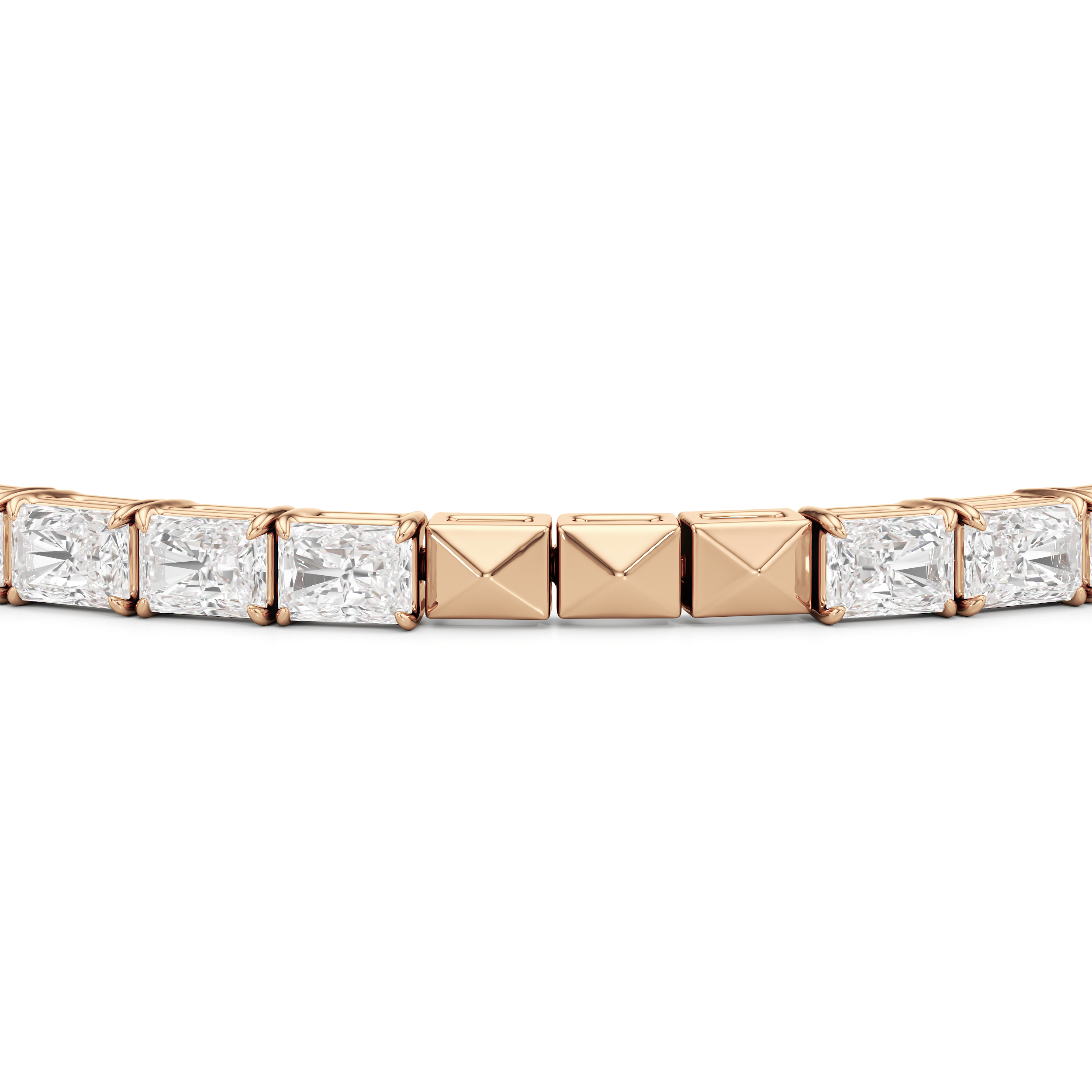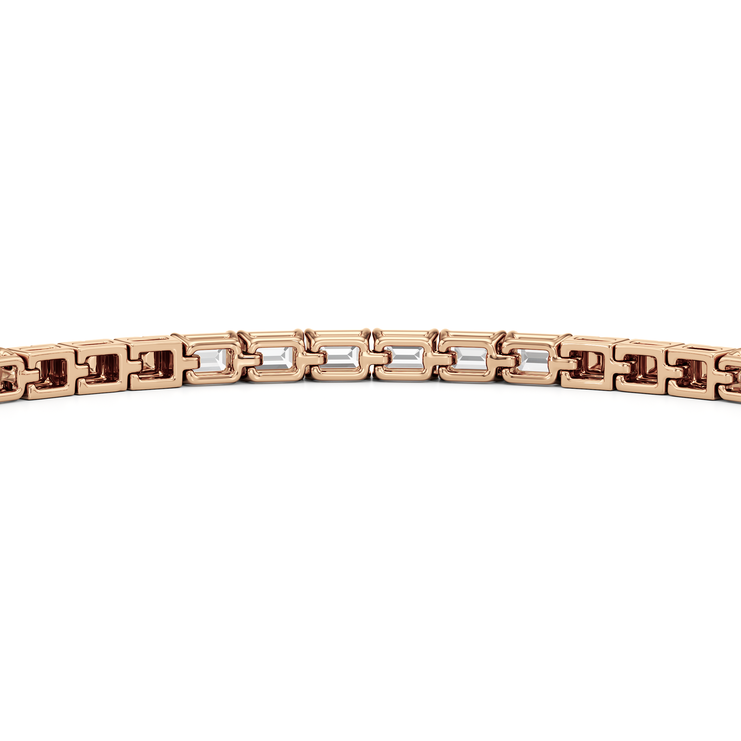 This diamond tennis confidently makes a statement, and enhances your jewelry stack. Twenty - Eight emerald-cut diamonds secured by claw prongs make up this jewel's beauty. For a hint of luxurious color, yellow gold trios mark five stations across the bracelet's length.