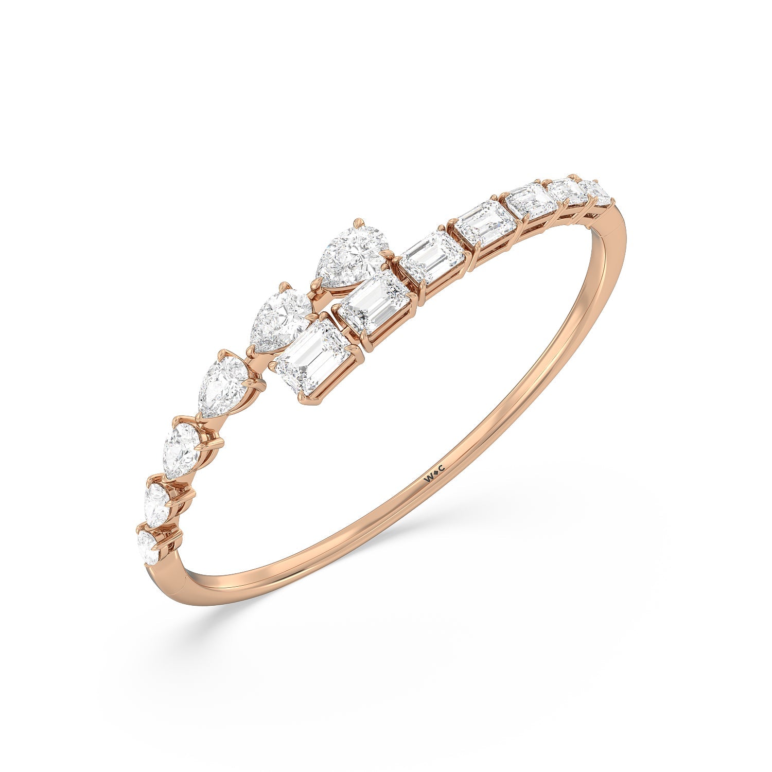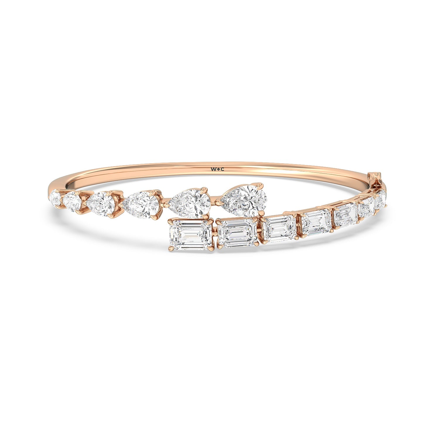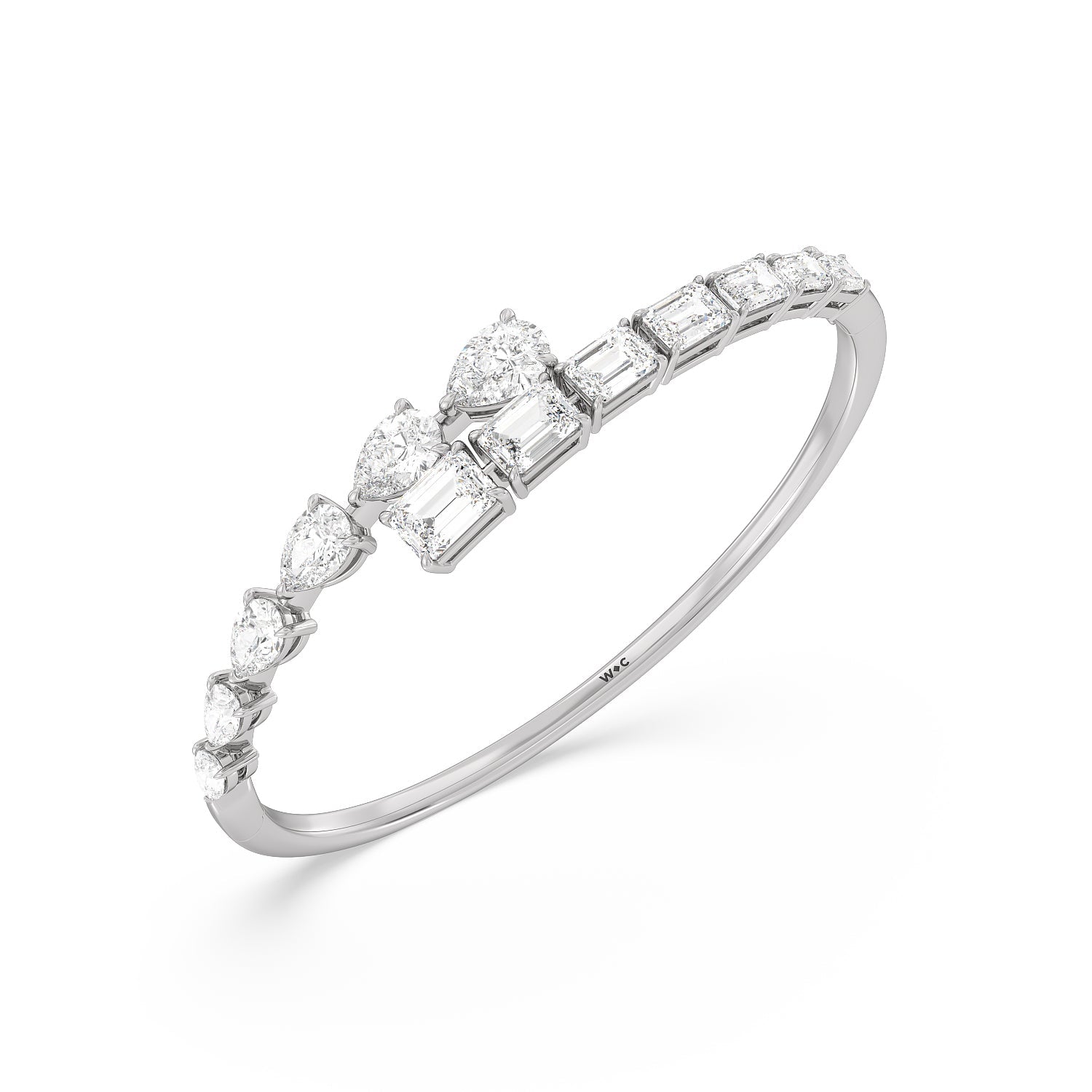 Introducing the Red Carpet Stunner: Our Graduating Pear-Shaped and Emerald Cut Diamond Bangle with a Total Diamond Weight of 13ct. Prepare to make a dramatic entrance and leave a trail of awe in your wake with our Graduating Pear-Shaped and Emerald Cut Diamond Bangle. This masterpiece epitomizes sophistication and luxury.