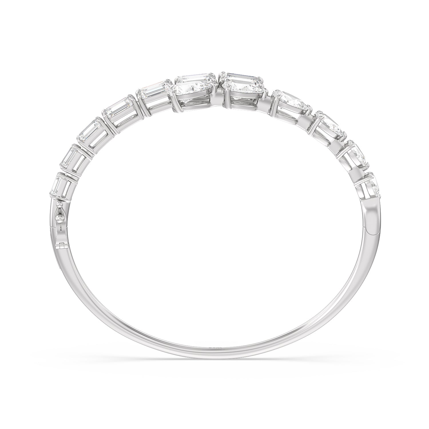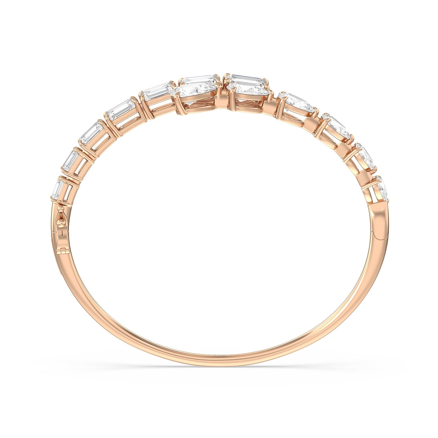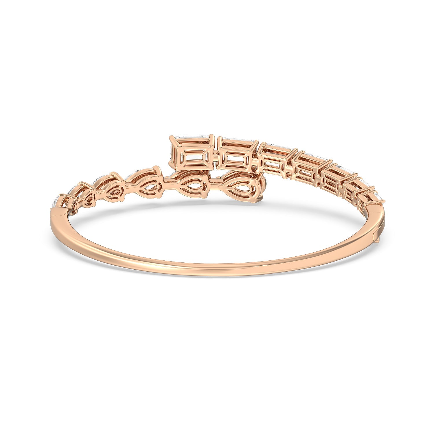 Introducing the Red Carpet Stunner: Our Graduating Pear-Shaped and Emerald Cut Diamond Bangle with a Total Diamond Weight of 13ct. Prepare to make a dramatic entrance and leave a trail of awe in your wake with our Graduating Pear-Shaped and Emerald Cut Diamond Bangle. This masterpiece epitomizes sophistication and luxury.