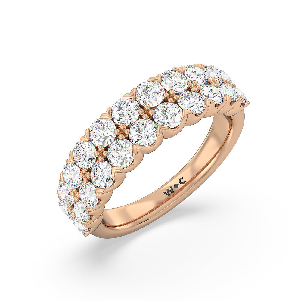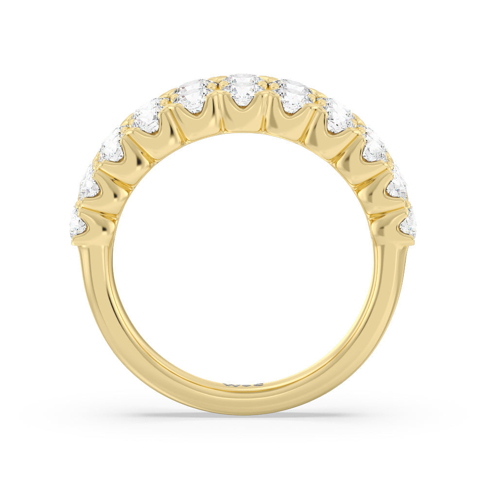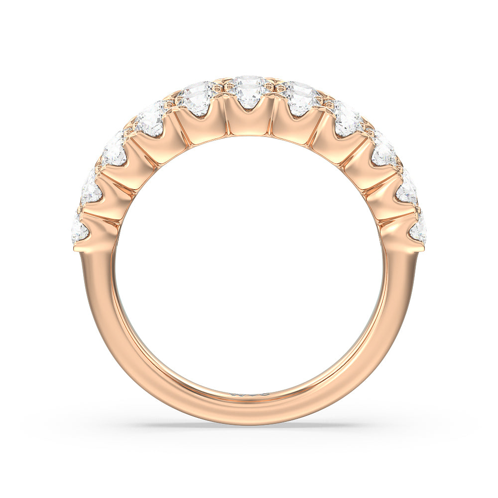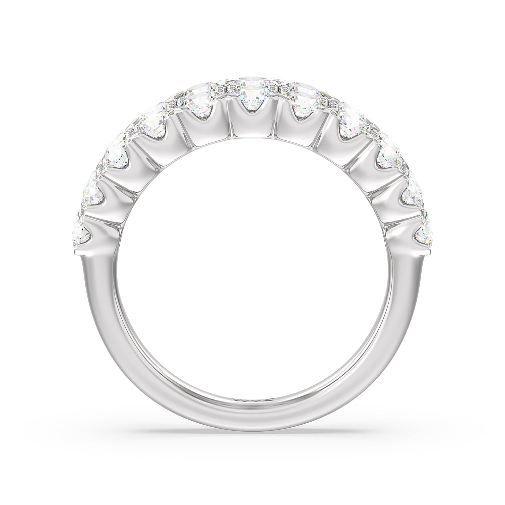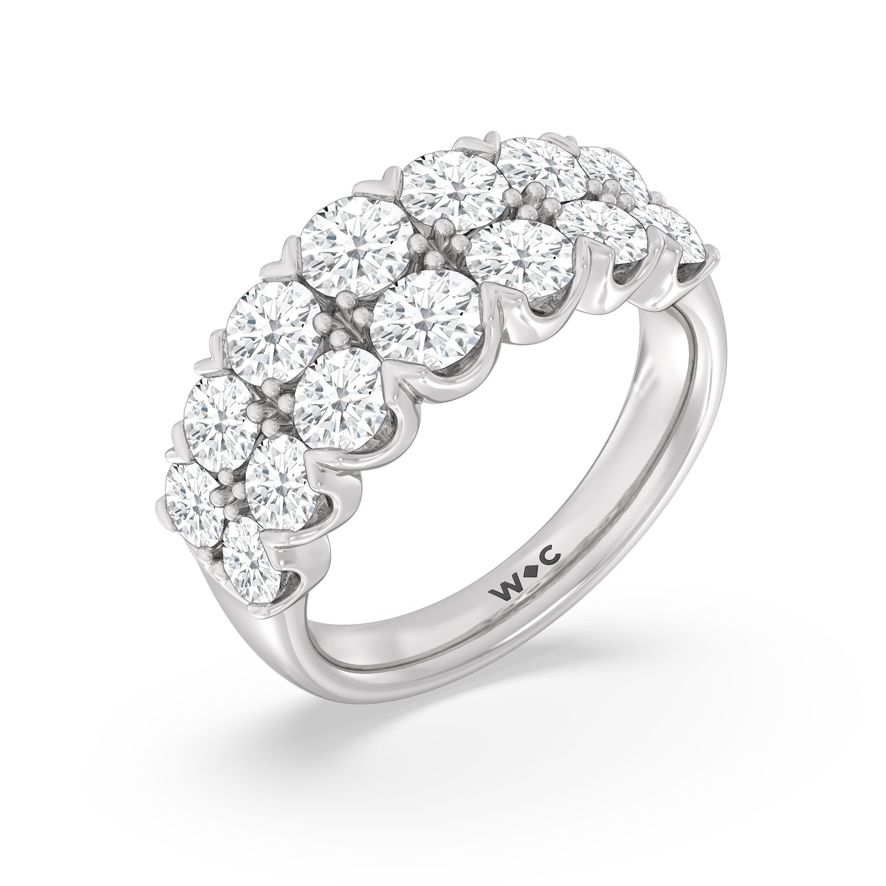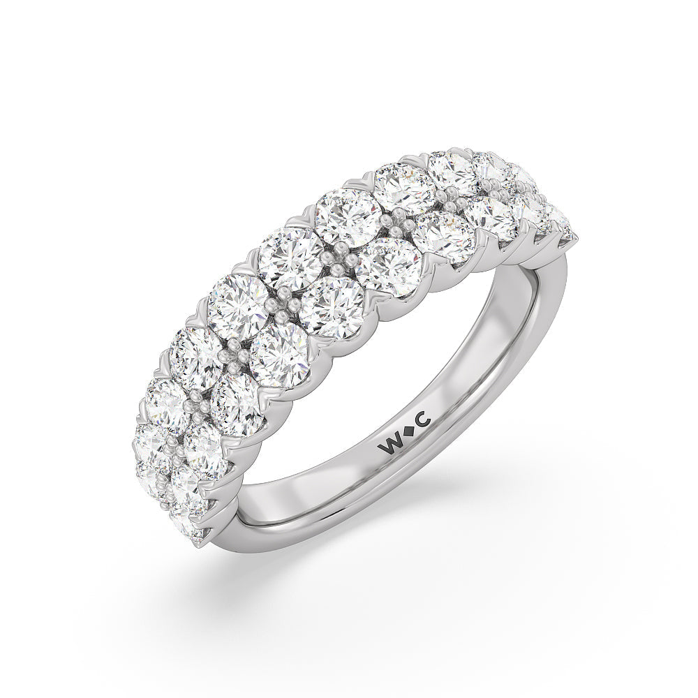 This anniversary ring with two rows of round diamonds looks incredibly stylish while simultaneously timeless. The polished band that gently tapers towards the back has its top half adorned with round diamonds that also taper gradually in size. This ring is the perfect choice if you're looking for a half-eternity diamond ring that possesses a bit more sense of style and sophistication.