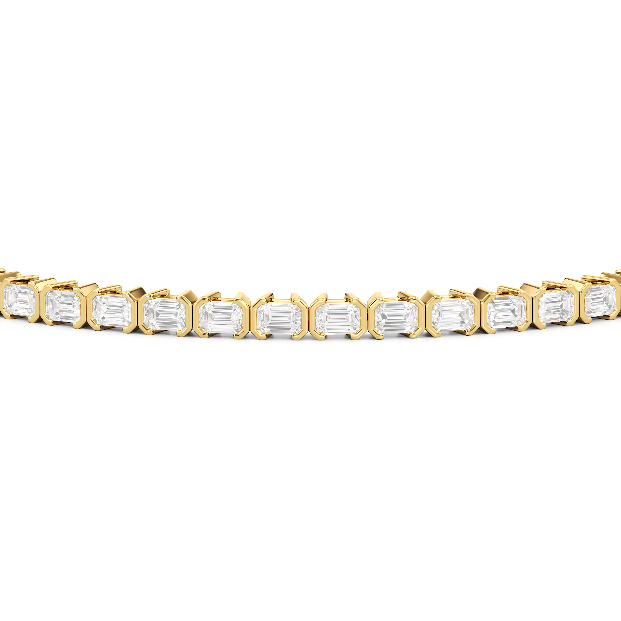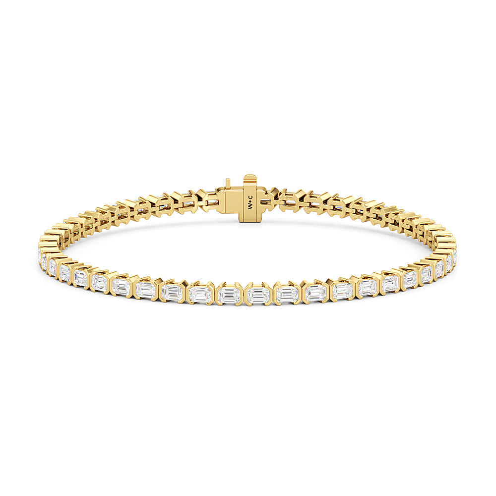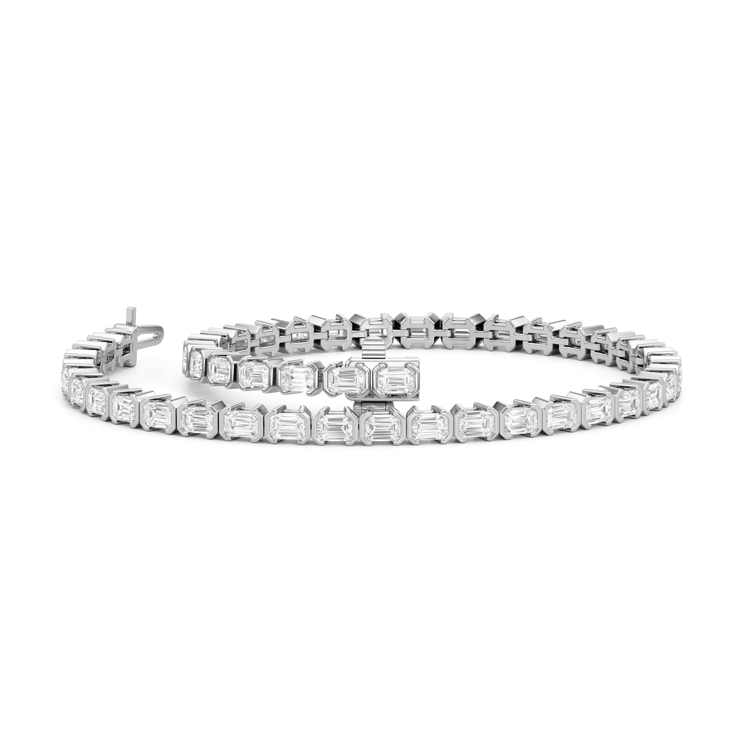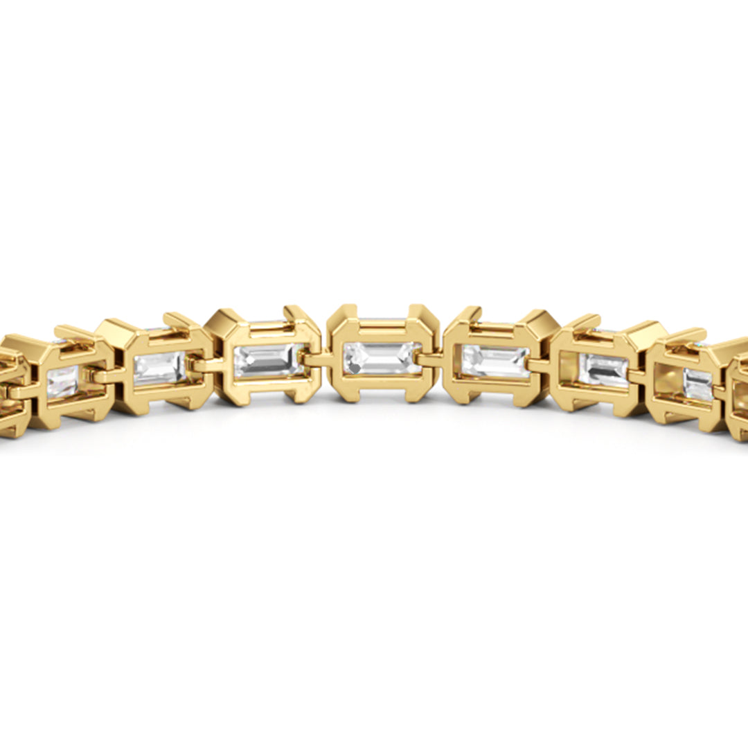 A glamourous take on a classic style. This tennis bracelet boasts a continuous line of emerald-cut diamonds, each gem carefully set in a half-bezel setting. The partial bezel allows light to pass through the exposed part of each stone, making it shine brighter.
