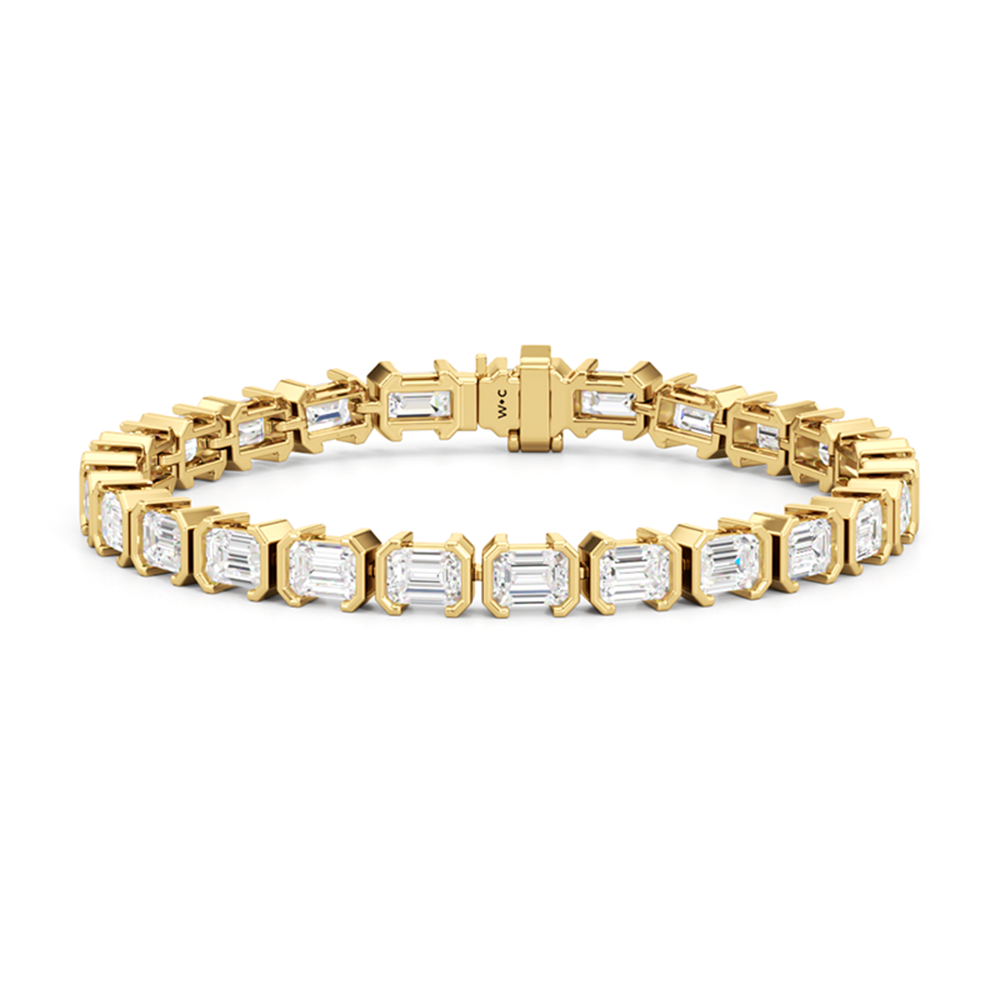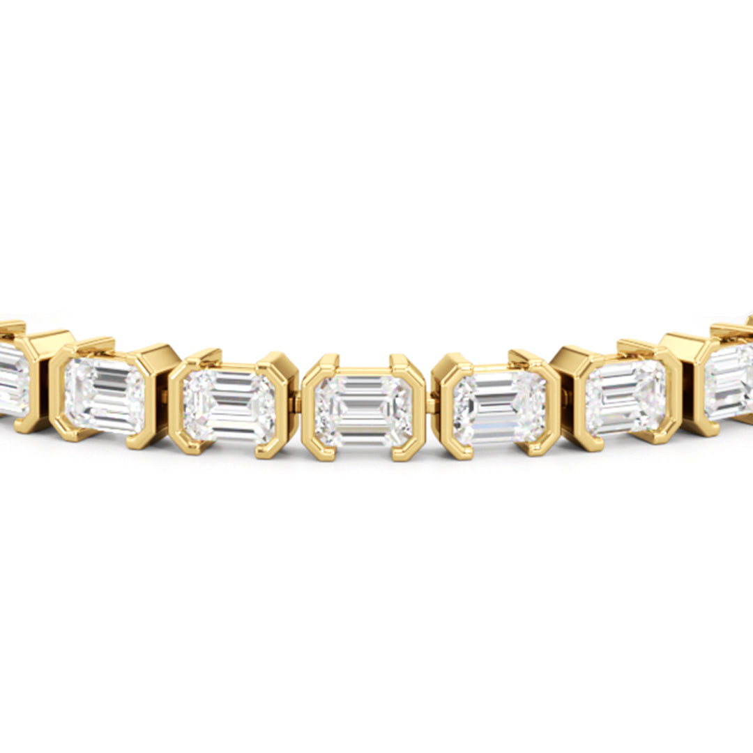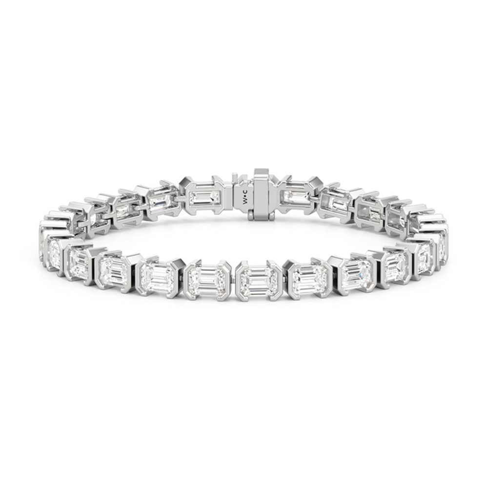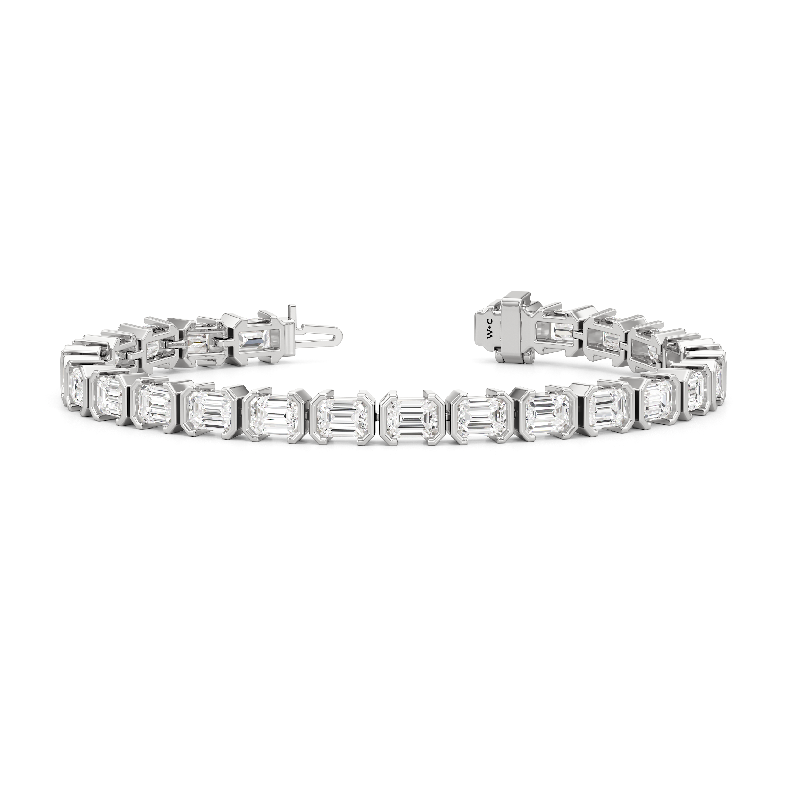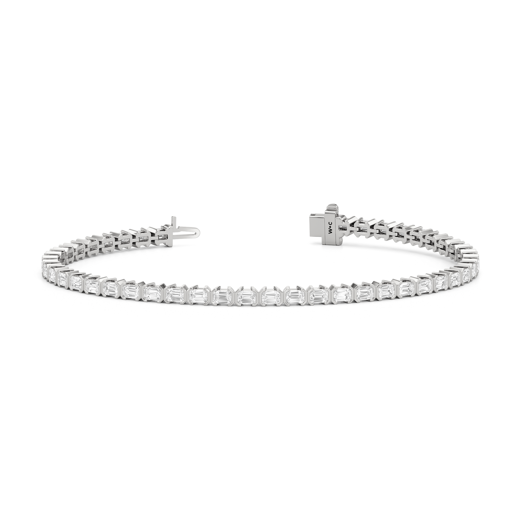 A glamourous take on a classic style. This tennis bracelet boasts a continuous line of emerald-cut diamonds, each gem carefully set in a half-bezel setting. The partial bezel allows light to pass through the exposed part of each stone, making it shine brighter.