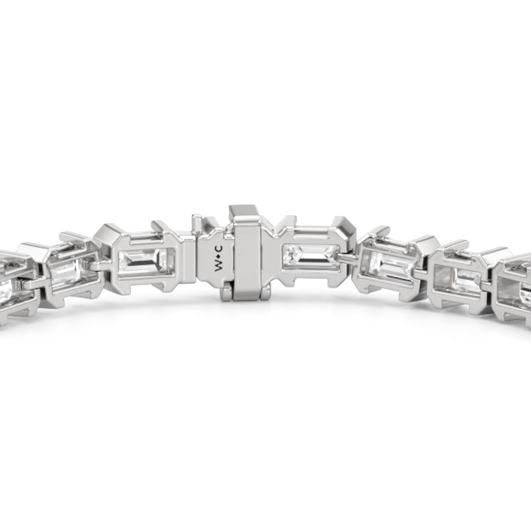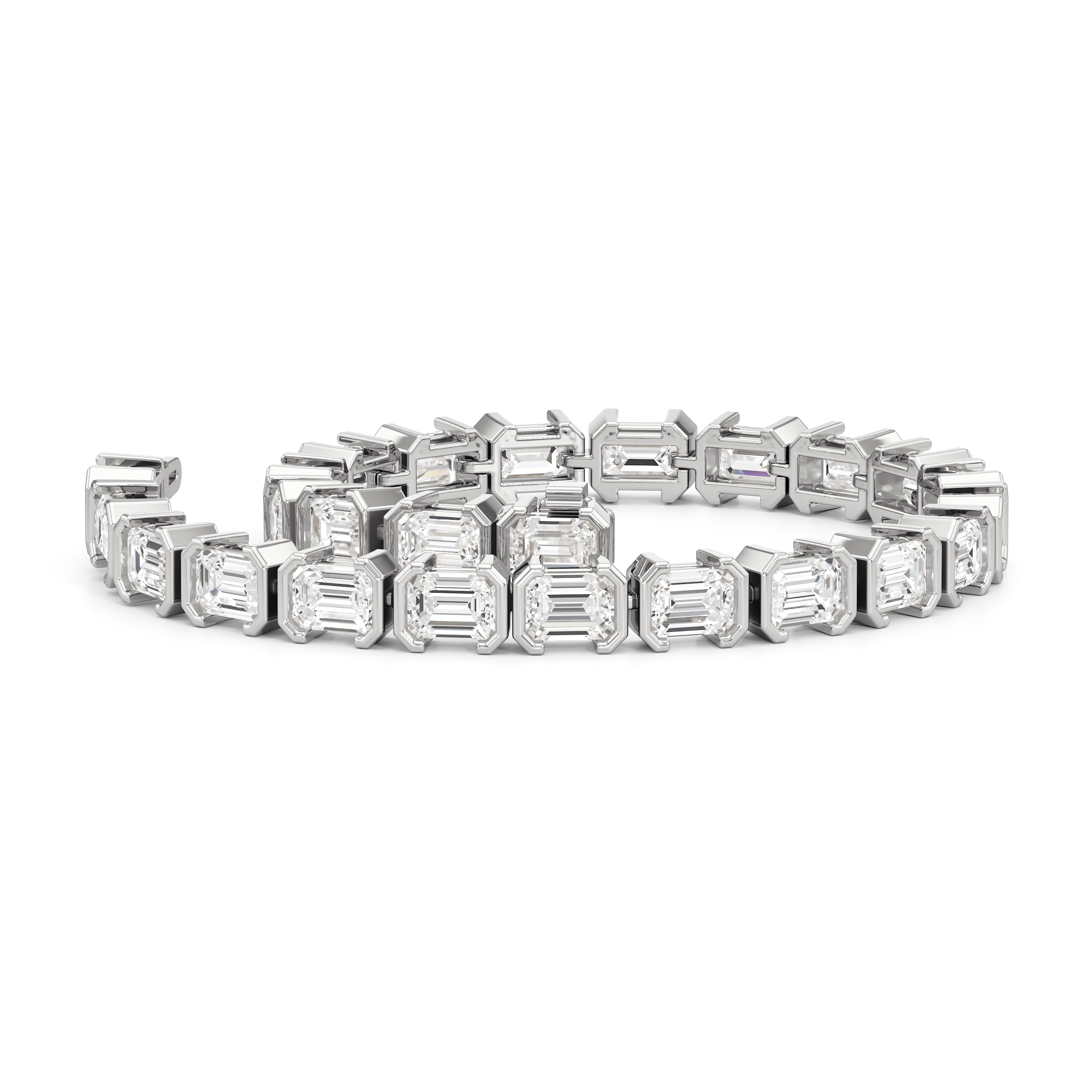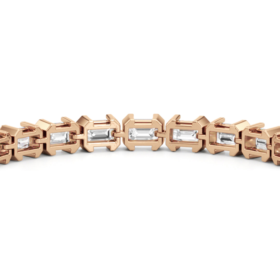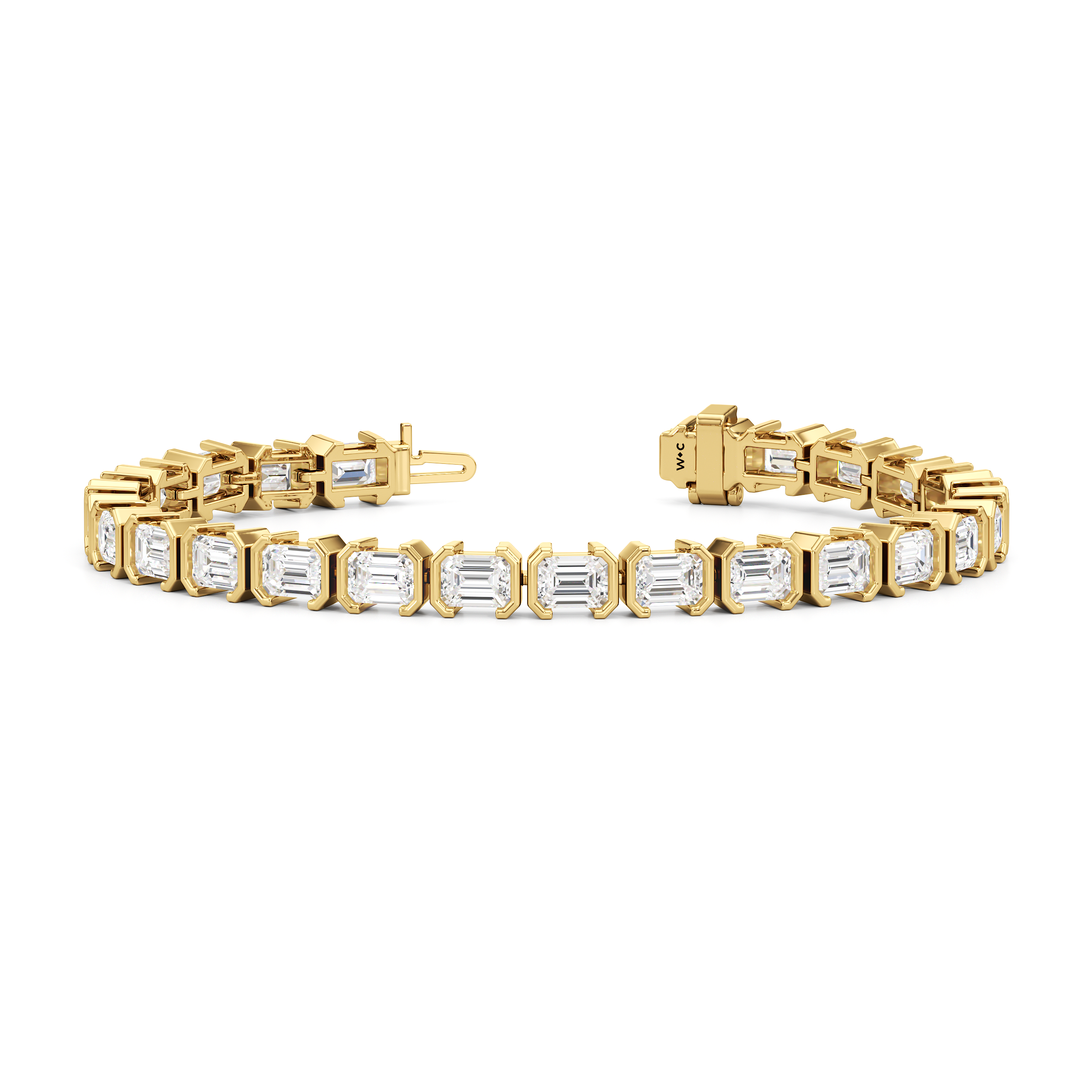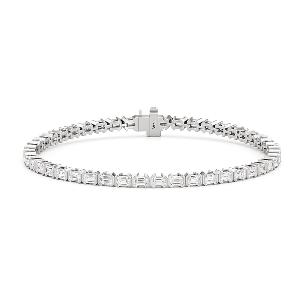 A glamourous take on a classic style. This tennis bracelet boasts a continuous line of emerald-cut diamonds, each gem carefully set in a half-bezel setting. The partial bezel allows light to pass through the exposed part of each stone, making it shine brighter.