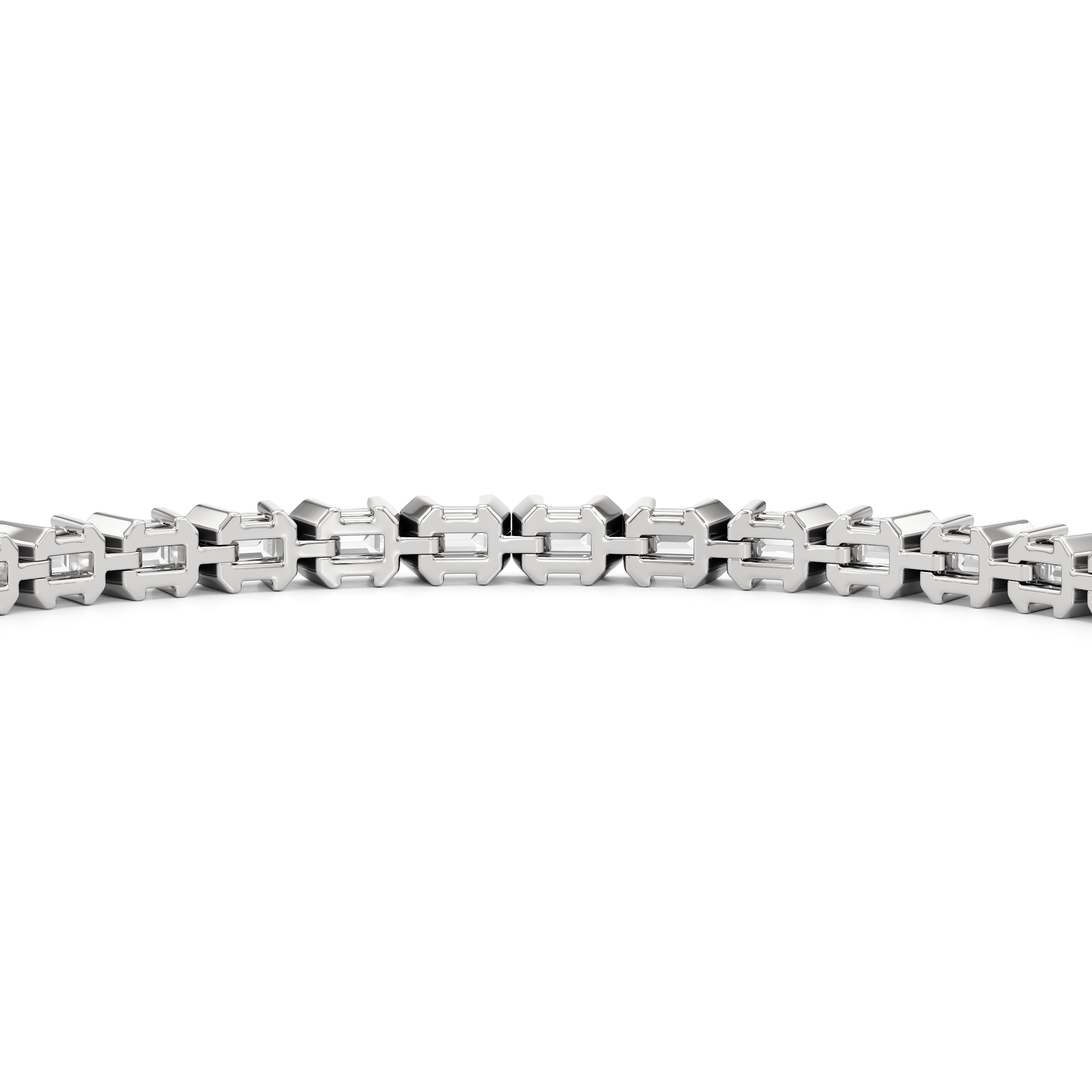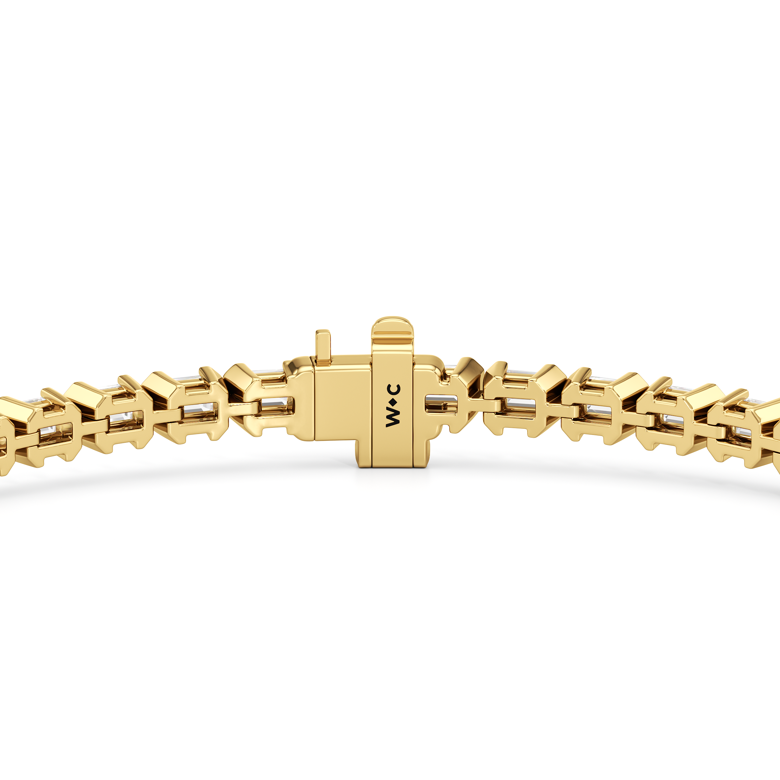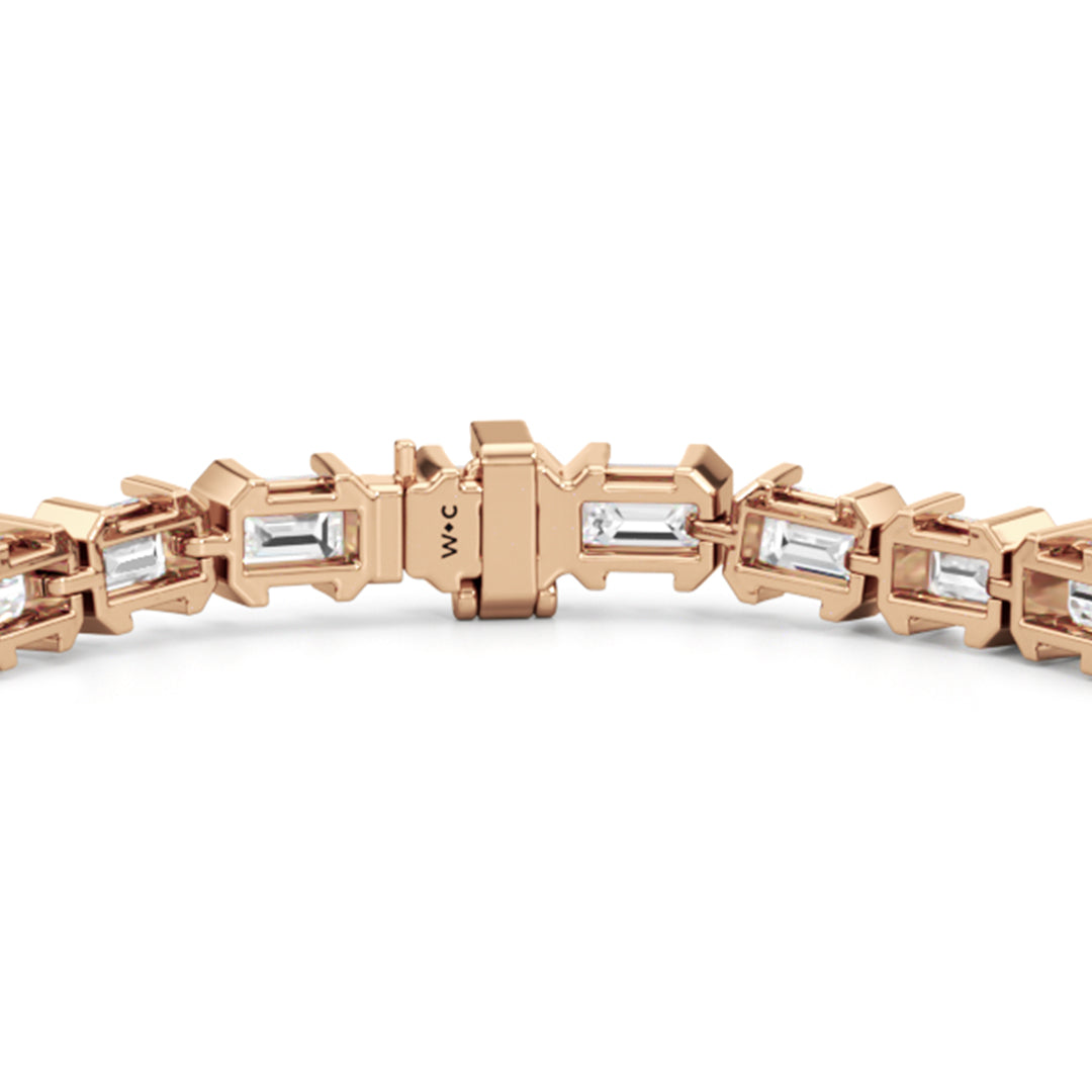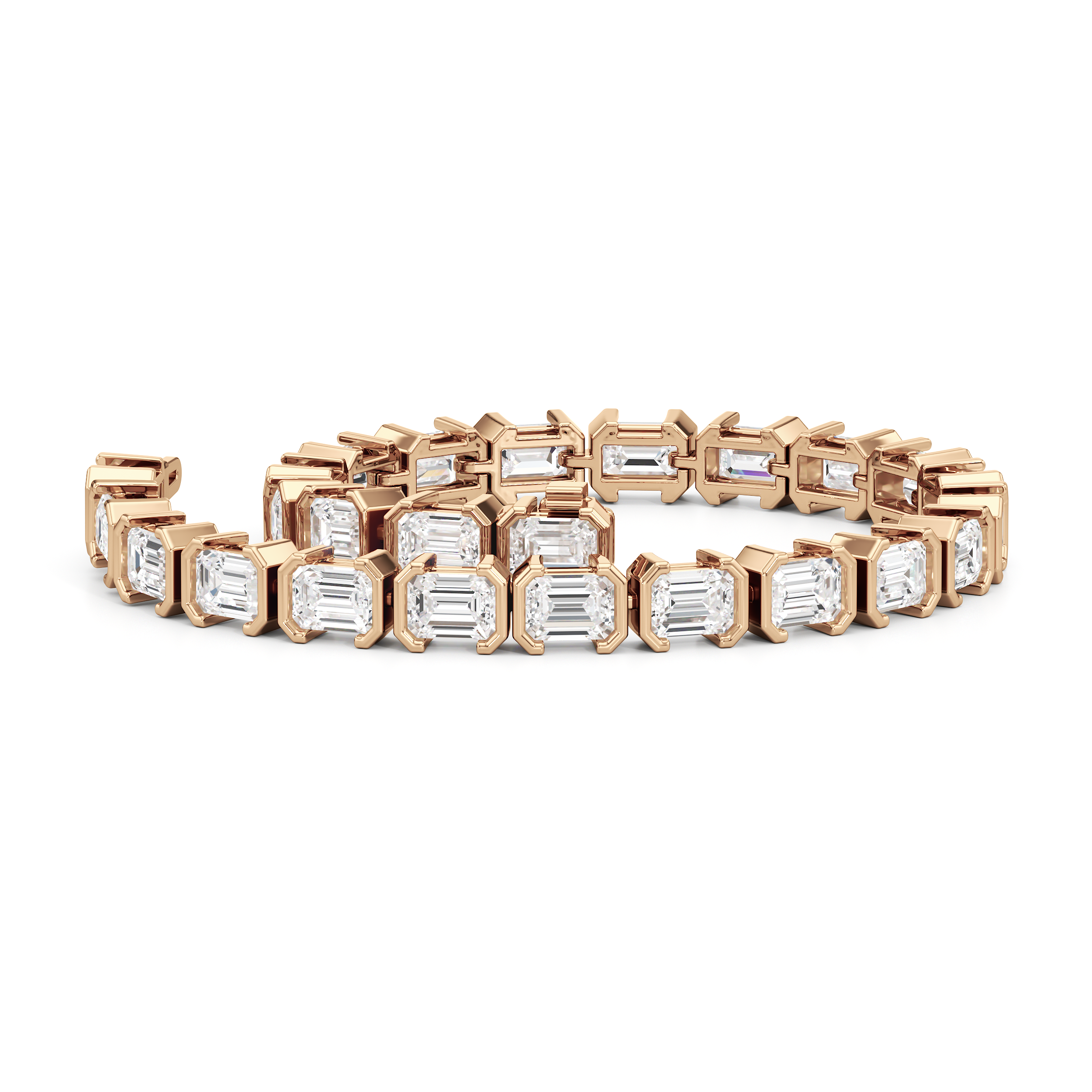 A glamourous take on a classic style. This tennis bracelet boasts a continuous line of emerald-cut diamonds, each gem carefully set in a half-bezel setting. The partial bezel allows light to pass through the exposed part of each stone, making it shine brighter.