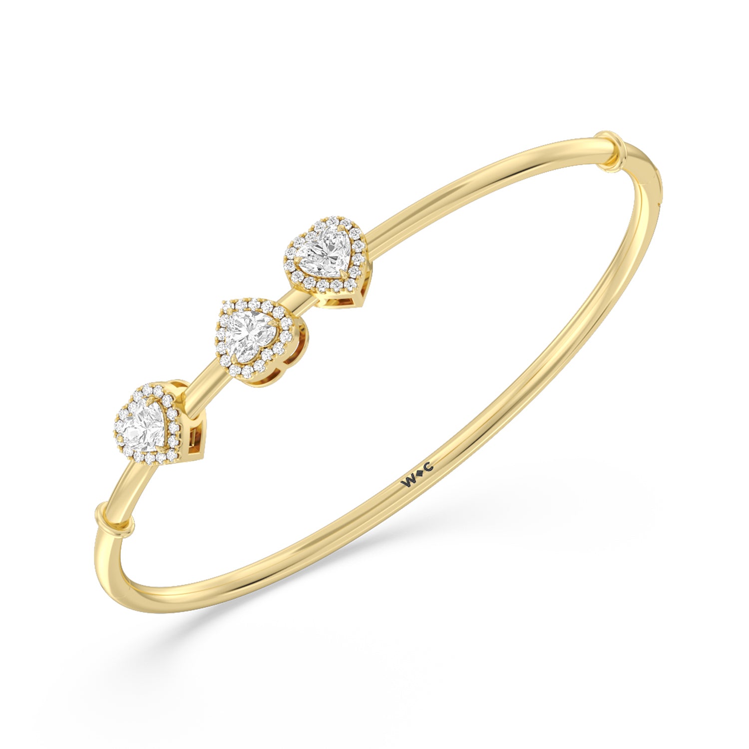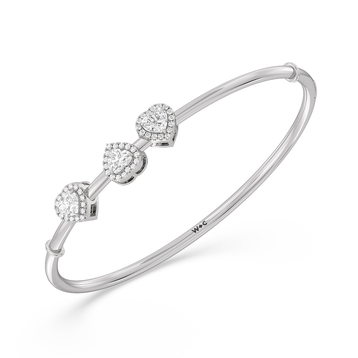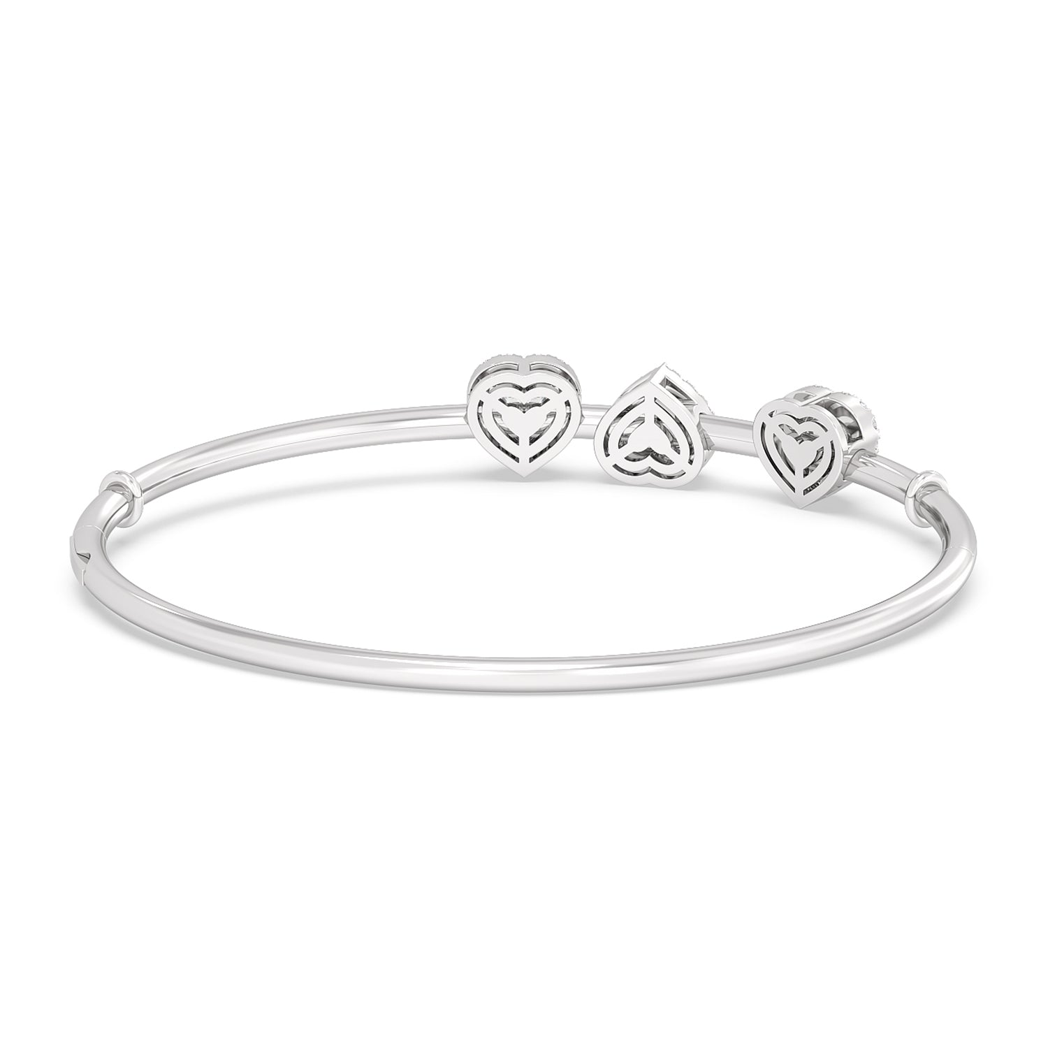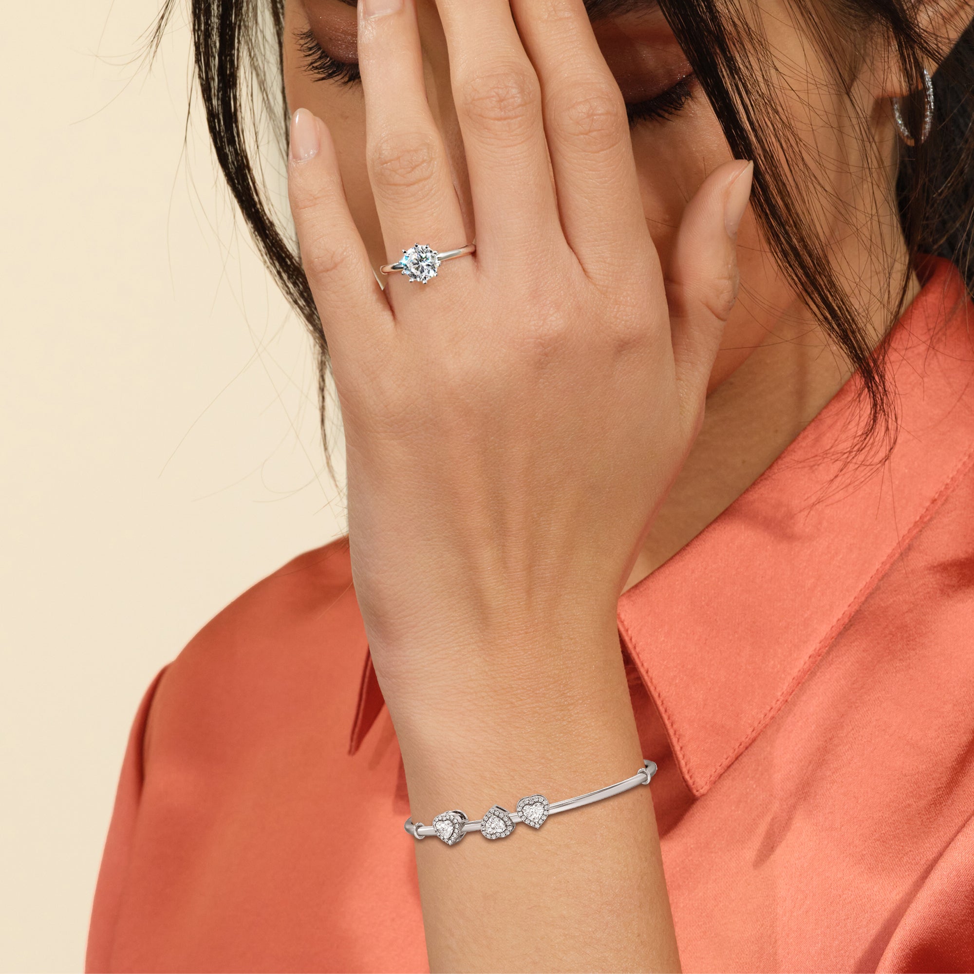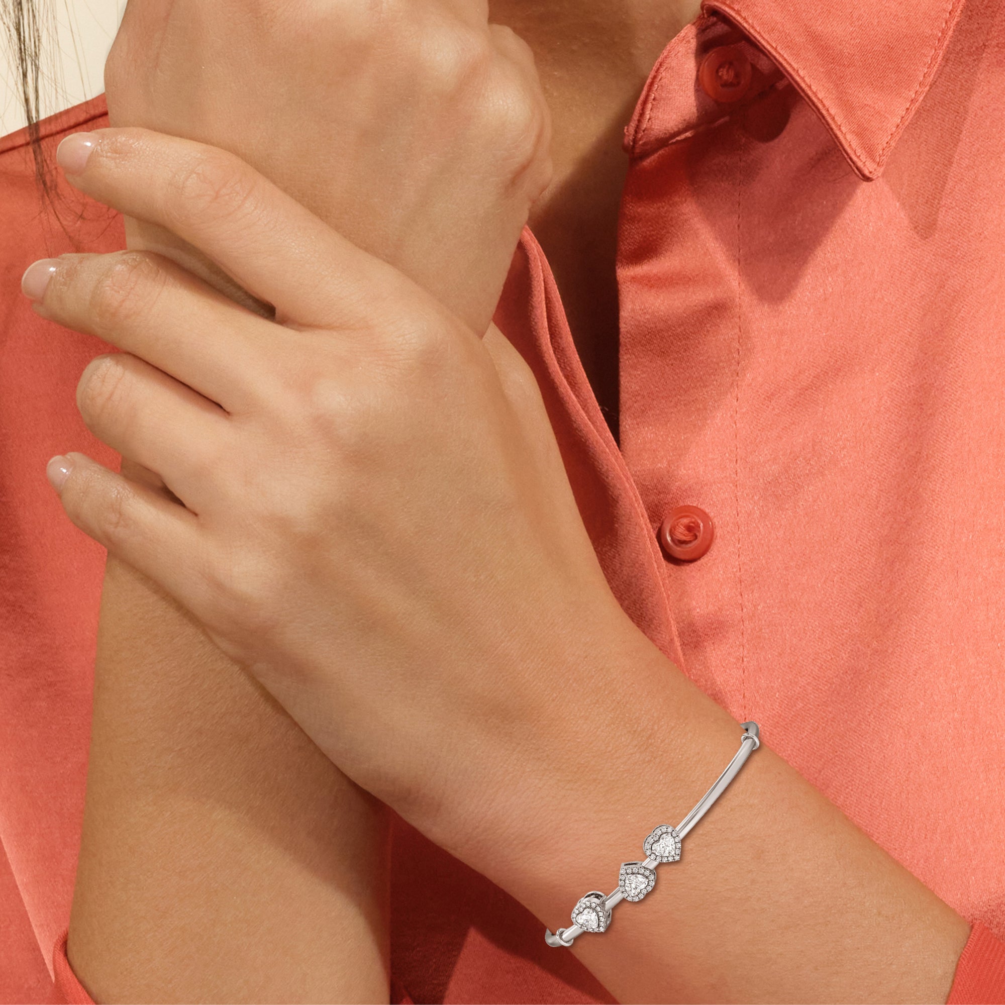 Versatile, stylish, and comfortable to wear, this diamond bangle bracelet is all you need to take your everyday accessorizing to the next level. The openable bracelet bears three halo heart diamonds, that slide with slightest of movement. Turn to this piece to give your daily wear a luxuriously chic finish.