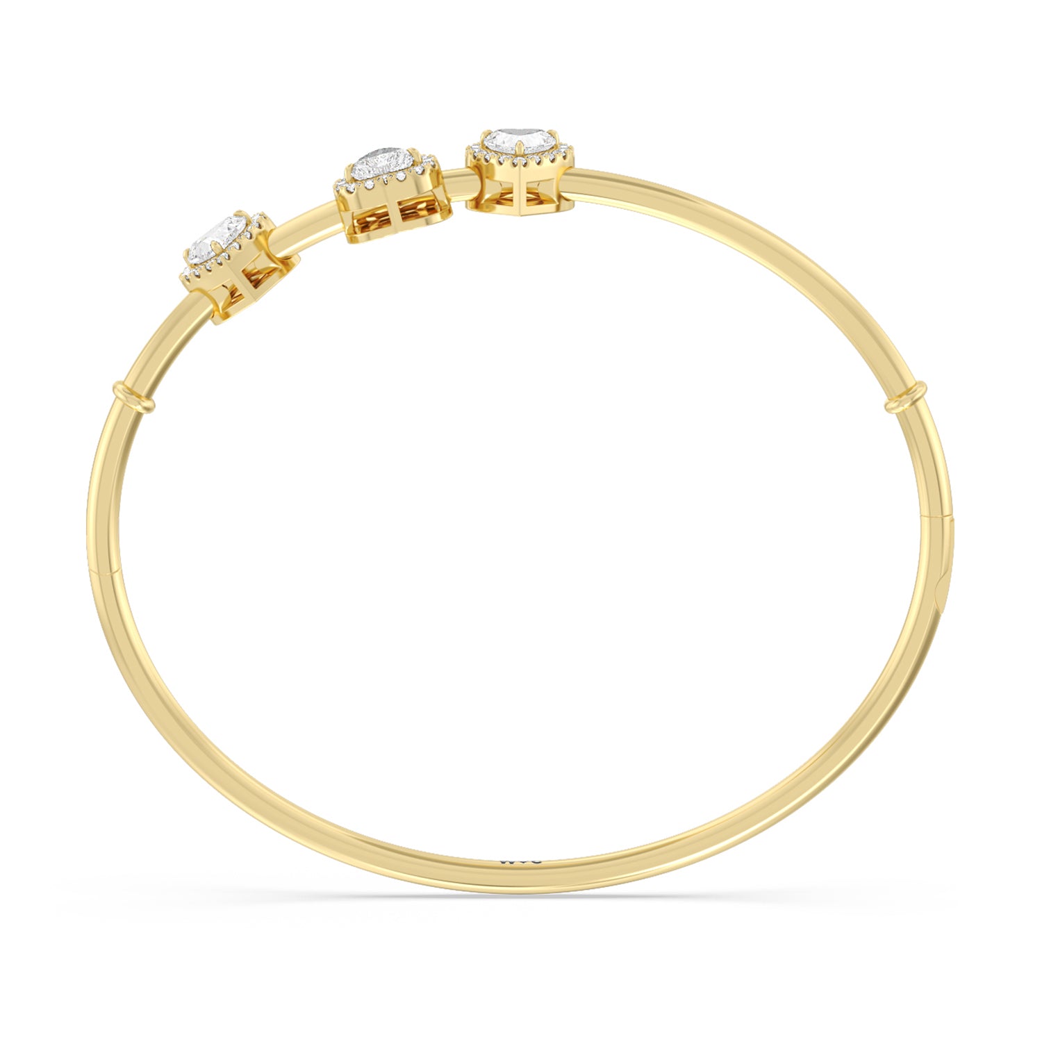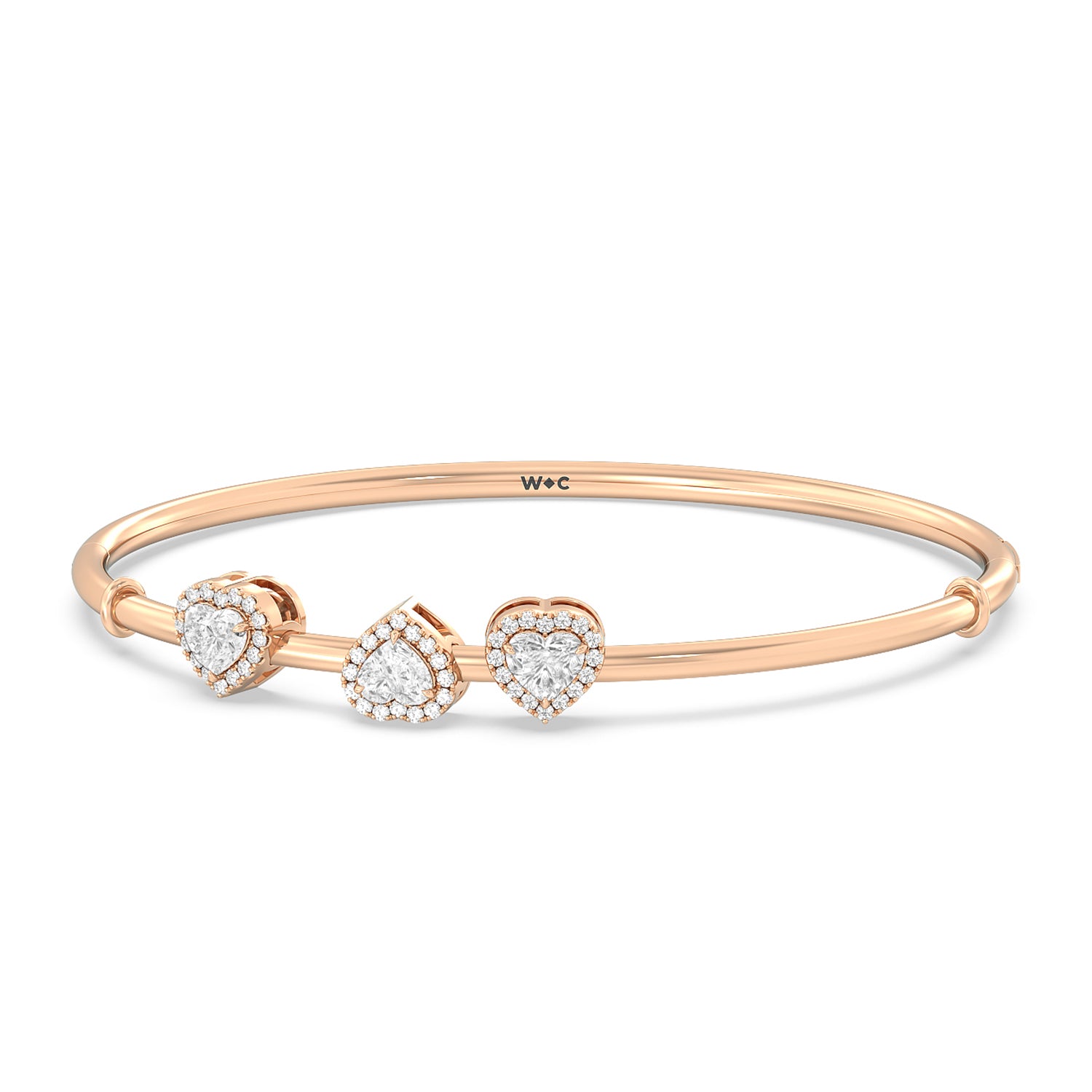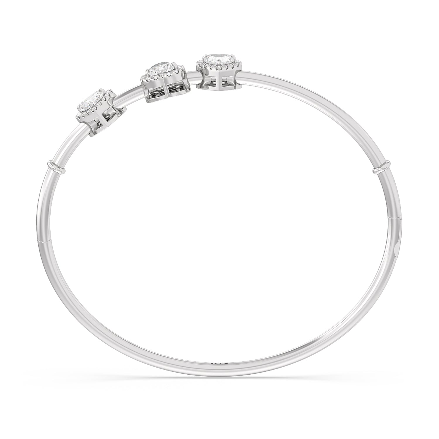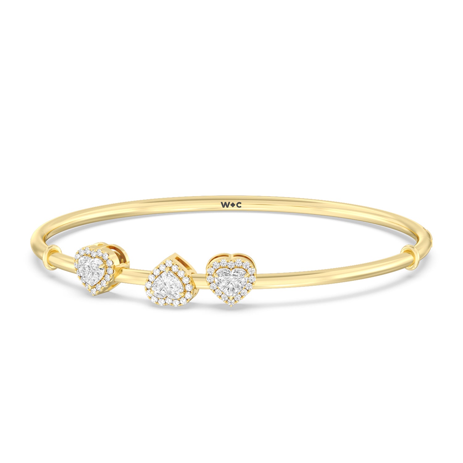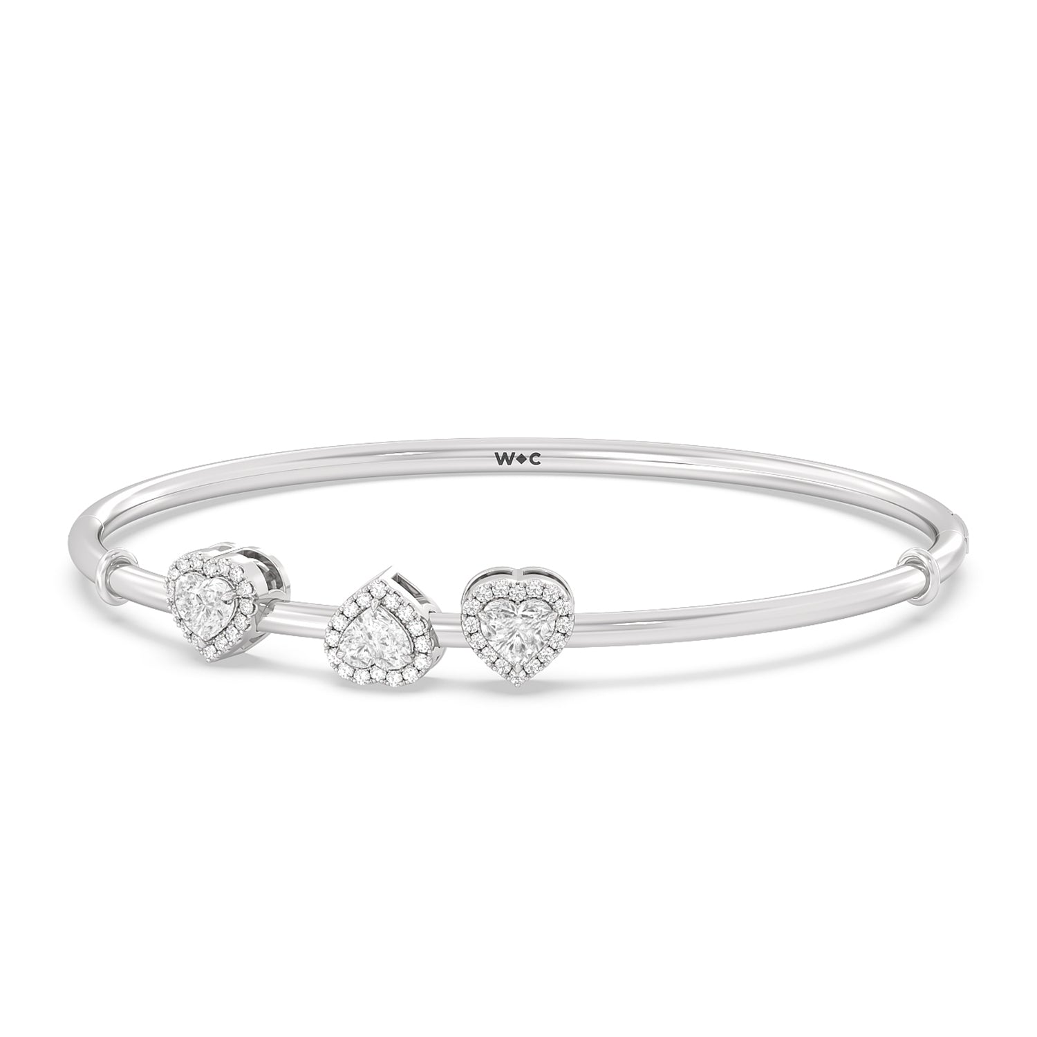 Versatile, stylish, and comfortable to wear, this diamond bangle bracelet is all you need to take your everyday accessorizing to the next level. The openable bracelet bears three halo heart diamonds, that slide with slightest of movement. Turn to this piece to give your daily wear a luxuriously chic finish.