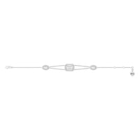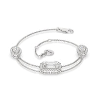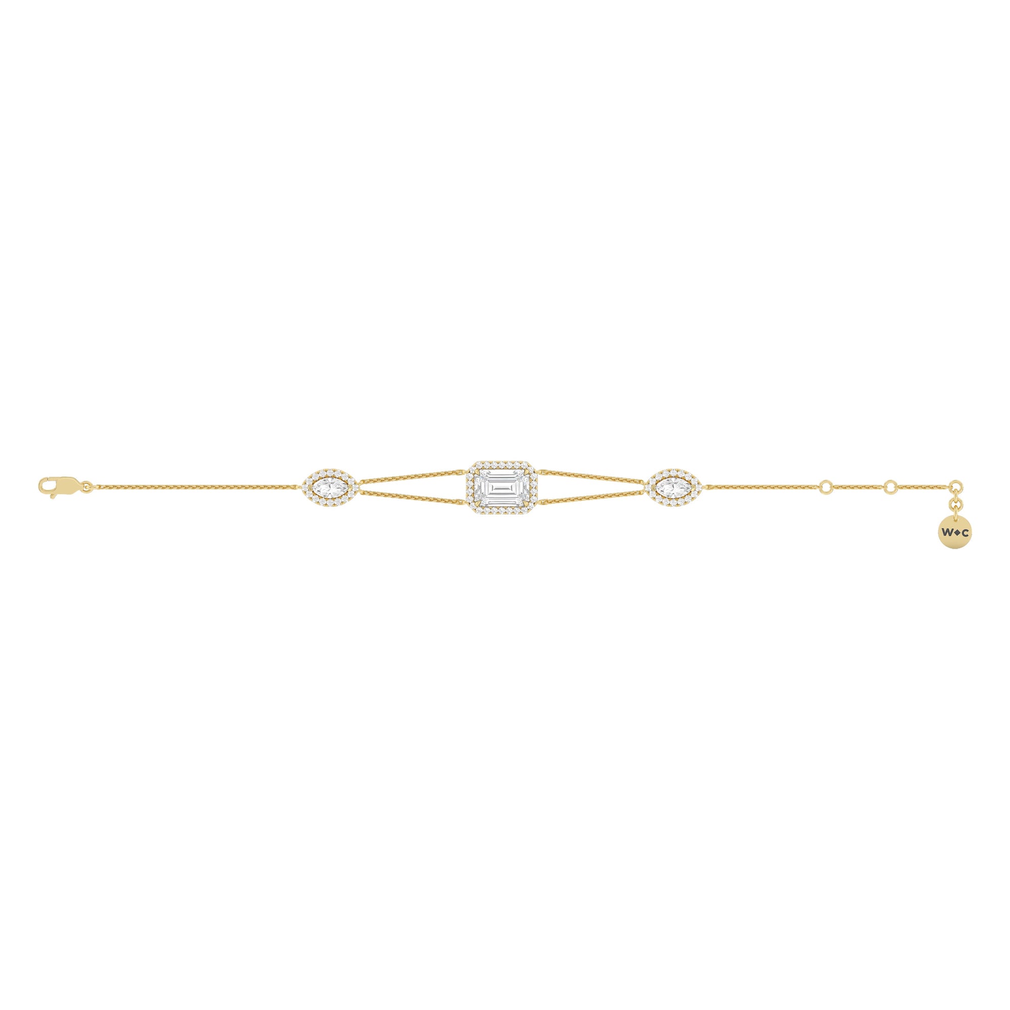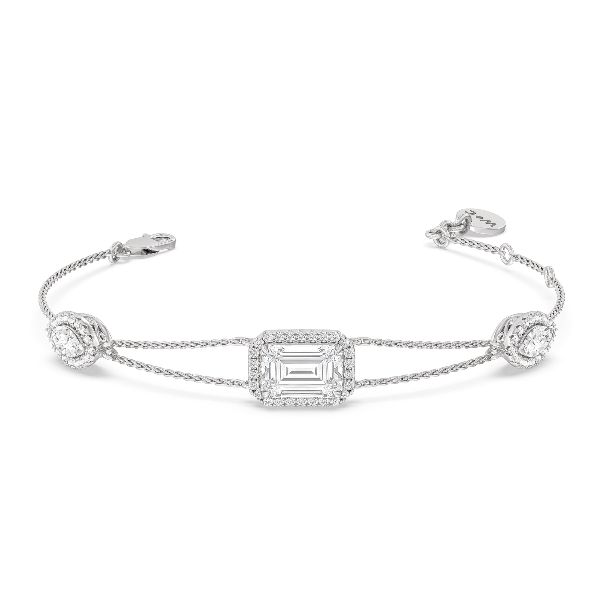 Here is a chic wrist companion to bring with you on days when you're feeling extra fancy. This diamond bracelet features an adjustable bracelet chain set with three diamonds, each mounted on a halo setting. It dazzles with its delicate brilliance and sophisticated versatility.