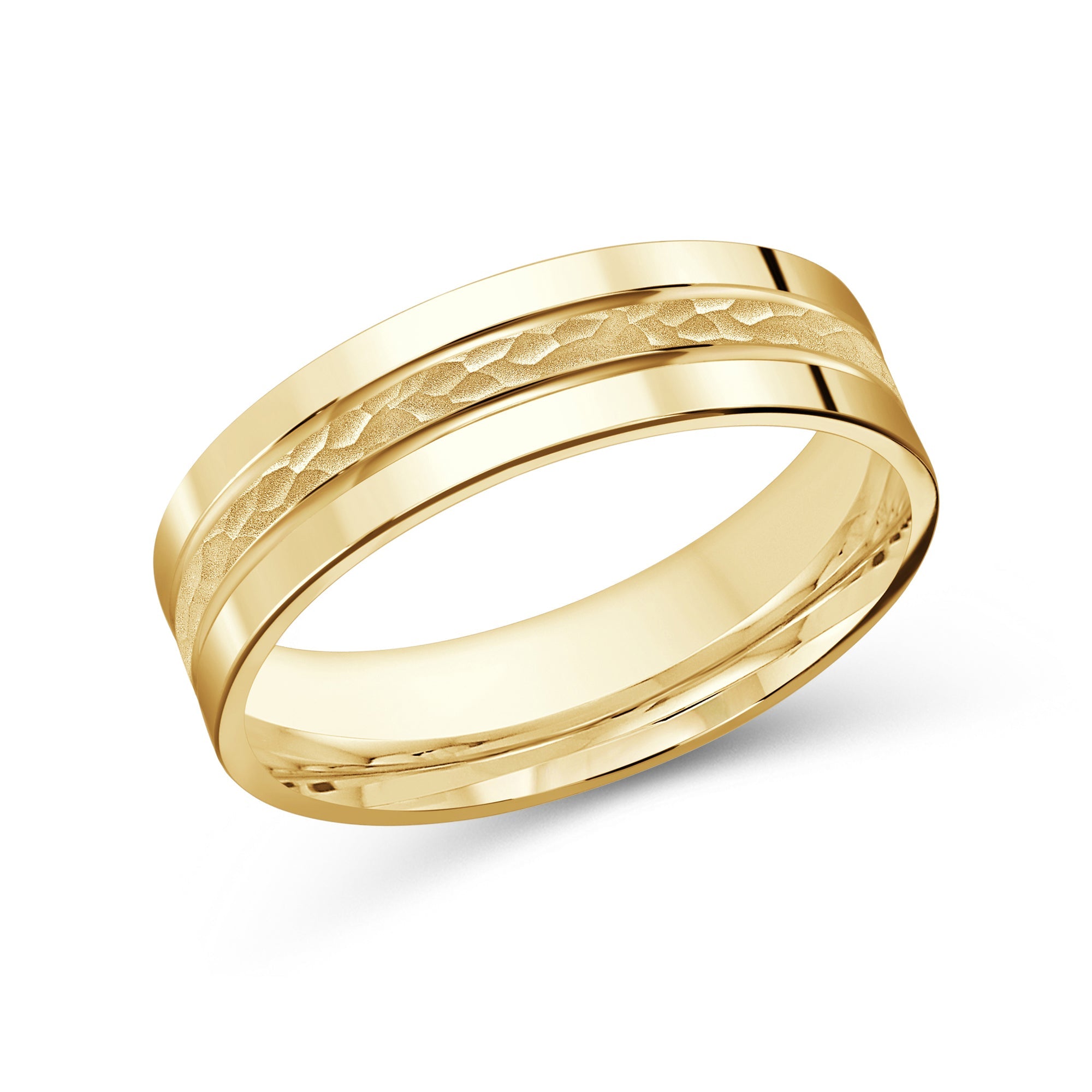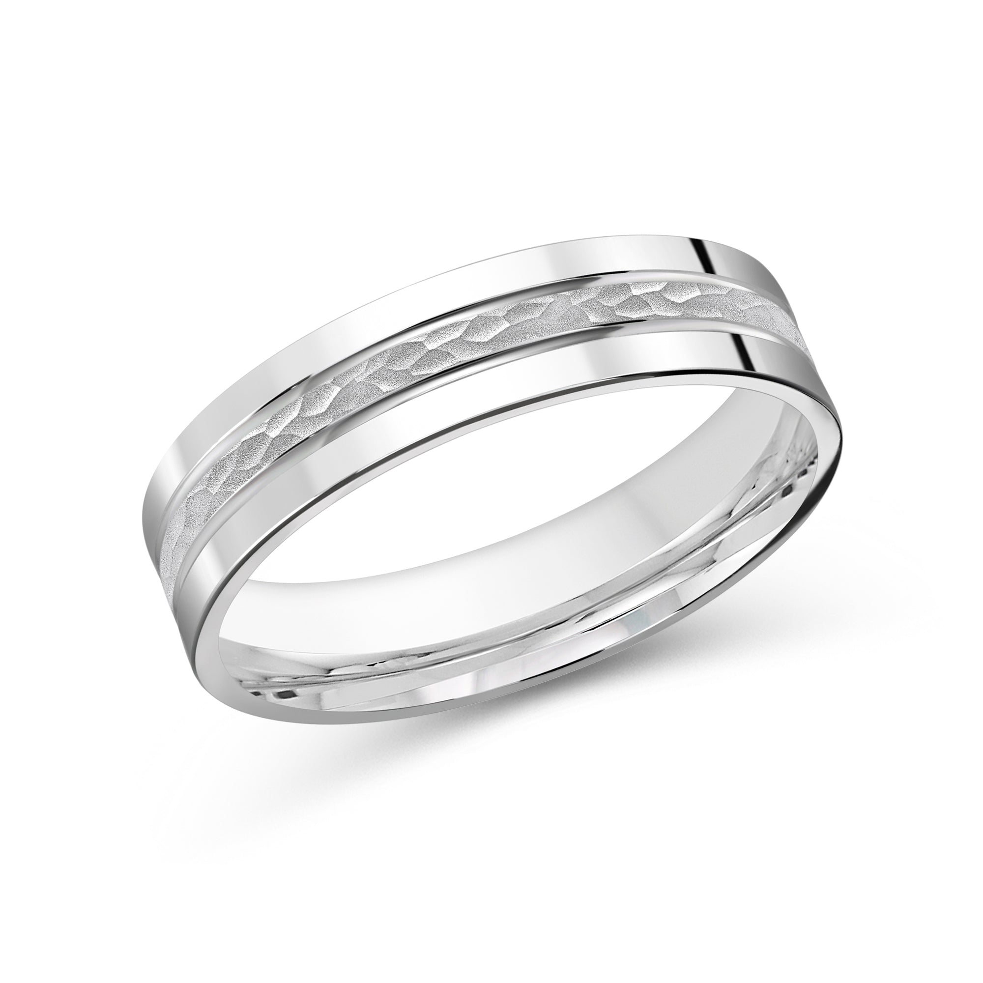 A ruggedly refined men's band to mark one of life's most meaningful moments. The band is designed with a hammered center groove sandwiched by polished edges. The ring's rounded inner wall and comfort-fit profile ensures a snug yet unrestrictive fit.