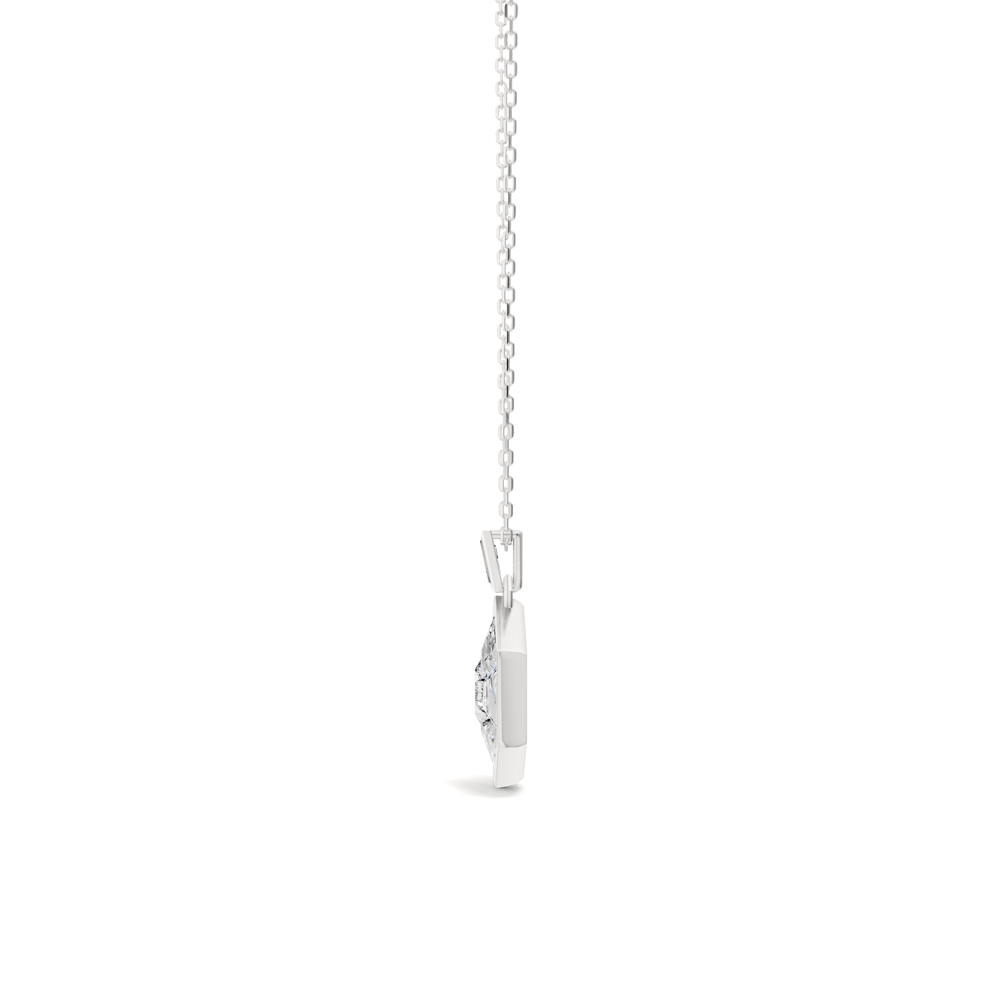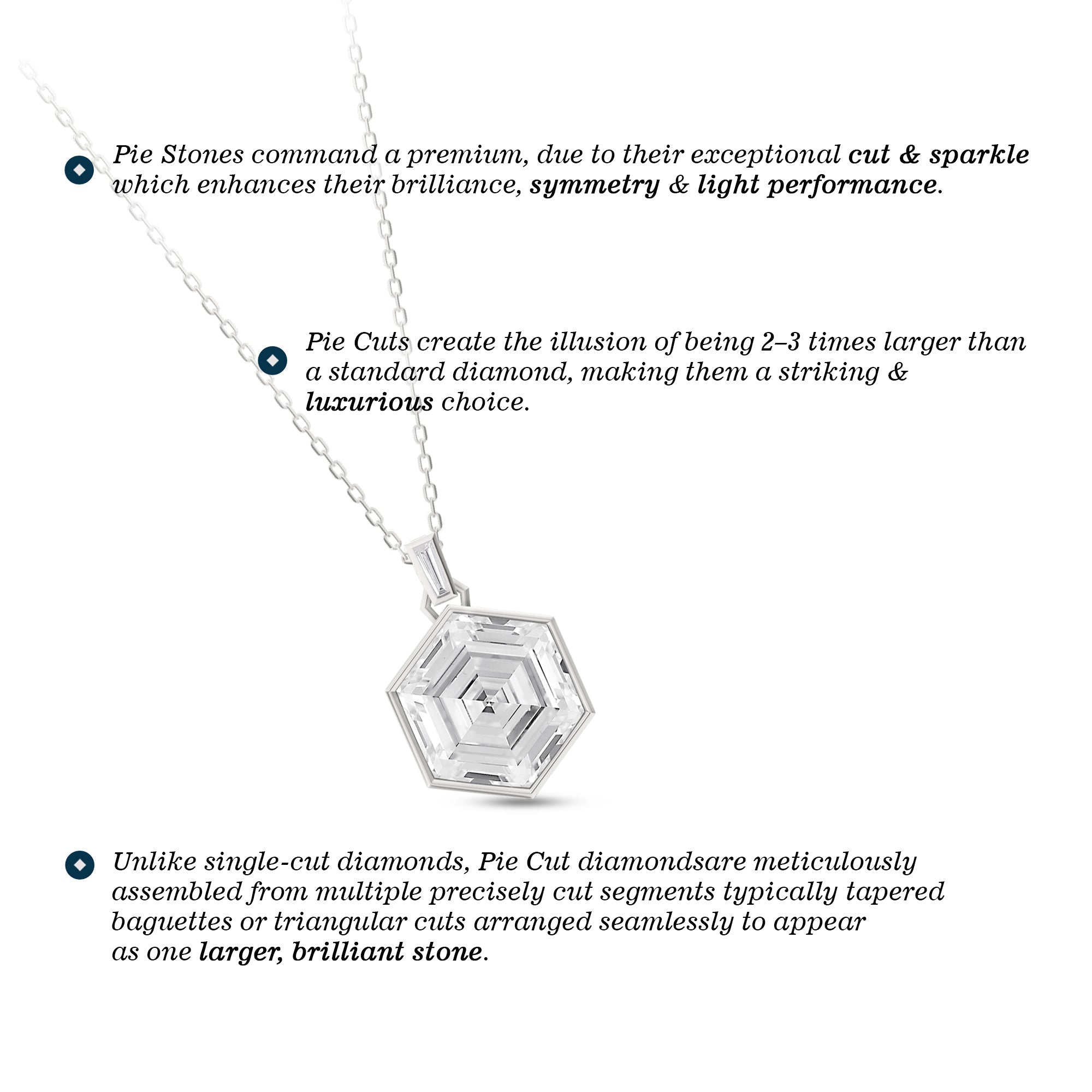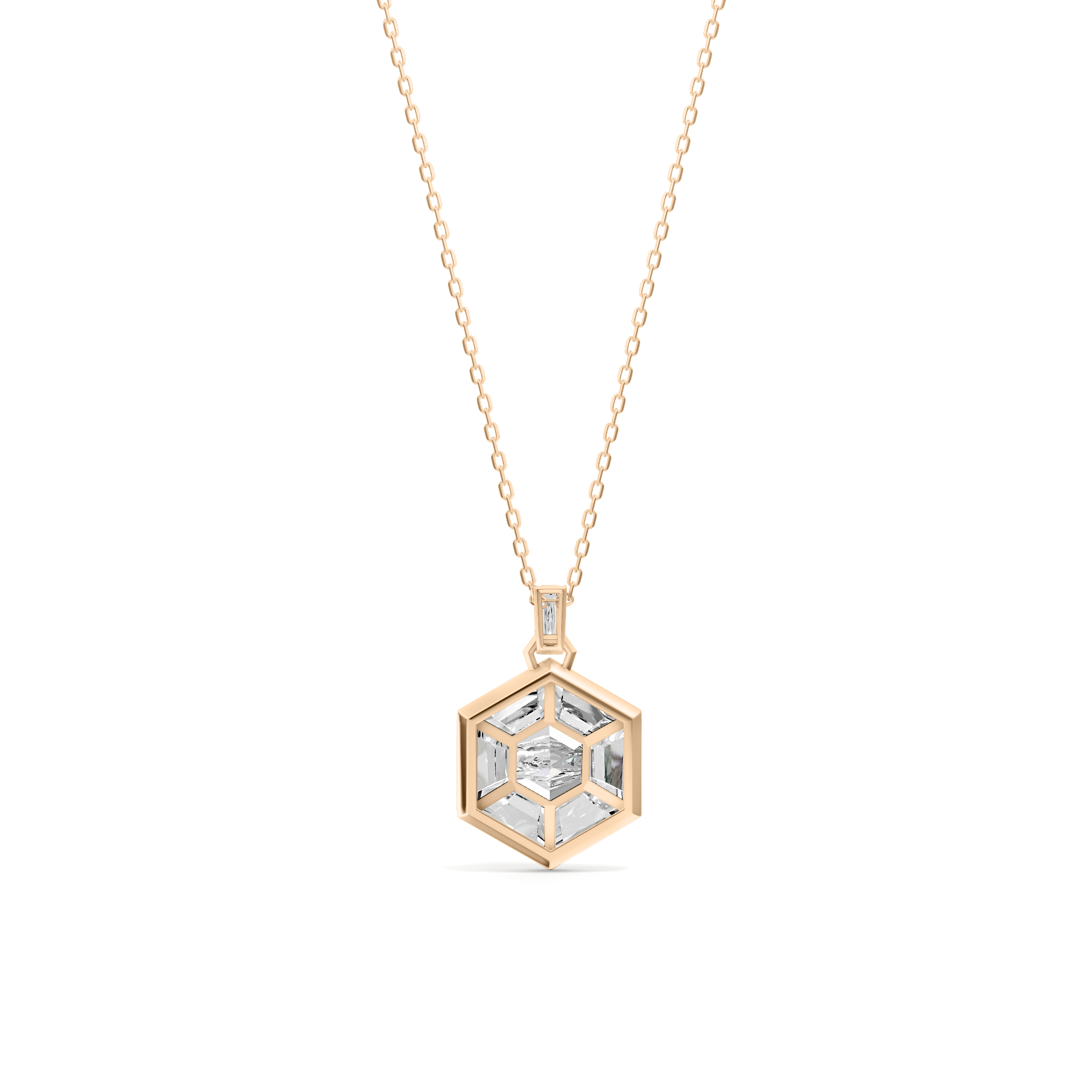 A necklace that evokes a sense of structure while maintaining a sleek, modern aesthetic. This piece features a six-sided pendant composed of hexagonal and trapezoid diamonds arranged without visible gaps, creating the illusion of a seamless, larger stone.