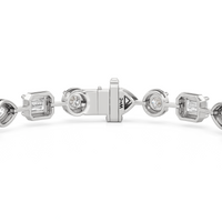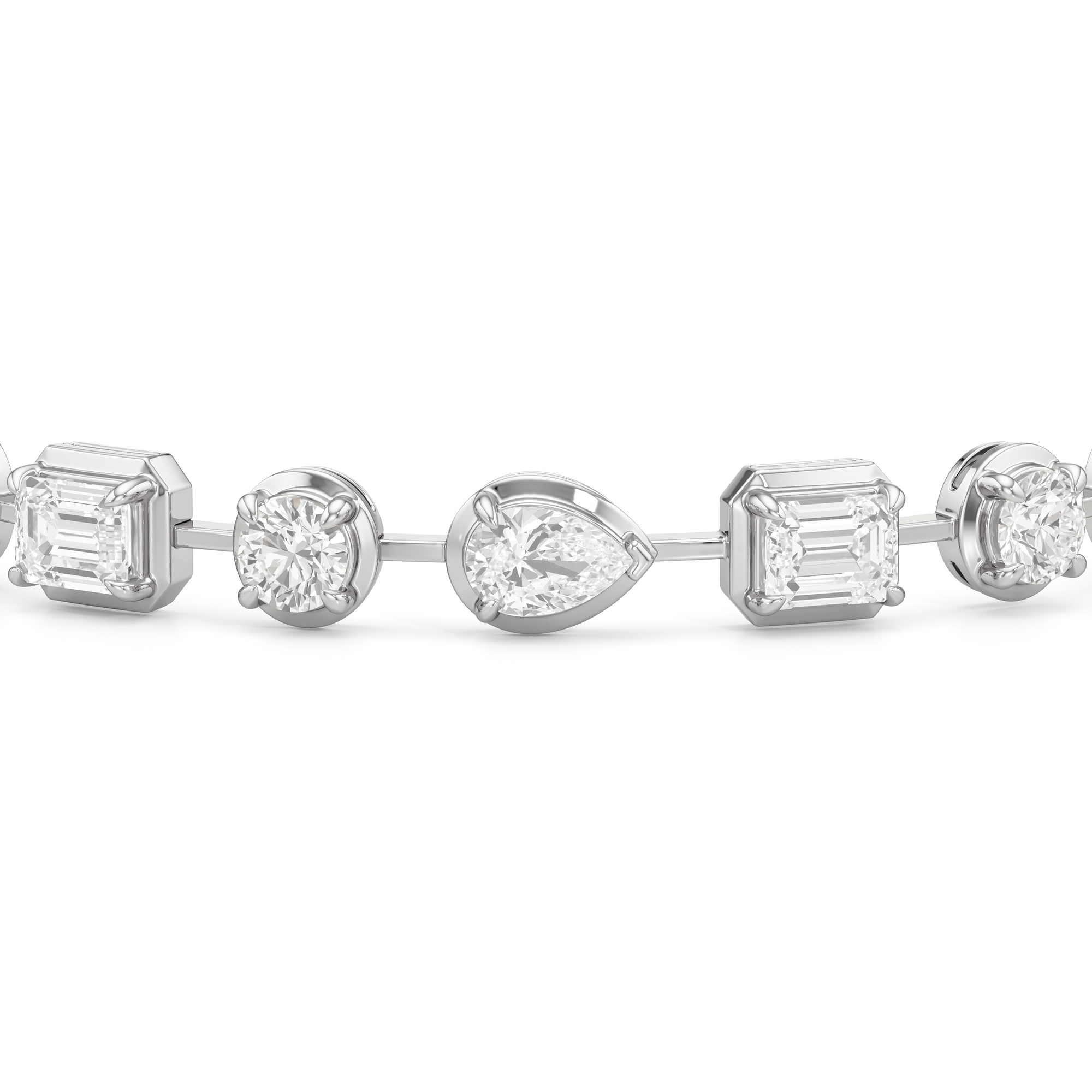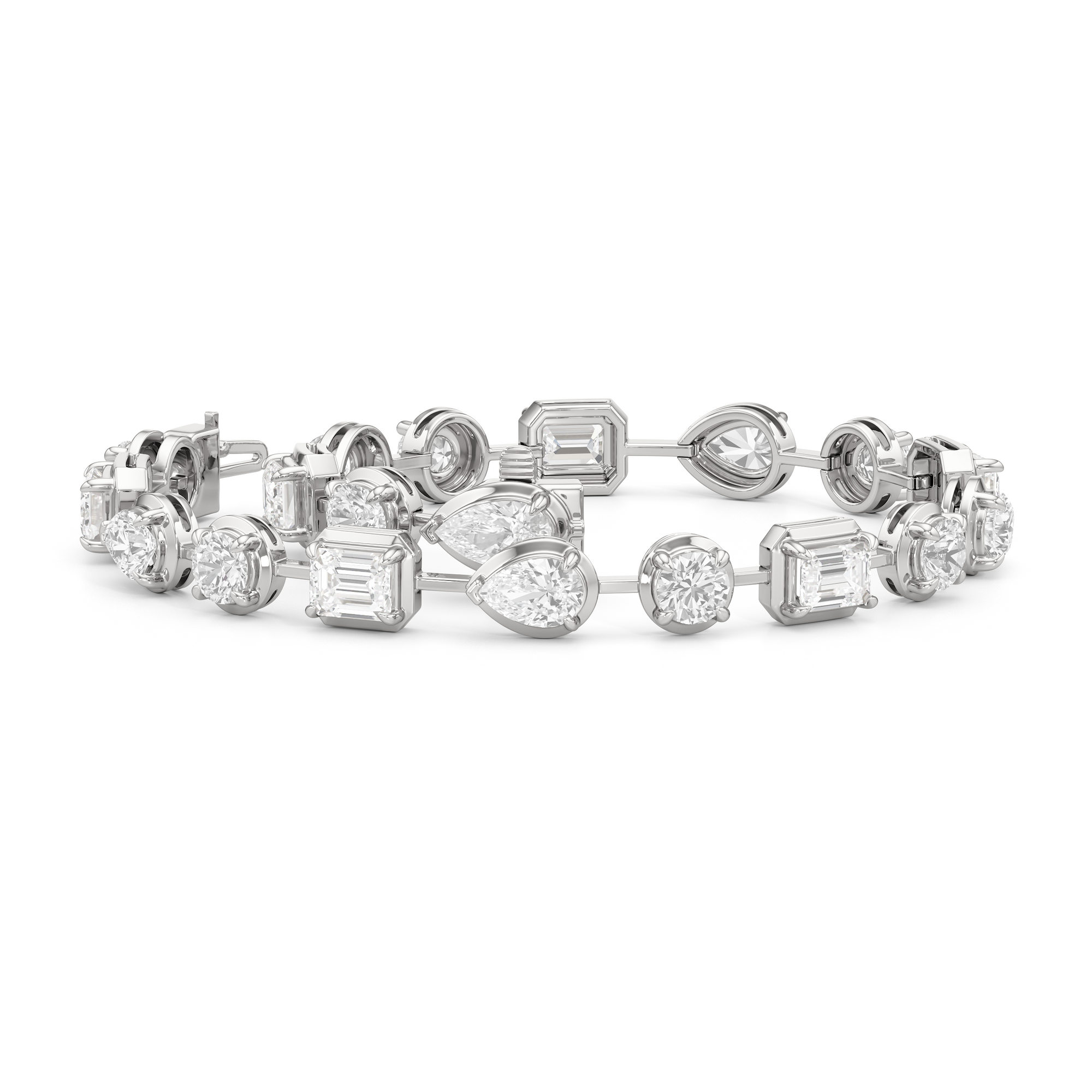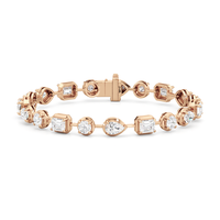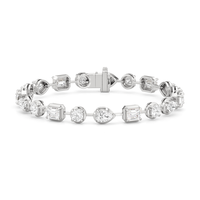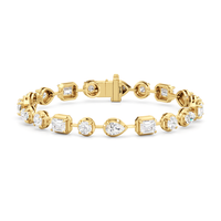 A bolder choice for special occasions, this geometric pattern of emerald-cut, pear-cut, and round diamonds has given the classic tennis bracelet a decidedly modern appeal. Each diamond is meticulously mounted on a sleek pronged bezel that enhances the size of each stone and provides an extra secure setting.