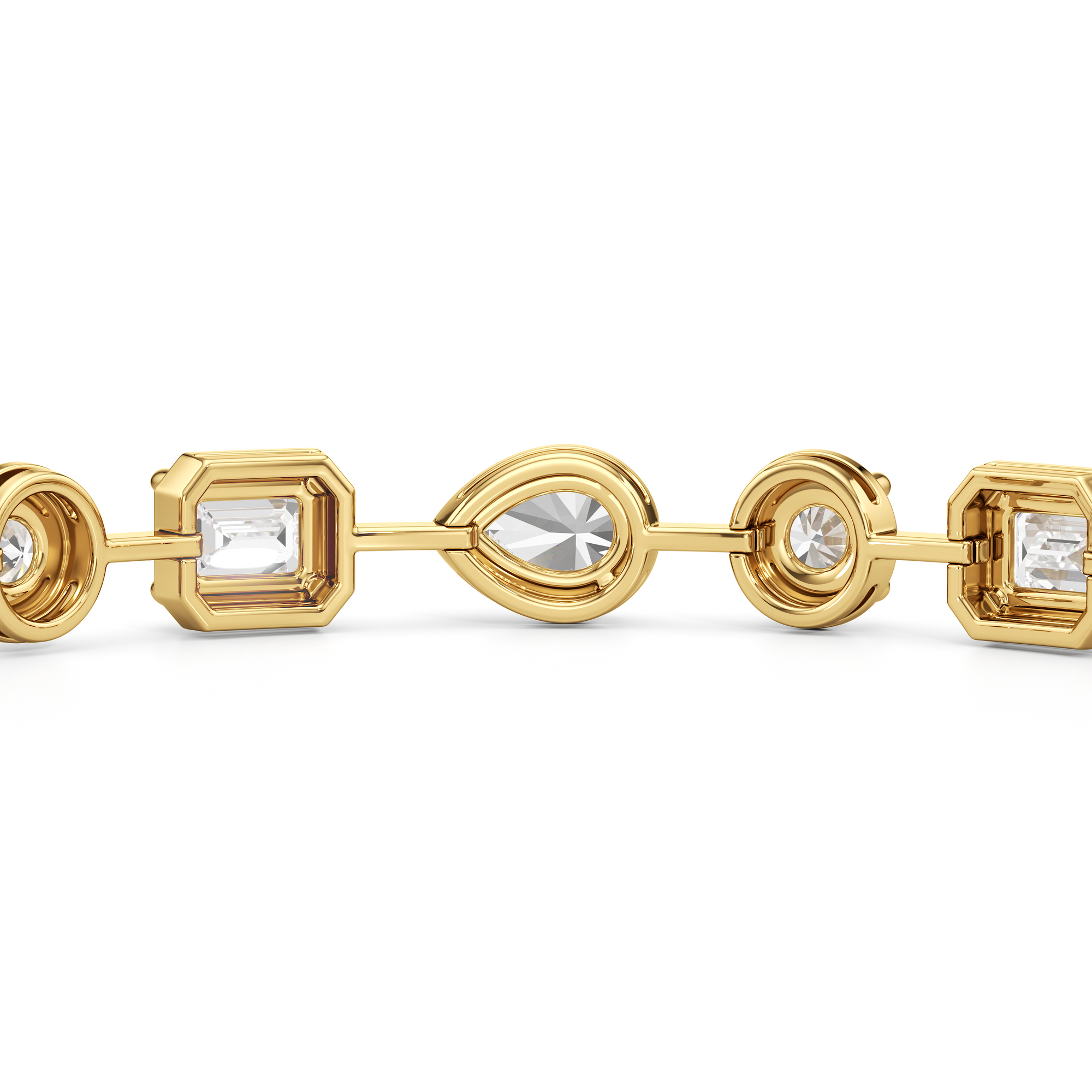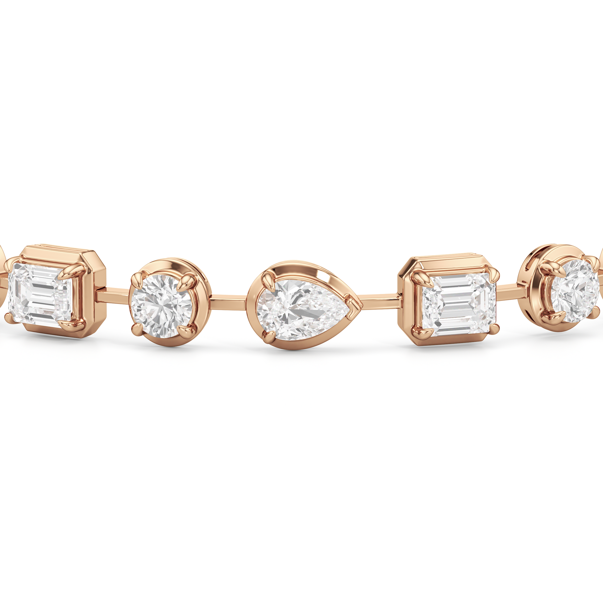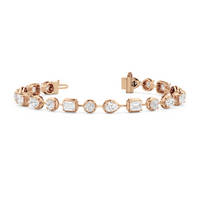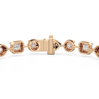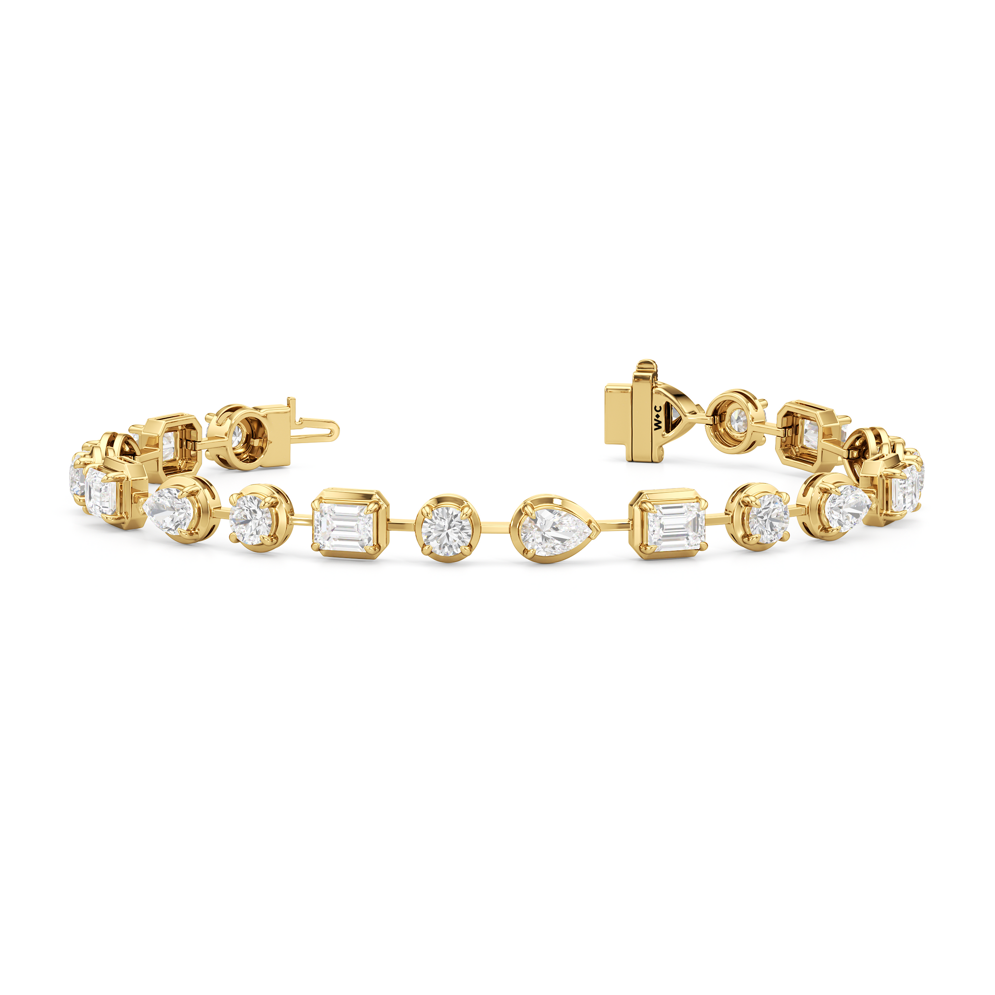 A bolder choice for special occasions, this geometric pattern of emerald-cut, pear-cut, and round diamonds has given the classic tennis bracelet a decidedly modern appeal. Each diamond is meticulously mounted on a sleek pronged bezel that enhances the size of each stone and provides an extra secure setting.