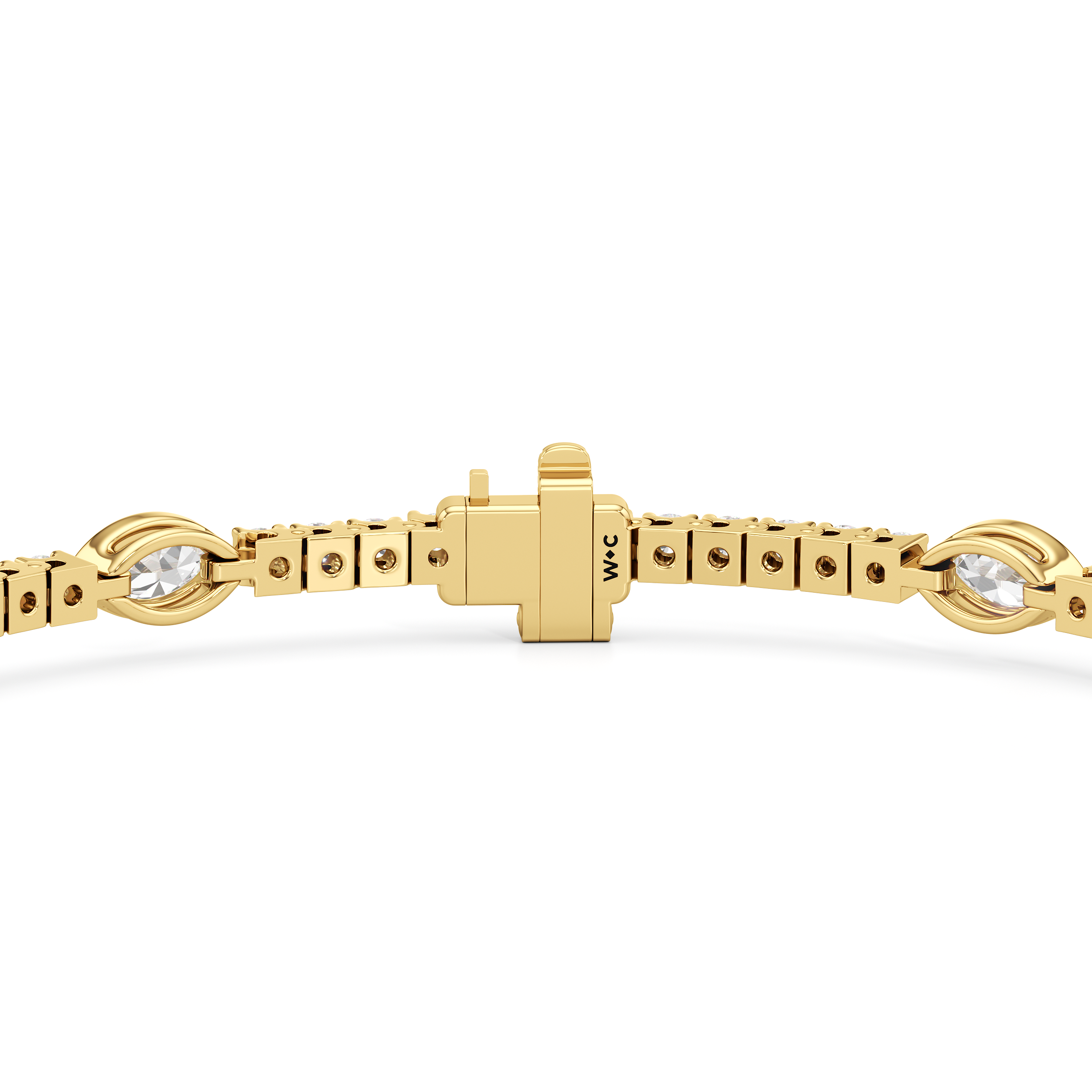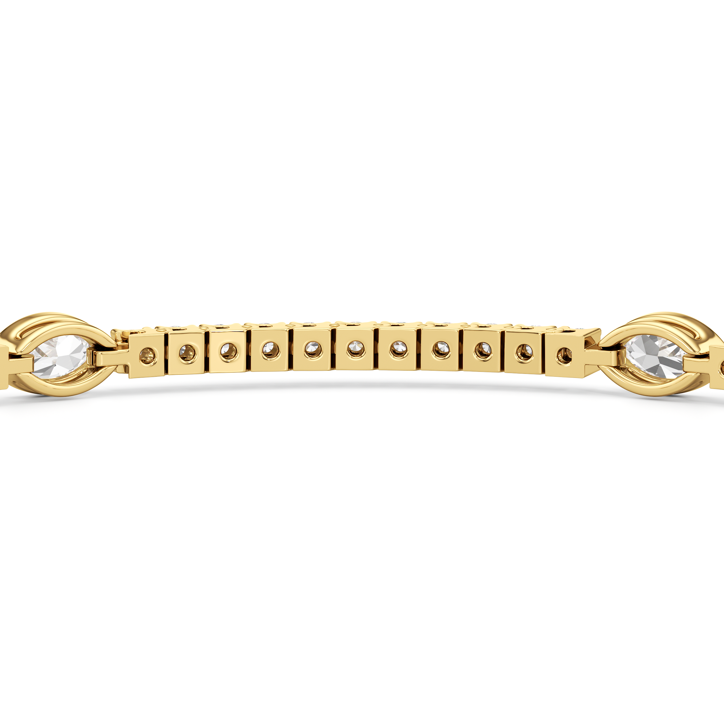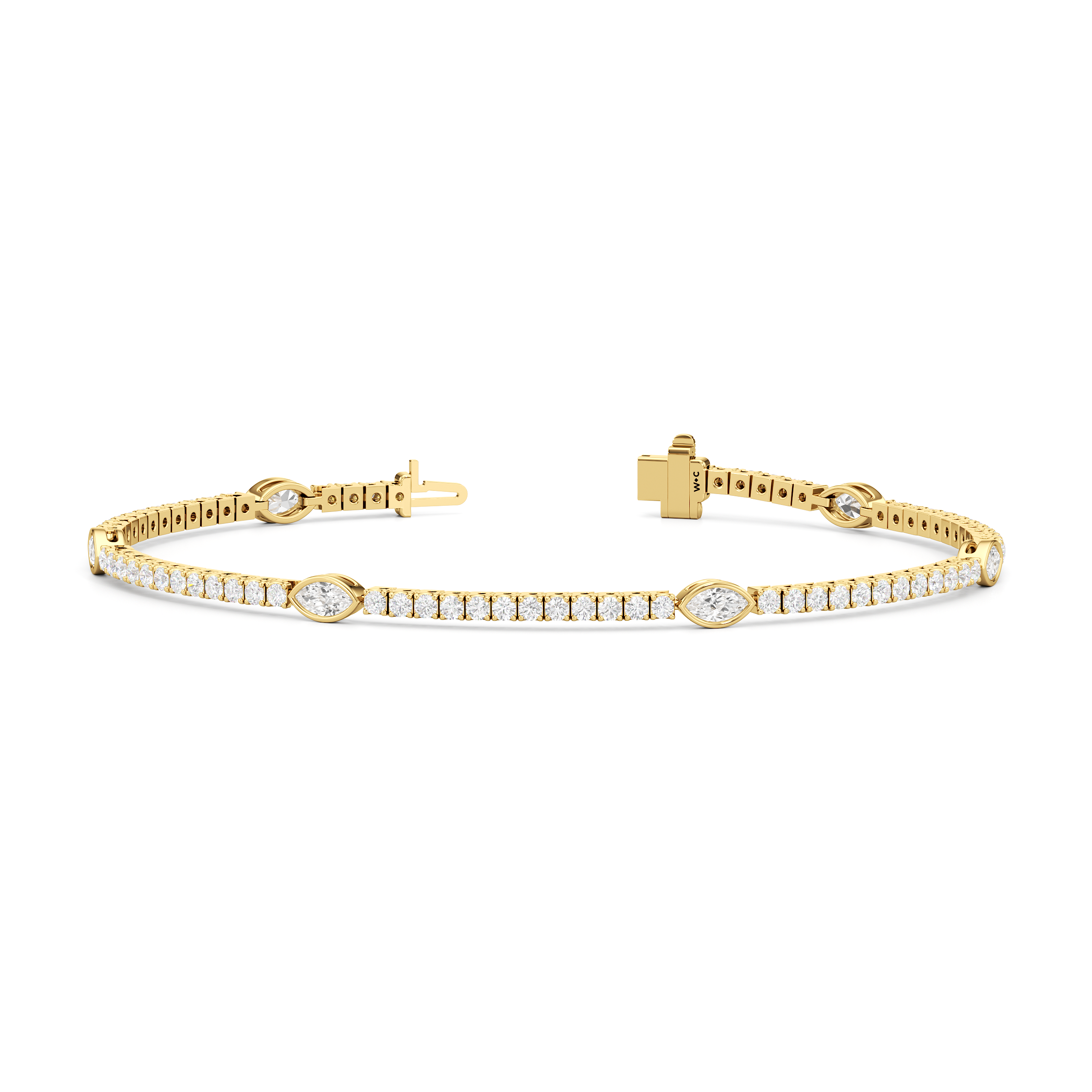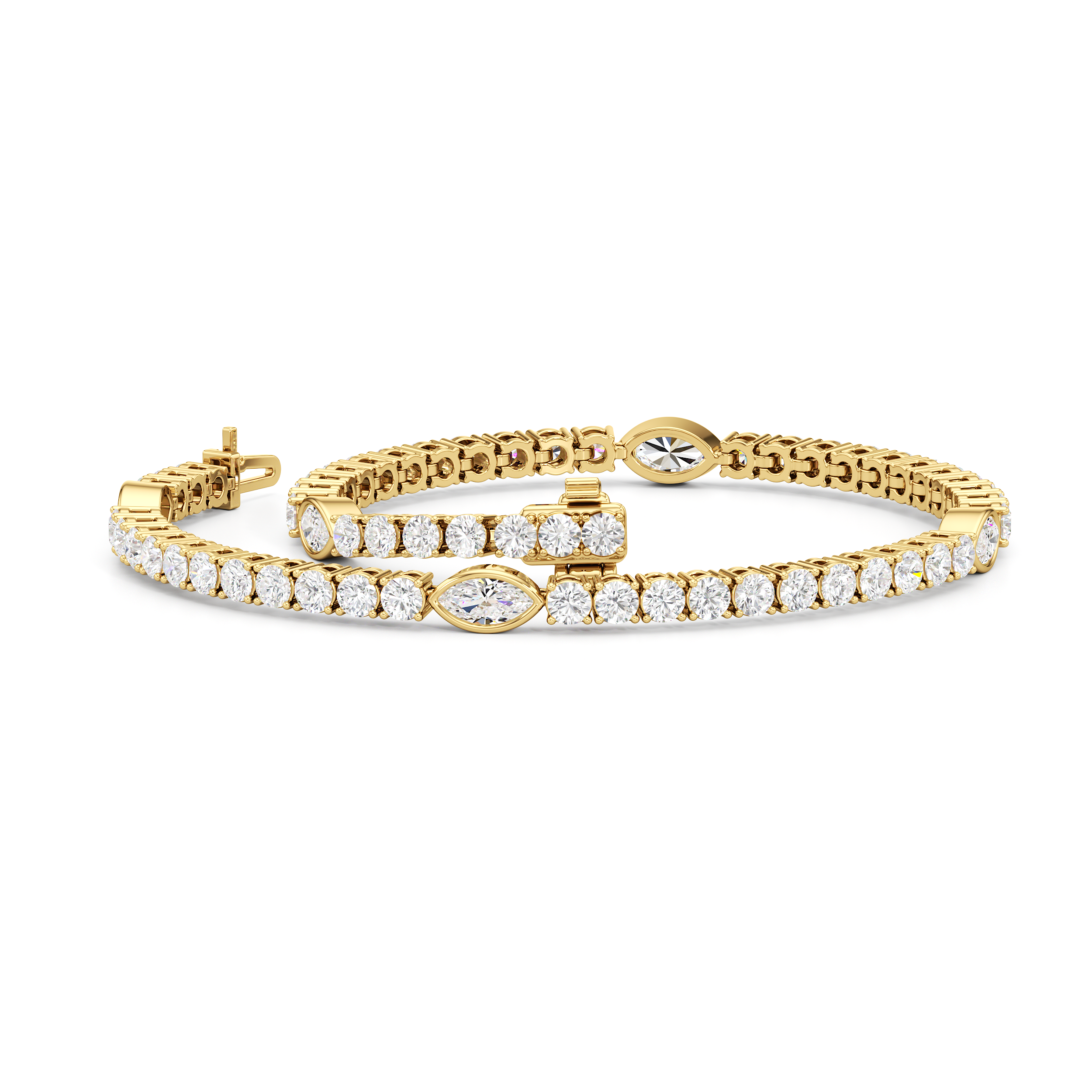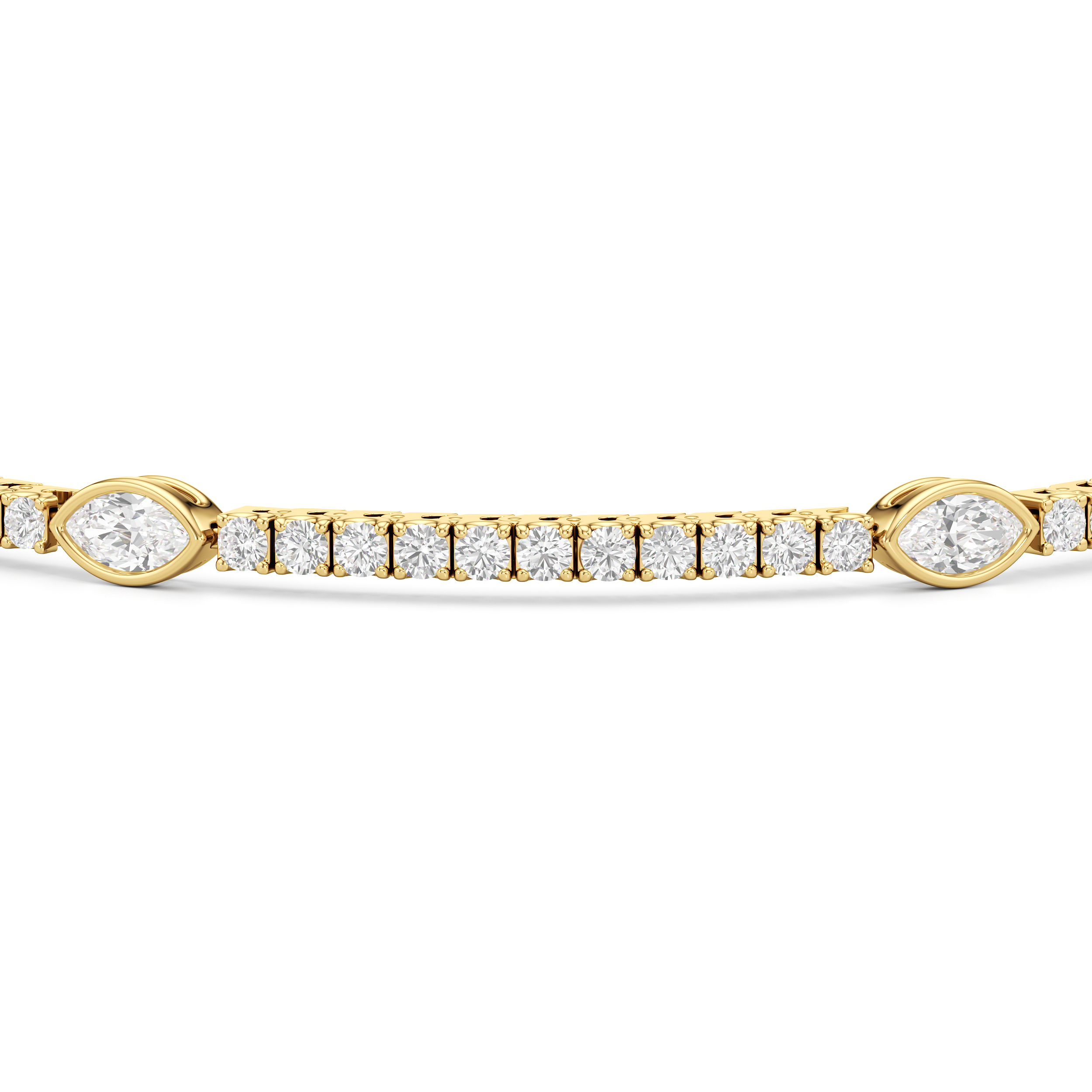 This diamond bracelet's design brings boldness to the classic tennis bracelet. It features marquise-cut diamonds on golden marquise bezels set on evenly-spaced stations along a continuous line of prong-set round diamonds. The elongated elliptical diamonds with pointed ends add a touch of daring sophistication to this piece, while the distinguishable marquise bezels give this bracelet a rebellious edge.