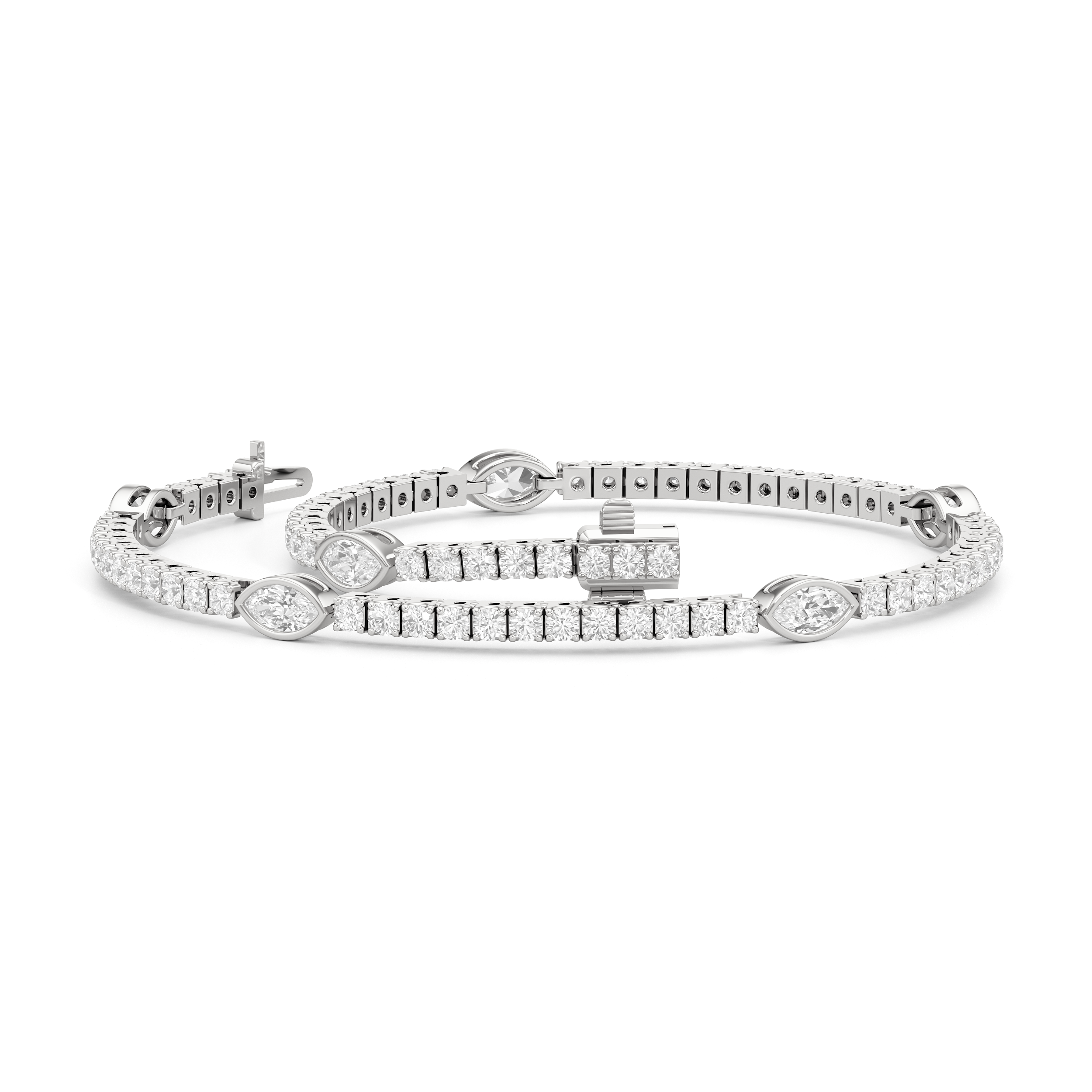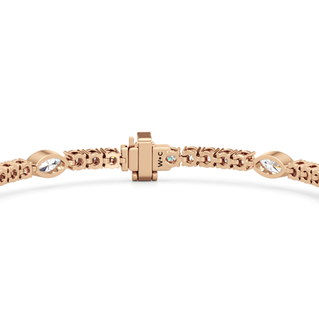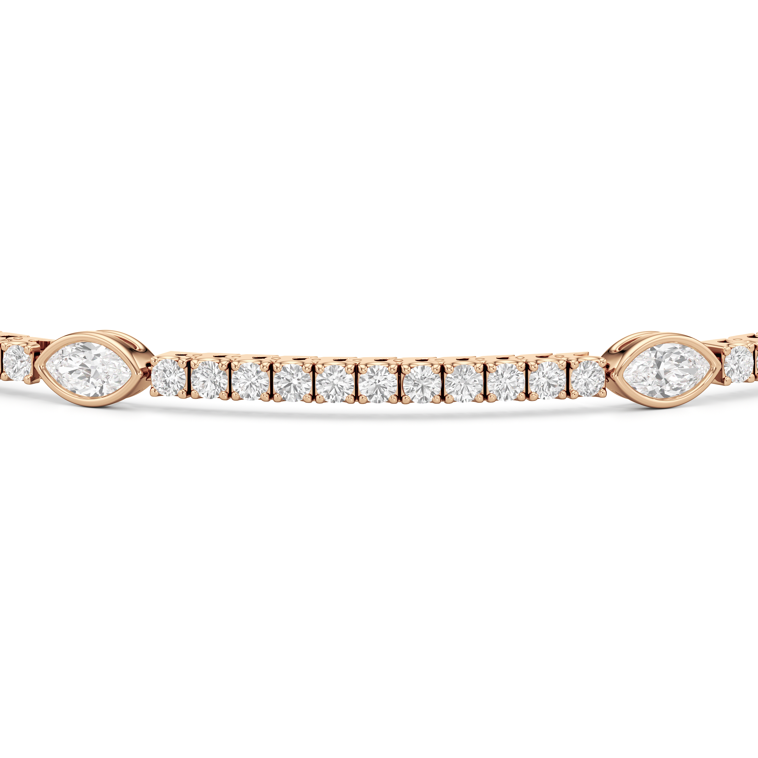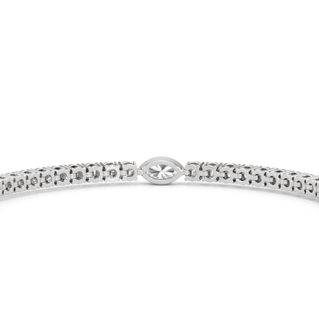This diamond bracelet's design brings boldness to the classic tennis bracelet. It features marquise-cut diamonds on golden marquise bezels set on evenly-spaced stations along a continuous line of prong-set round diamonds. The elongated elliptical diamonds with pointed ends add a touch of daring sophistication to this piece, while the distinguishable marquise bezels give this bracelet a rebellious edge.