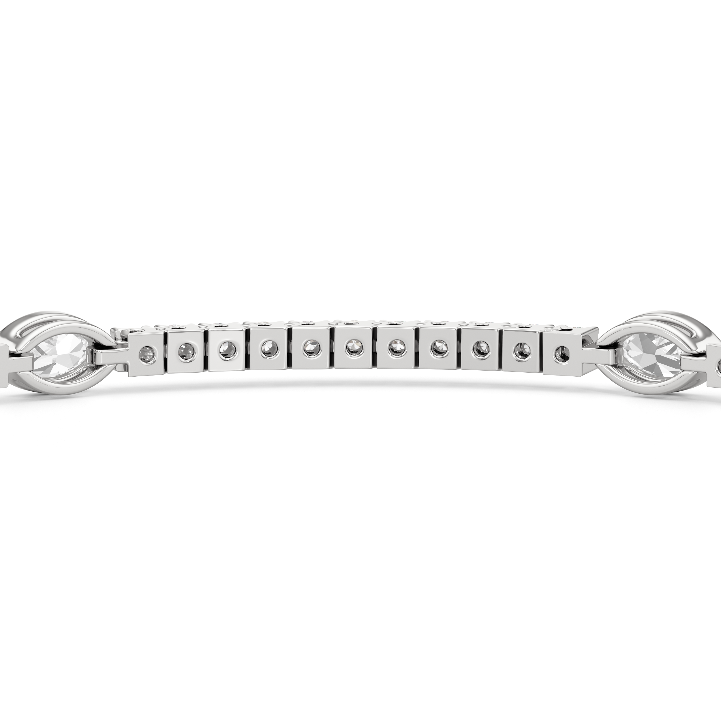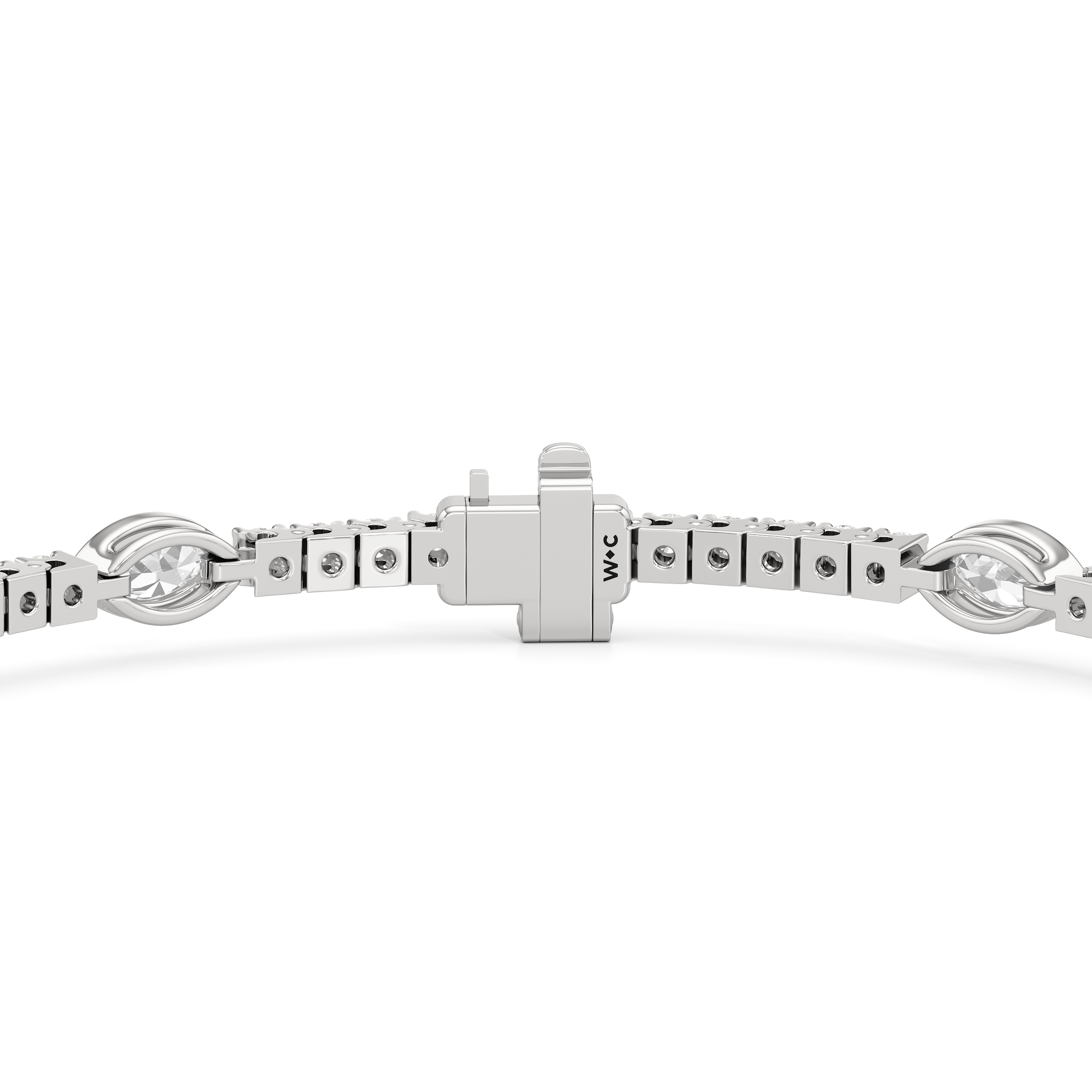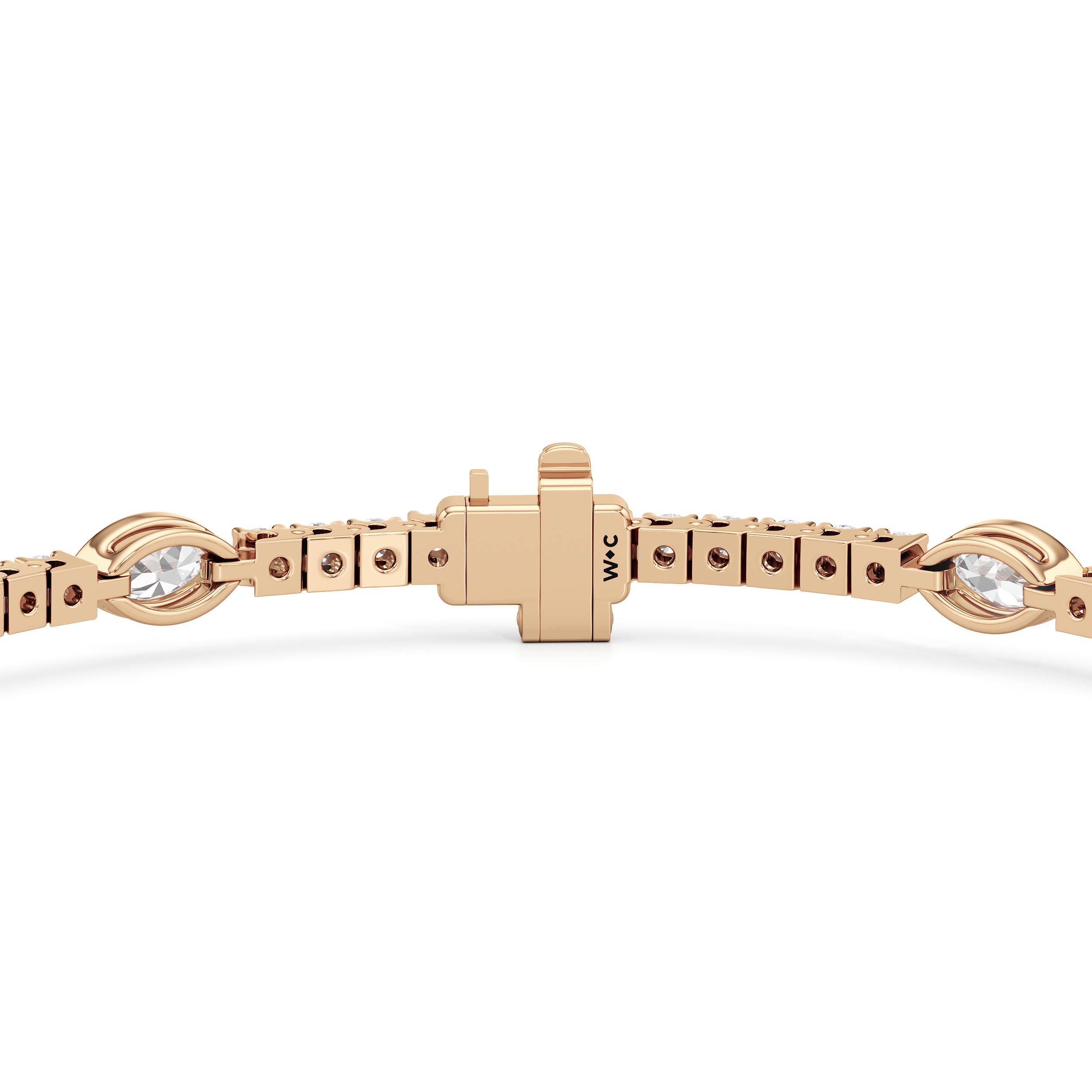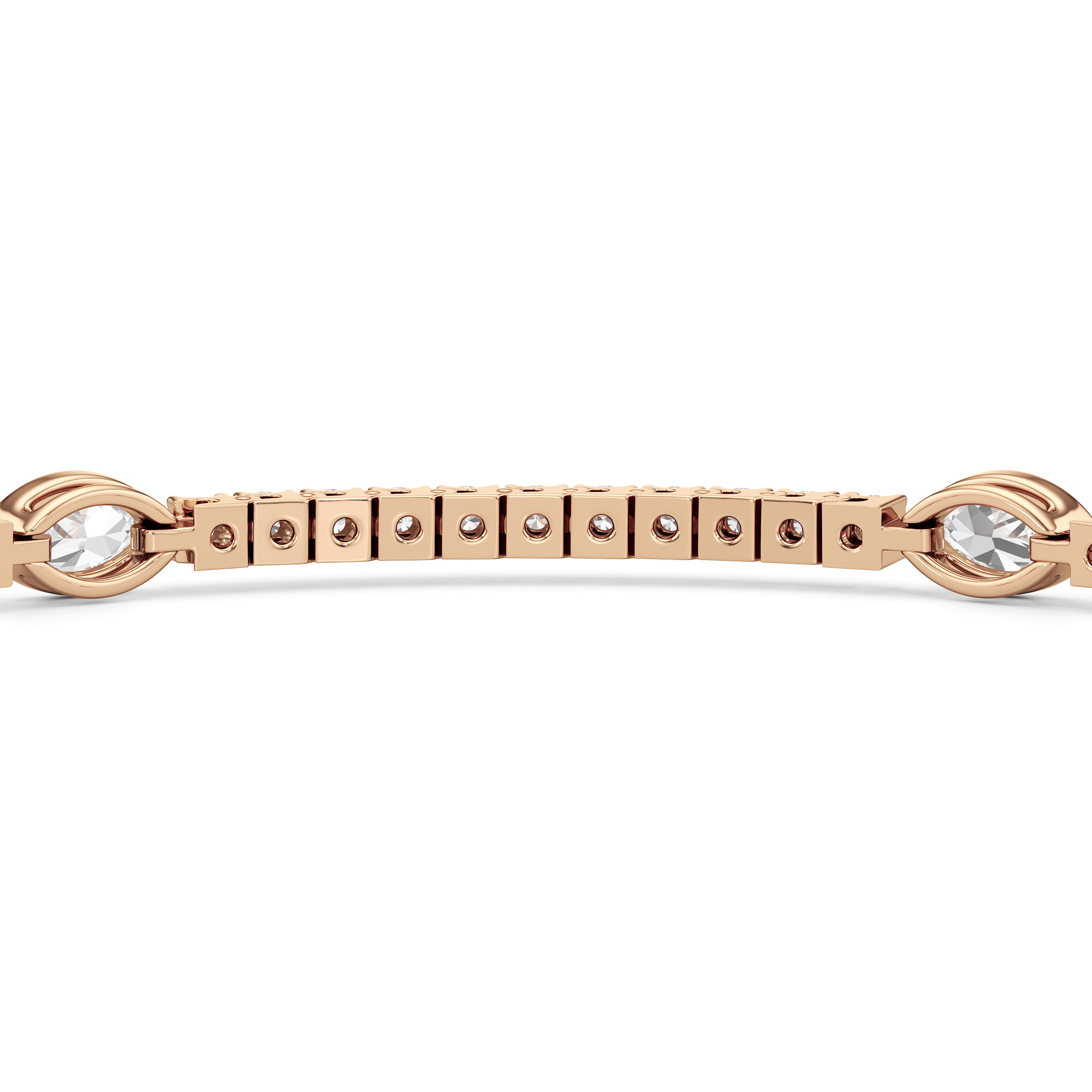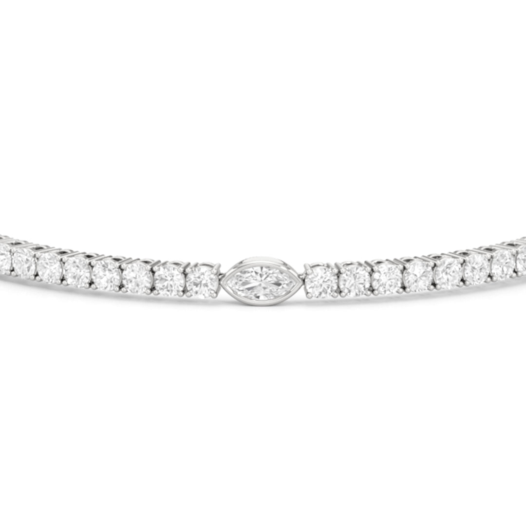 This diamond bracelet's design brings boldness to the classic tennis bracelet. It features marquise-cut diamonds on golden marquise bezels set on evenly-spaced stations along a continuous line of prong-set round diamonds. The elongated elliptical diamonds with pointed ends add a touch of daring sophistication to this piece, while the distinguishable marquise bezels give this bracelet a rebellious edge.