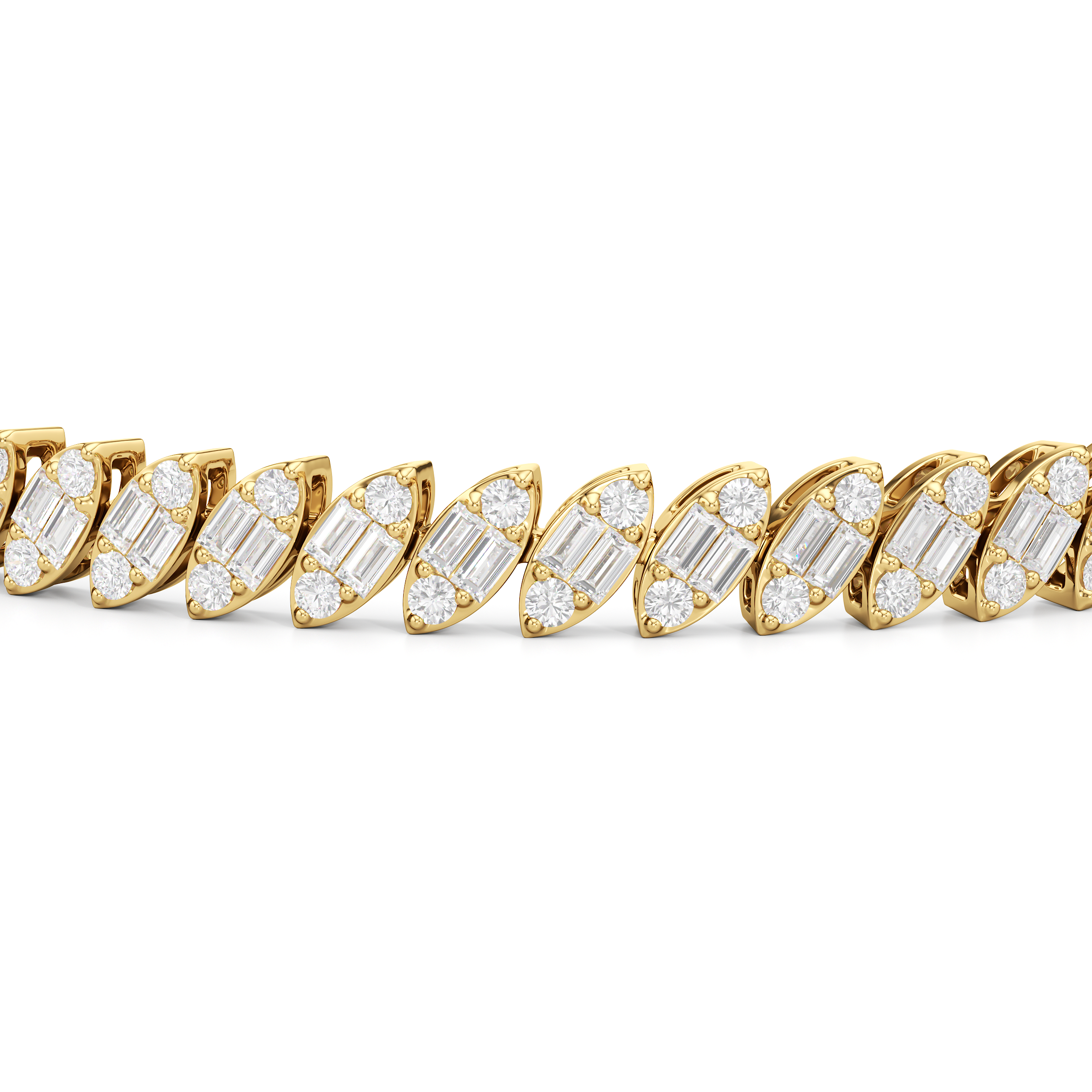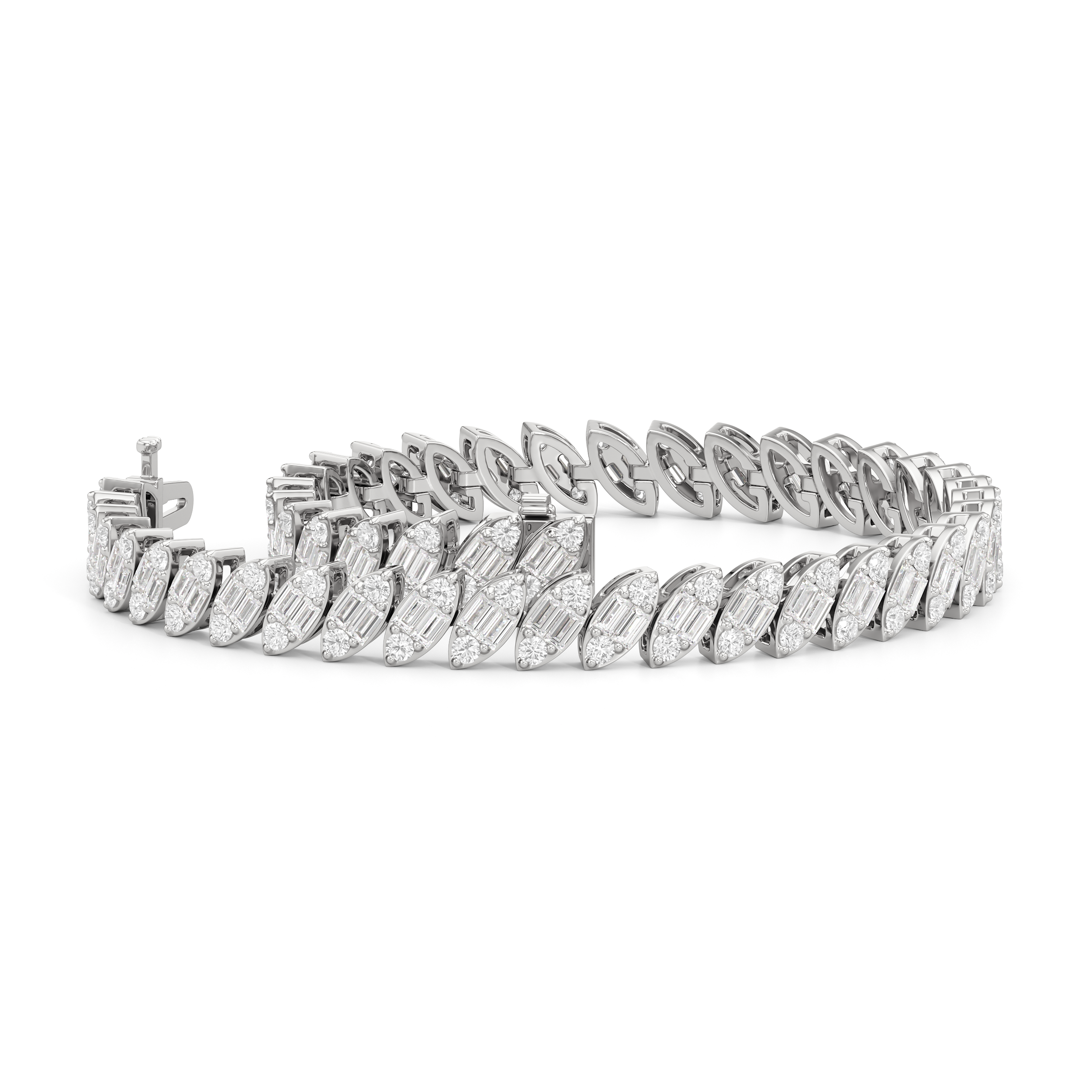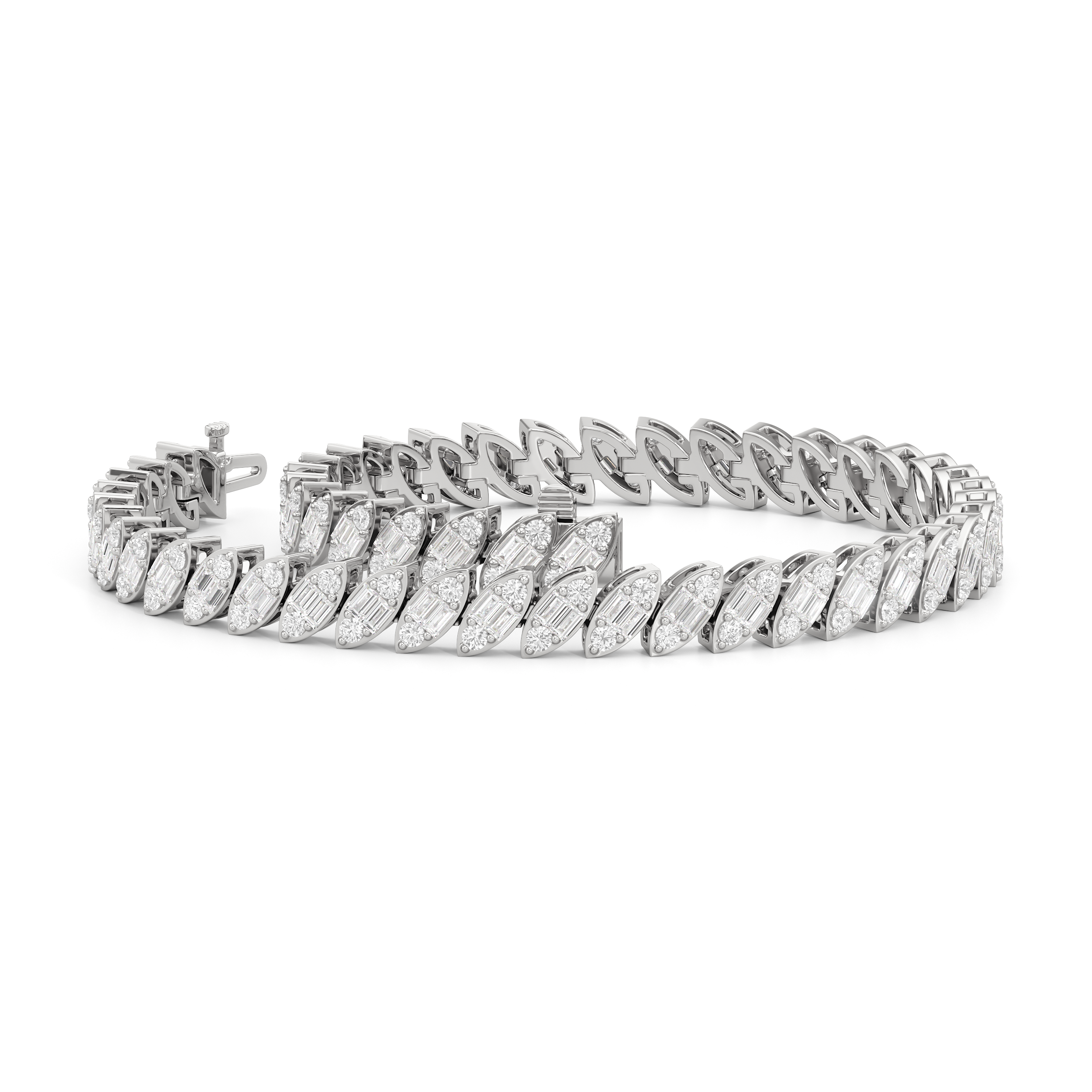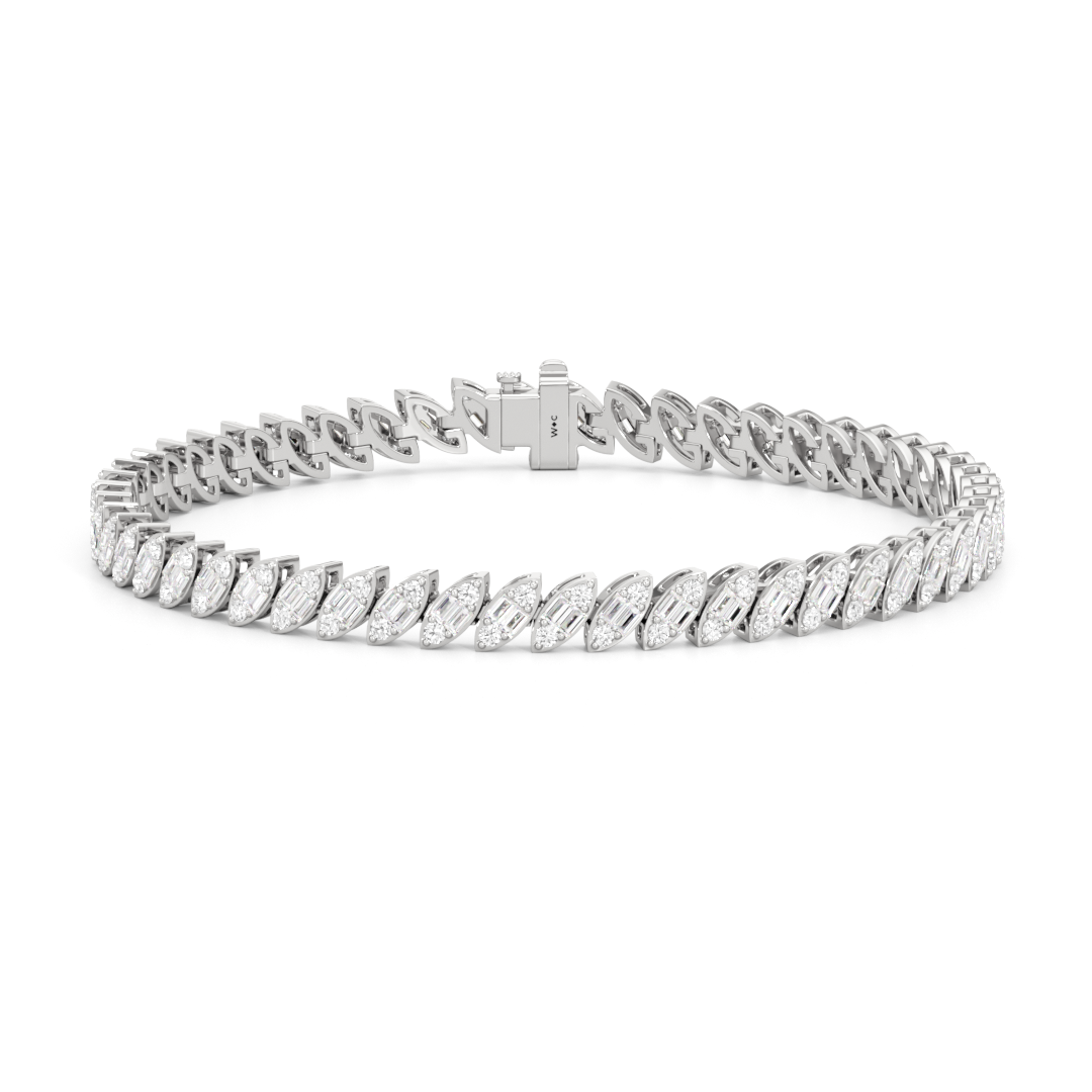 Your new fashion-daring all-rounder, ready to elegantly wrap your wrist in brilliance. This line bracelet features a continuous row of diagonally set marquise-shaped baskets, each cradling round and baguette diamonds.